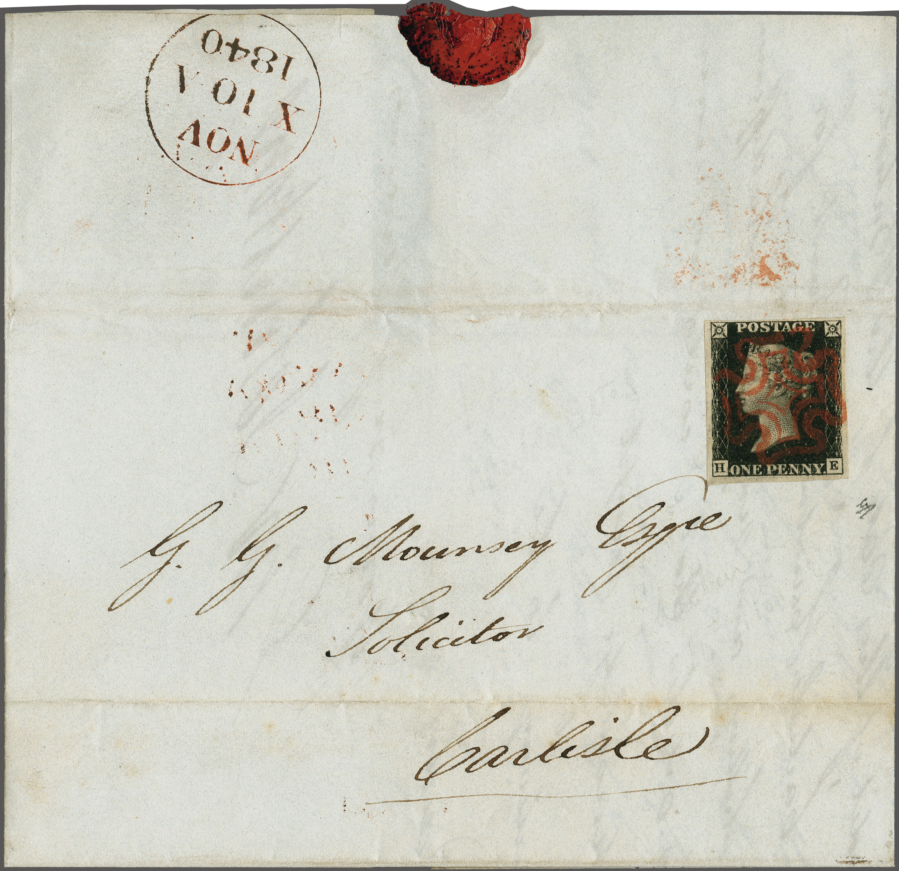 1840: 1 d. black, plate 5, lettered HE, a used example showing Double Letter "H" clearly, with large even margins all round, on 1840 cover from London to Carlisle cancelled by crisp strike of red Maltese Cross. London despatch