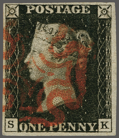 1840: 1 d. black, plate 7, lettered SK, a used example with good margins all round, neatly cancelled by Maltese Cross in red Gi AS46 = £ 450. (Image 1)