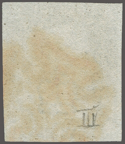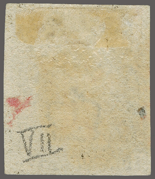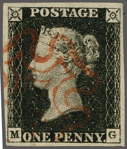 1840: 1 d. black, plate 7, lettered MG, a used example with ample to large margins all round, lightly cancelled by Maltese Cross in red Gi AS46 = £ 450. (Image 1)