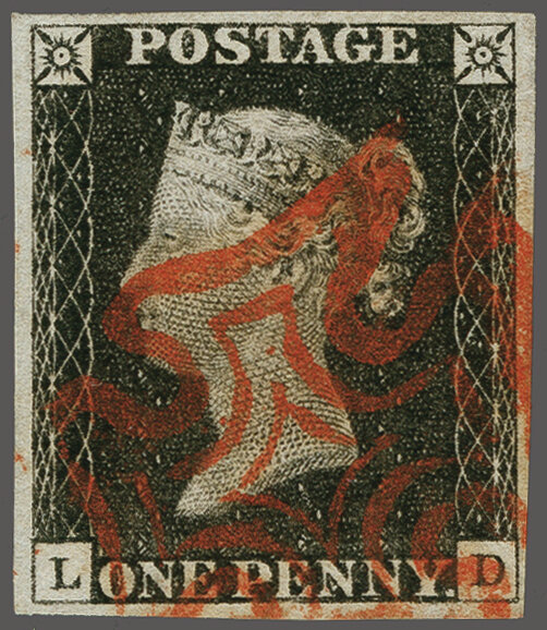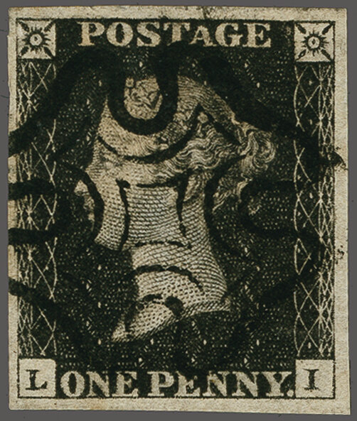 1840: 1 d. black, plate 6, lettered LI, a used example with good margins all round, neatly cancelled by near complete Maltese Cross in black Gi AS41 = £ 500. (Image 1)