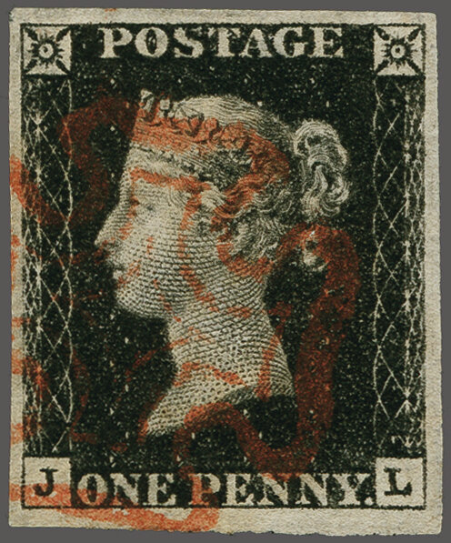 1840: 1 d. black, plate 4, lettered JL, a used example with good margins all round, neatly cancelled by Maltese Cross in red Gi AS23 = £ 400. (Image 1)