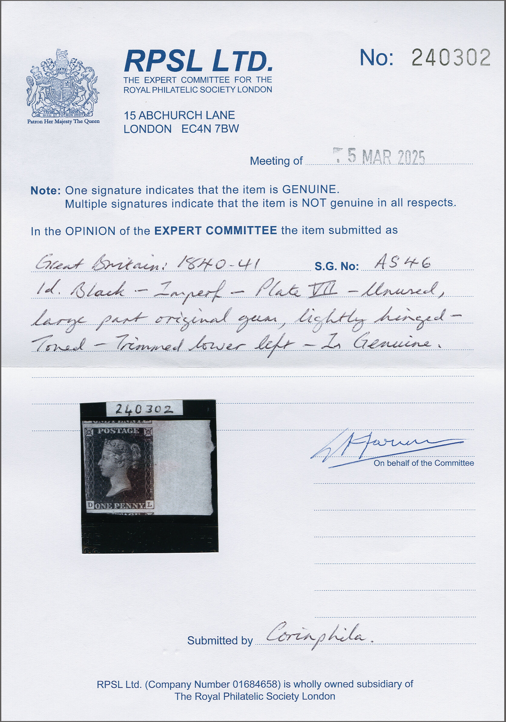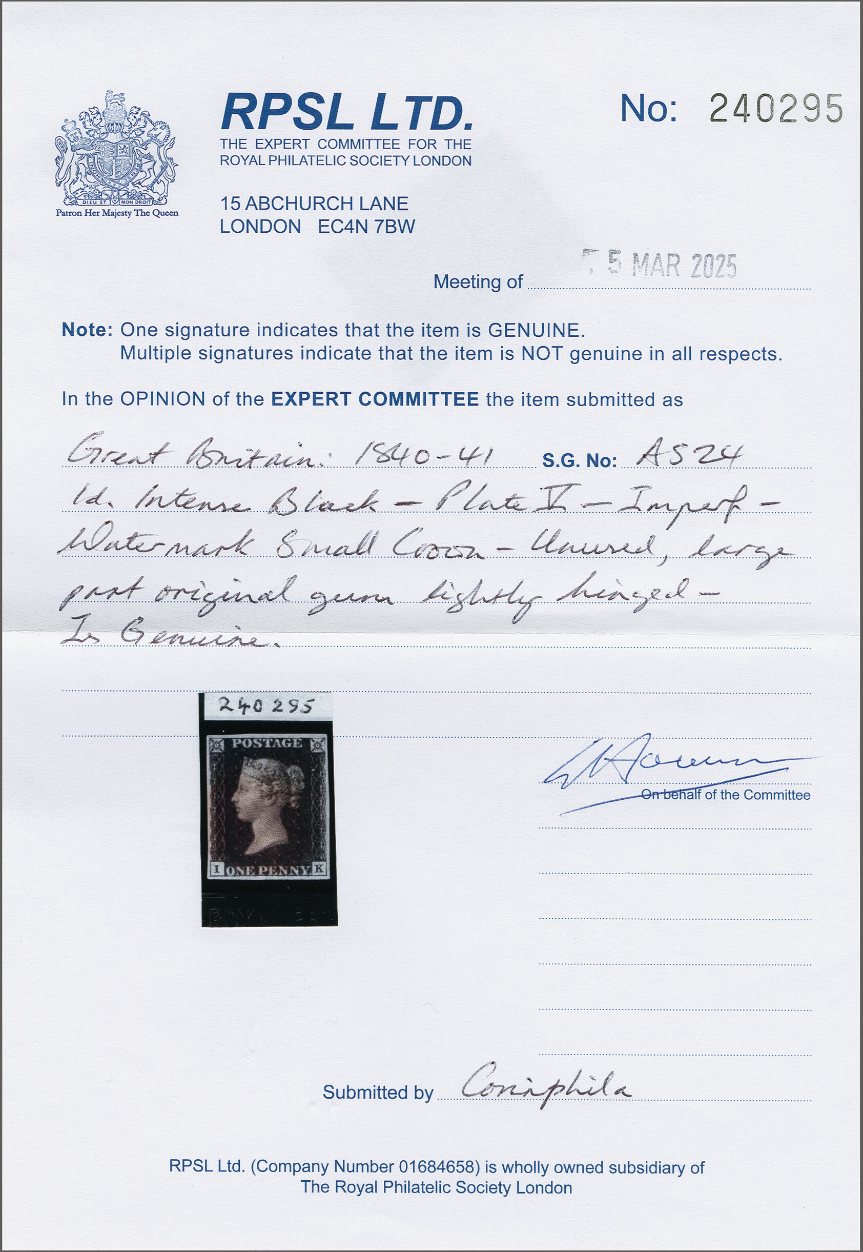 1840: 1 d. intense black, plate 5, lettered IK, an unused example with good even margins all round, large part og. Extremely rare so fine. Signed A. Diena. Cert. RPSL (2025) Gi AS24 = £ 18'000. Provenance: Harmer, 13