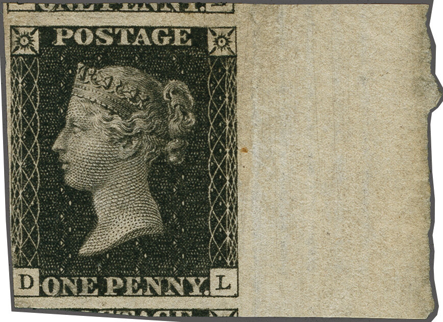 1840: 1 d. black, plate 7, lettered DL, an unused example , shaved at left margin but showing portions of adjoining stamps at top and at base, sheet marginal at right, slightest of ageing, large part og. Rare. Cert. RPSL