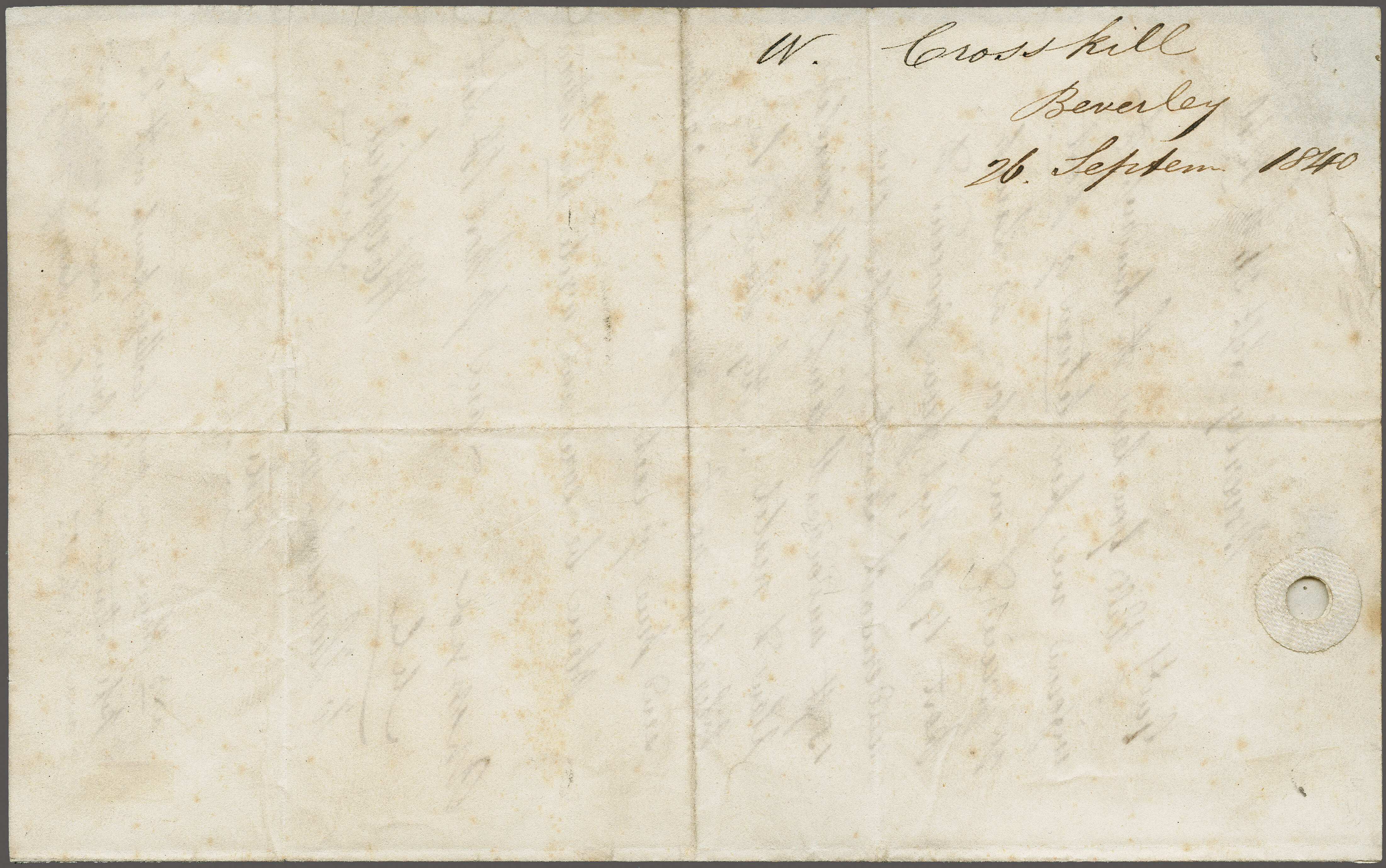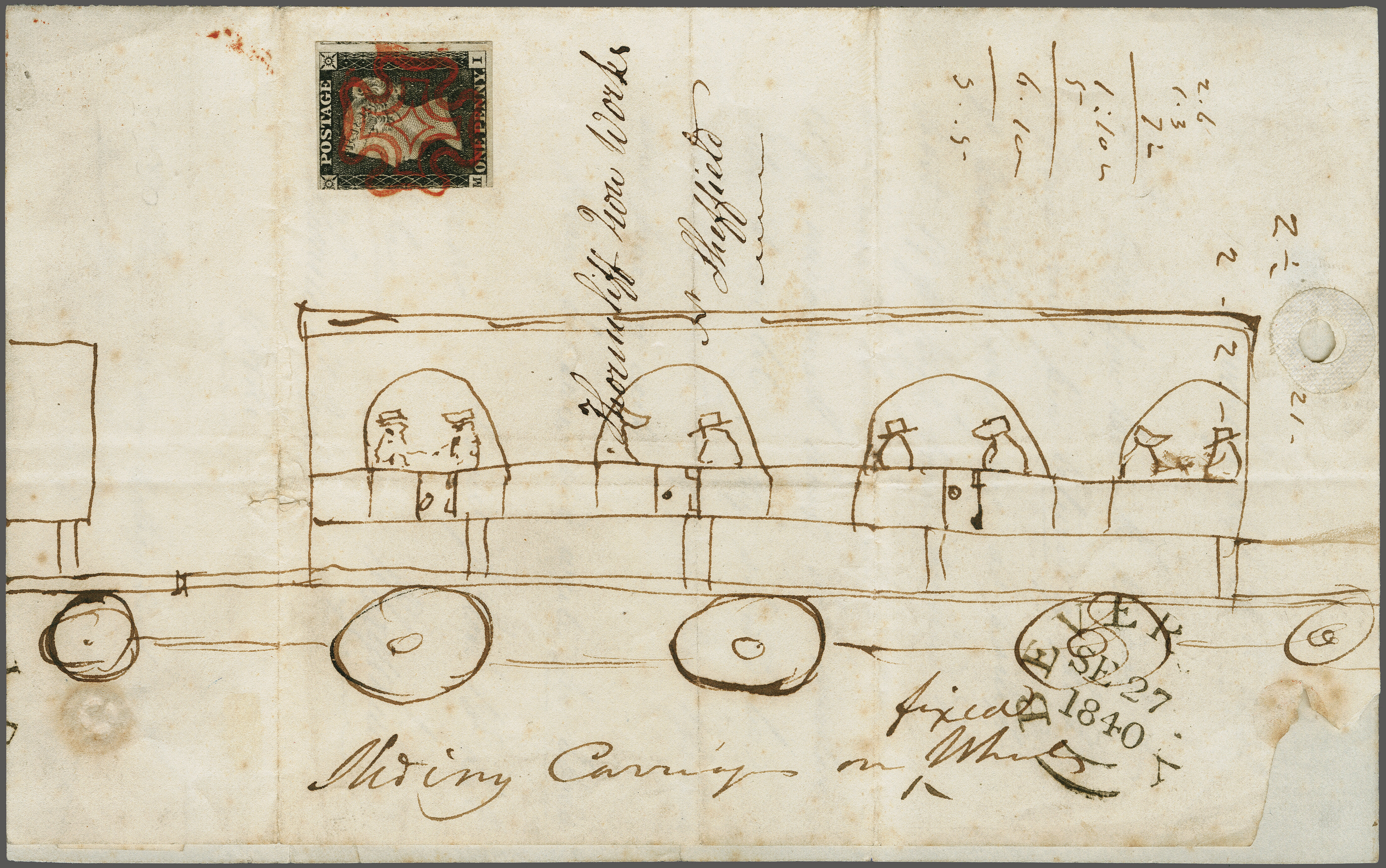 by neat Maltese Cross in red with double arc "Beverley" despatch cds (27 Sept 1840) on reverse in black. The cover delightfully embellished with an early hand-drawn illustration of a Railway carriage and passengers in ink Gi AS20 = £ 1'000.
