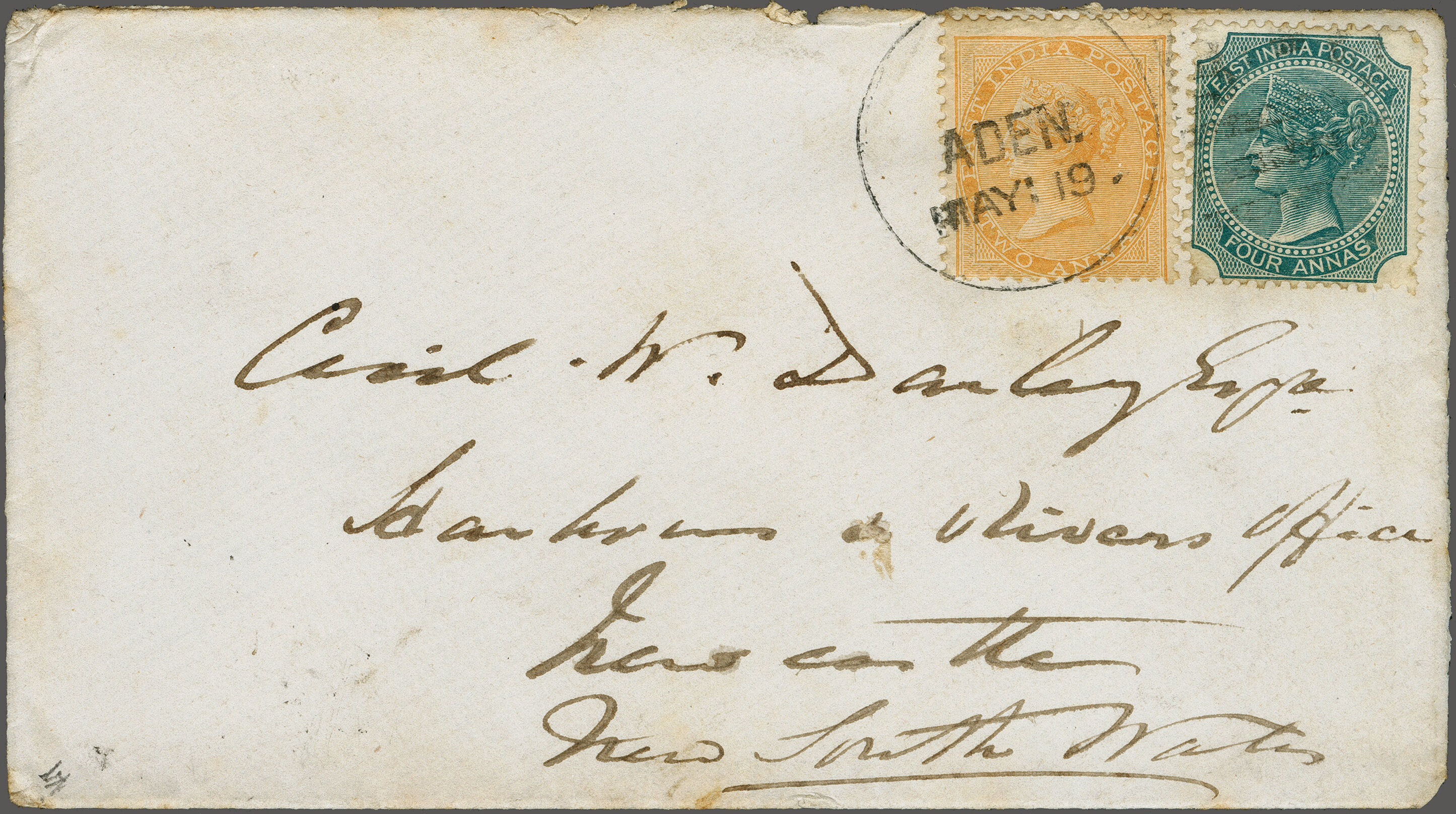 Incoming Mail Overland via Brindisi & Suez 1876 (May 23): Cover from Aden to Newcastle, New South Wales bearing 1865 India 2 a. yellow and 1866 4 a. green cancelled by Aden duplex and prepaying 6 annas for a 1⁄2 ounce ship