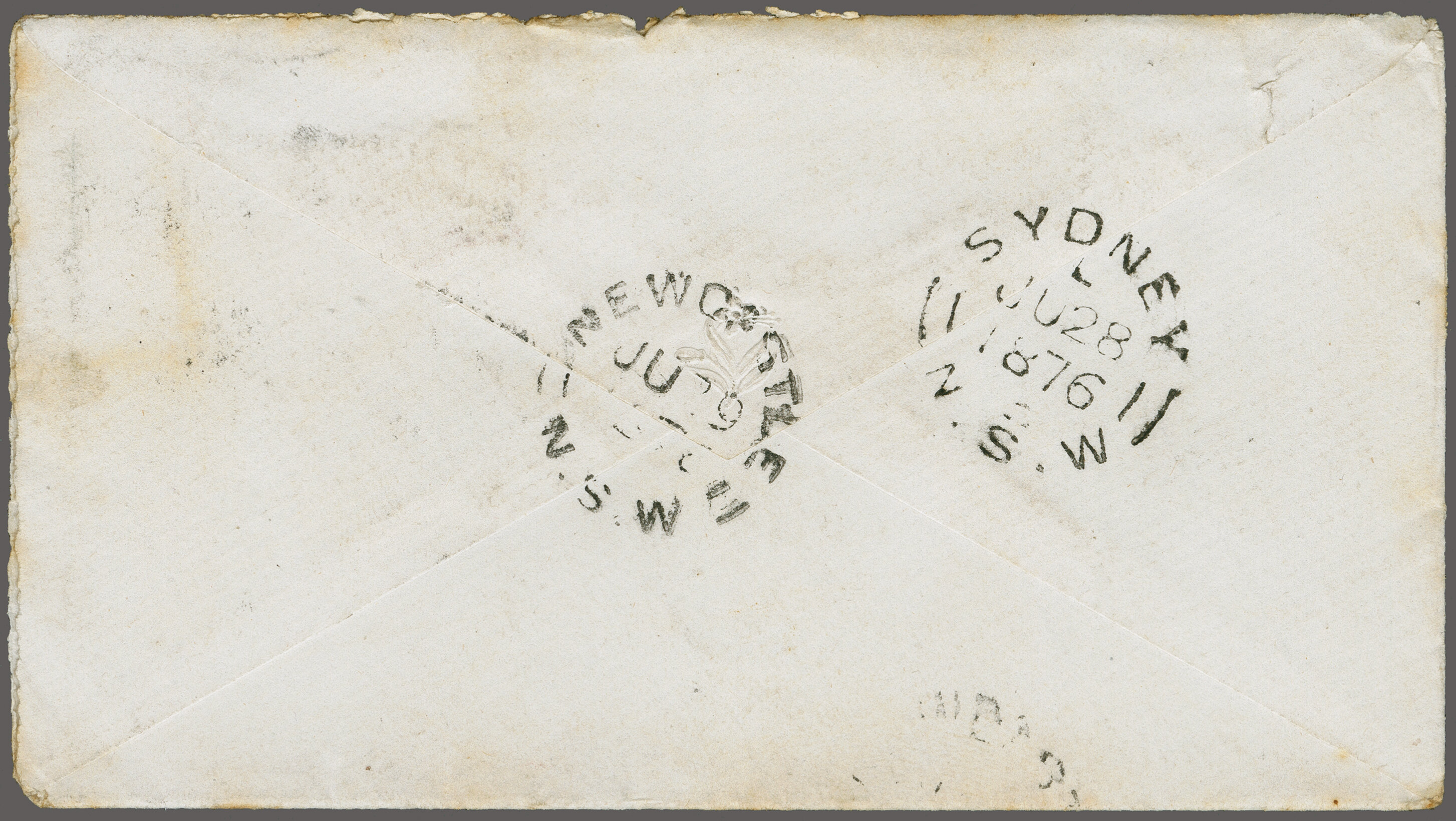 letter to New South Wales. A neat and attractive cover from the Darley correspondence. Route - P&O Line: Departed Aden 23 May 1876 per “Hydaspes” to Galle (2 June); “China” (3 June) via King Georges Sound (17 June); Adelaide (22 June) to