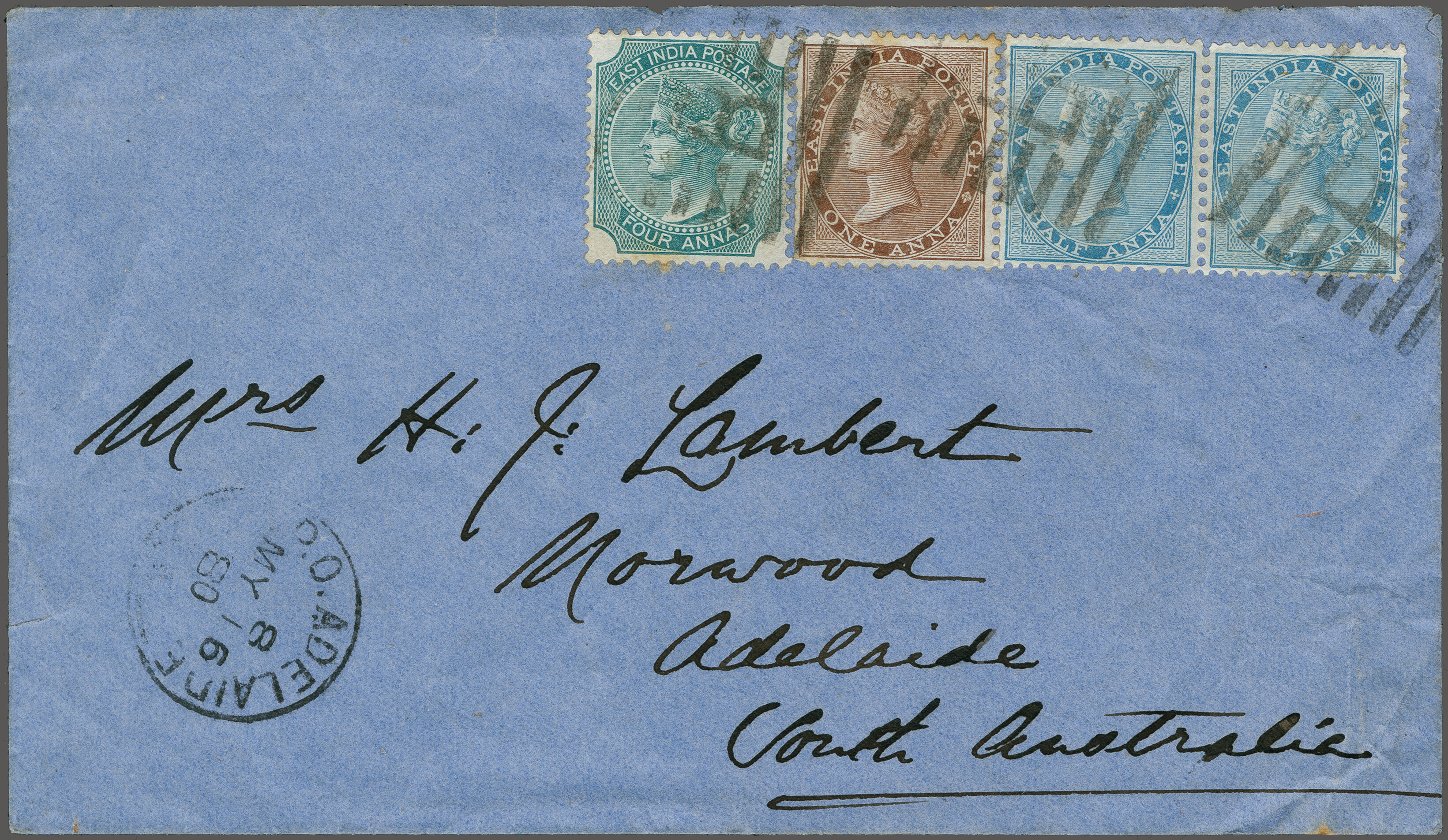 Incoming Mail Overland via Brindisi & Suez 1880: Cover most probably from Berbera, British Somaliland to Adelaide, South Australia bearing 1873 India ½ a. blue in a horizontal pair, 1 a. brown and 1866 4 a. green all