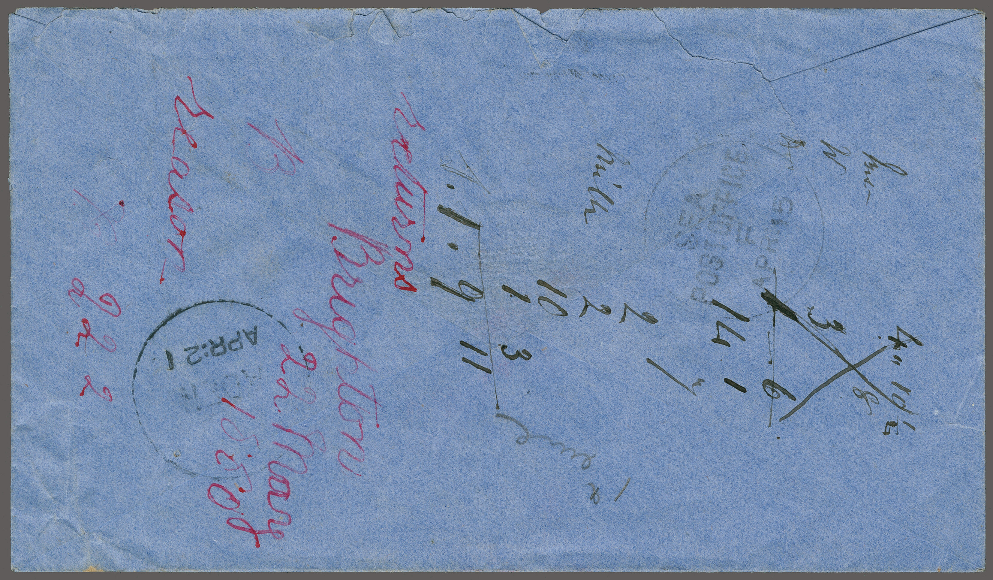 cancelled by the horizontal barred “B” obliterators in black and prepaying 6 annas for a 1⁄2 ounce ship letter to South Australia. No confirming despatch datestamps, the reverse with Aden cds (April 21) and Sea Post Office F cds. Route - P&O