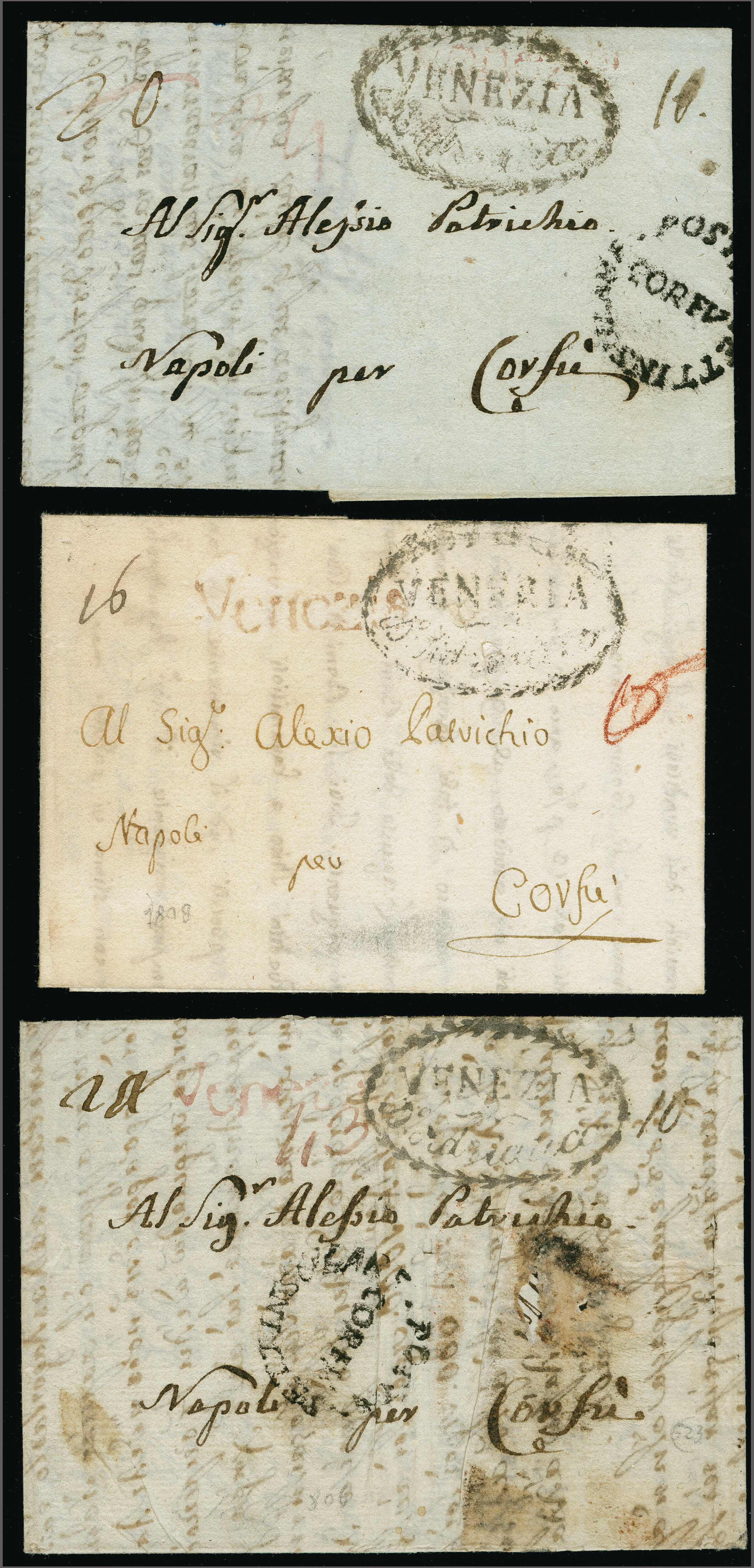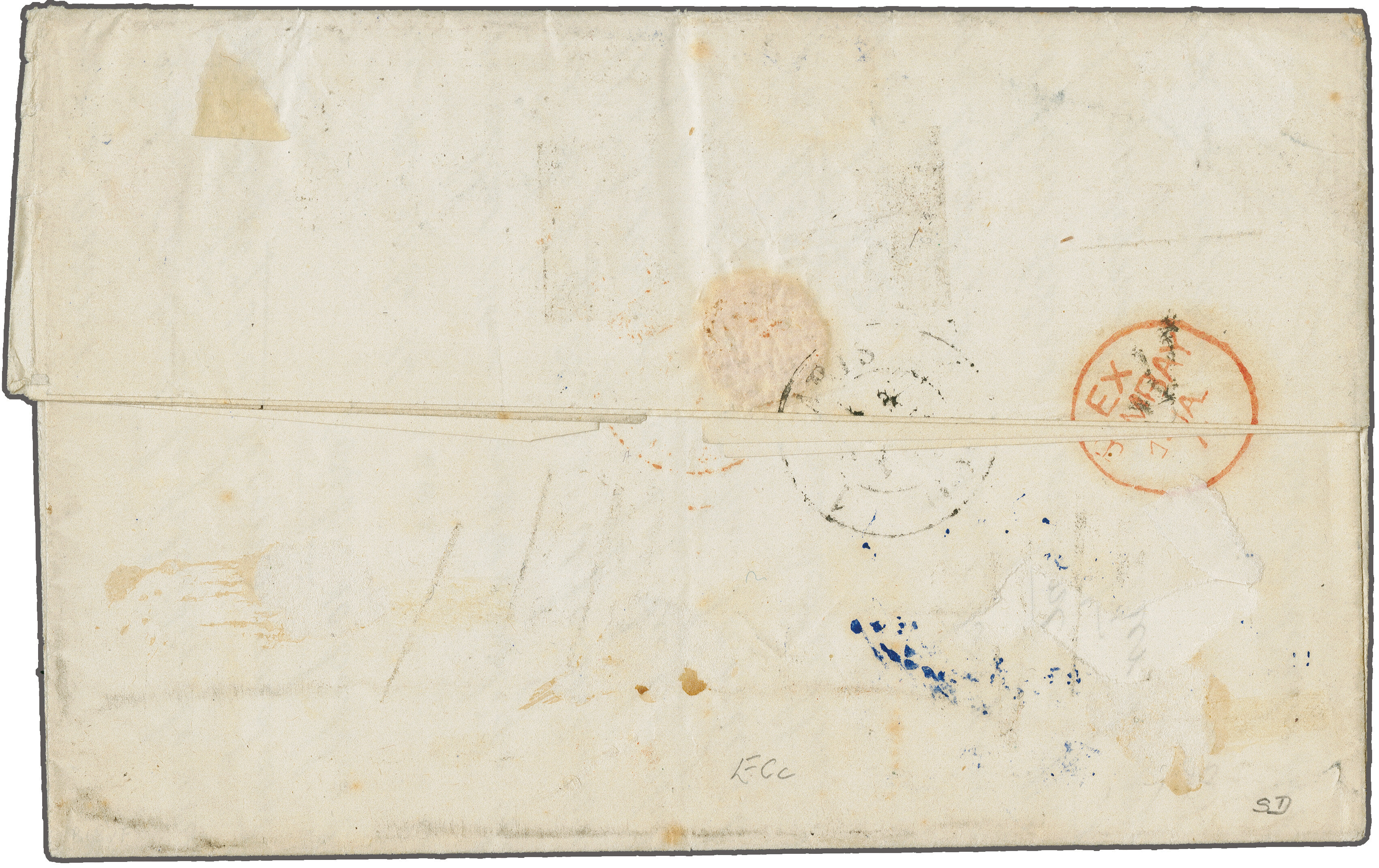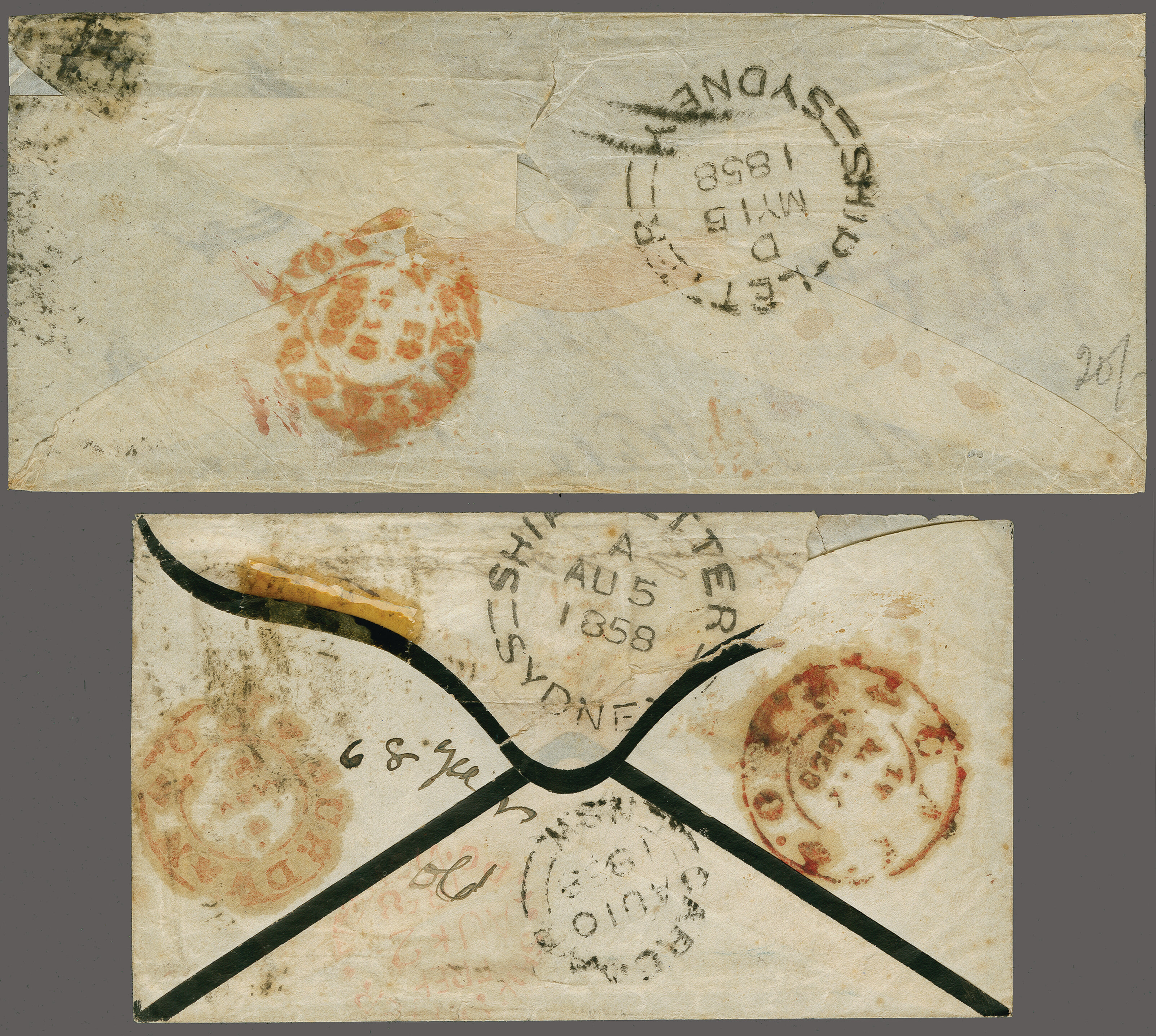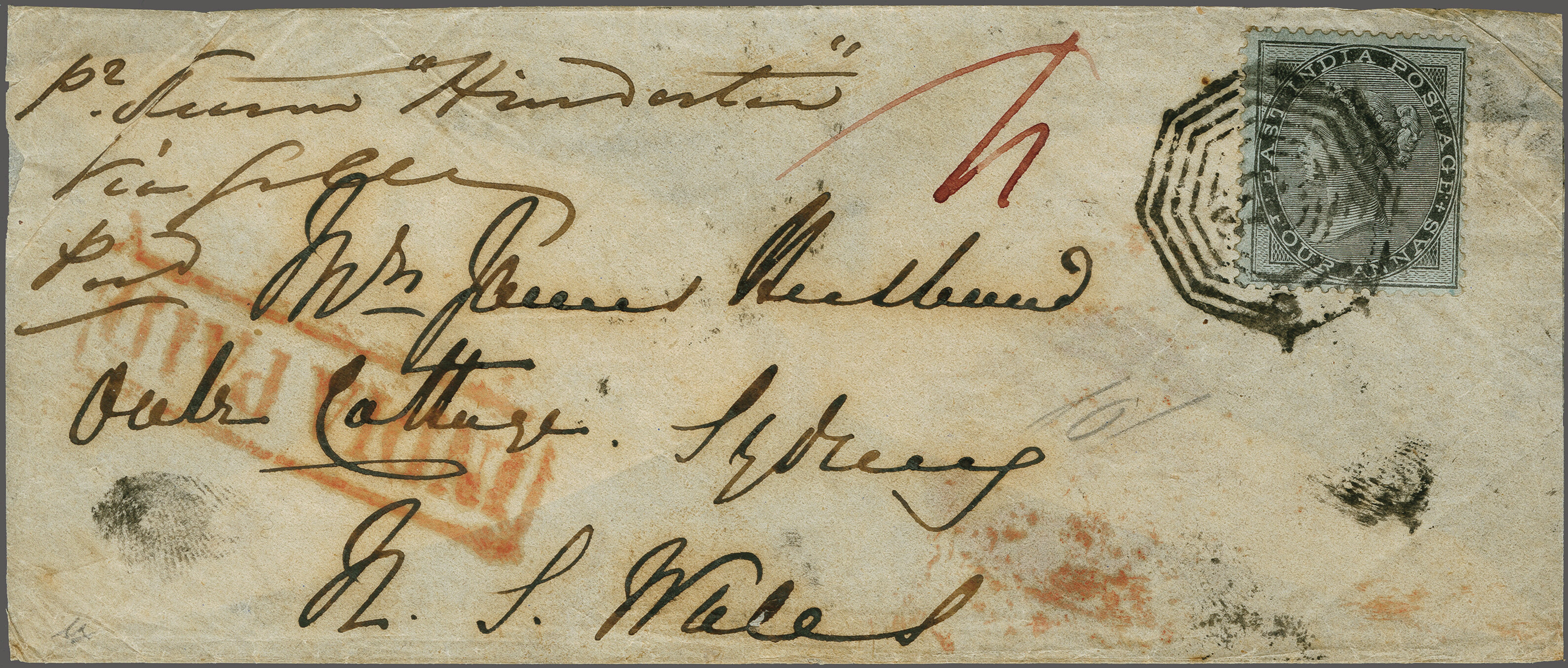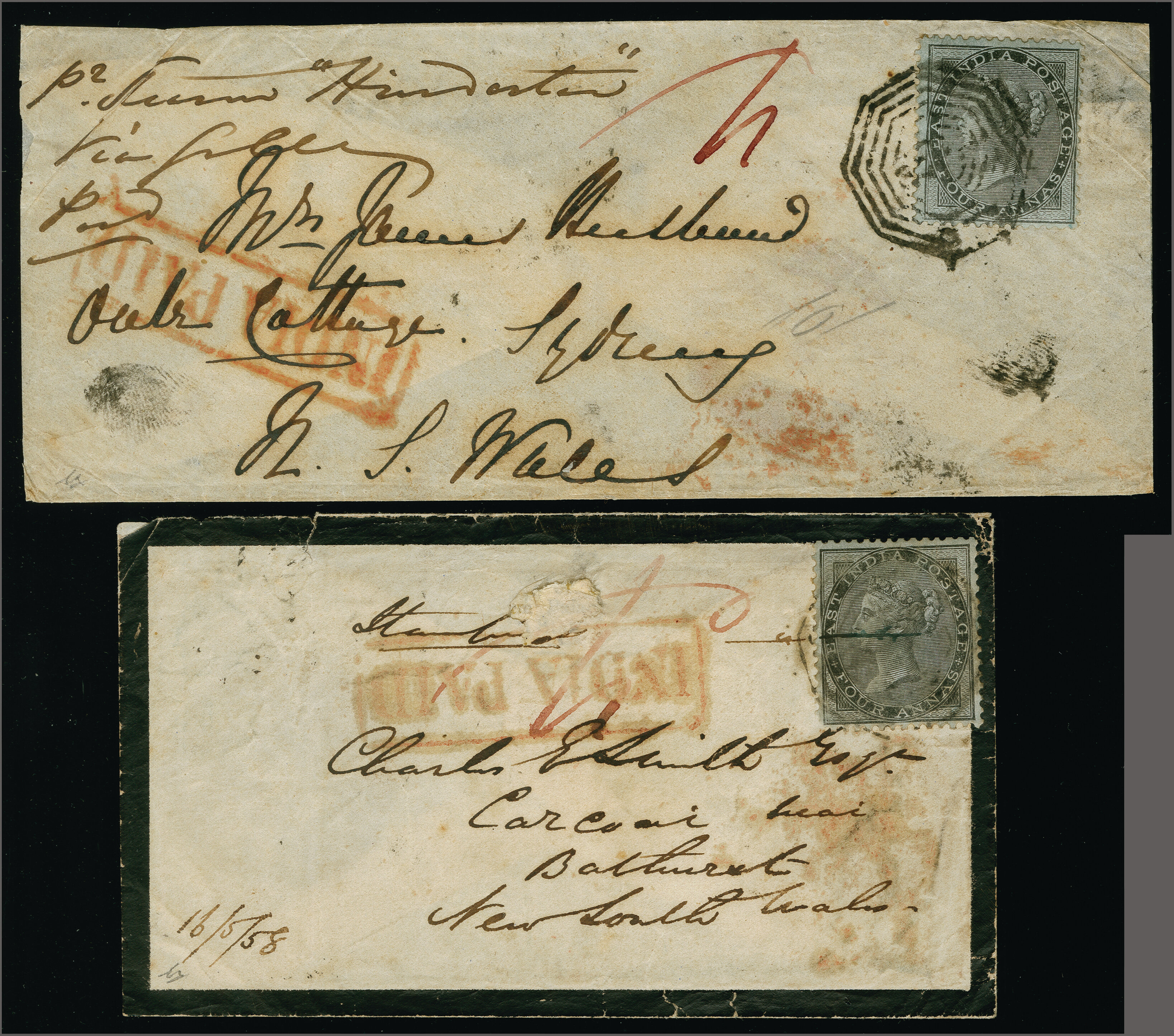 Incoming Mail via the Indian Ocean 1855: India 4 a. black; used on 1858 covers (2) from India to New South Wales, both with framed “INDIA PAID” handstamp in red and prepaying 4 a. for a 1⁄2 ounce ship letter to New South