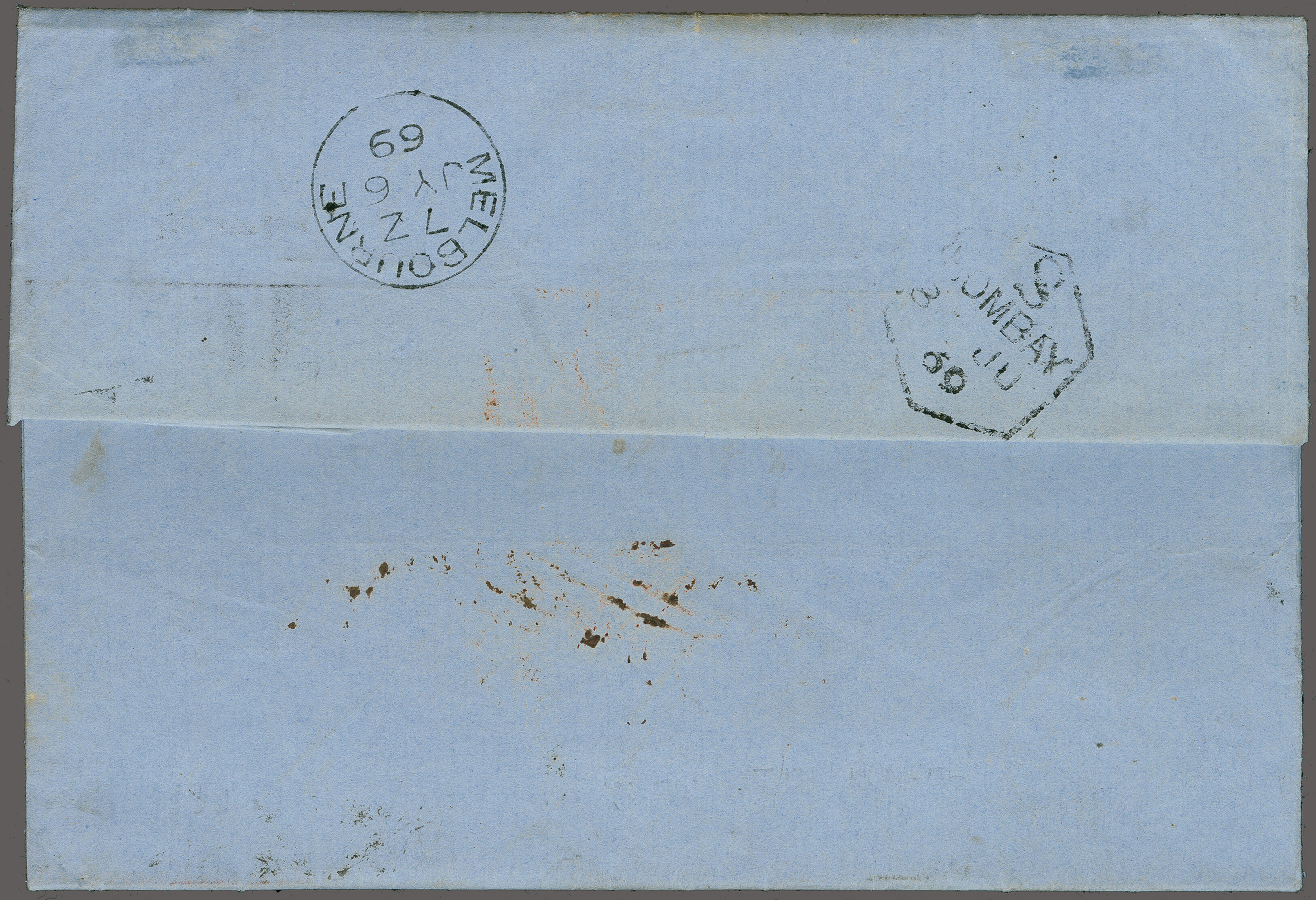 King Georges Sound (1 July) to Melbourne, arriving 6 July 1869 (33 days). Note: Two concessionary soldier’s covers are recorded from India to the Australian Colonies, both from this correspondence, this being the finest. (Image 1)