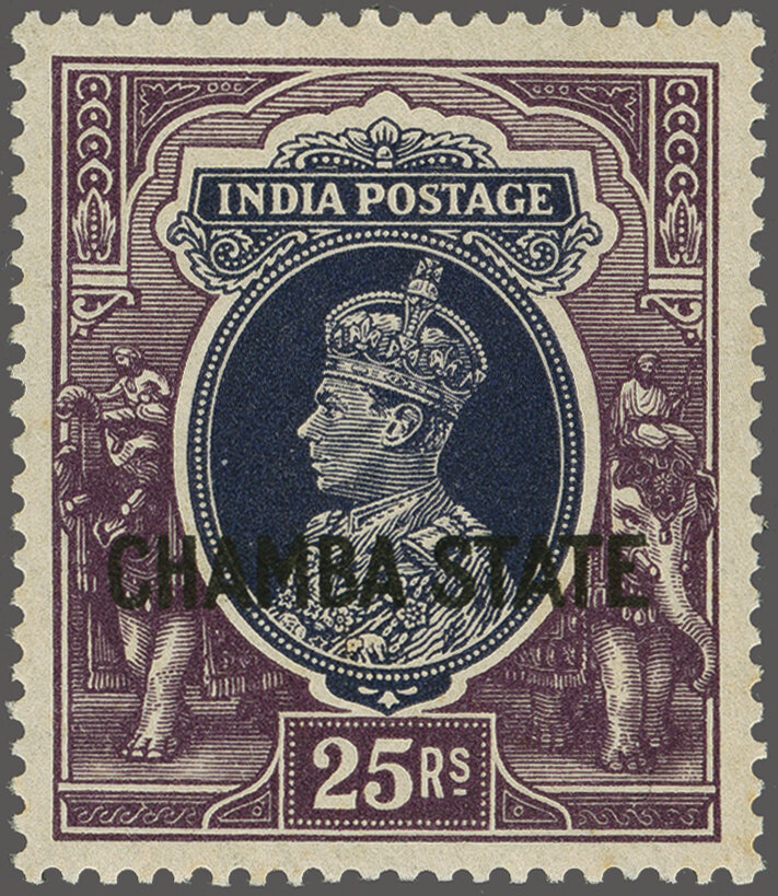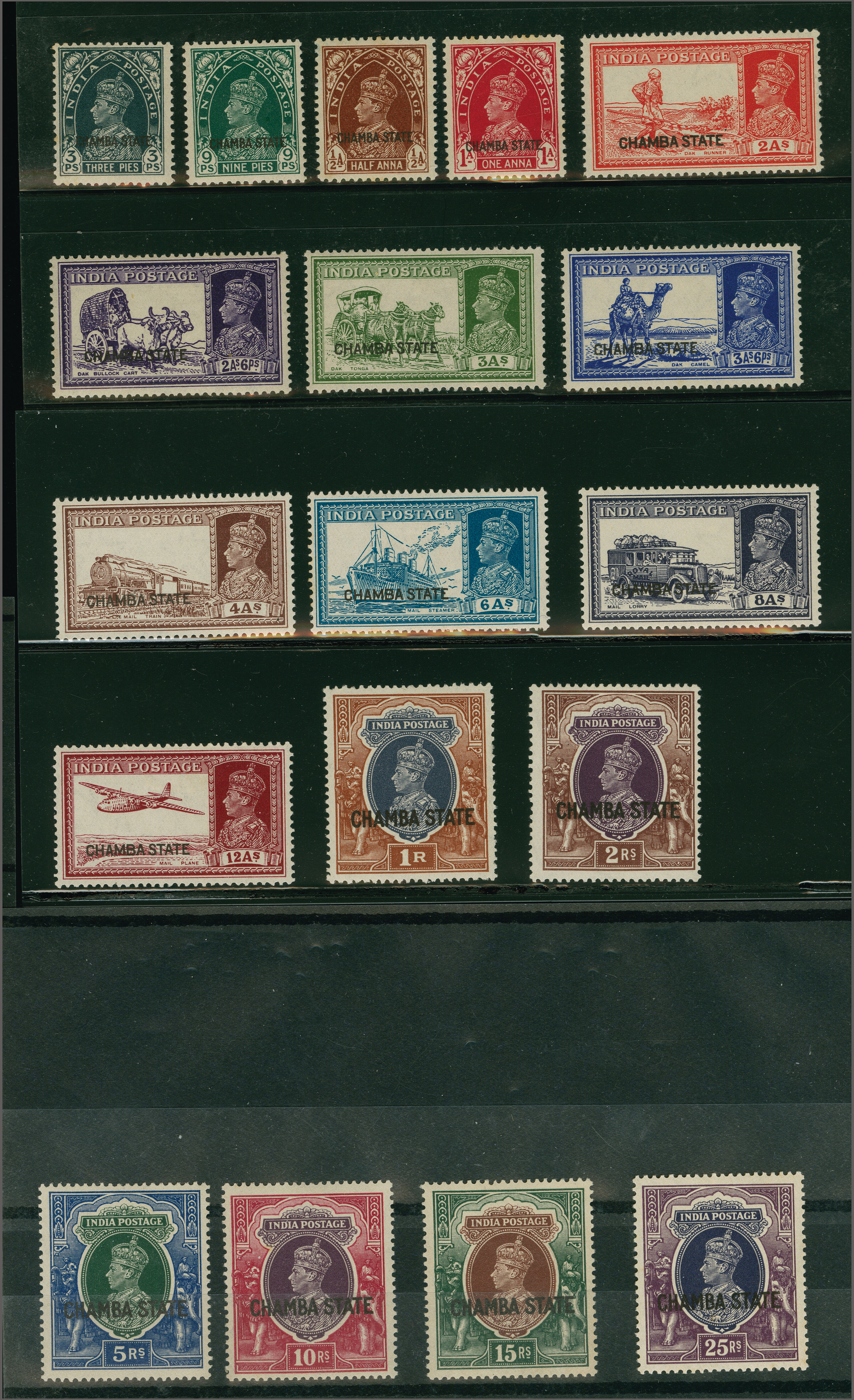 Convention States, Chamba State 1938: 3p slate to 25R slate violet & purple, overprinted CHAMBA STATE in black, most with large part original gum, the 5R-15R unmounted mint, overall fresh and fine. Gi = £1,200. (Image 1)