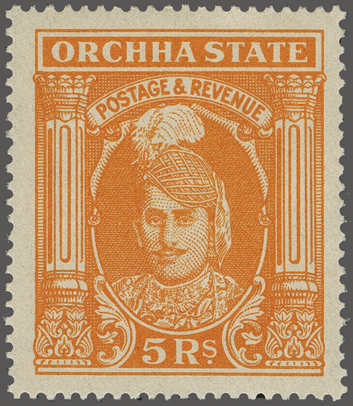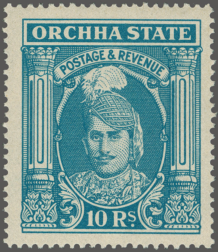 Orchha 1942: Maharajah Vir Singh II, 10 r. turquoise-green, lithographed, perf. 14 x 13½, an unused example of excellent centering and fresh colour, unmounted og. Rare Gi = £ 1'500. (Image 1)