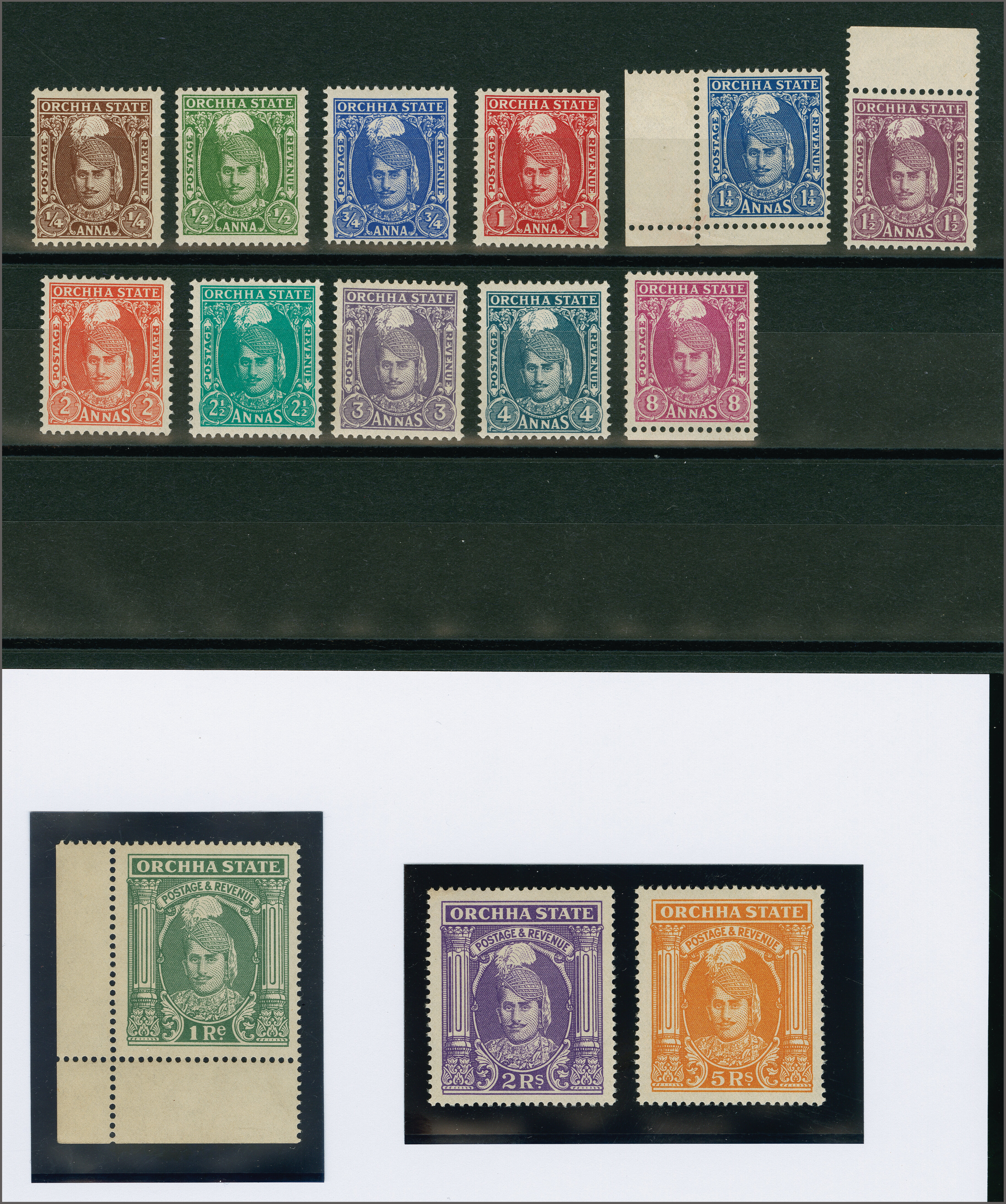 Orchha 1939/42: Maharajah Vir Singh II, lithographed, the unused set of fourteen values to 5 r. yellow-orange, the lower values either large part or unmounted og., the three higher values, perf. 14 x 13½, all unmounted og.