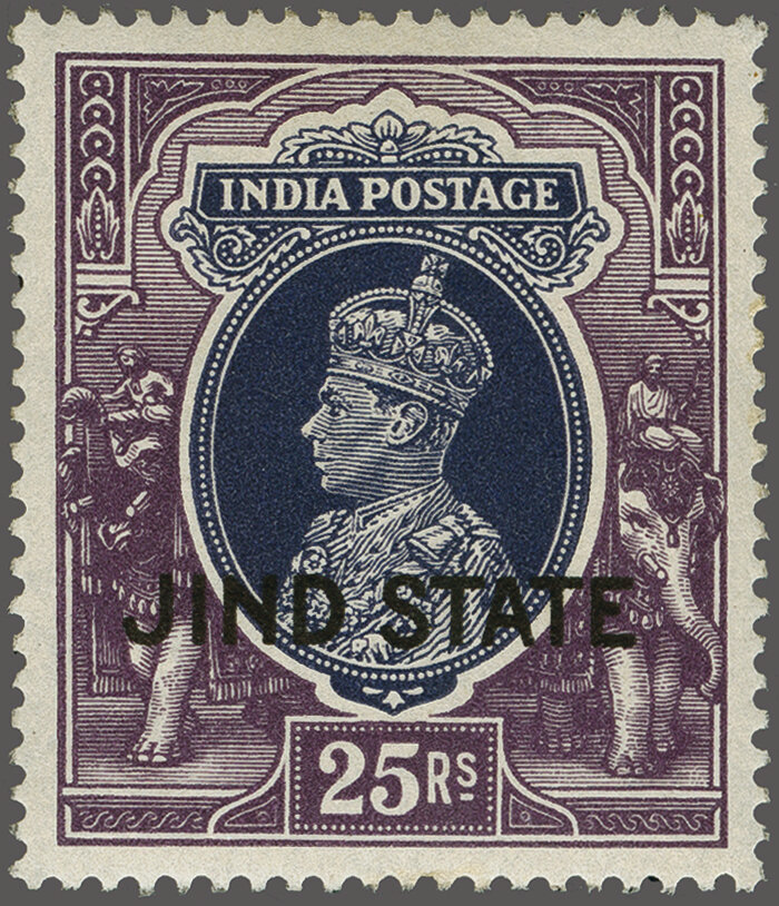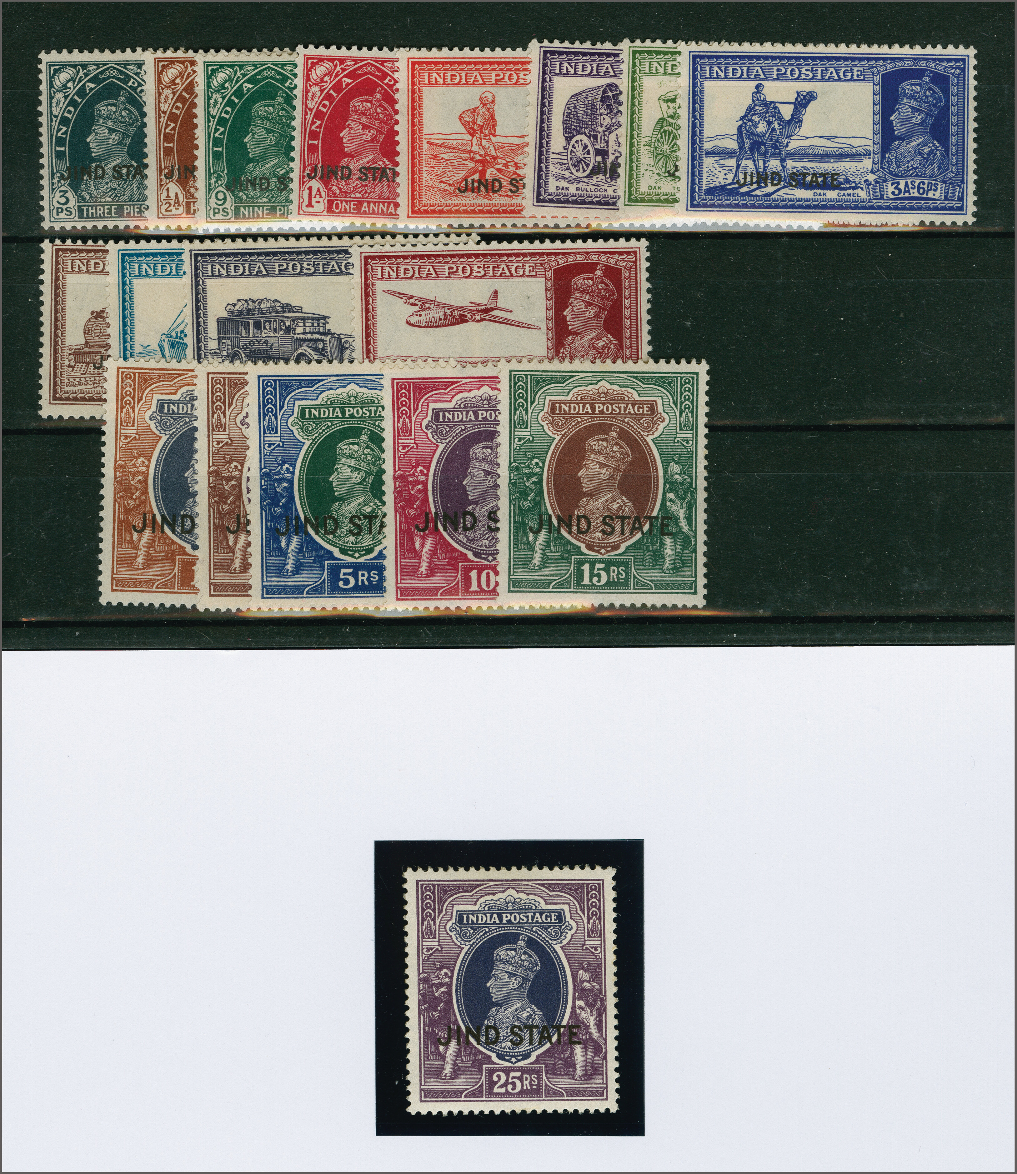 Jind State 1937/38: George VI, the definitive set of eighteen values overprinted on India, fresh colours, superb, large part og. A rare and most elusive set Gi = £ 1'300. (Image 1)