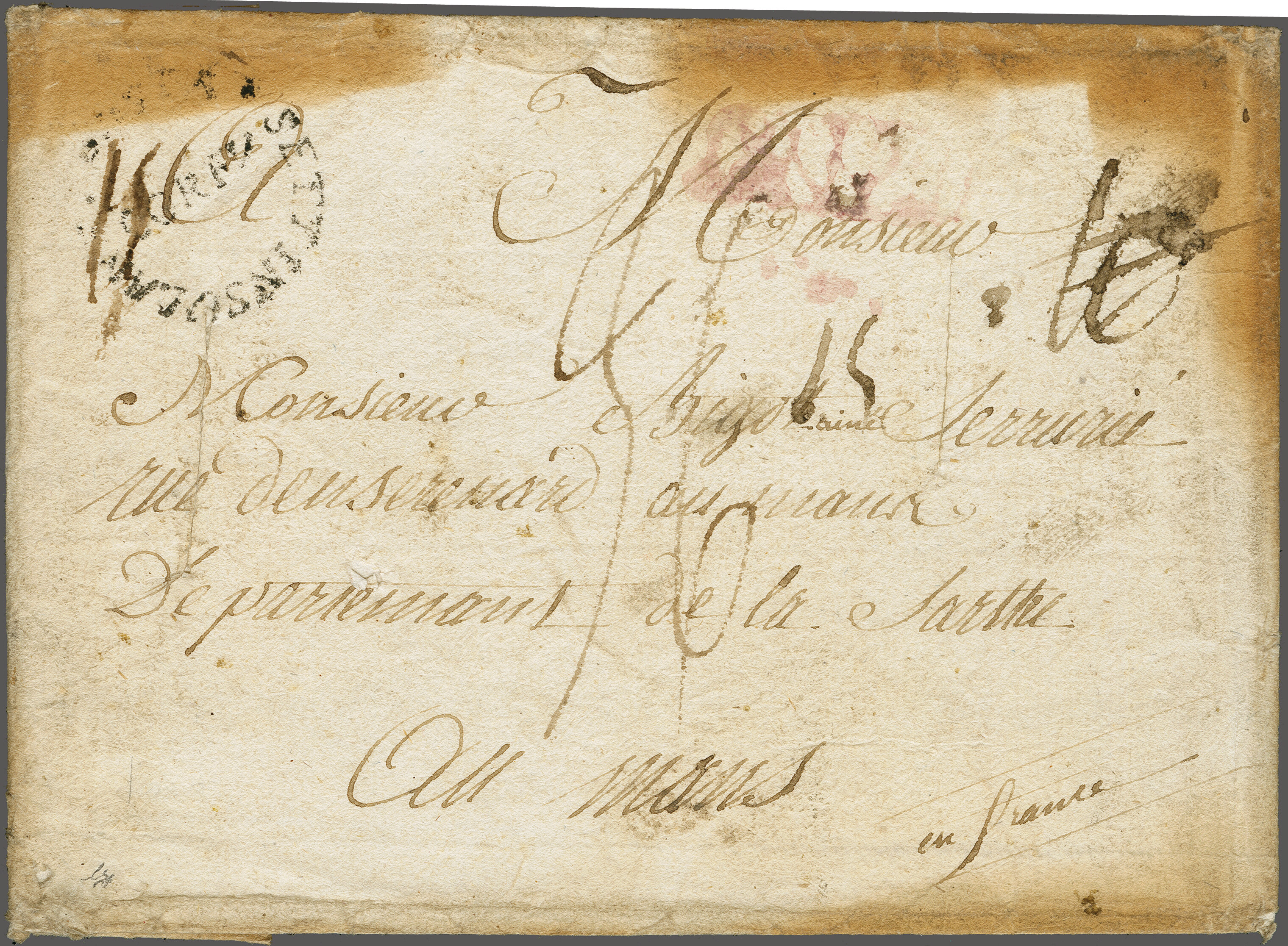 1873 (Jan 10): Entire to Paris, endorsed "Via Brindisi" franked British India 1865 watermarked 8 p. (2), 4 a. and 8 a. tied by fine PONDICHERY duplex and overstruck by two oval company chops, BOMBAY transit and PARIS arrival