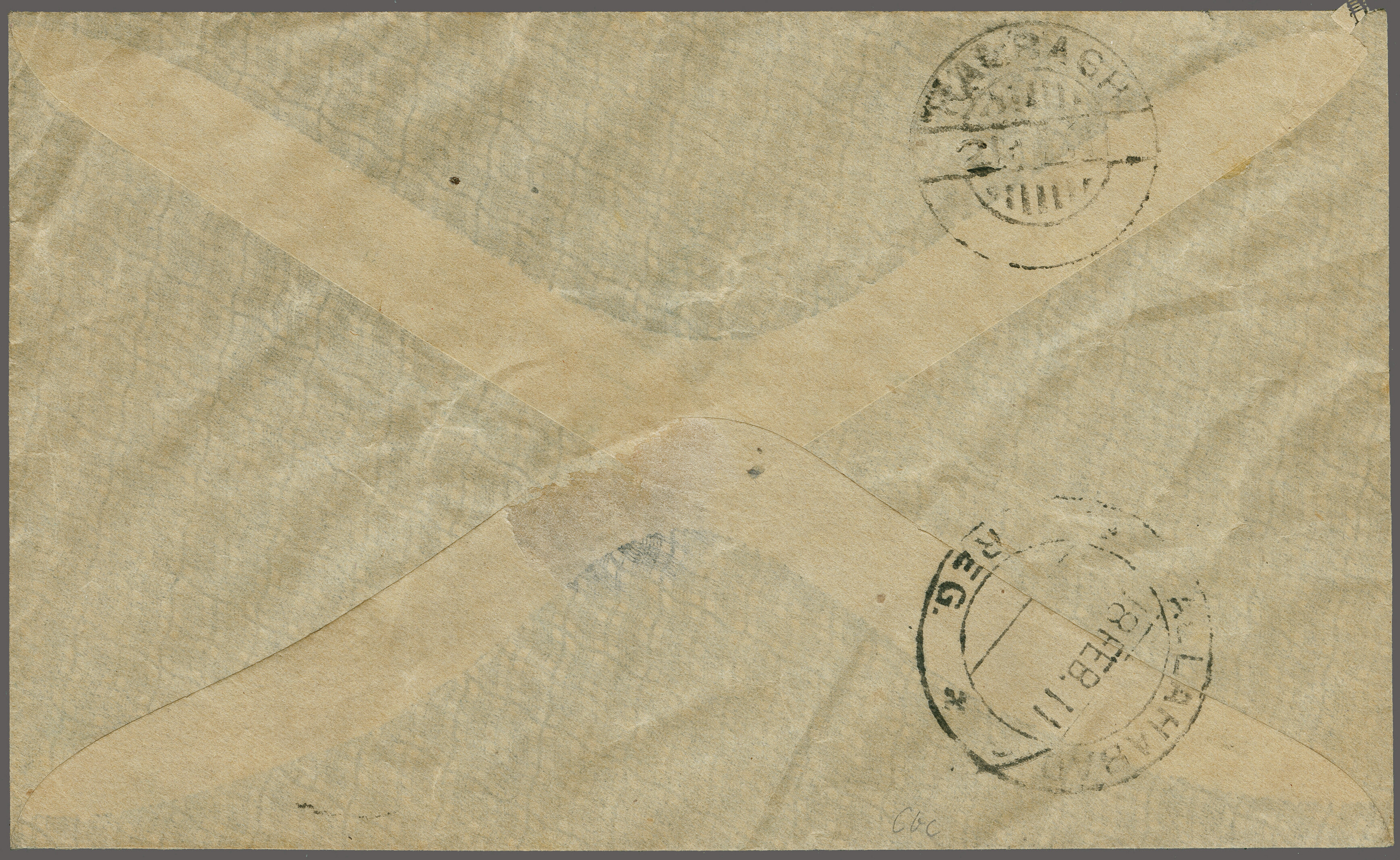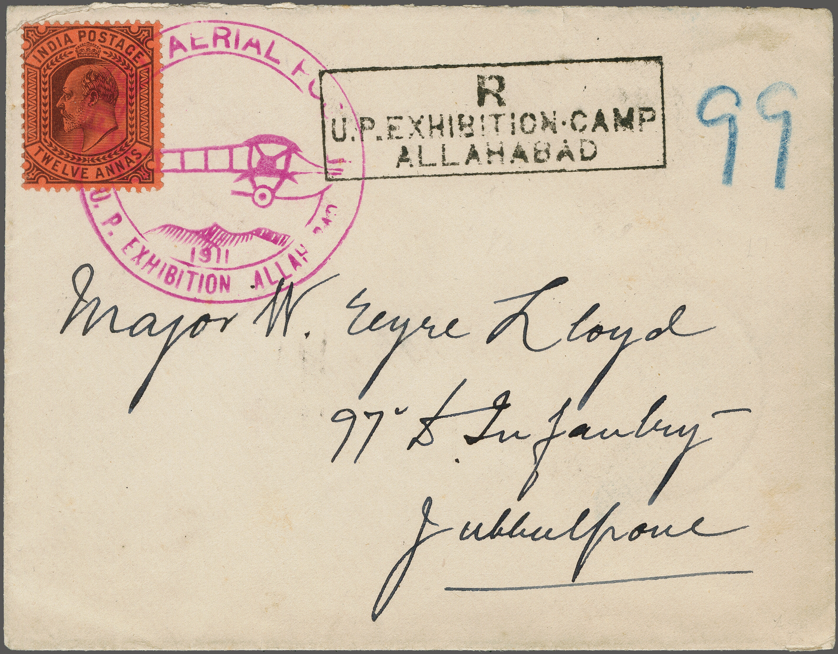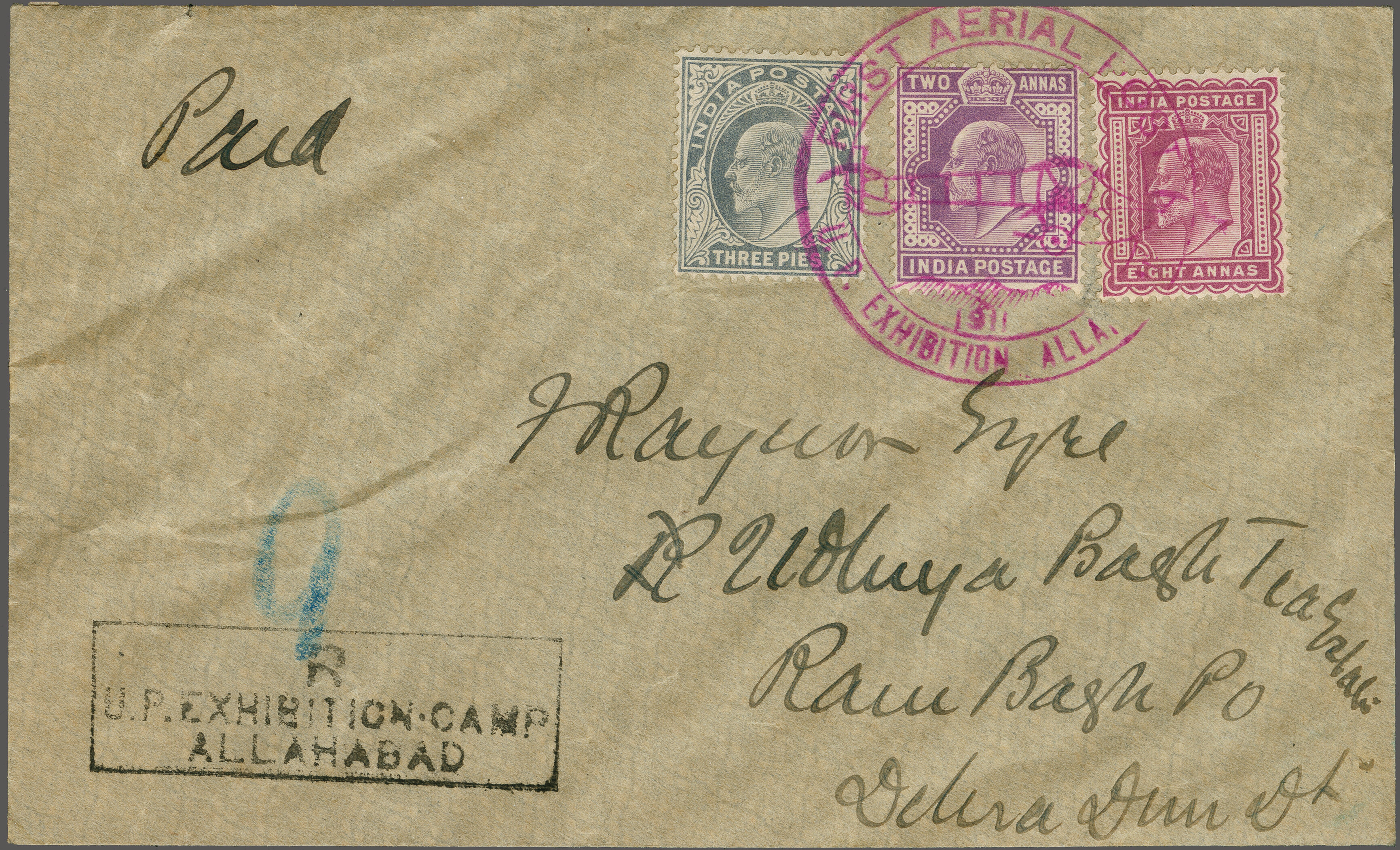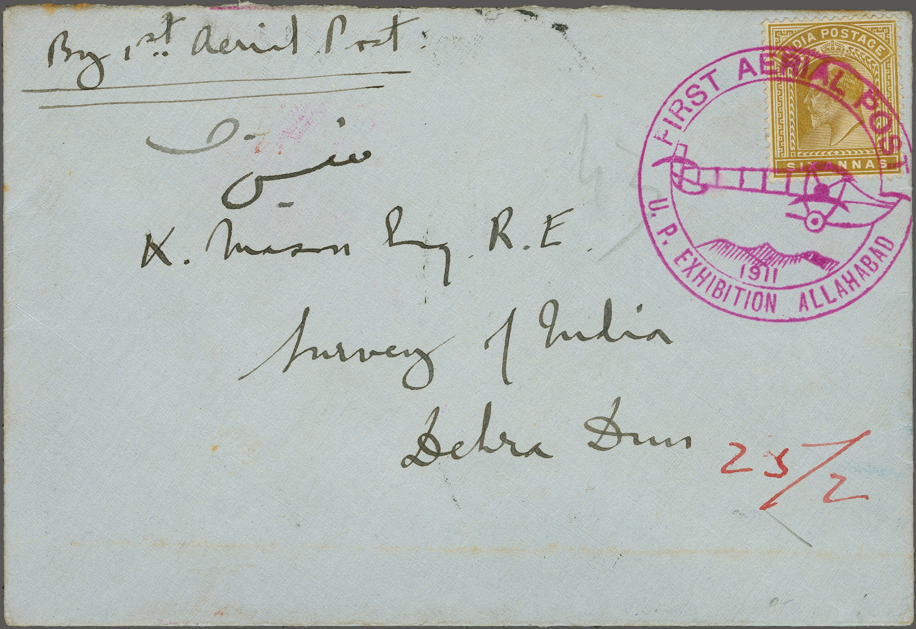 1911 (Feb 18): Envelope to Dehra Dun bearing India KEVII 6 a., tied by fine strike of the special flight cachet "FIRST AERIAL POST / U. P. EXHIBITION ALLAHABAD / 1911" in violet, ALLAHABAD despatch backstamp and registration
