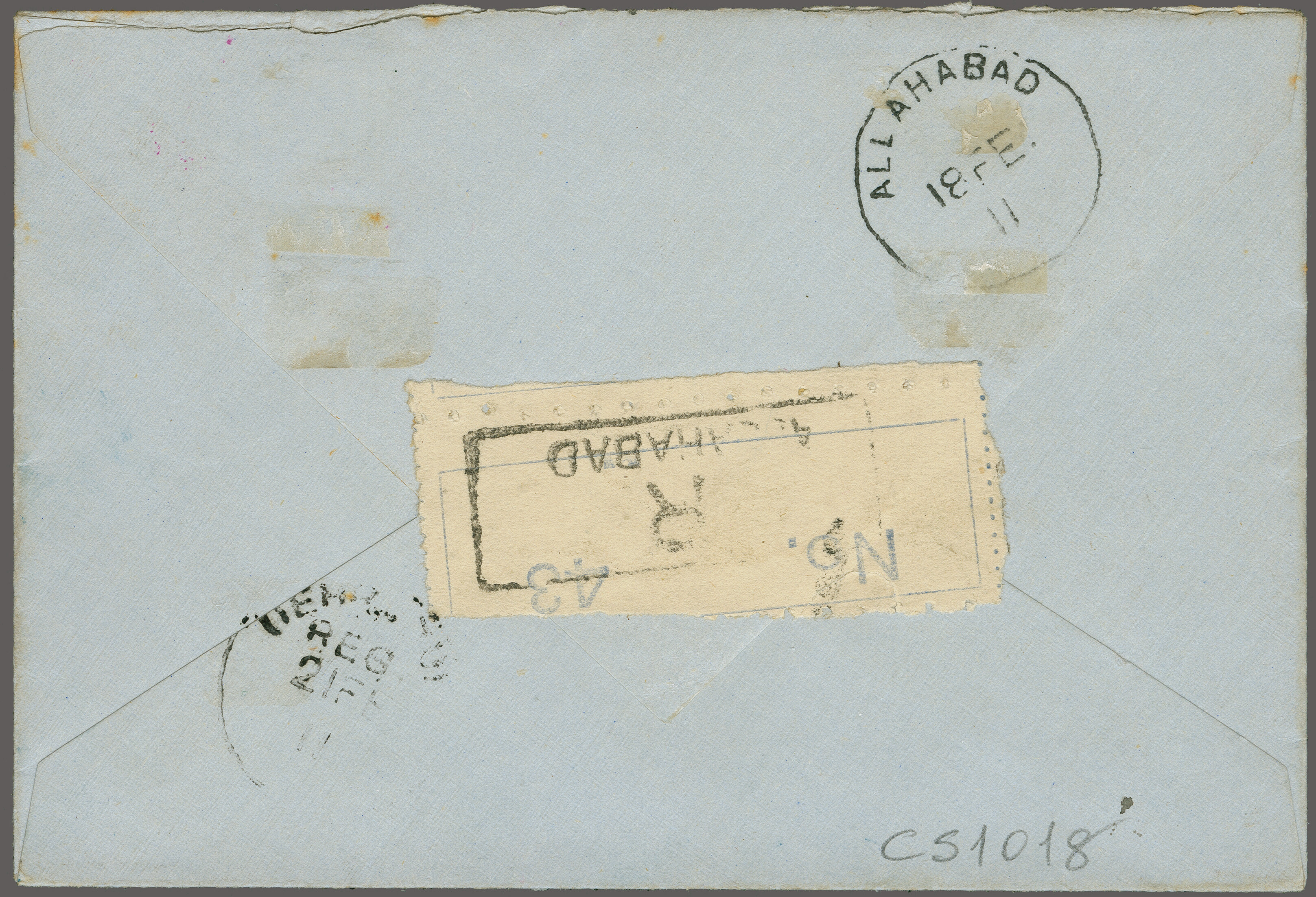 legible registration handstamp bottom left, manuscript registration numer "9" in blue crayon, ALLAHABAD despatch and RAMBAGH arrival (Feb 21) backstamps. Fine and attractive. (Image 1)