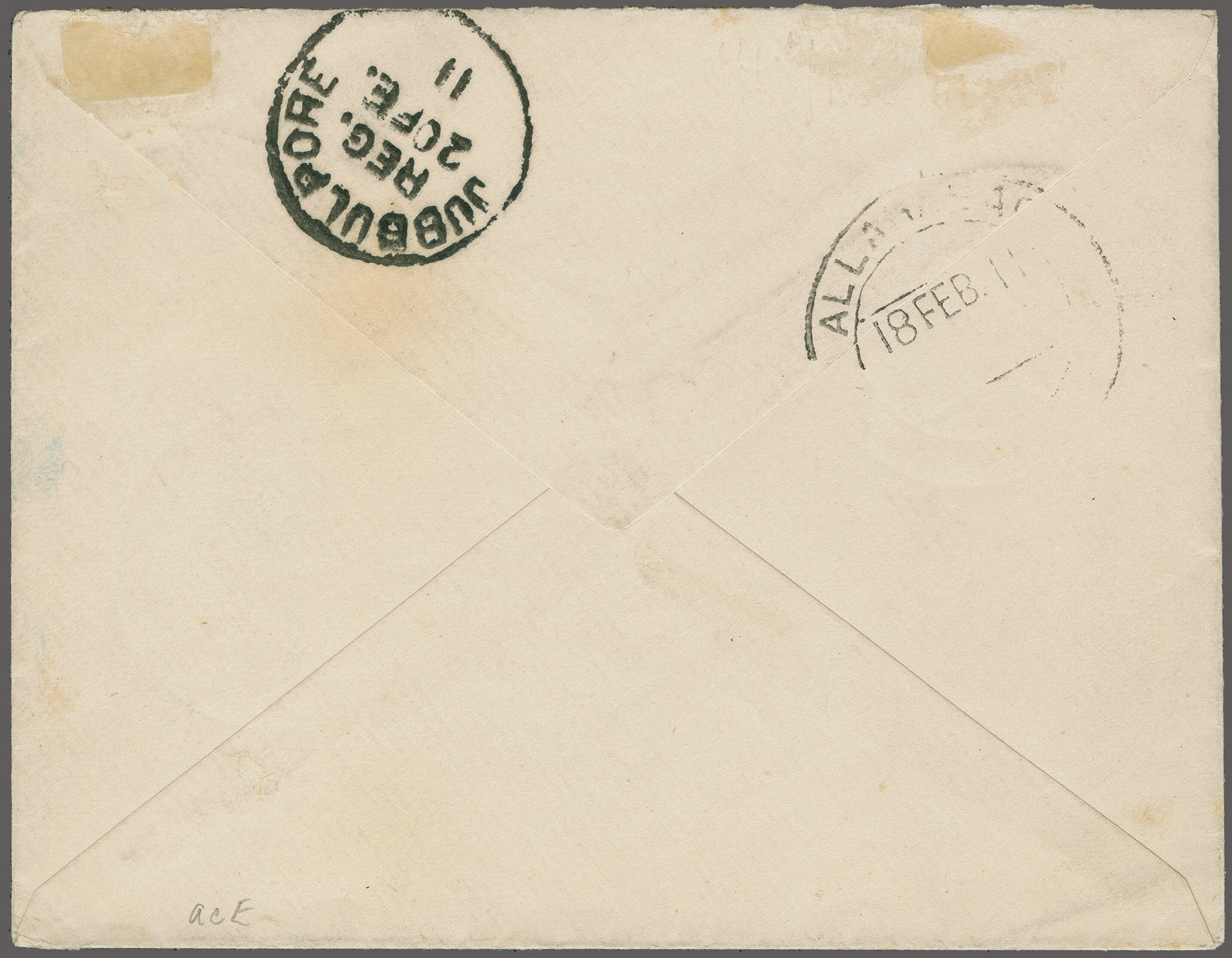 handstamp alongside, manuscript registration number "99" in blue crayon, ALLAHABAD despatch and JUBULPORE arrival (Feb 20) backstamps. Fine condition. (Image