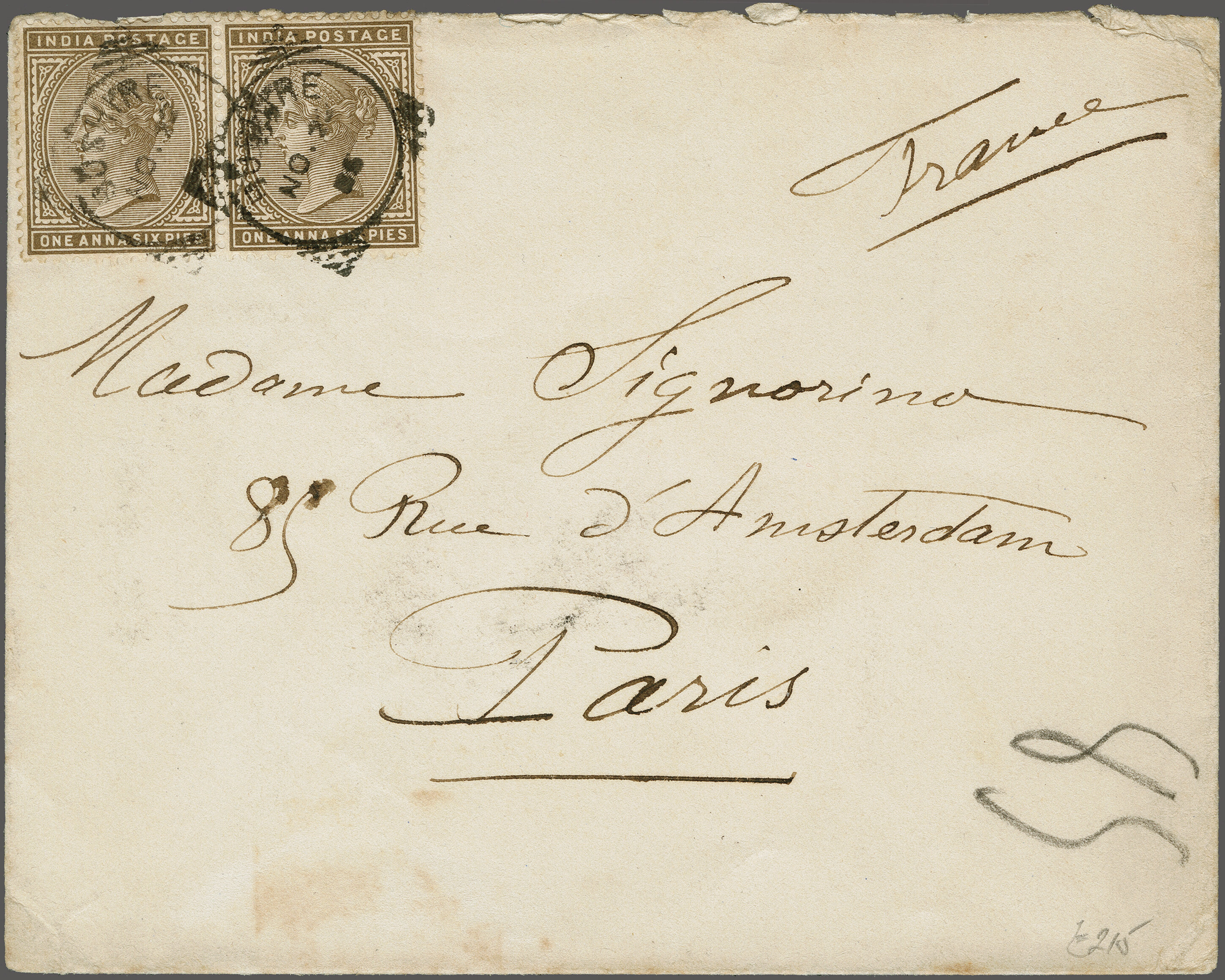 India used abroad in Persia 1885 (Nov 22): Envelope to France franked India QV 1 a. 6 p. sepia pair tied by BUSHIRE squarred circle, "SEA POST OFFICE B" transit (Dec 4) and arrival datestamps, scarce usage of this adhesive in