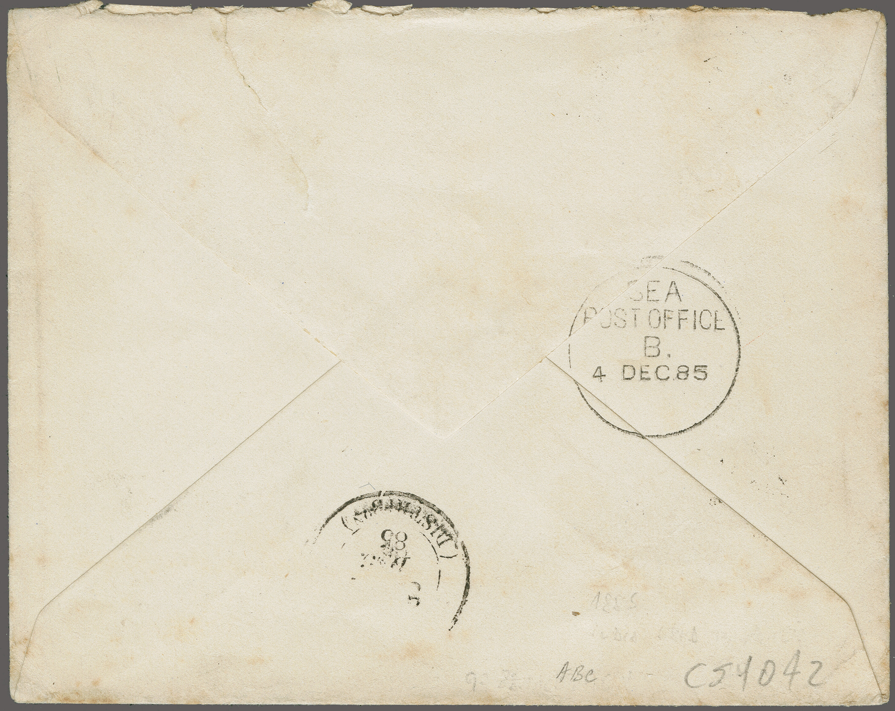 Line: Departed Aden 21 April 1880 per “Bokhara” to Galle (30 April); “Tanjore” (30 April) via King Georges Sound (12 May) to Adelaide, arriving 16 May 1880 (41 days). Note: In all probability, this cover originated in East Africa since it has a Sea