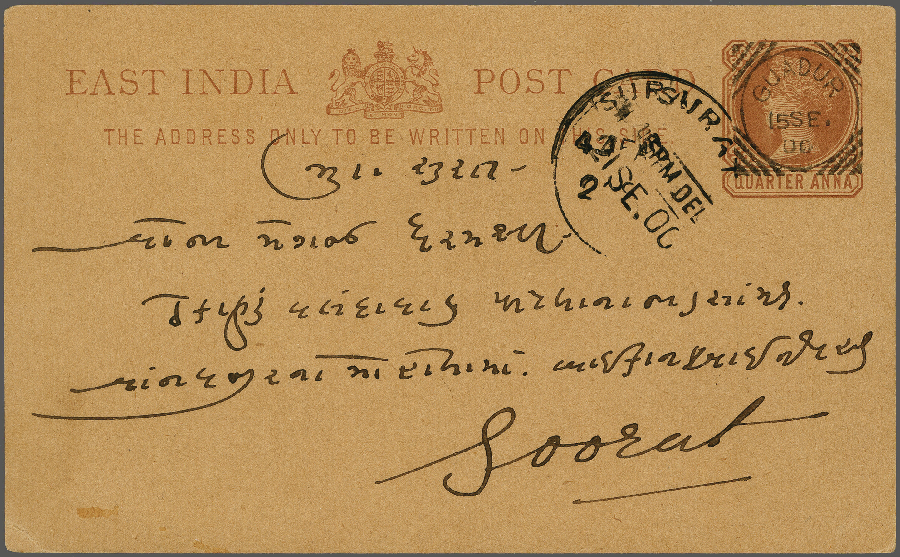 India used abroad in Muscat 1900 (Sept 15): QV ¼ a. stationery postal card to Surat, Gujarat, the indicium centrally cancelled with superb squared circle thimble GUADUR datestamp, SURAT arrival cds (Sept 21) alongside, a very