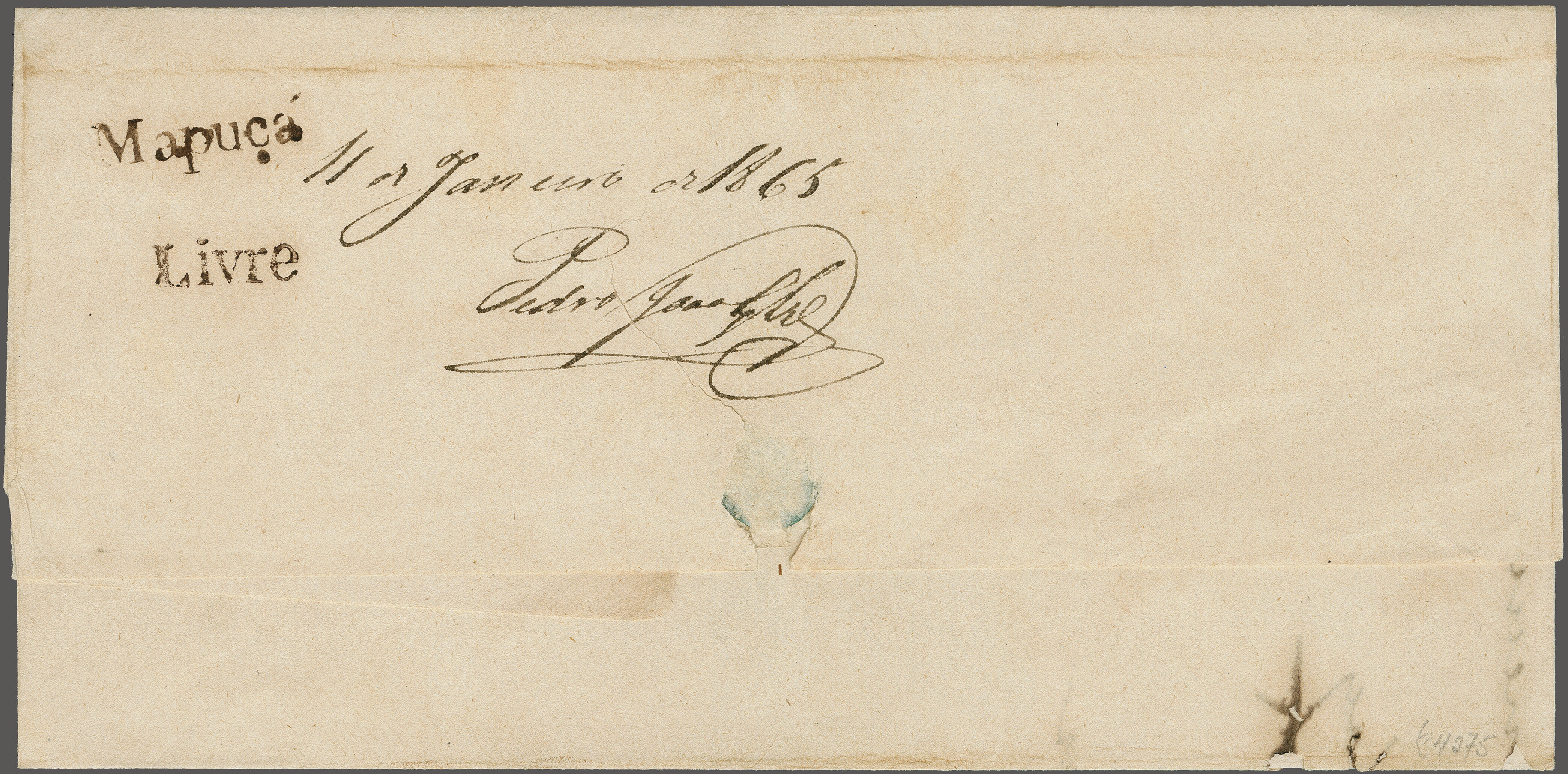 Portuguese India 1865 (Jan 11): Official folded cover sent internally in the Goa district, handstamped on backflap "Mapuçá / Livre" in black. Very fine and rare strike. Ex Chazen. (Image 1)