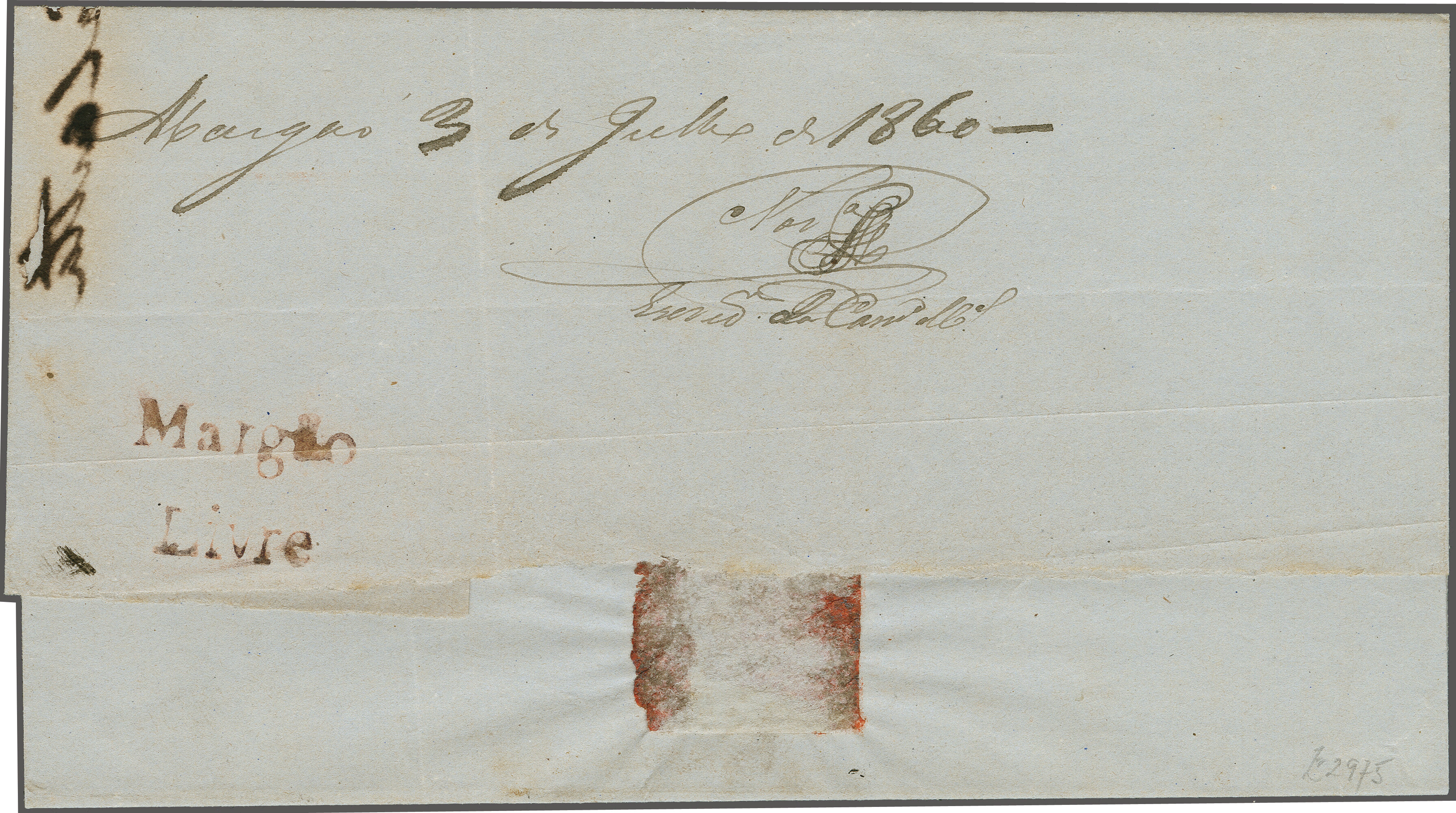 Portuguese India, 1860 (July 3): Official folded cover from the Goa district with Margao dateline addressed internally, two-line "Margao / Livre" handstamp in red on reverse. Fine and scarce, ex Chazen. (Image 1)