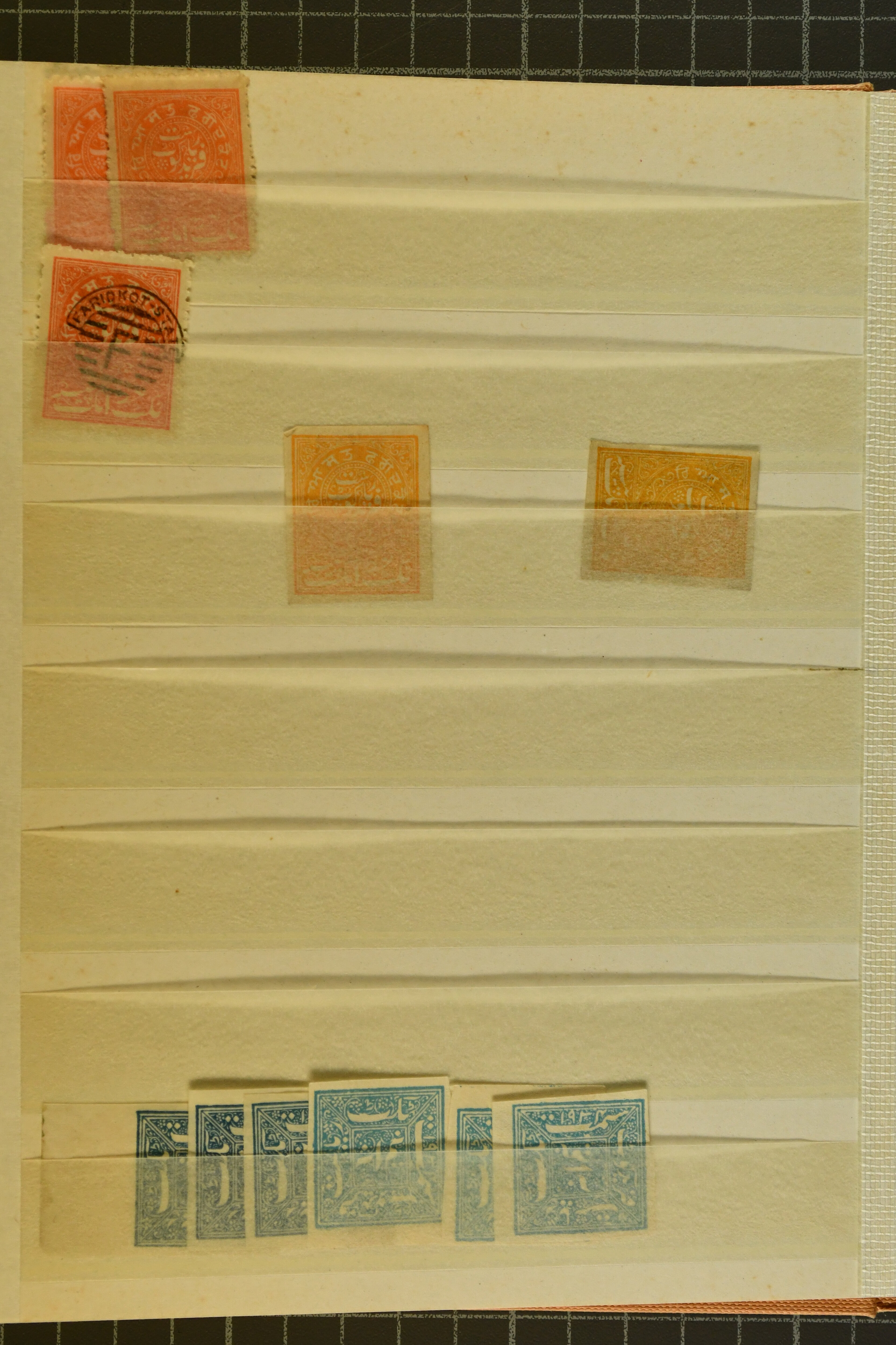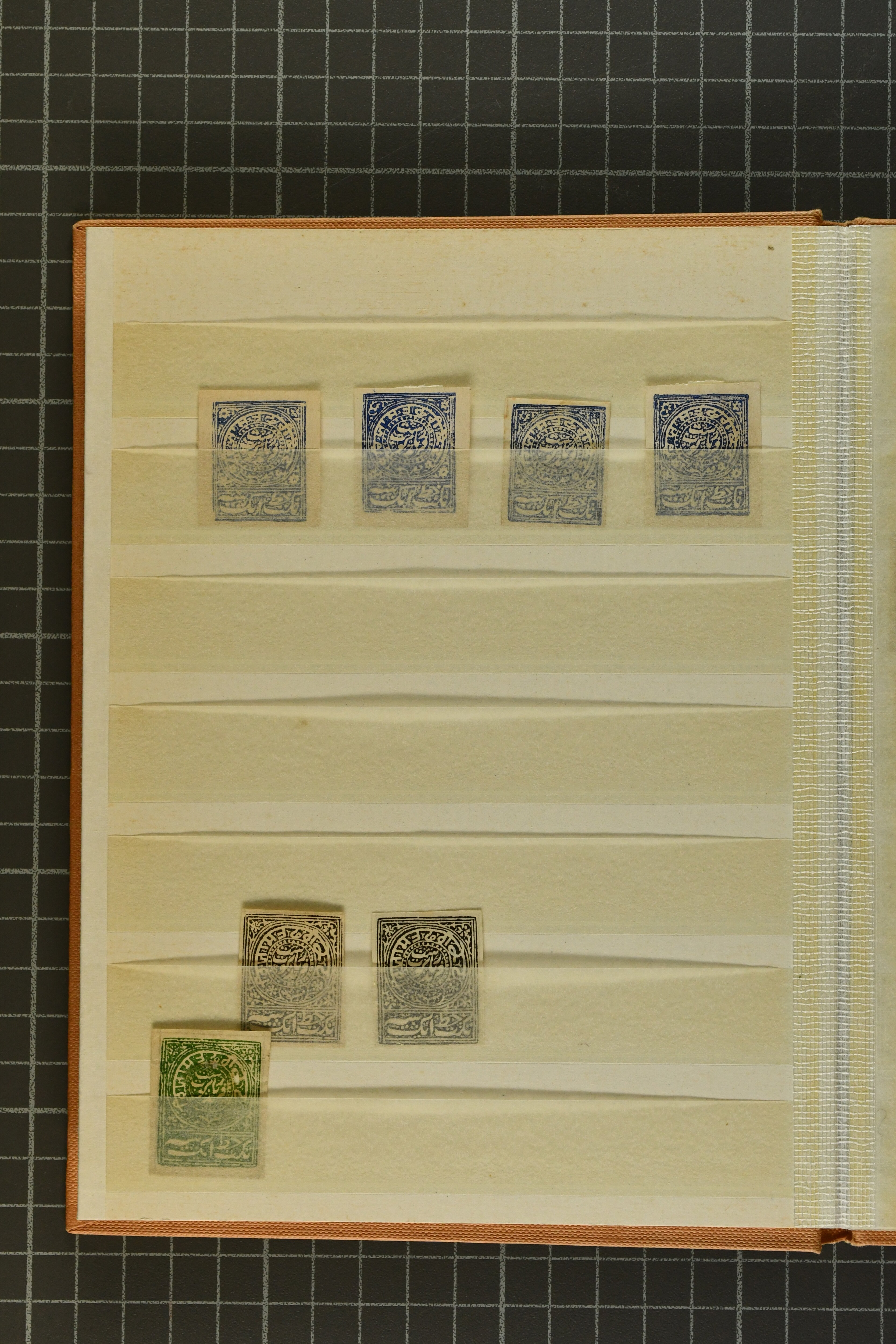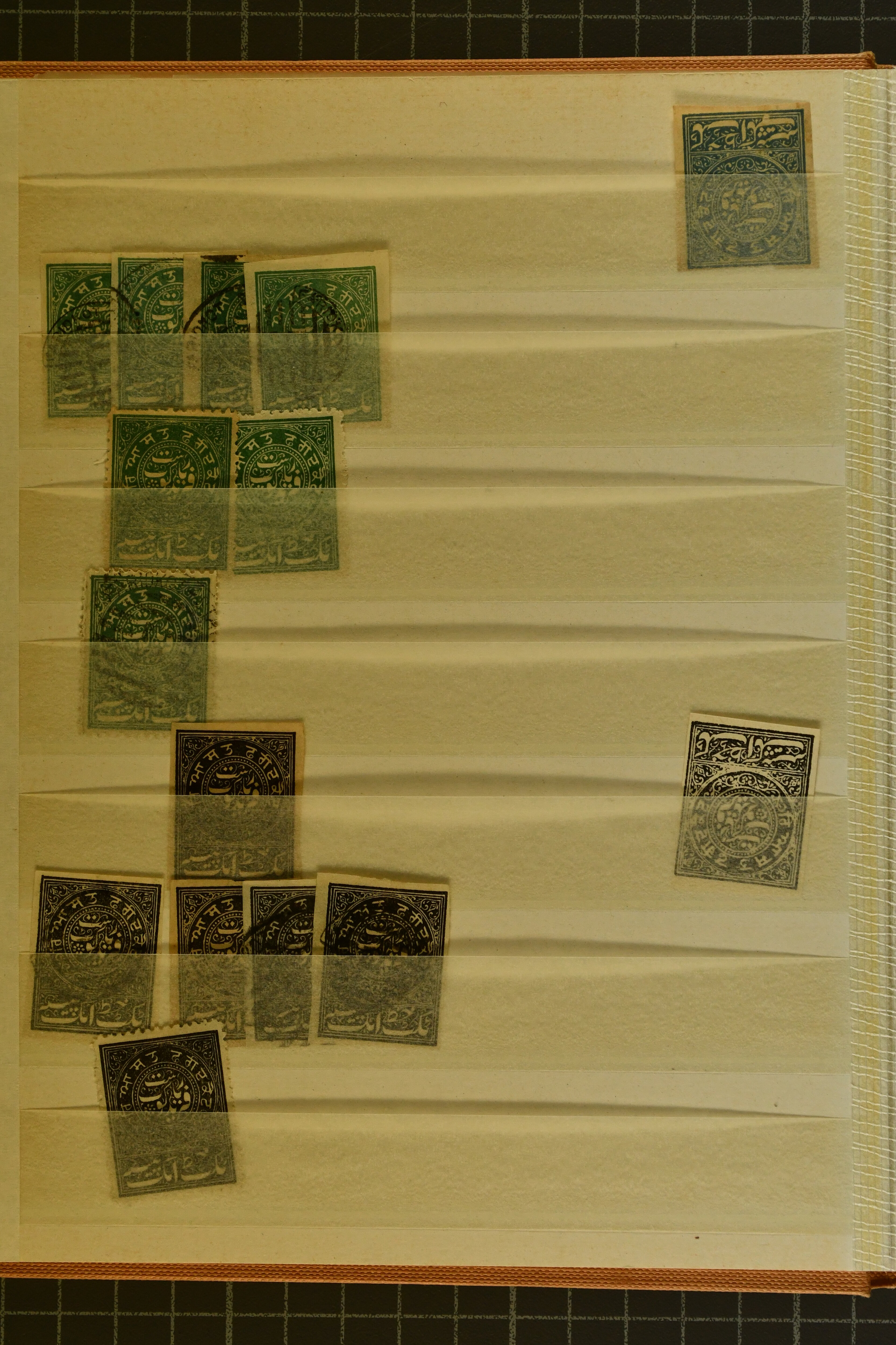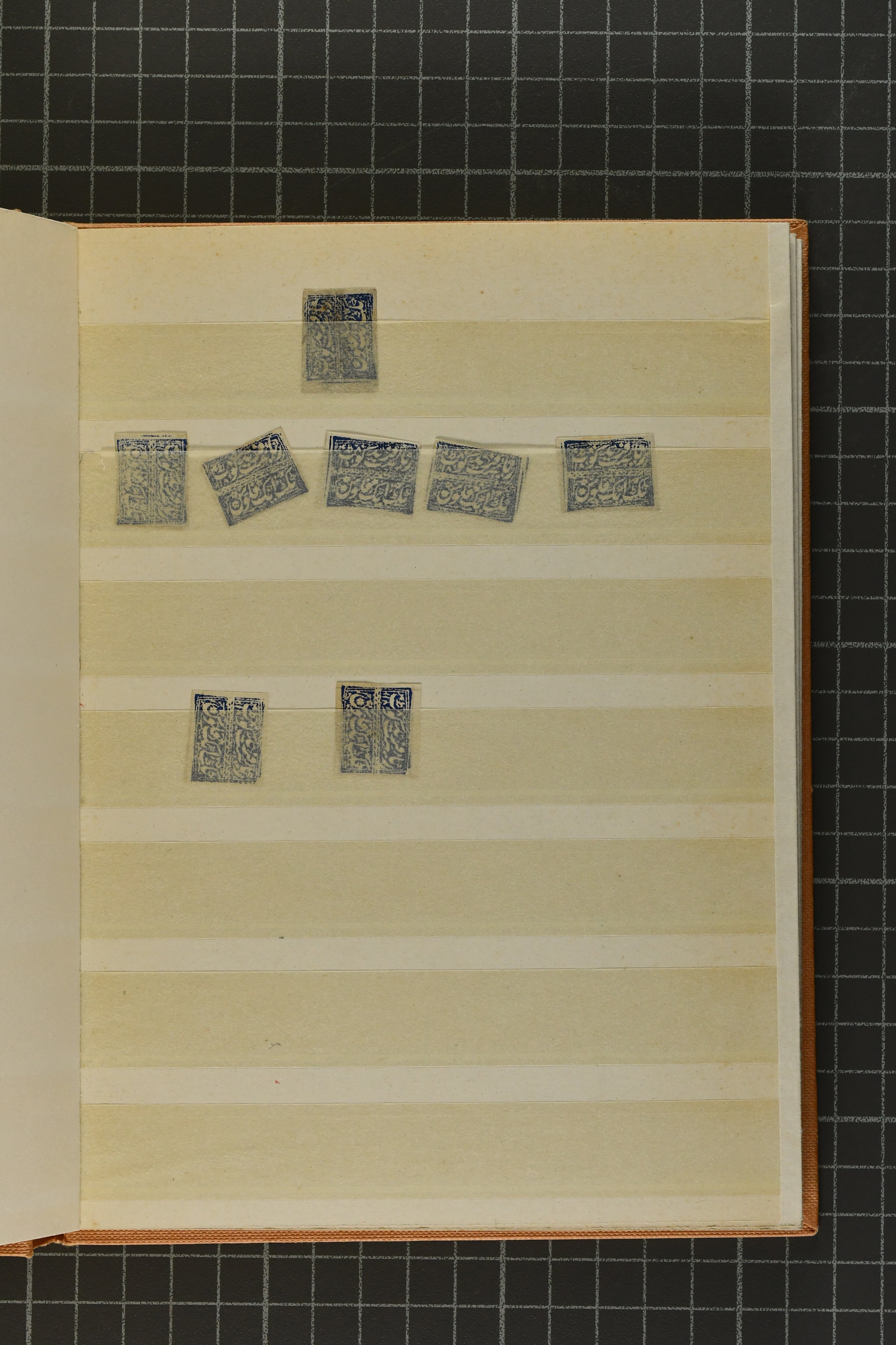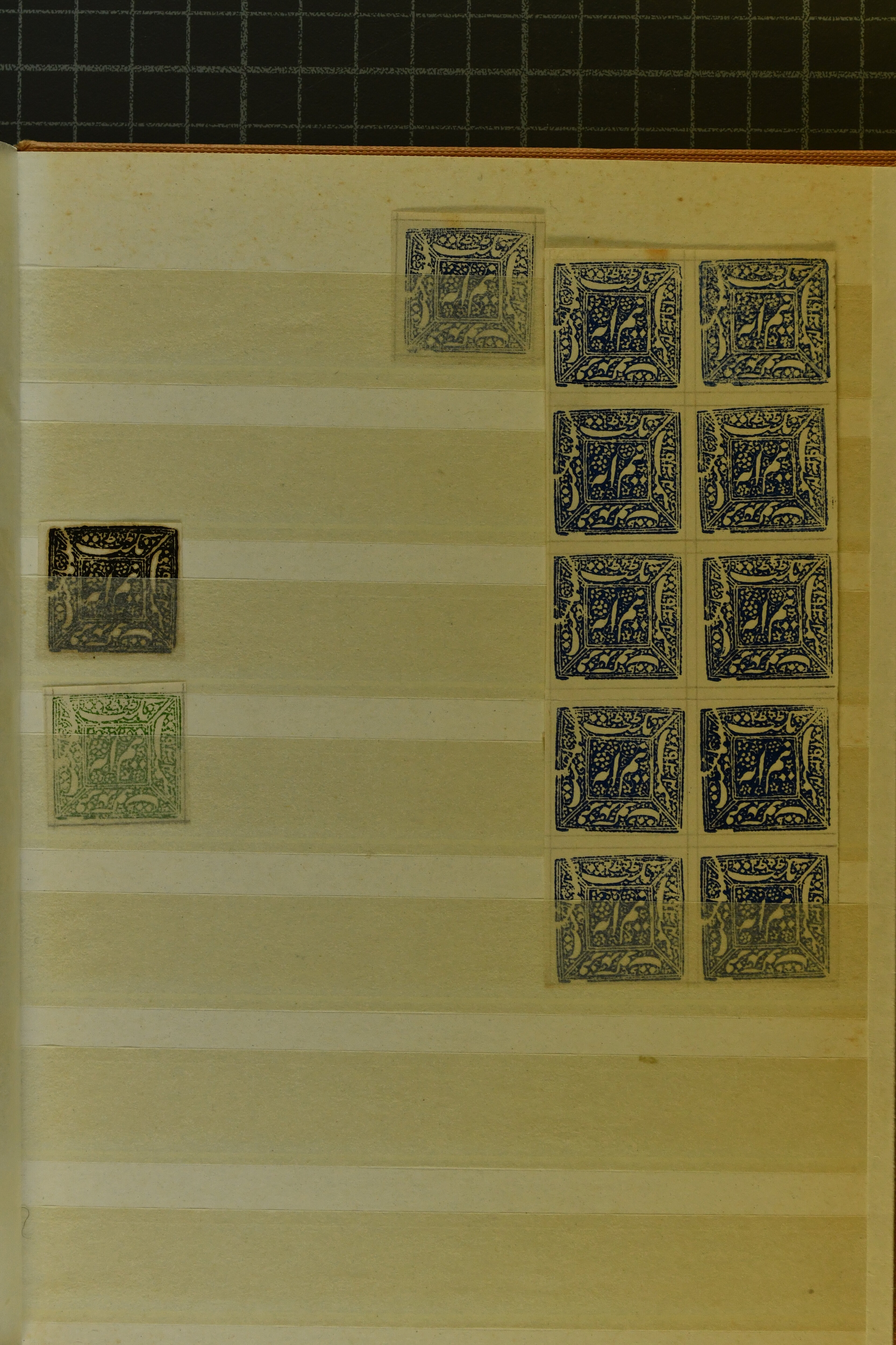 Indian Feudatory States, Faridkot 1879/86: Group of unused adhesives with 1 f. ultramarine (8) and 1 p. ultramarine (4) on diff. papers; in addition handstamped issues made for the philatelic market in diff.