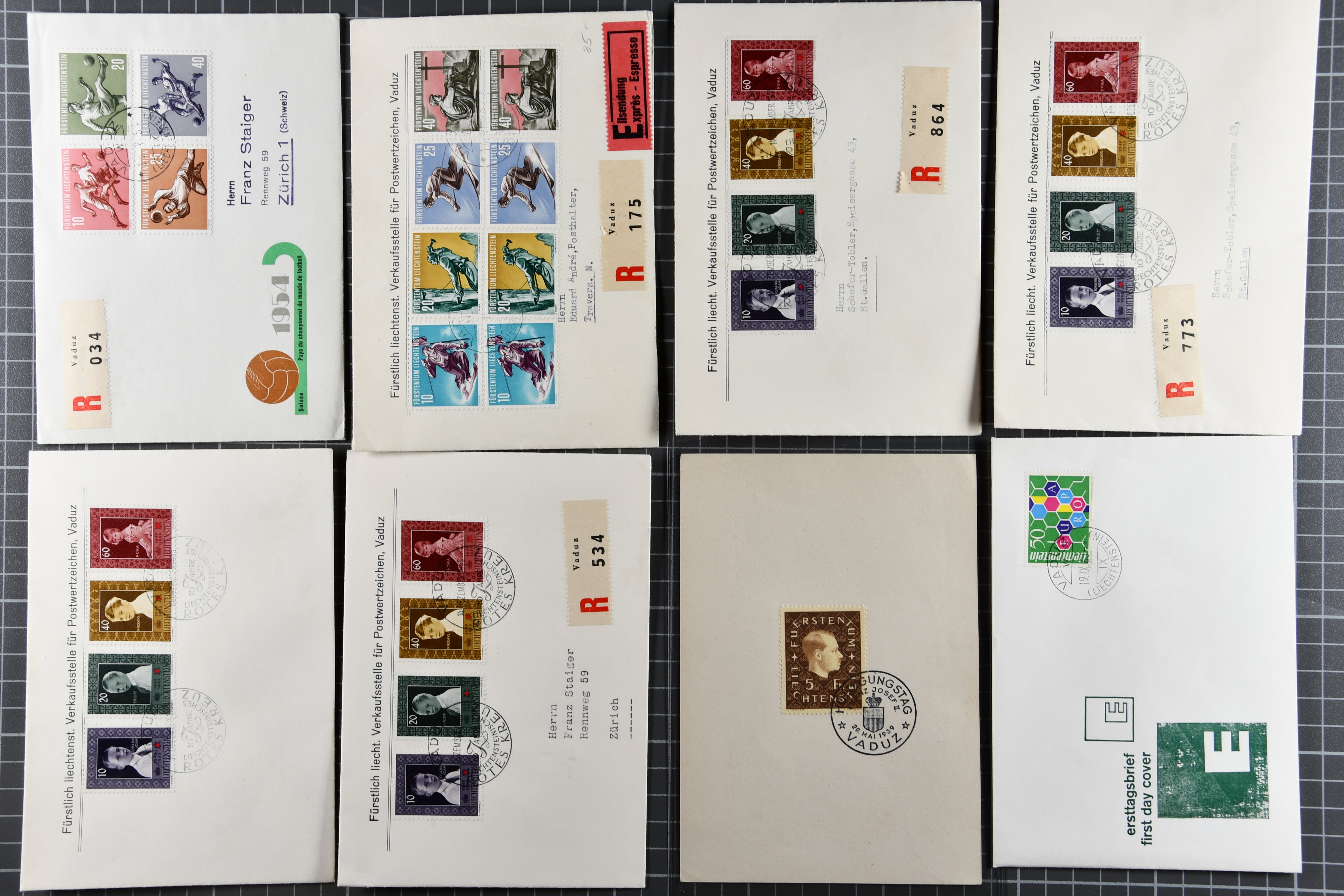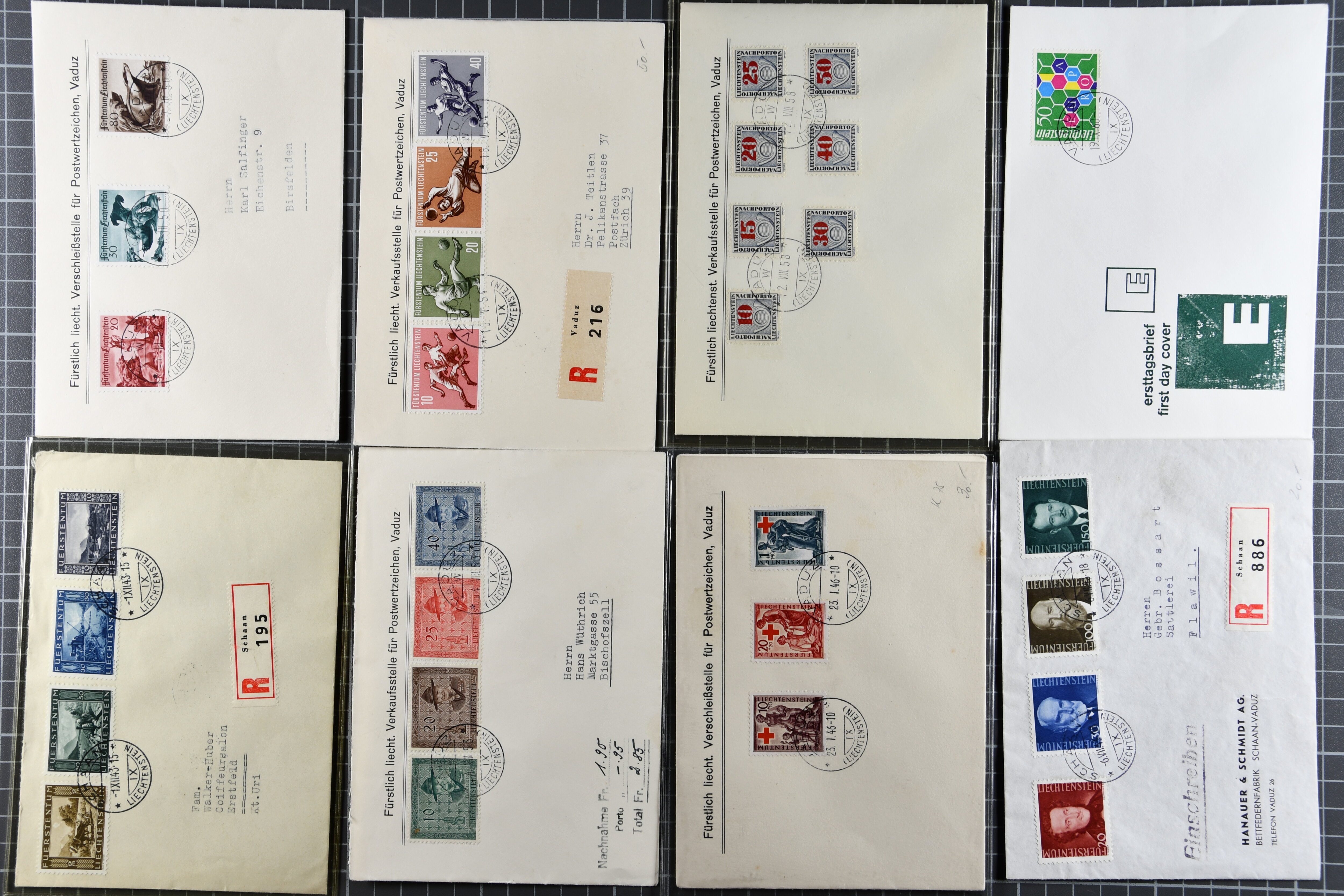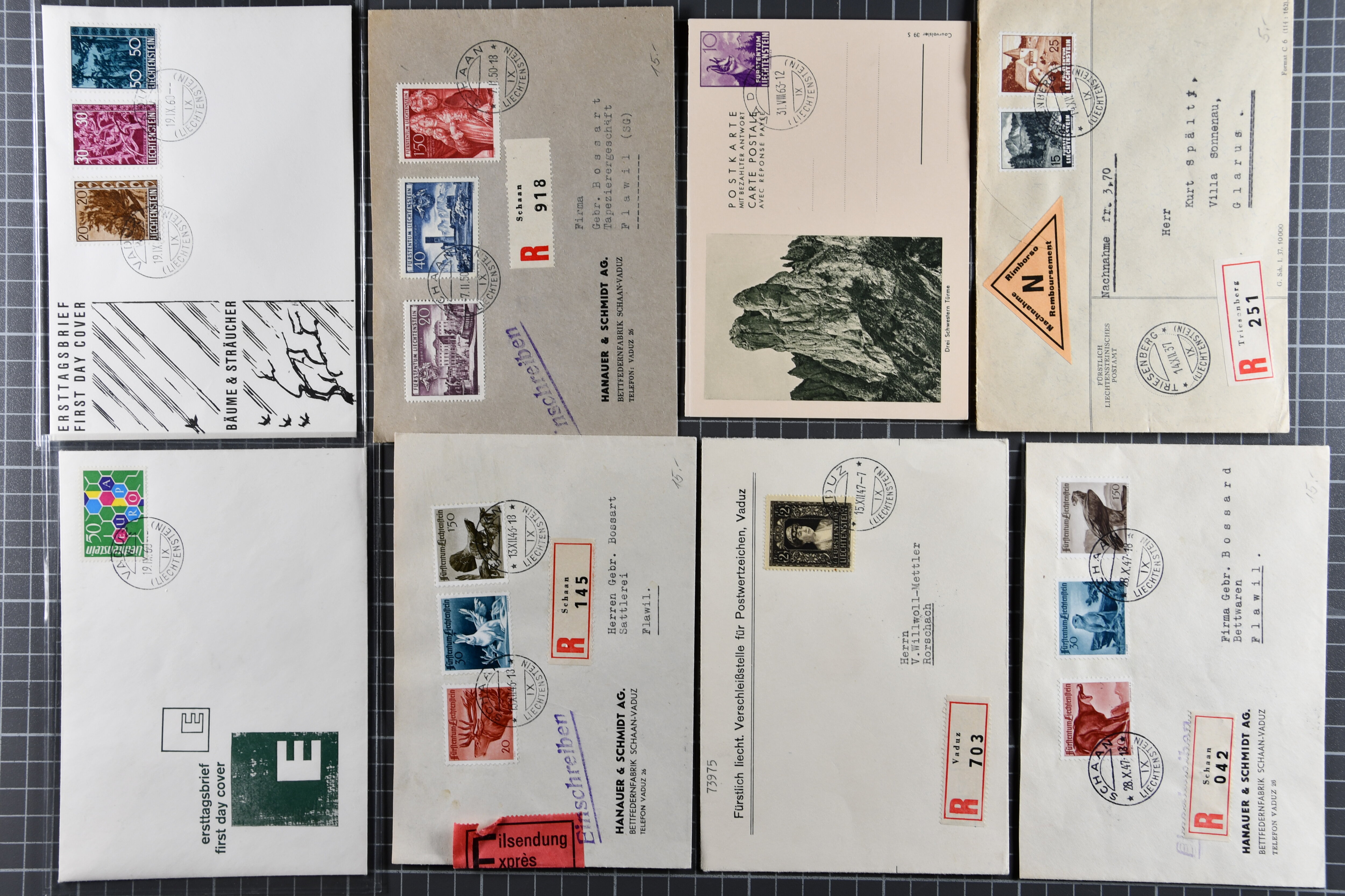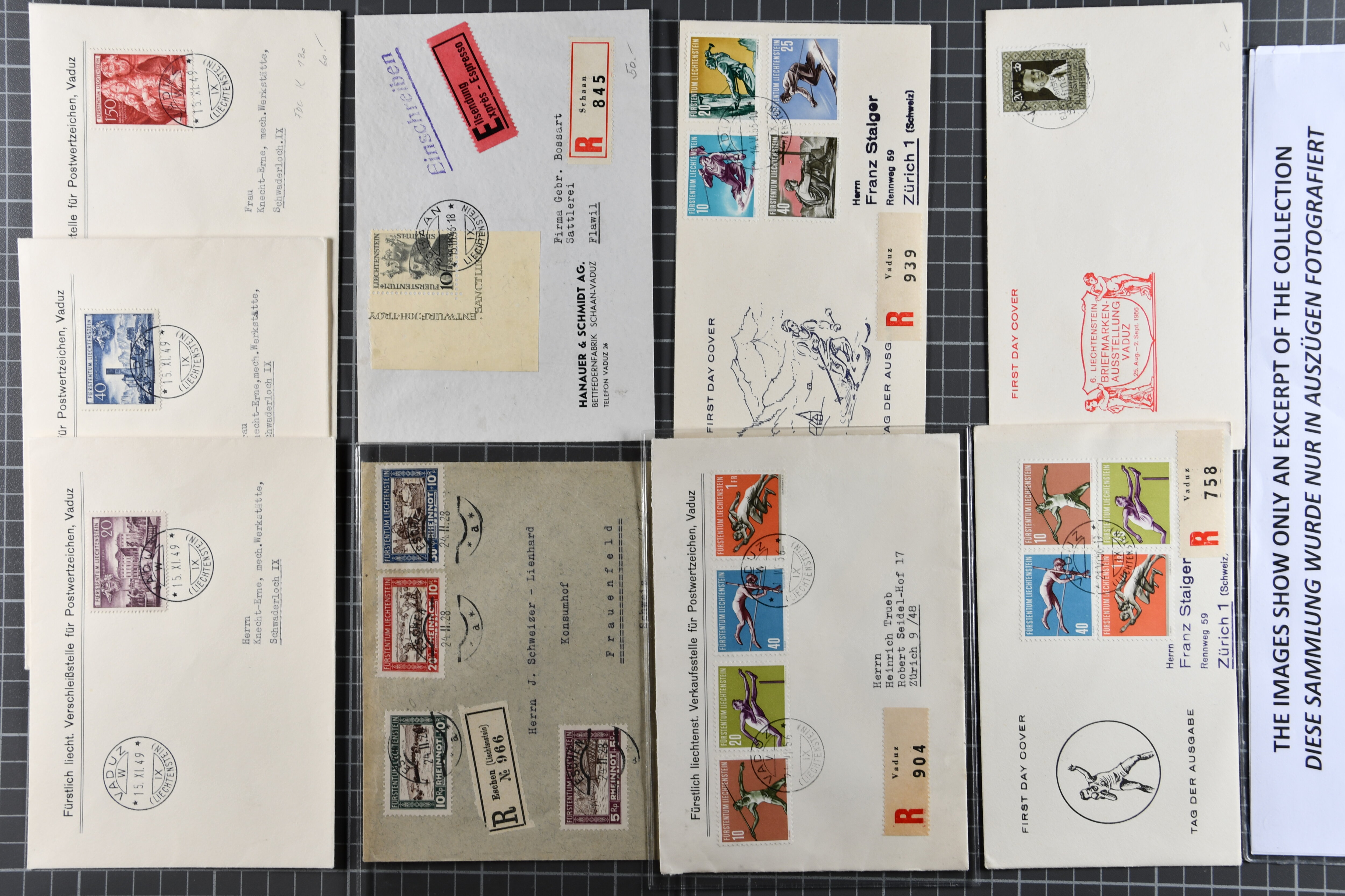 9443 cover image1928/2005: Lagerposten hunderter Satz- und Ersttagsbriefe in drei Plastikboxen. Dabei etwas über hundert bessere Belege bis 1960 mit u.a. 1928, "Rheinnot", kpl. Satz (LBK W7-10) sauber gest. "ESCHEN 24.II.28" auf Einschreibebrief nach Frauenfeld, Satzbriefe der Ausgaben 1943 "Binnenkanal" und "Fürstenbilder II", FDC 1950 "Jagd A-III" (LBK 232-4), 1953 "Int. Pfadfinderkonferenz" (LBK 259-62), 1954 "Fussball" (2, LBK 266-9) und jeweils mehrfach vorhanden 1960 "30 Jahre Flugpostmarken" (5), "Europa" (11), "Heimatliche Bäume und Sträucher IV" (6) und Fürstenpaar (10). Später viel Material ab 2000, jedoch wenige Belege aus den Jahren dazwischen. Dazu etwas Bedarfspost aus den 30er und 40er Jahren inkl. 1946 10 Fr. "St. Luzius" aus der rechten unteren Bogenecke auf sauberem R-Expressbrief von Schaan nach Flawil (SG). Gute Erhaltung. (Image 1) (Image 2) (Image 3) (Image 4) (Image 5) (Image 6)