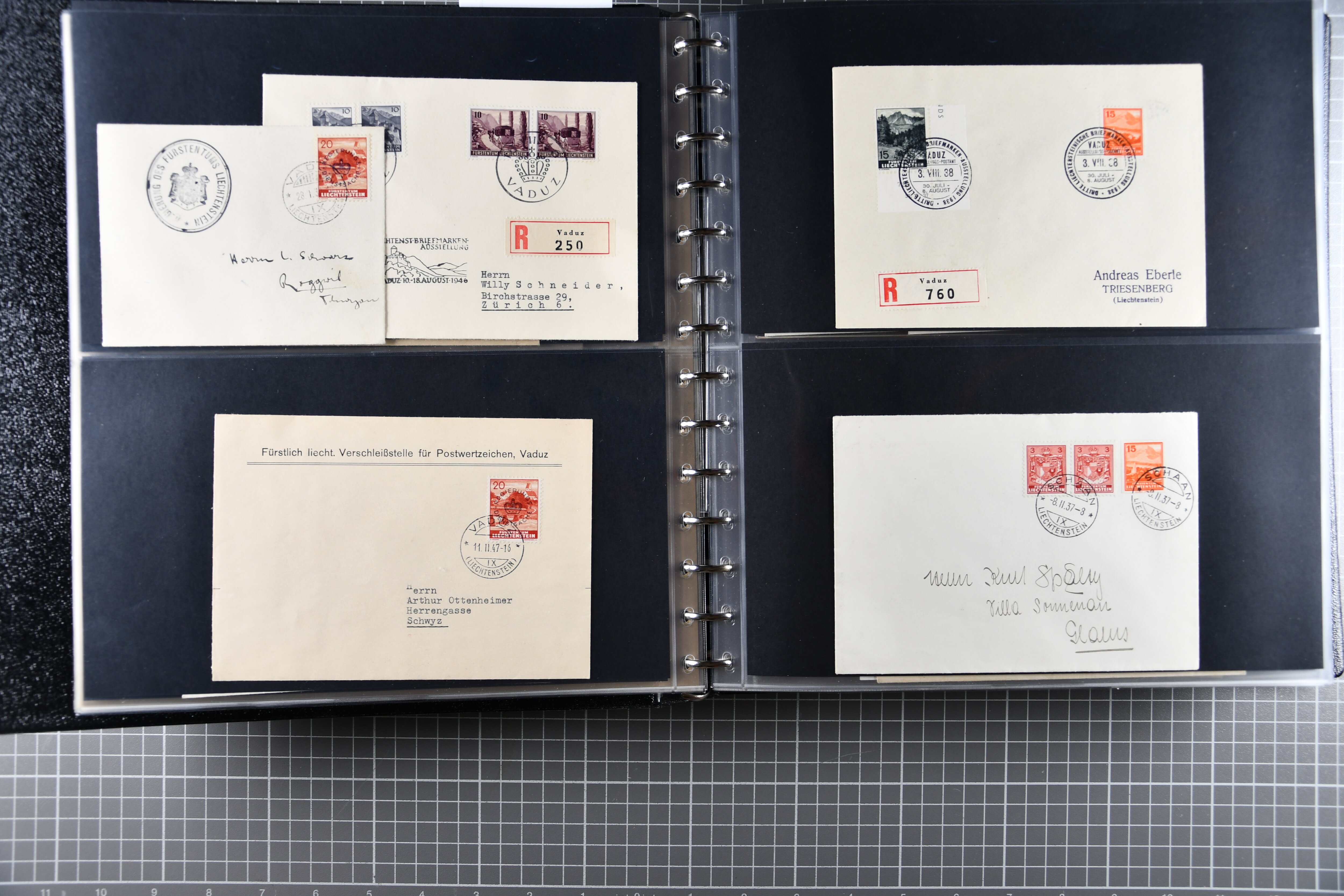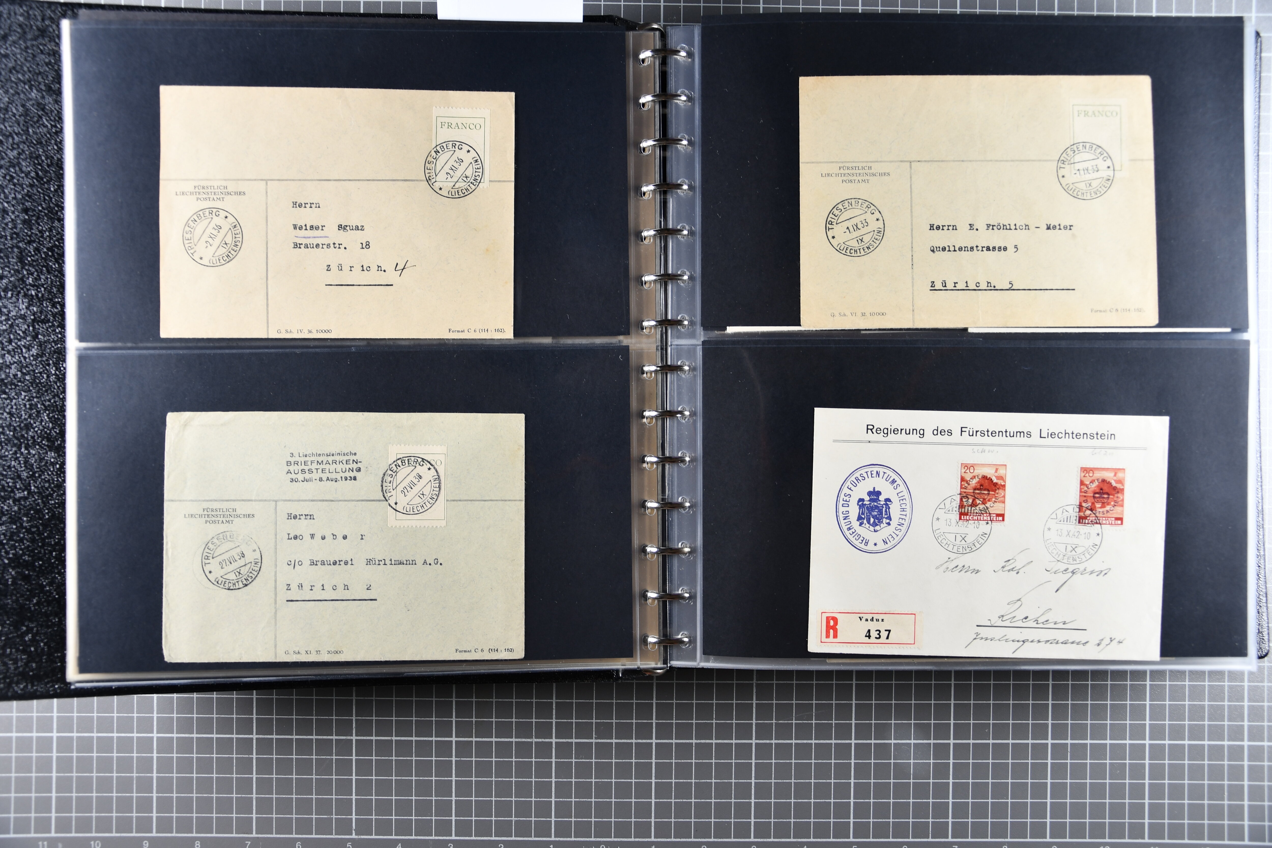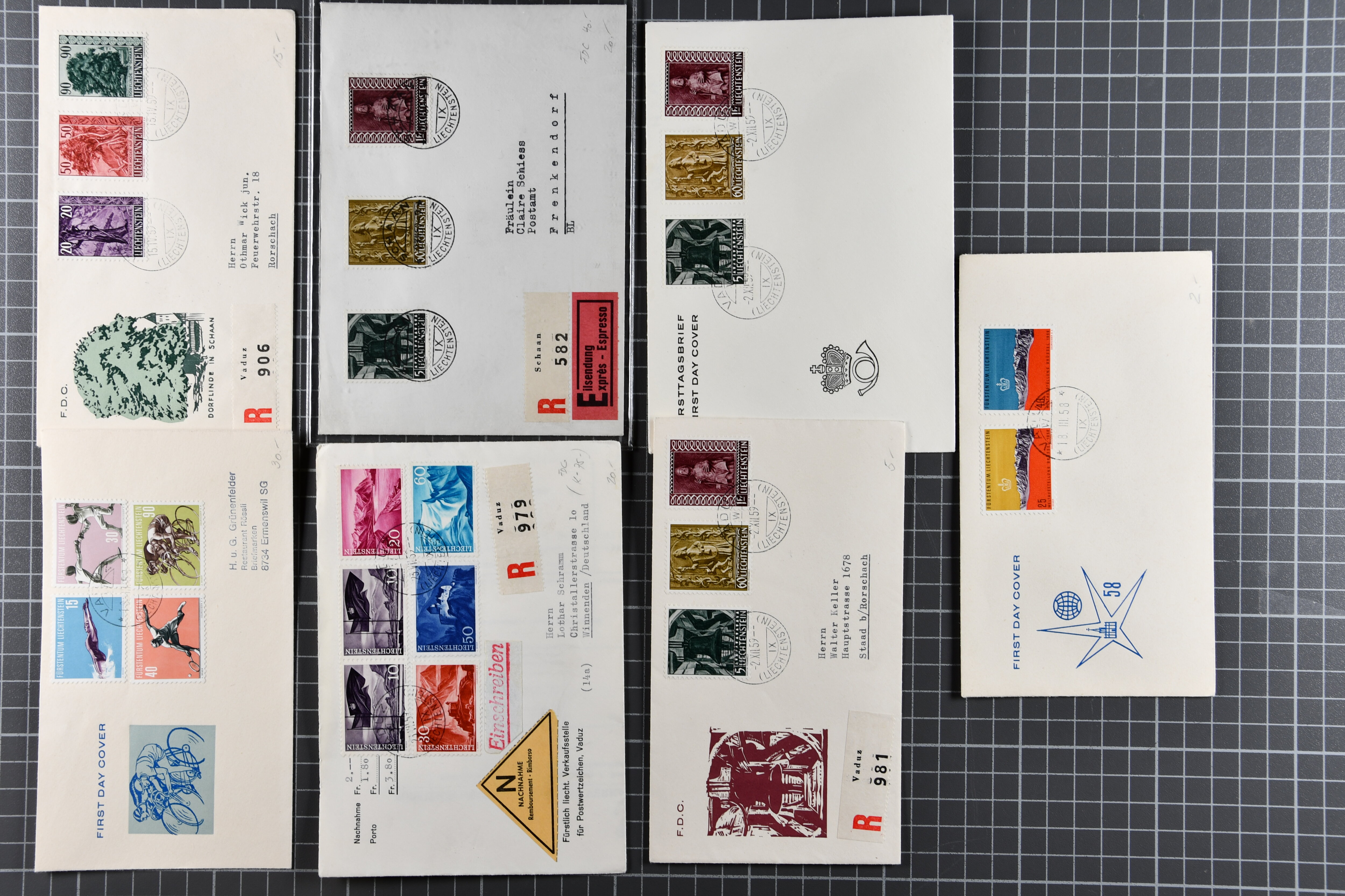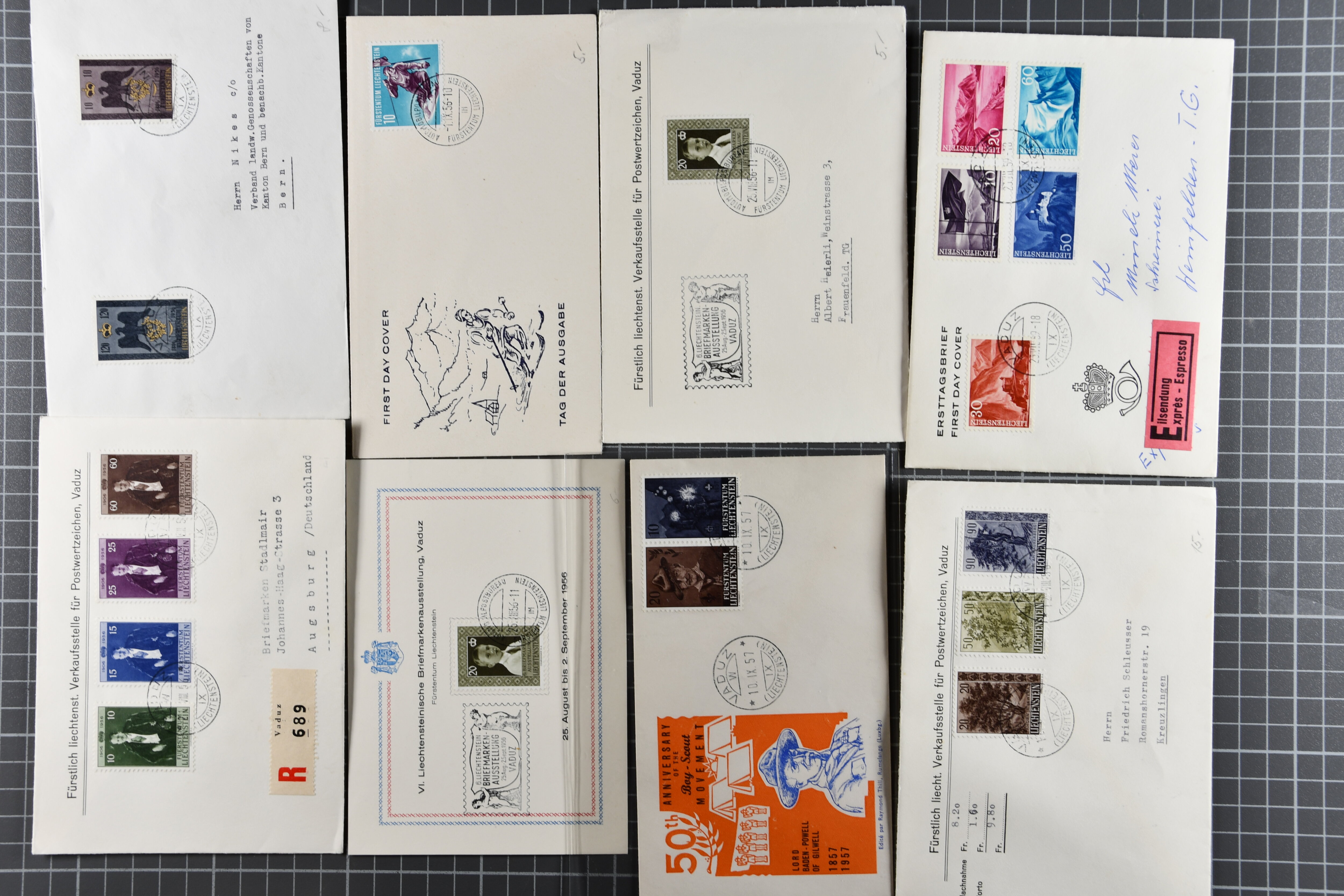 9443 cover image1928/2005: Lagerposten hunderter Satz- und Ersttagsbriefe in drei Plastikboxen. Dabei etwas über hundert bessere Belege bis 1960 mit u.a. 1928, "Rheinnot", kpl. Satz (LBK W7-10) sauber gest. "ESCHEN 24.II.28" auf Einschreibebrief nach Frauenfeld, Satzbriefe der Ausgaben 1943 "Binnenkanal" und "Fürstenbilder II", FDC 1950 "Jagd A-III" (LBK 232-4), 1953 "Int. Pfadfinderkonferenz" (LBK 259-62), 1954 "Fussball" (2, LBK 266-9) und jeweils mehrfach vorhanden 1960 "30 Jahre Flugpostmarken" (5), "Europa" (11), "Heimatliche Bäume und Sträucher IV" (6) und Fürstenpaar (10). Später viel Material ab 2000, jedoch wenige Belege aus den Jahren dazwischen. Dazu etwas Bedarfspost aus den 30er und 40er Jahren inkl. 1946 10 Fr. "St. Luzius" aus der rechten unteren Bogenecke auf sauberem R-Expressbrief von Schaan nach Flawil (SG). Gute Erhaltung. (Image 1) (Image 2) (Image 3) (Image 4) (Image 5) (Image 6)