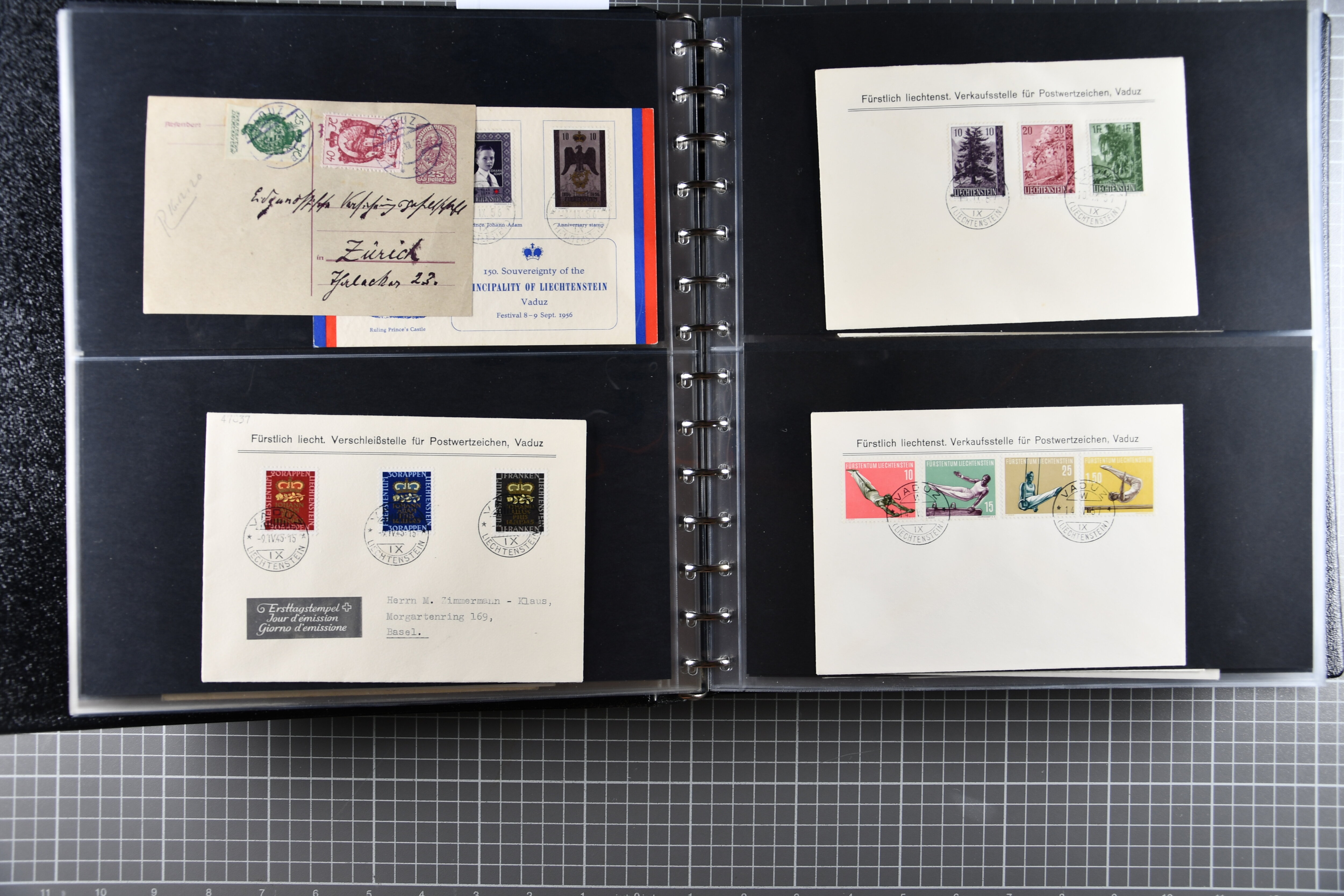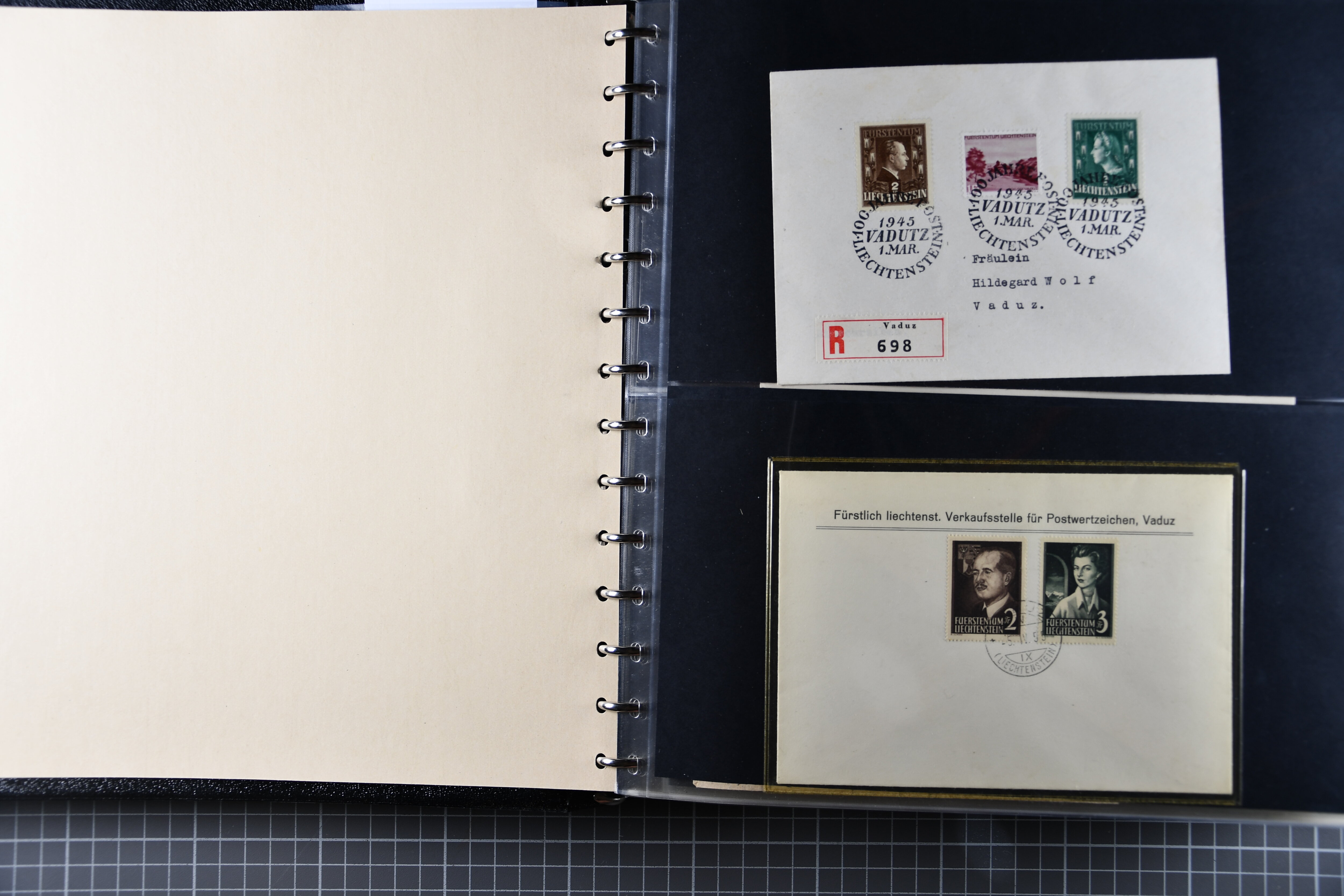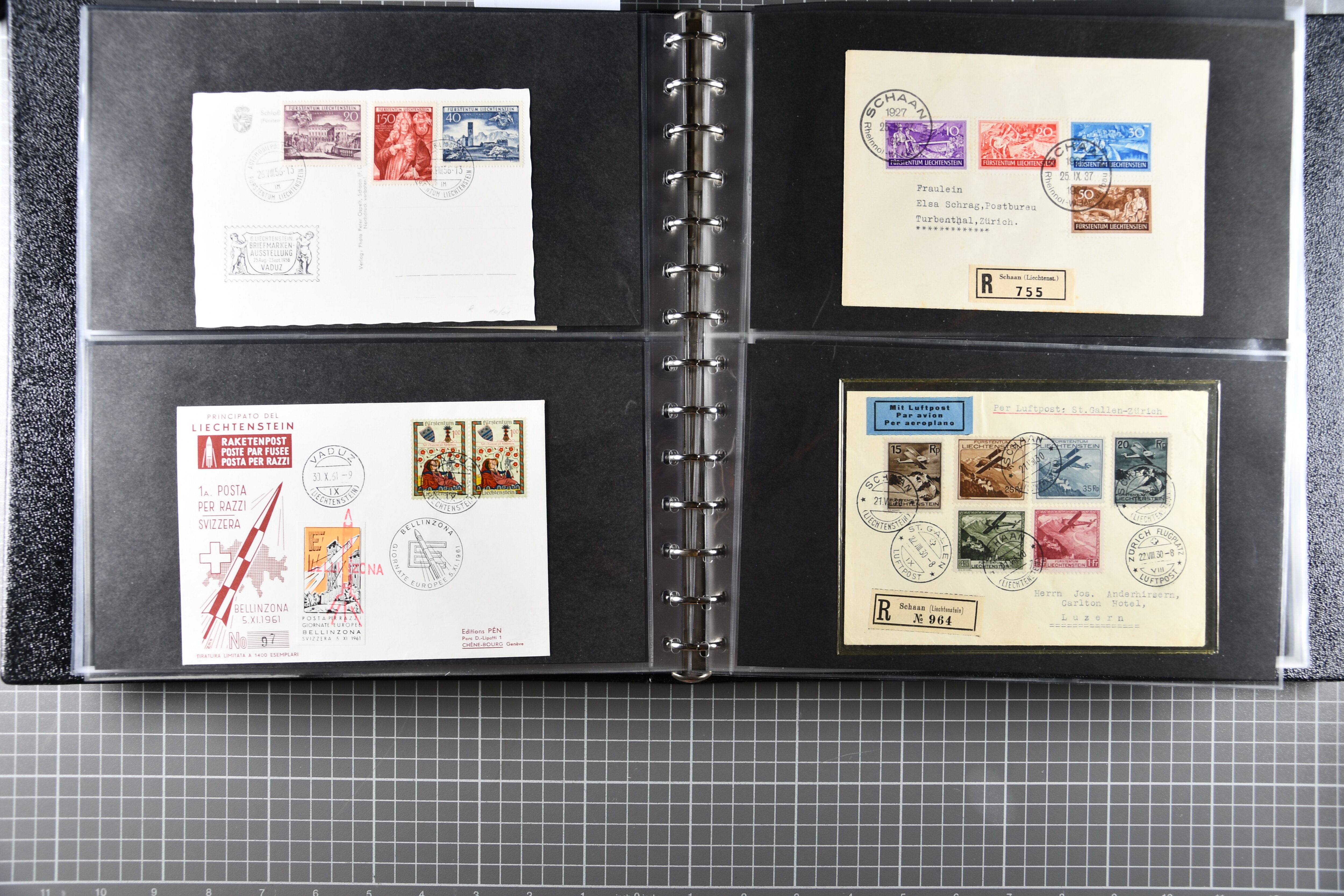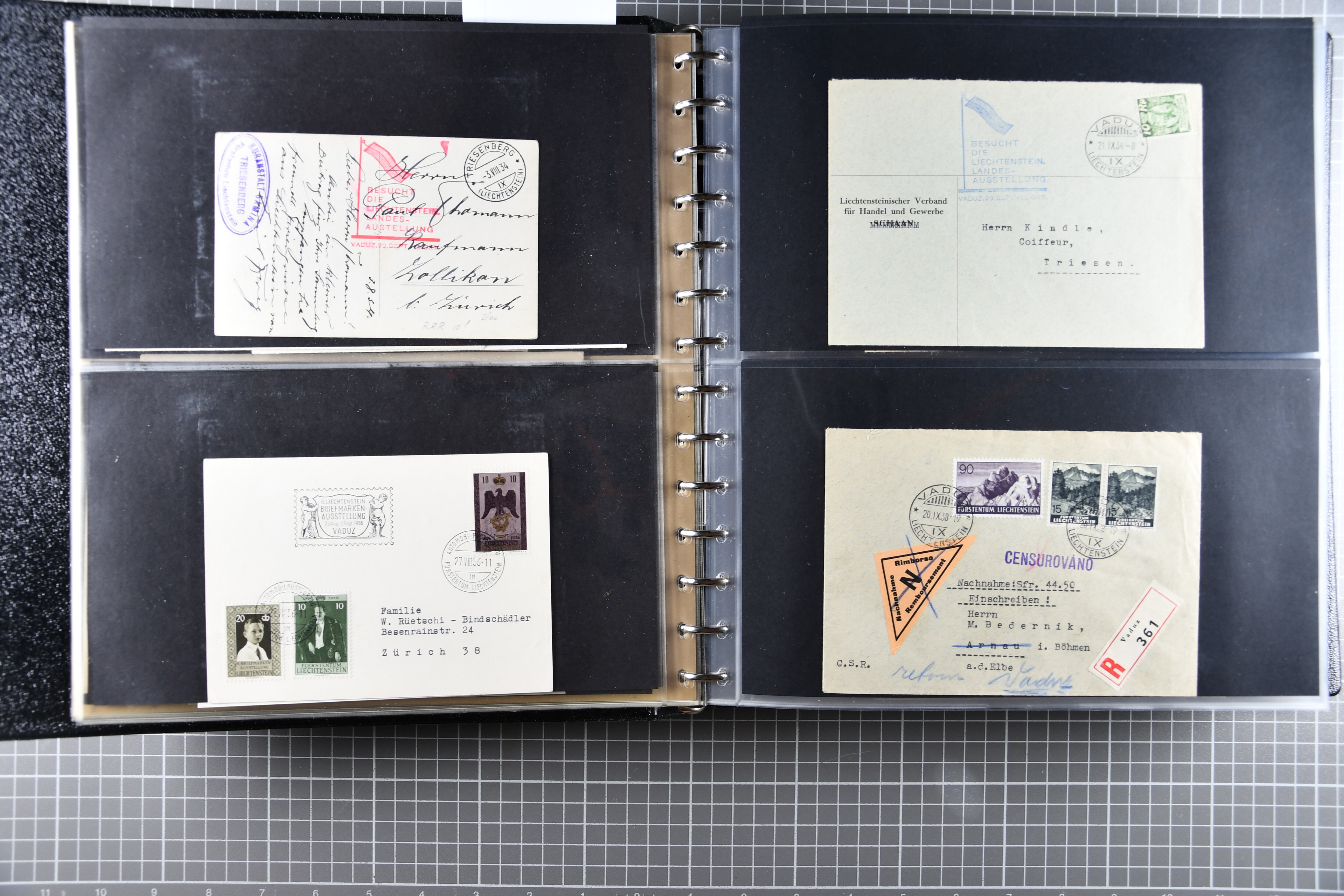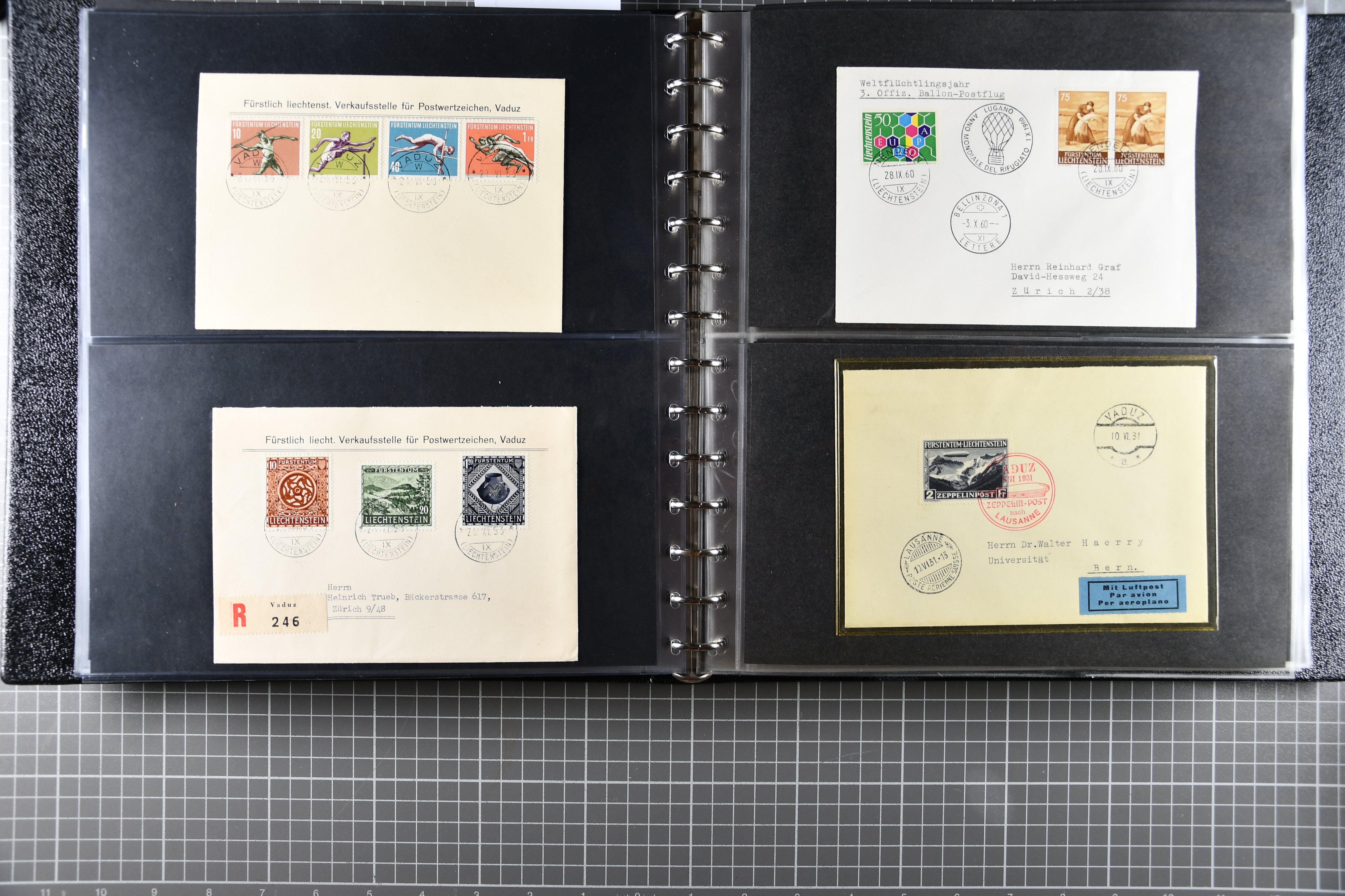 9443 cover image1928/2005: Lagerposten hunderter Satz- und Ersttagsbriefe in drei Plastikboxen. Dabei etwas über hundert bessere Belege bis 1960 mit u.a. 1928, "Rheinnot", kpl. Satz (LBK W7-10) sauber gest. "ESCHEN 24.II.28" auf Einschreibebrief nach Frauenfeld, Satzbriefe der Ausgaben 1943 "Binnenkanal" und "Fürstenbilder II", FDC 1950 "Jagd A-III" (LBK 232-4), 1953 "Int. Pfadfinderkonferenz" (LBK 259-62), 1954 "Fussball" (2, LBK 266-9) und jeweils mehrfach vorhanden 1960 "30 Jahre Flugpostmarken" (5), "Europa" (11), "Heimatliche Bäume und Sträucher IV" (6) und Fürstenpaar (10). Später viel Material ab 2000, jedoch wenige Belege aus den Jahren dazwischen. Dazu etwas Bedarfspost aus den 30er und 40er Jahren inkl. 1946 10 Fr. "St. Luzius" aus der rechten unteren Bogenecke auf sauberem R-Expressbrief von Schaan nach Flawil (SG). Gute Erhaltung. (Image 1) (Image 2) (Image 3) (Image 4) (Image 5) (Image 6)