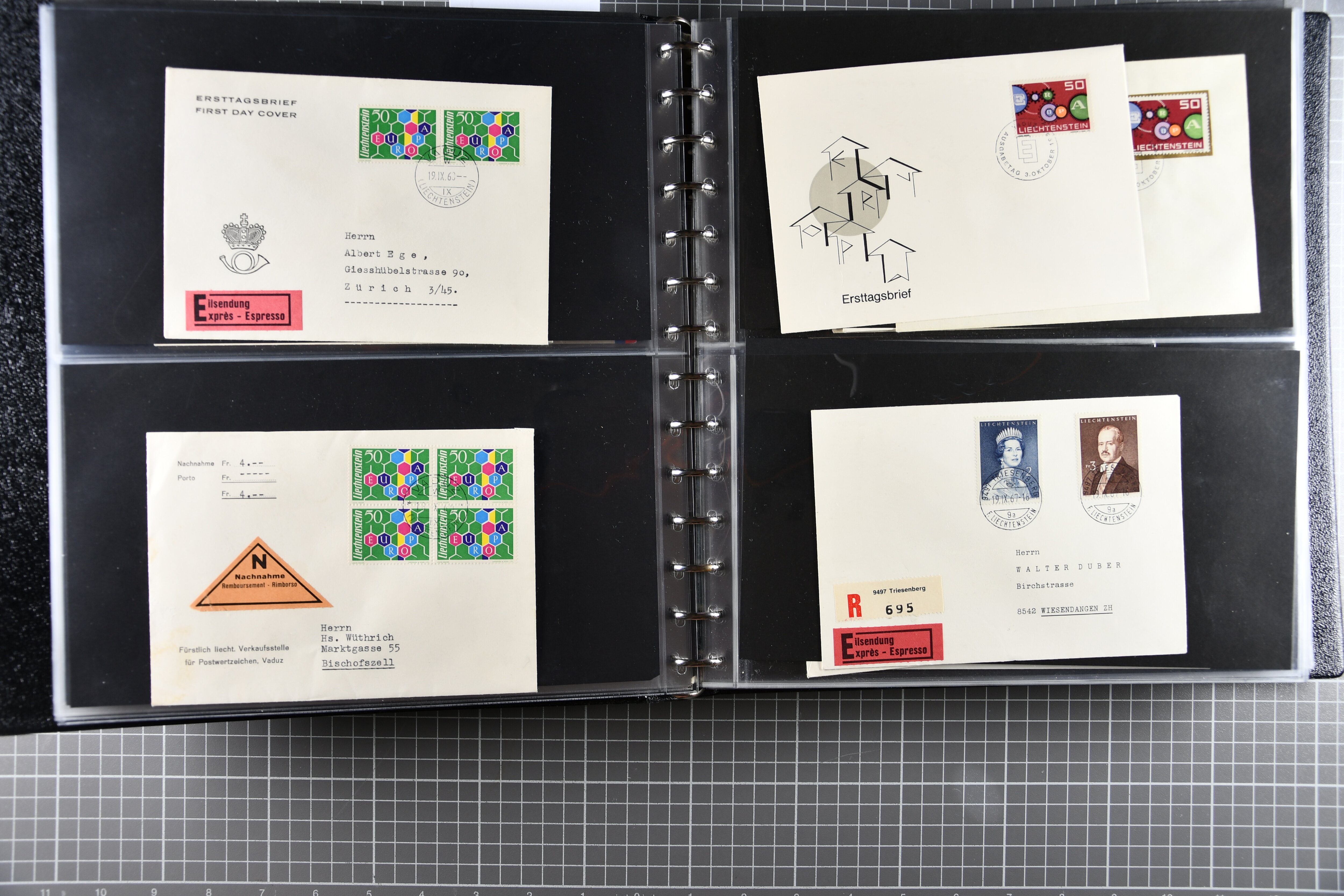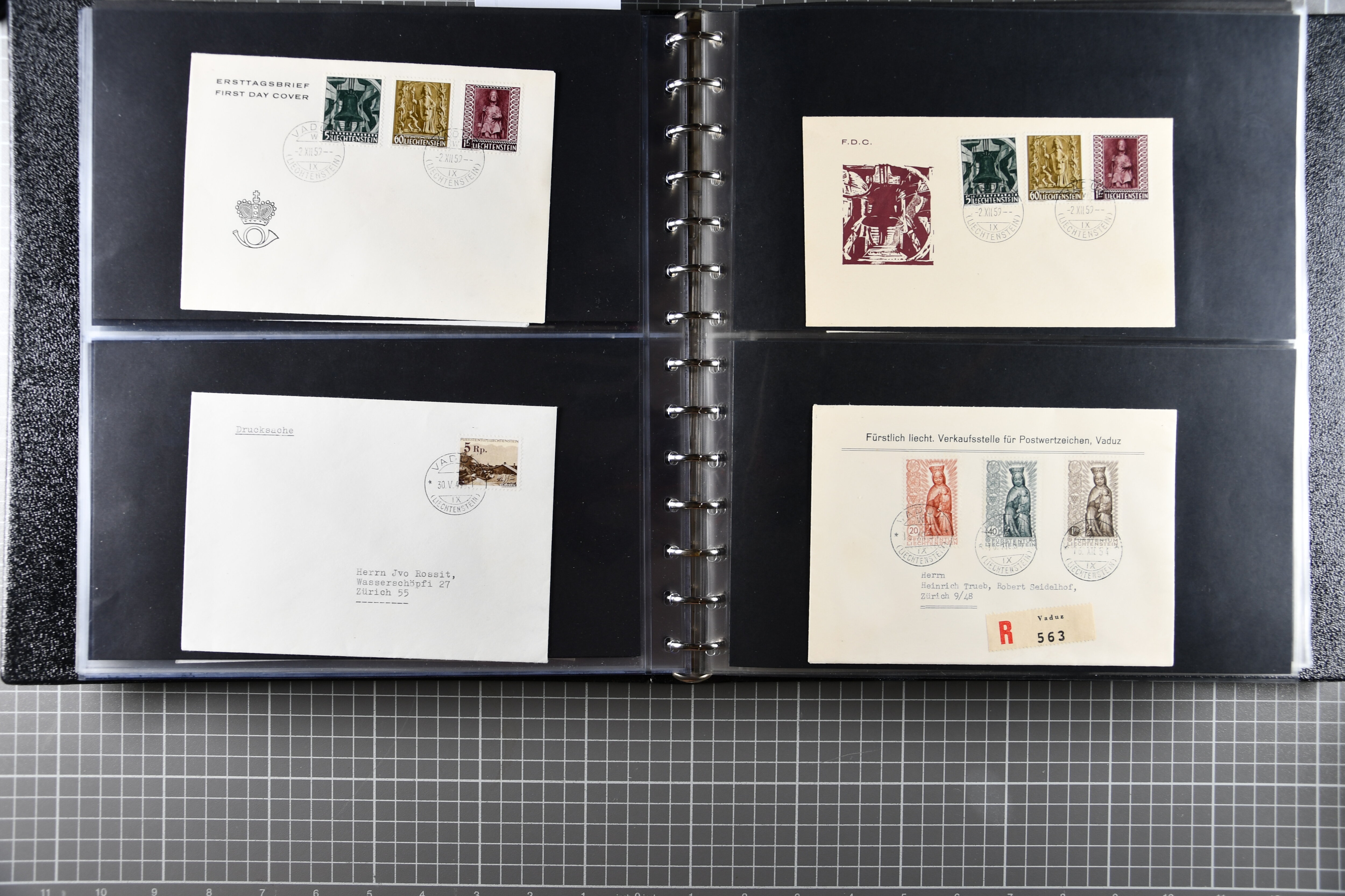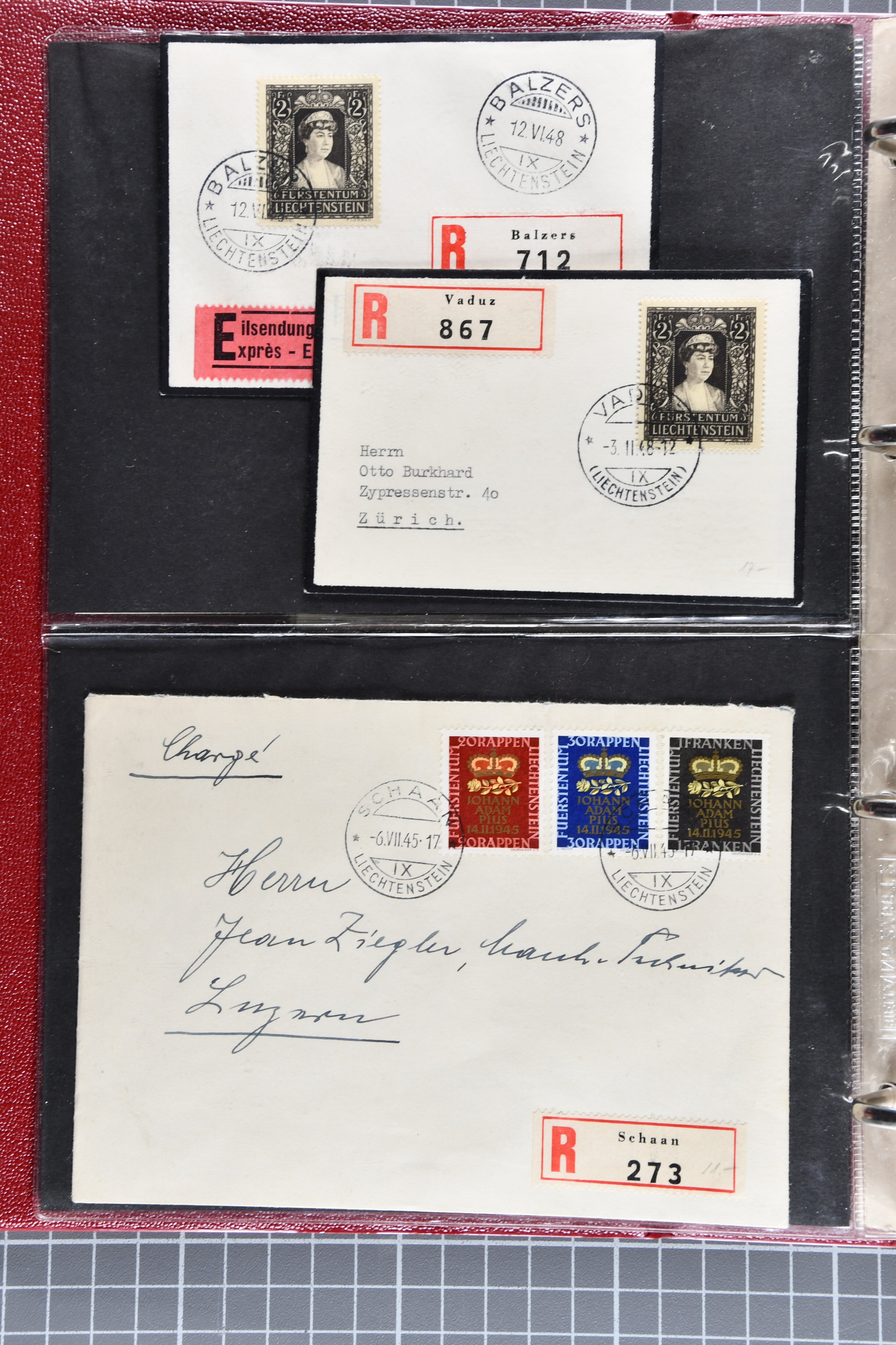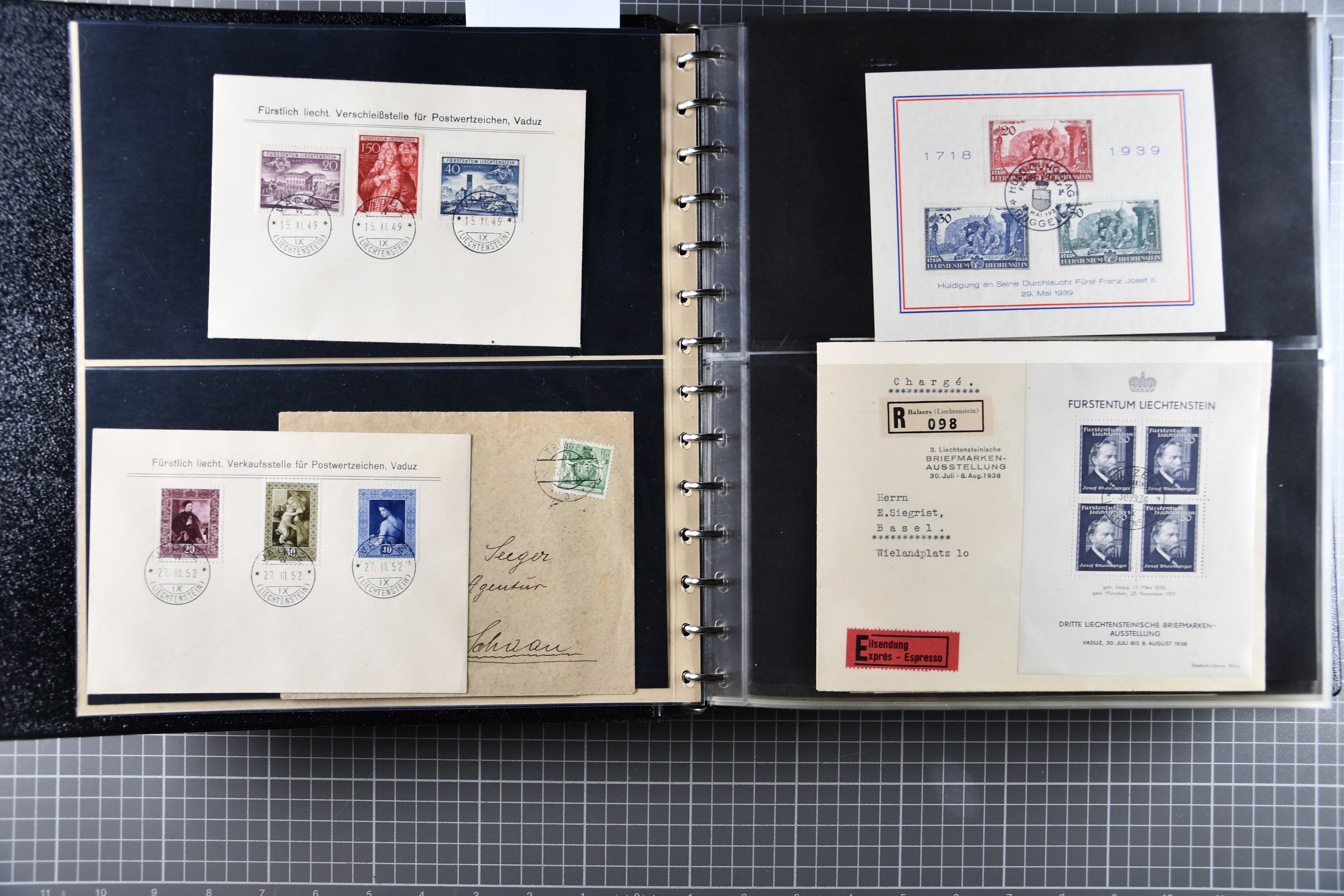 9443 cover image1928/2005: Lagerposten hunderter Satz- und Ersttagsbriefe in drei Plastikboxen. Dabei etwas über hundert bessere Belege bis 1960 mit u.a. 1928, "Rheinnot", kpl. Satz (LBK W7-10) sauber gest. "ESCHEN 24.II.28" auf Einschreibebrief nach Frauenfeld, Satzbriefe der Ausgaben 1943 "Binnenkanal" und "Fürstenbilder II", FDC 1950 "Jagd A-III" (LBK 232-4), 1953 "Int. Pfadfinderkonferenz" (LBK 259-62), 1954 "Fussball" (2, LBK 266-9) und jeweils mehrfach vorhanden 1960 "30 Jahre Flugpostmarken" (5), "Europa" (11), "Heimatliche Bäume und Sträucher IV" (6) und Fürstenpaar (10). Später viel Material ab 2000, jedoch wenige Belege aus den Jahren dazwischen. Dazu etwas Bedarfspost aus den 30er und 40er Jahren inkl. 1946 10 Fr. "St. Luzius" aus der rechten unteren Bogenecke auf sauberem R-Expressbrief von Schaan nach Flawil (SG). Gute Erhaltung. (Image 1) (Image 2) (Image 3) (Image 4) (Image 5) (Image 6)