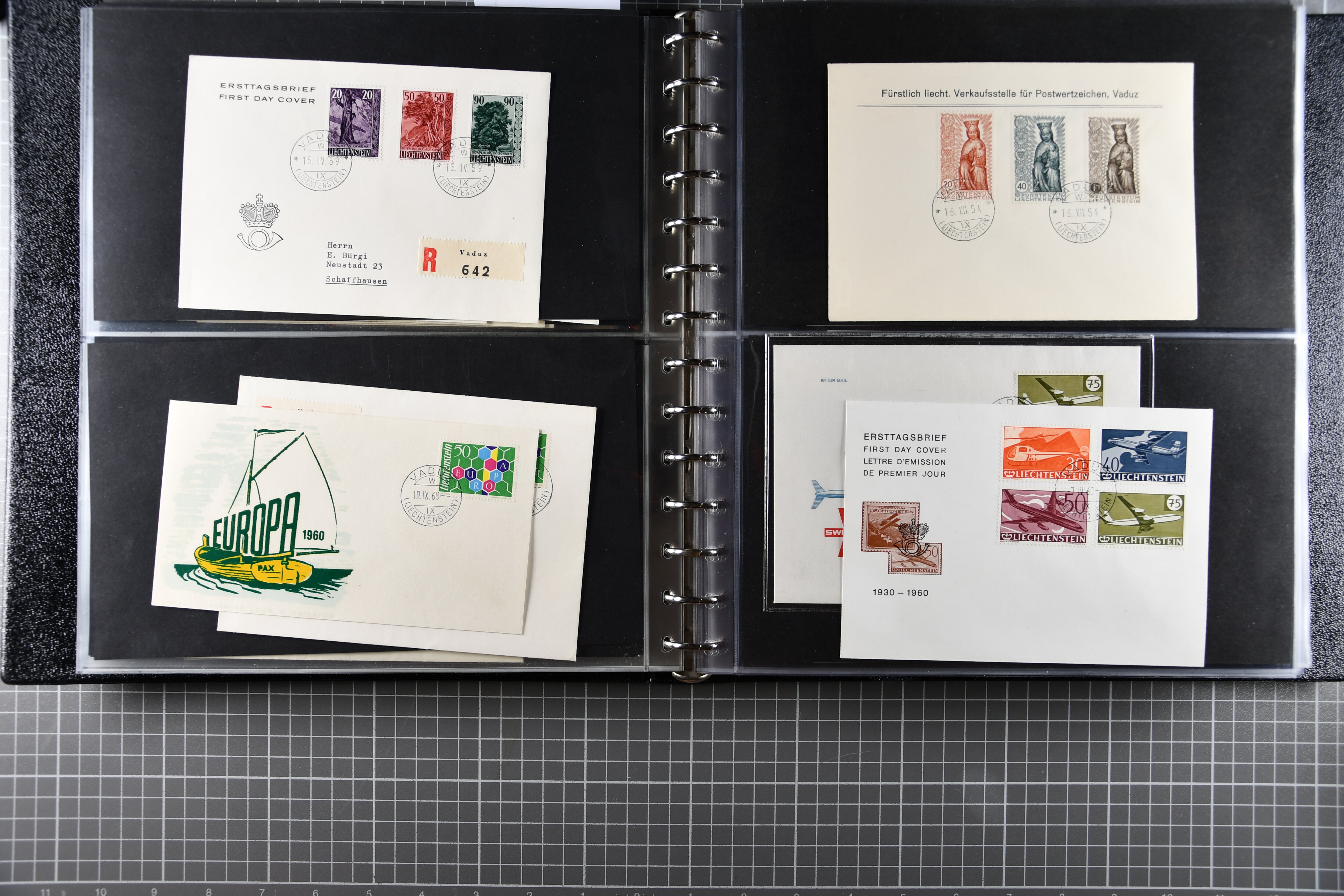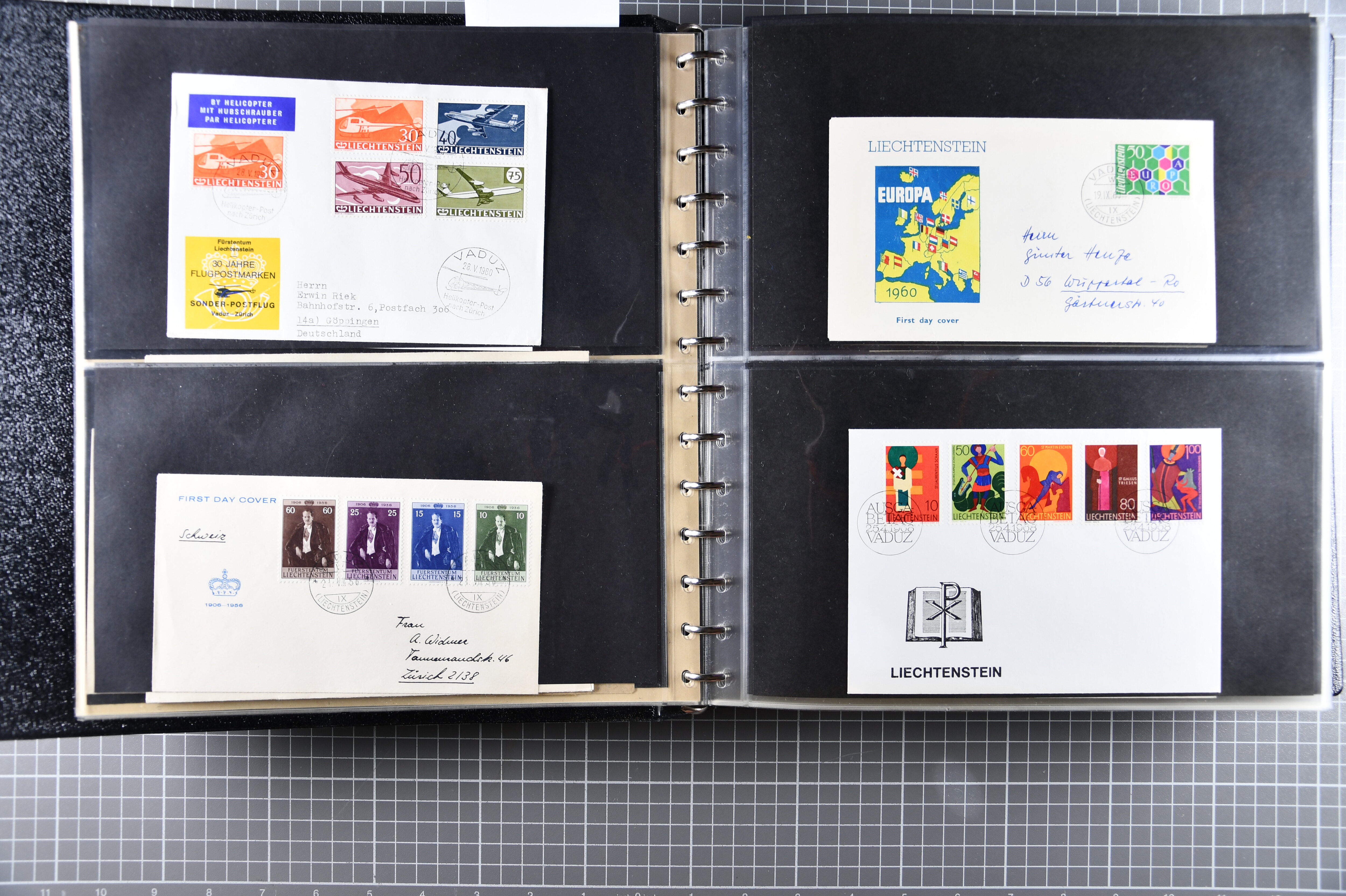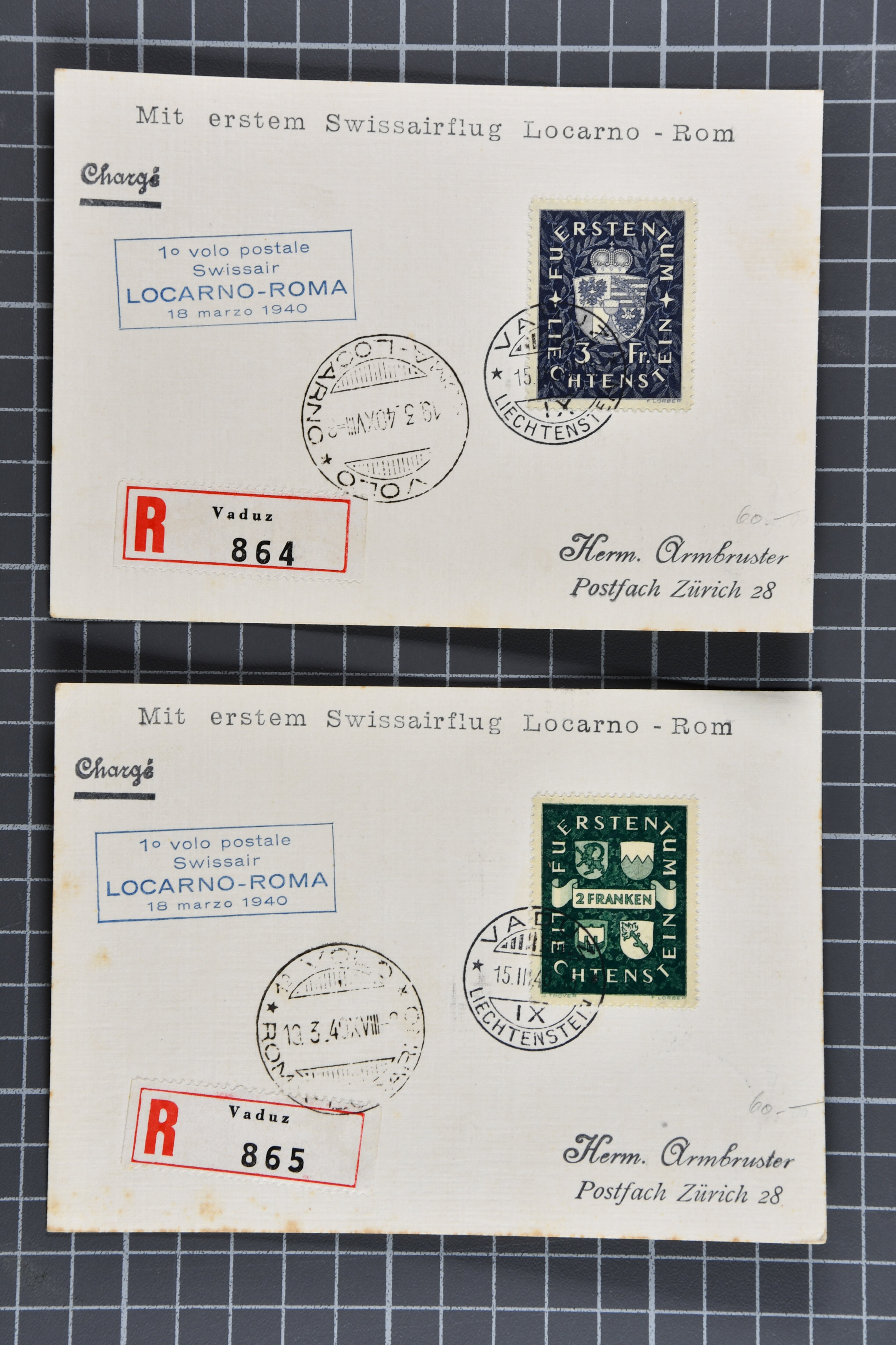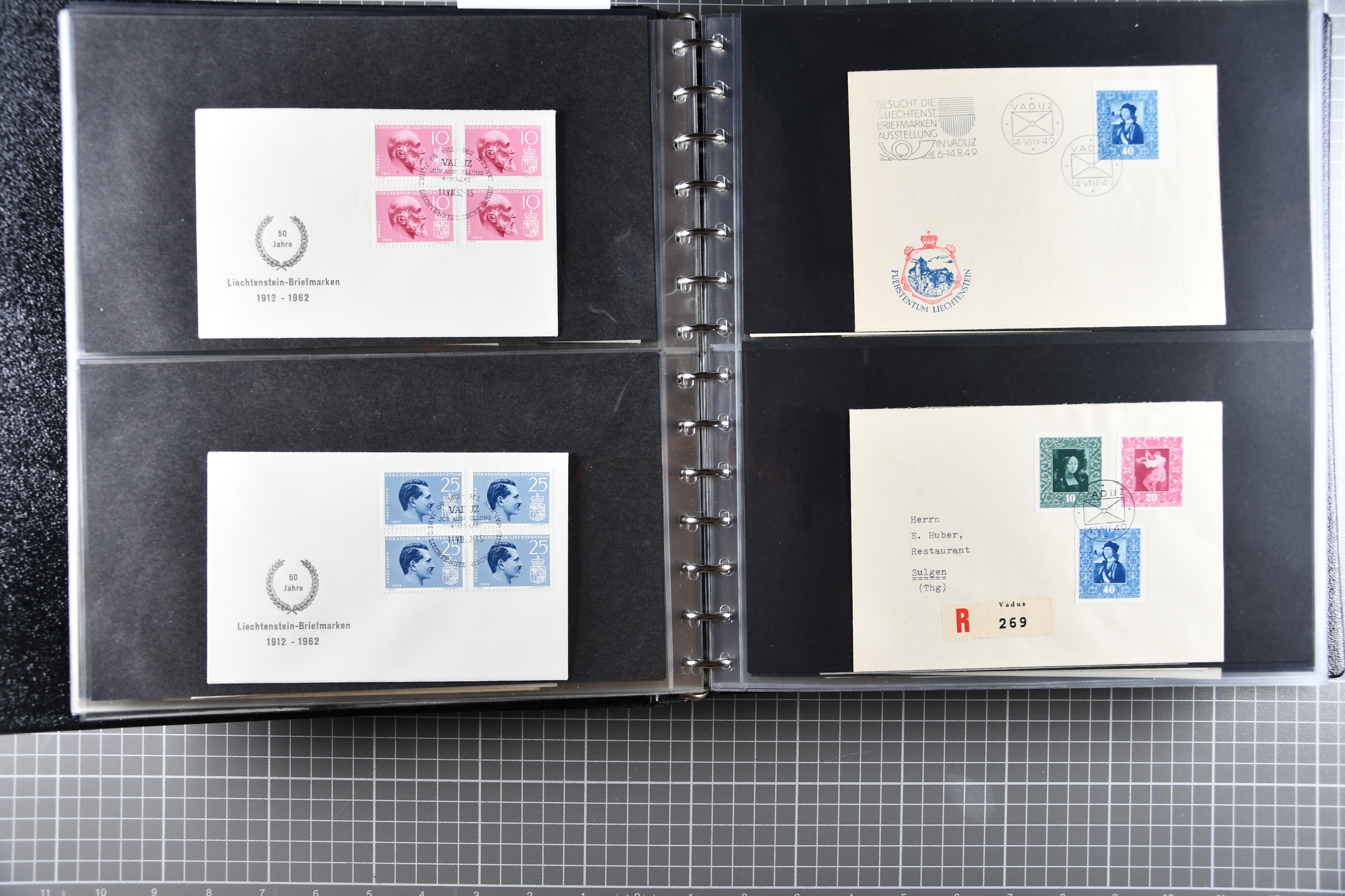 9443 cover image1928/2005: Lagerposten hunderter Satz- und Ersttagsbriefe in drei Plastikboxen. Dabei etwas über hundert bessere Belege bis 1960 mit u.a. 1928, "Rheinnot", kpl. Satz (LBK W7-10) sauber gest. "ESCHEN 24.II.28" auf Einschreibebrief nach Frauenfeld, Satzbriefe der Ausgaben 1943 "Binnenkanal" und "Fürstenbilder II", FDC 1950 "Jagd A-III" (LBK 232-4), 1953 "Int. Pfadfinderkonferenz" (LBK 259-62), 1954 "Fussball" (2, LBK 266-9) und jeweils mehrfach vorhanden 1960 "30 Jahre Flugpostmarken" (5), "Europa" (11), "Heimatliche Bäume und Sträucher IV" (6) und Fürstenpaar (10). Später viel Material ab 2000, jedoch wenige Belege aus den Jahren dazwischen. Dazu etwas Bedarfspost aus den 30er und 40er Jahren inkl. 1946 10 Fr. "St. Luzius" aus der rechten unteren Bogenecke auf sauberem R-Expressbrief von Schaan nach Flawil (SG). Gute Erhaltung. (Image 1) (Image 2) (Image 3) (Image 4) (Image 5) (Image 6)