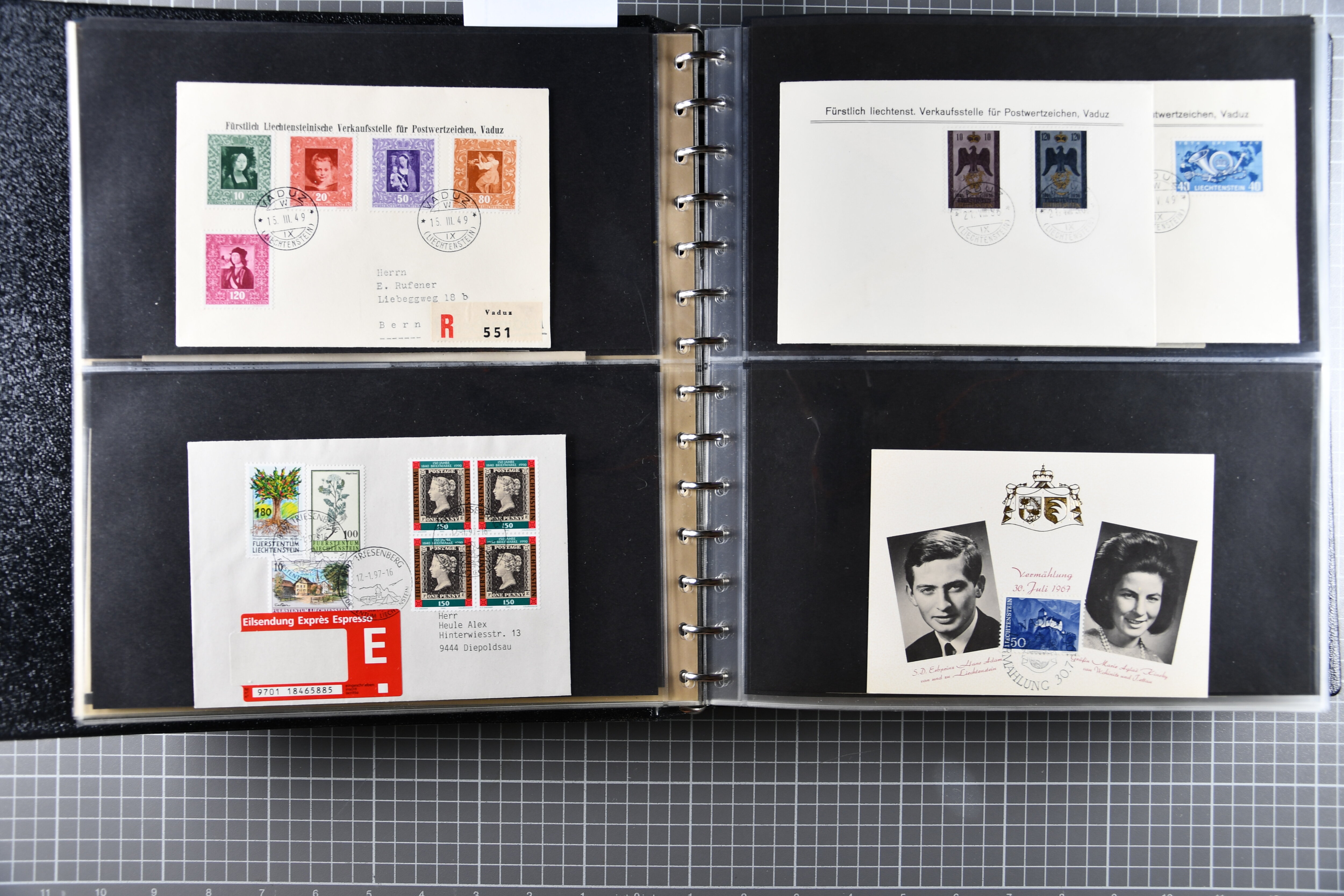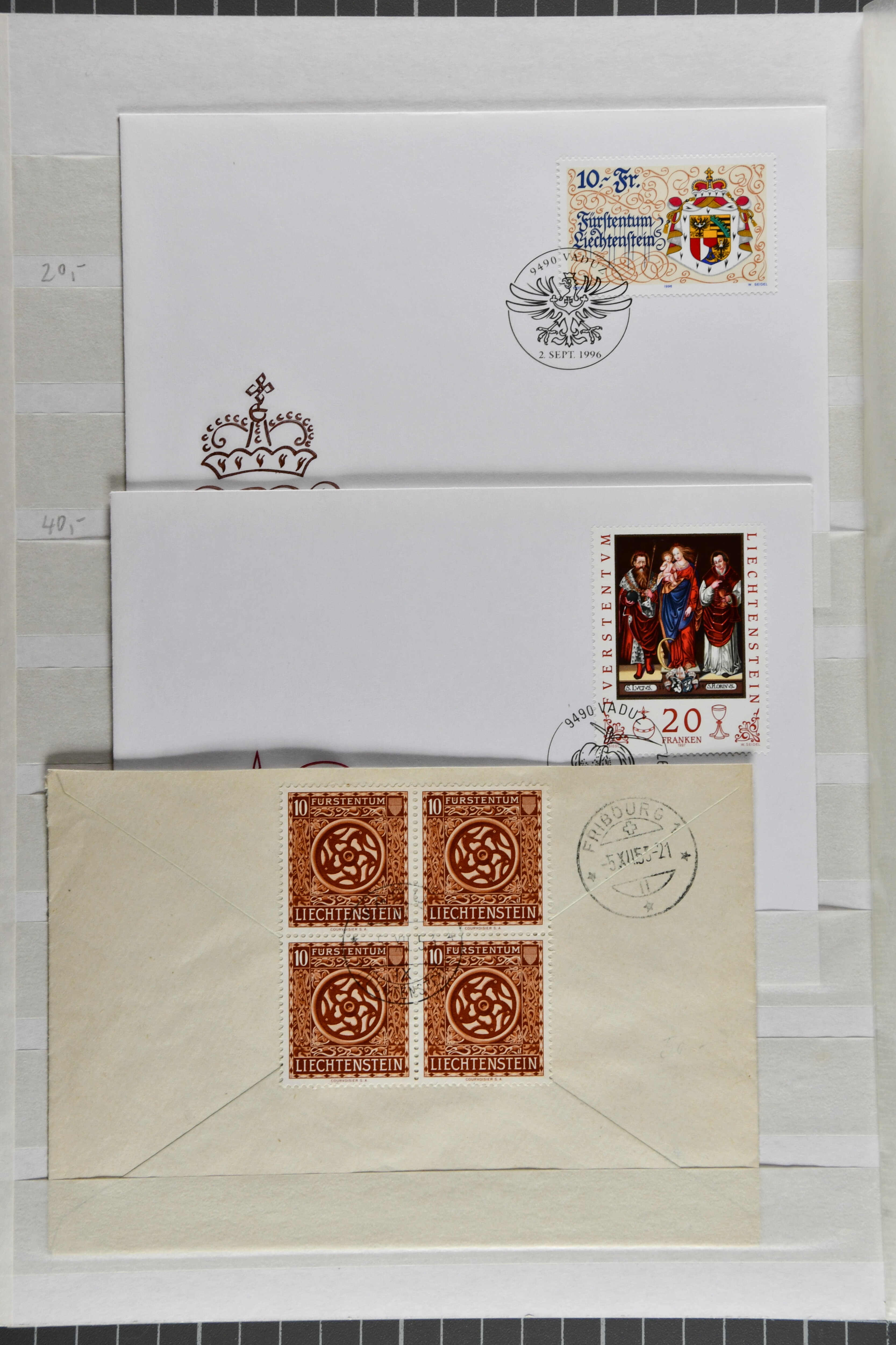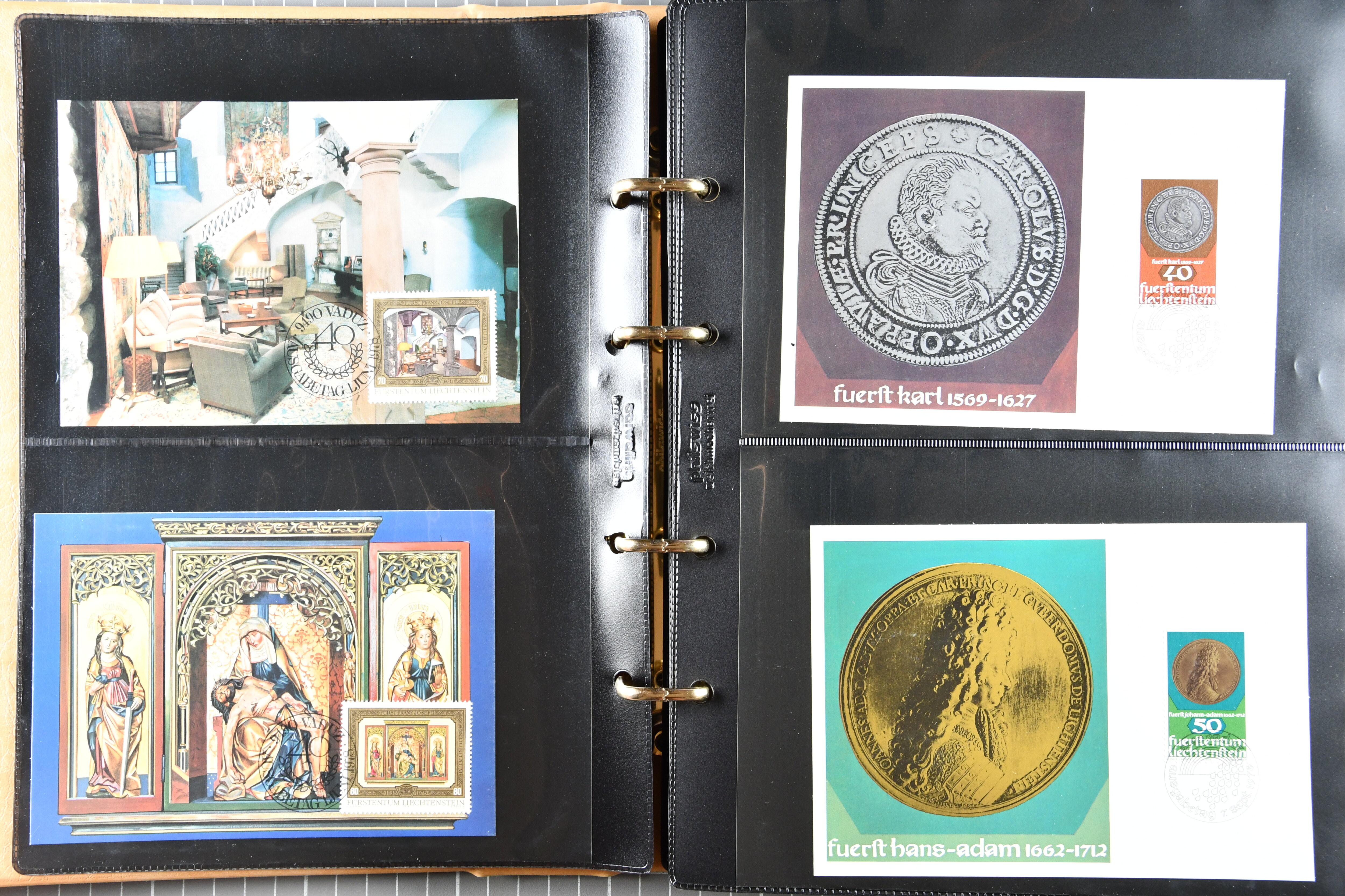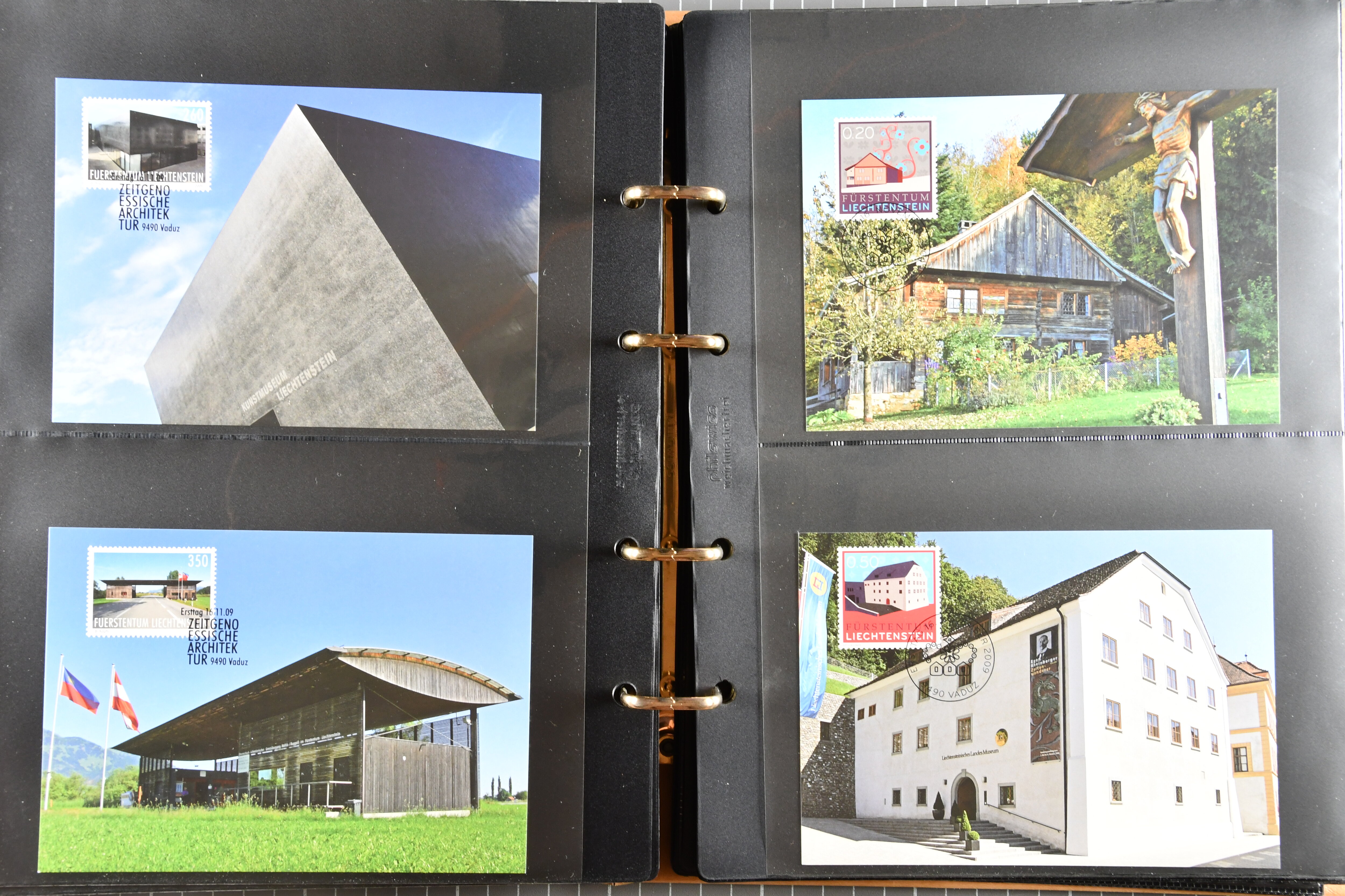 9445 cover 1978/2016: Bestand hunderter moderner Belege in sechs Kartonboxen. Dabei vier Boxen mit besseren modernen FDC aus den Jahren ab 1997 und zwei Kartons mit hunderten von Maximumkarten aus den Nummern 1 bis 424 in den ursprünglichen Umschlägen der fürstlichen Werteichenverkaufsstelle. Für diese Periode ein seltenes Angebot mit vielen Spezialitäten.
