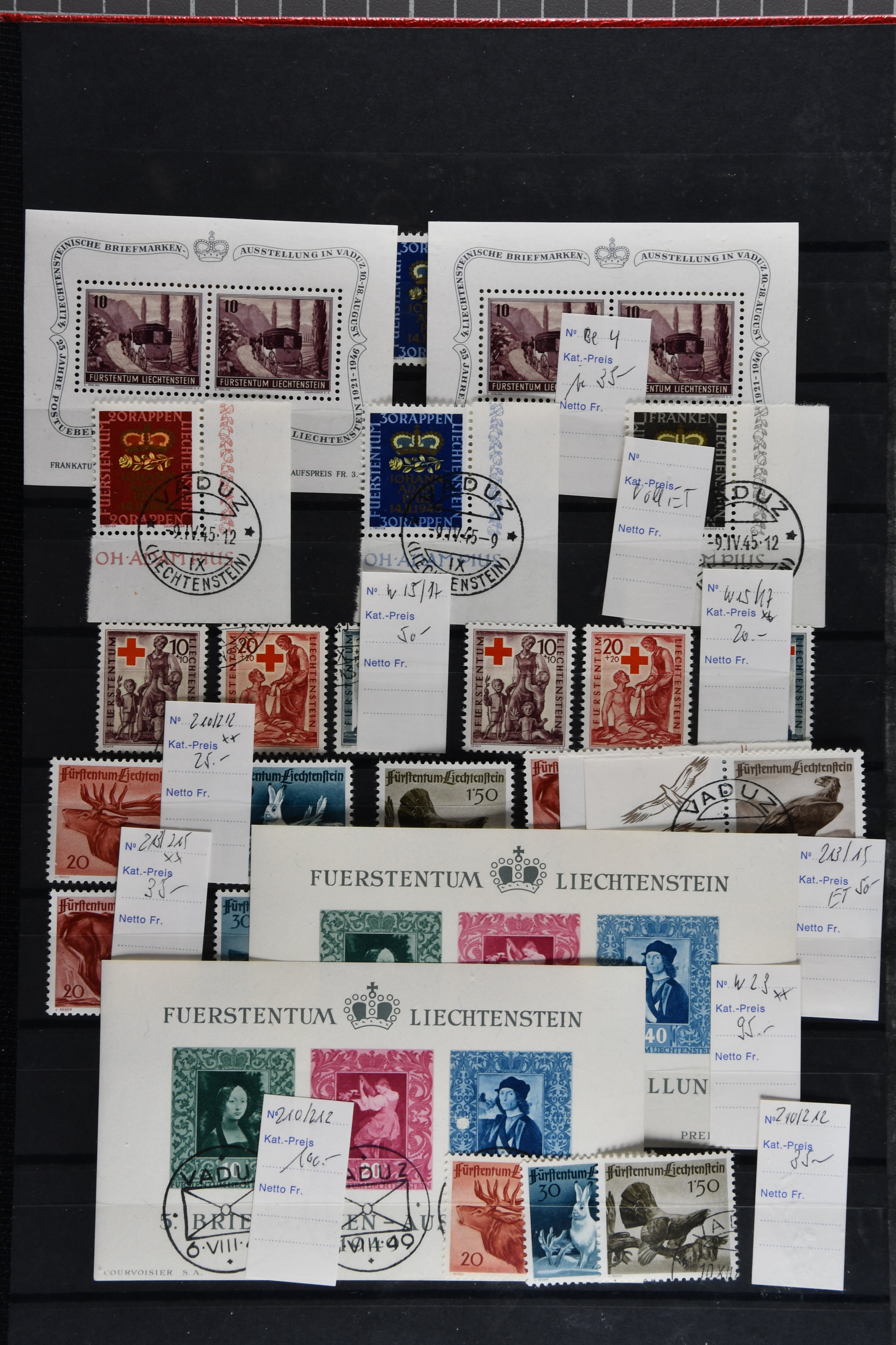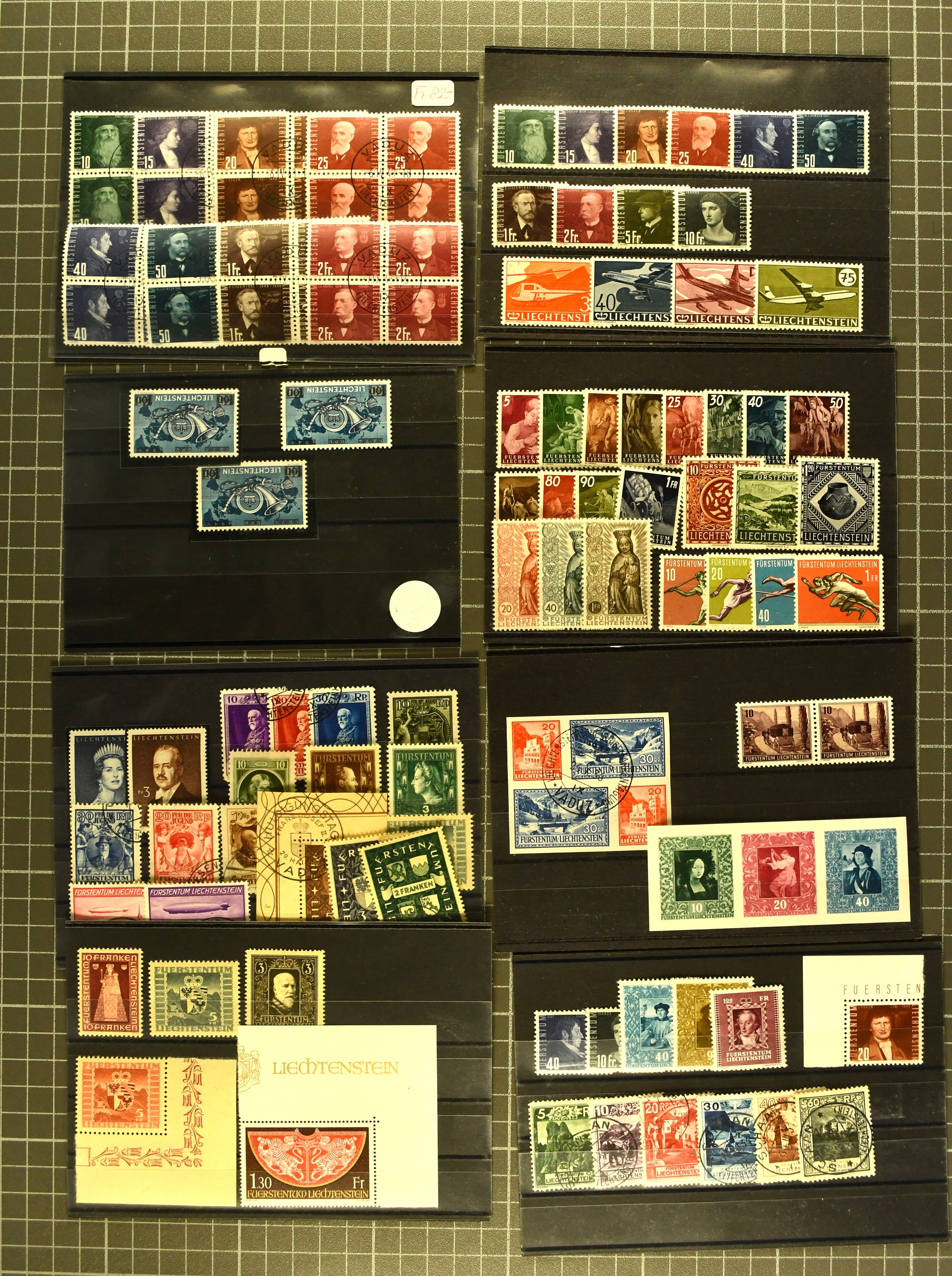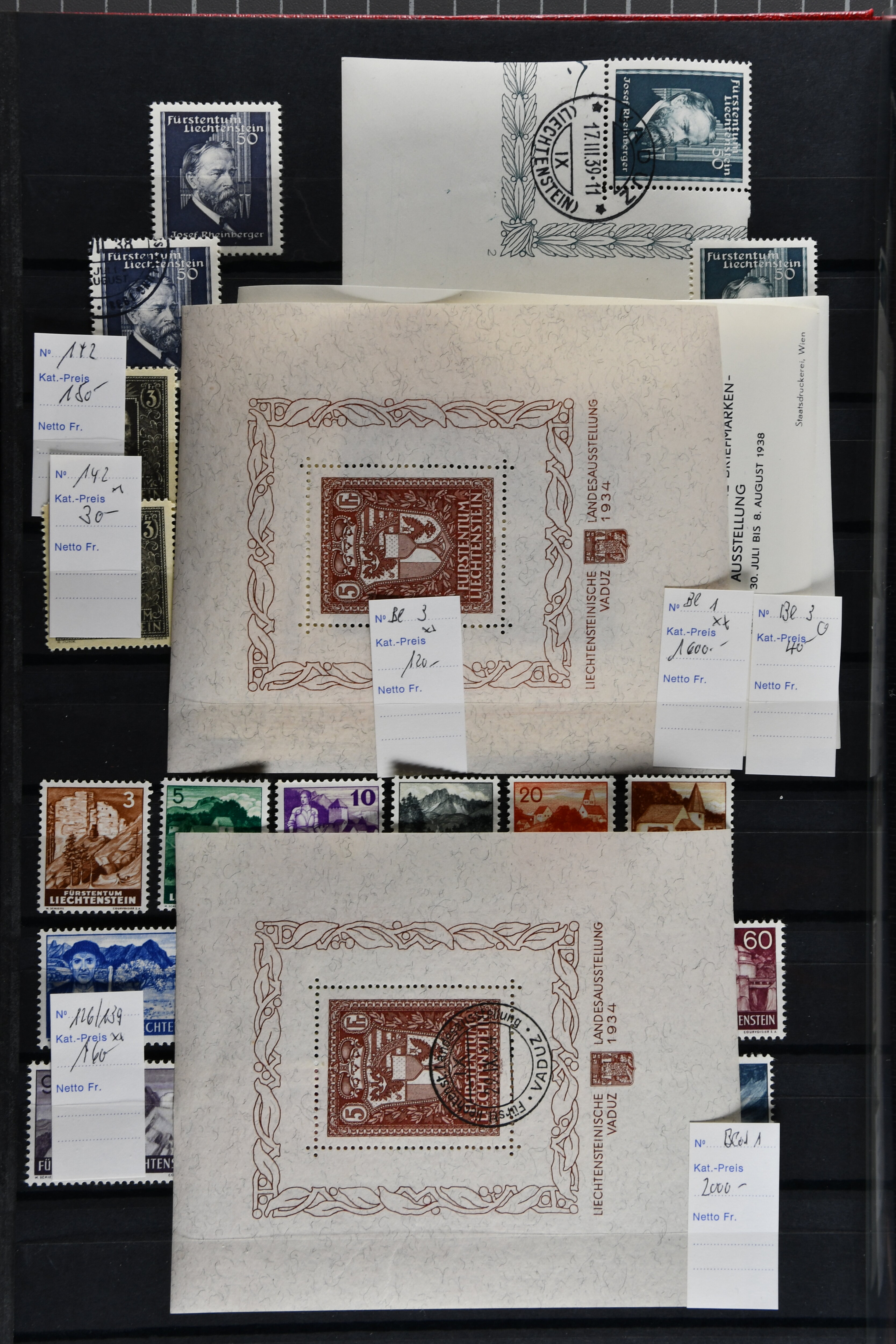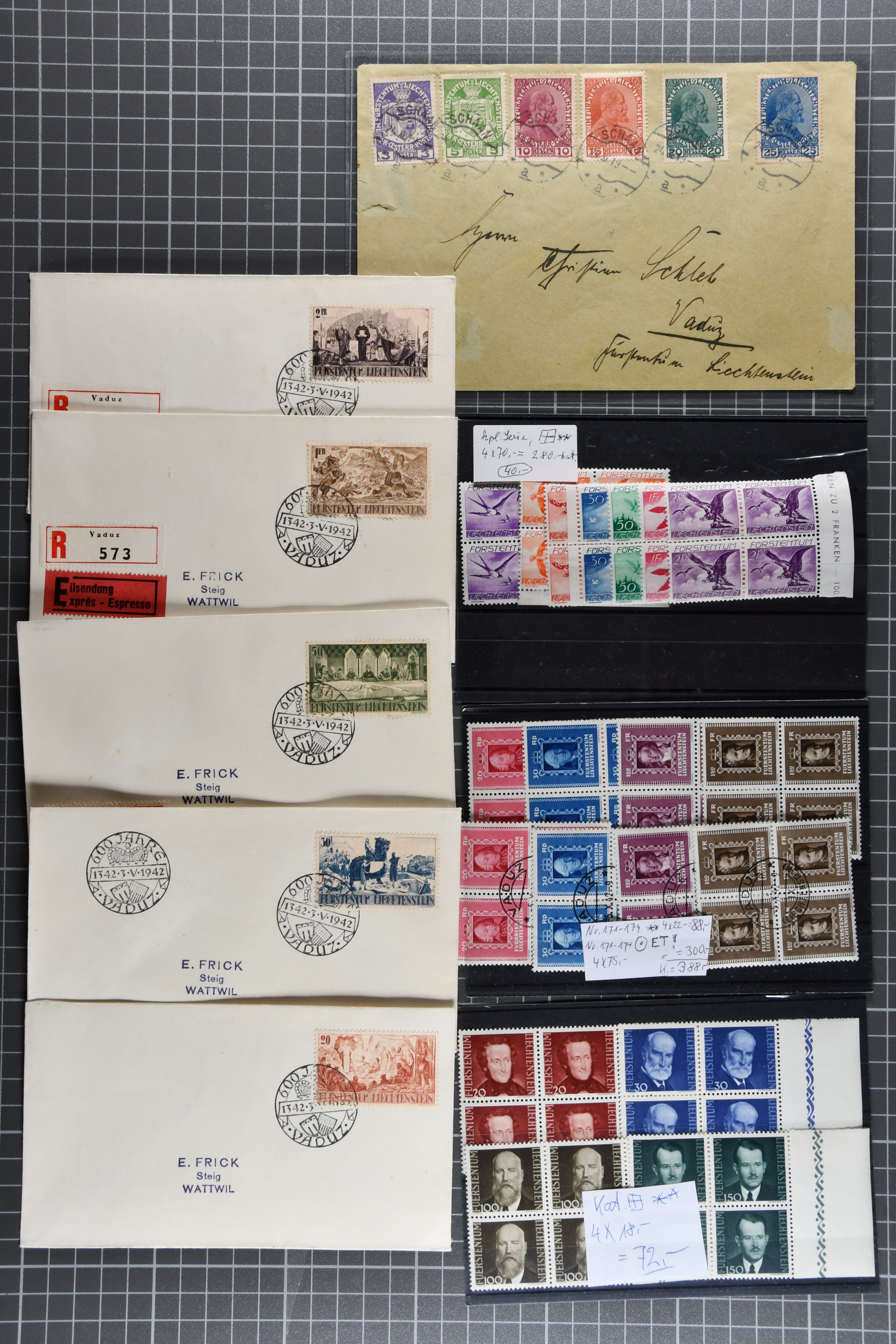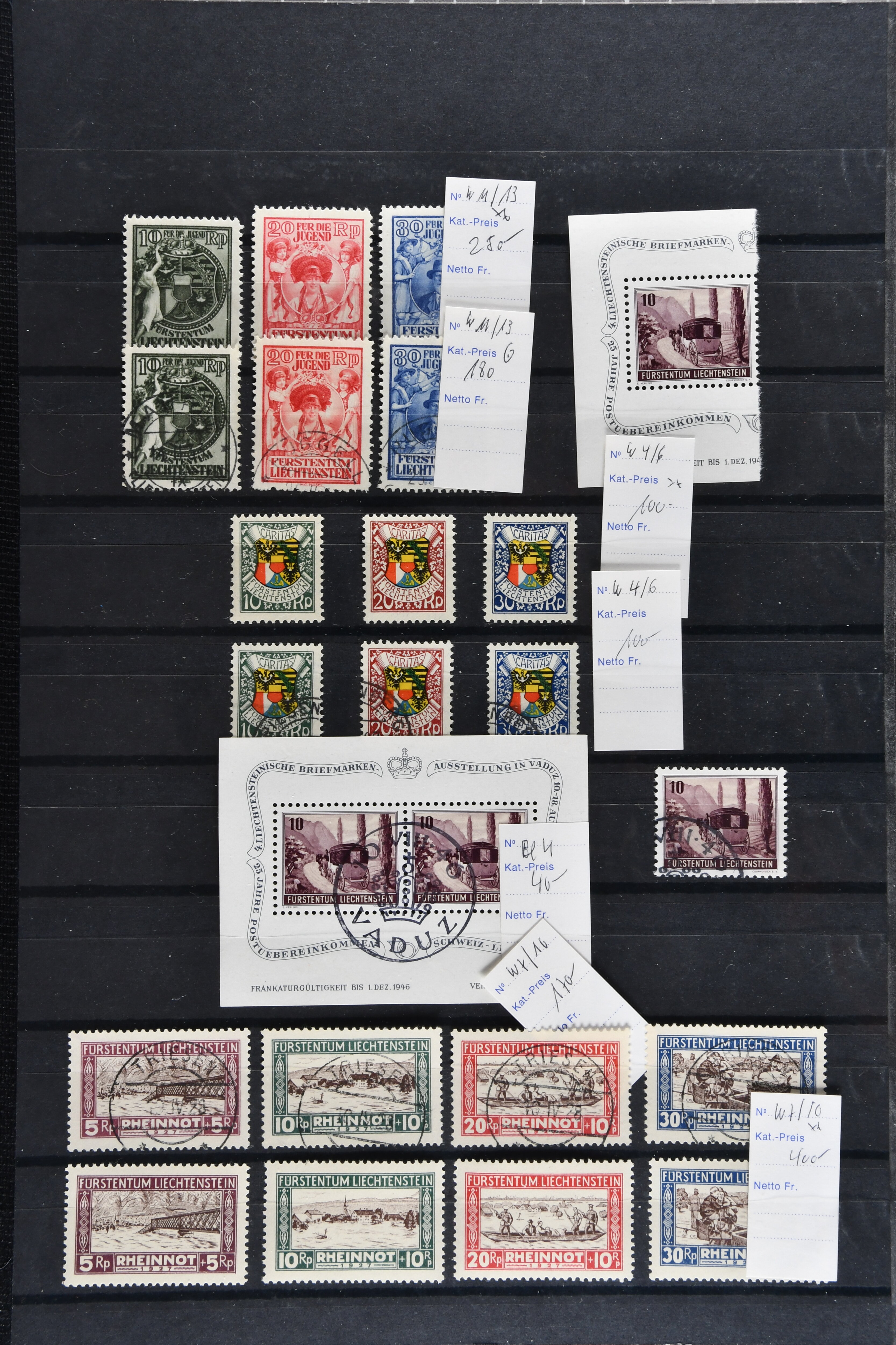 9434 image1908/65 (ca.): Kleines aber reichhaltiges Händlerlager postfr./ungebr., gest. und im Viererblock auf Steckkarten mit zahlreichen mittleren und besseren Marken und Sätzen. Dabei 1912 "Fürst Johann II", 5-25 H. auf Kreidepapier (LBK 1x-3x), zwei kompl. postfr. Sätze, 1928 "Rheinnot" ungezähnt in leicht abweichenden Farben (Mi.-Nr. 78-81U), postfr., 1921 Freimarken 20 Rp. "St. Mammertus-Kappelle" (LBK 53A) und 1 Fr. "Rheintal bei Vaduz" (LBK 53B), beide postfr., 1935 Flugpost "Adler", 10-30 Rp. (LBK F9y-F12y) im Viererblock, sauber und zentr. gest. "TRIESENBERG 4.VI.35", 1941 "Madonna von Dux" (LBK 150) postfr. (3) und im gest. Kleinbogen oder 1948/50 "Flugpioniere" postfr. und im gest. Viererblock. Gute Erhaltung. LBK=CHF 9'500+. (Image 1) (Image 2) (Image 3)