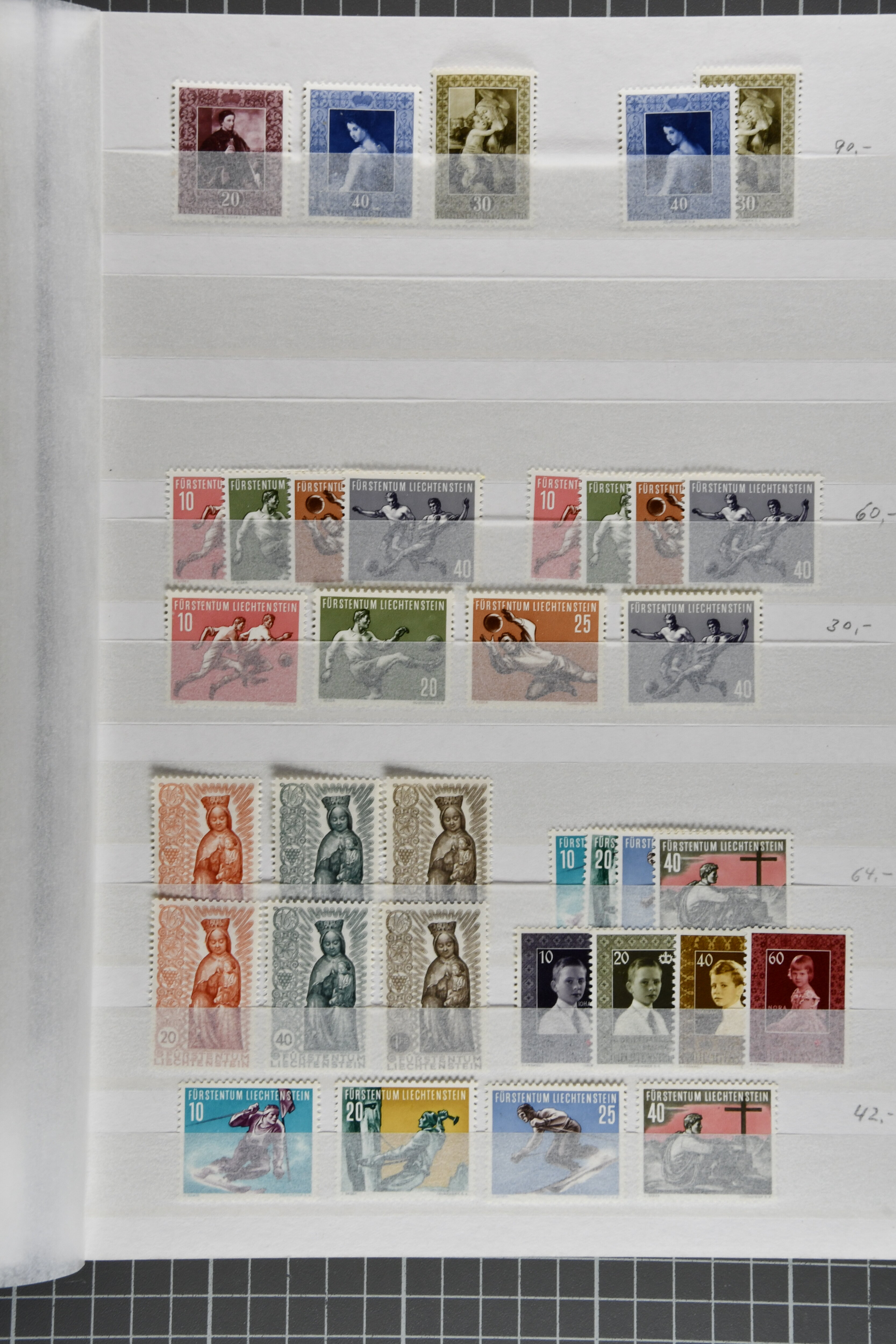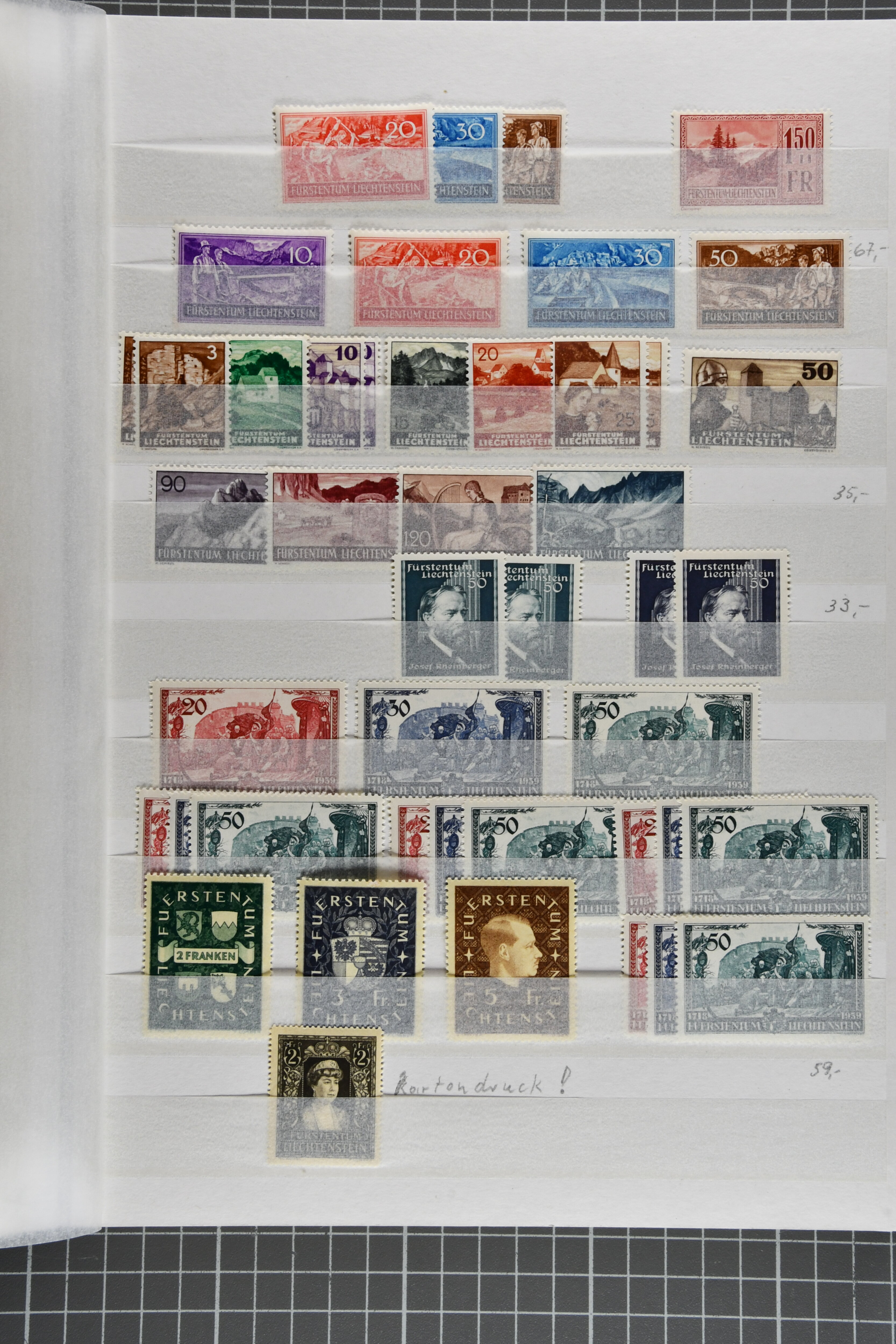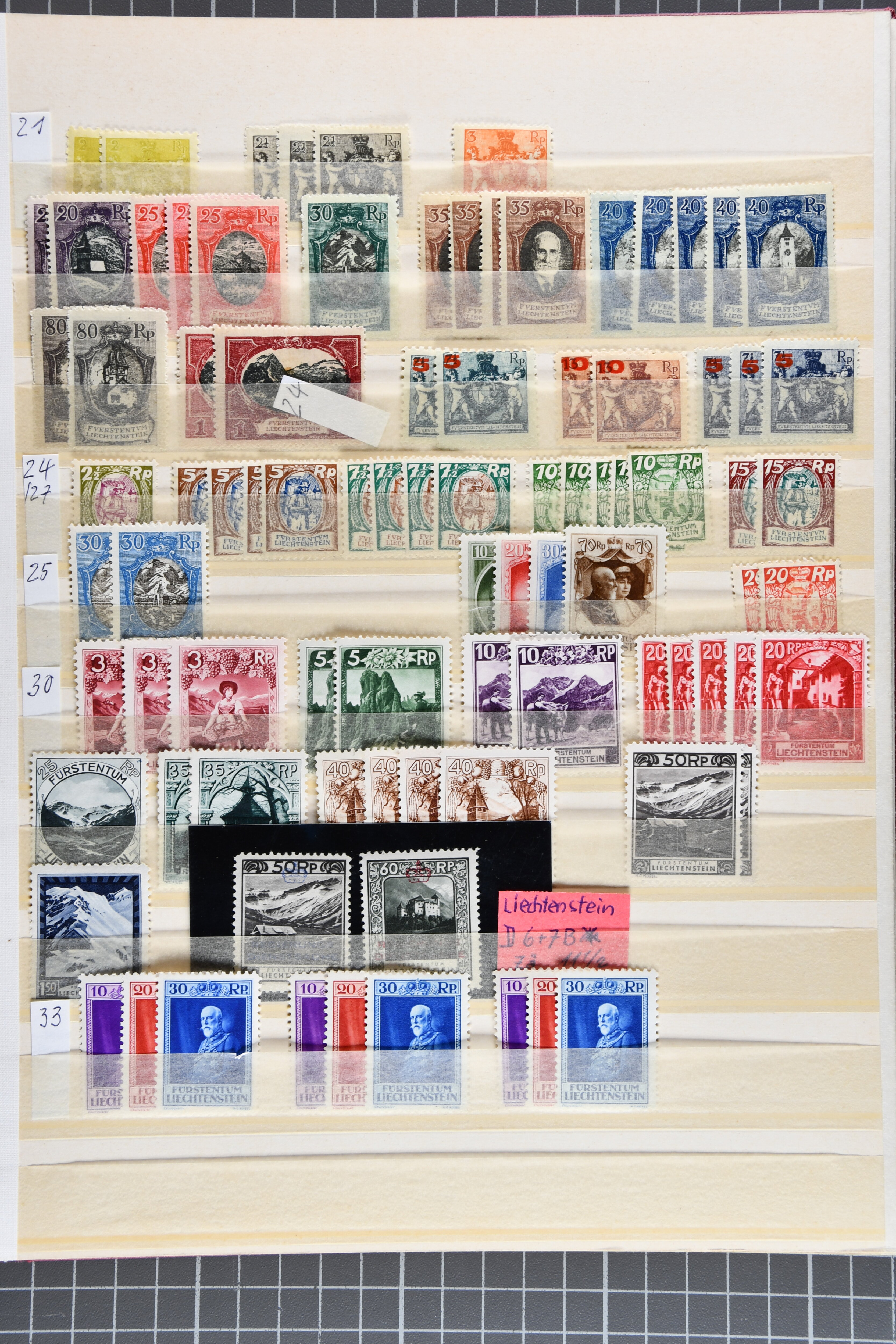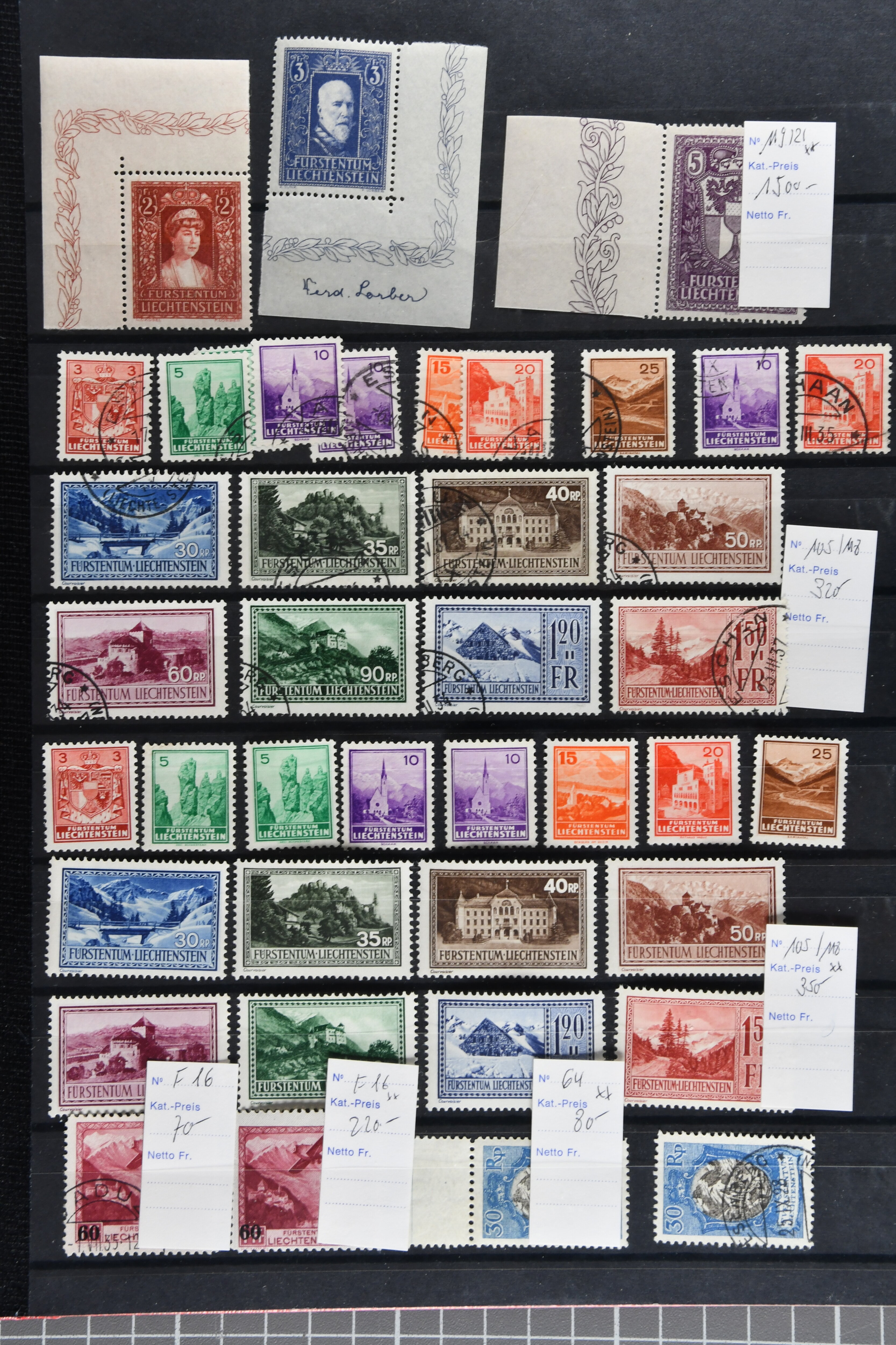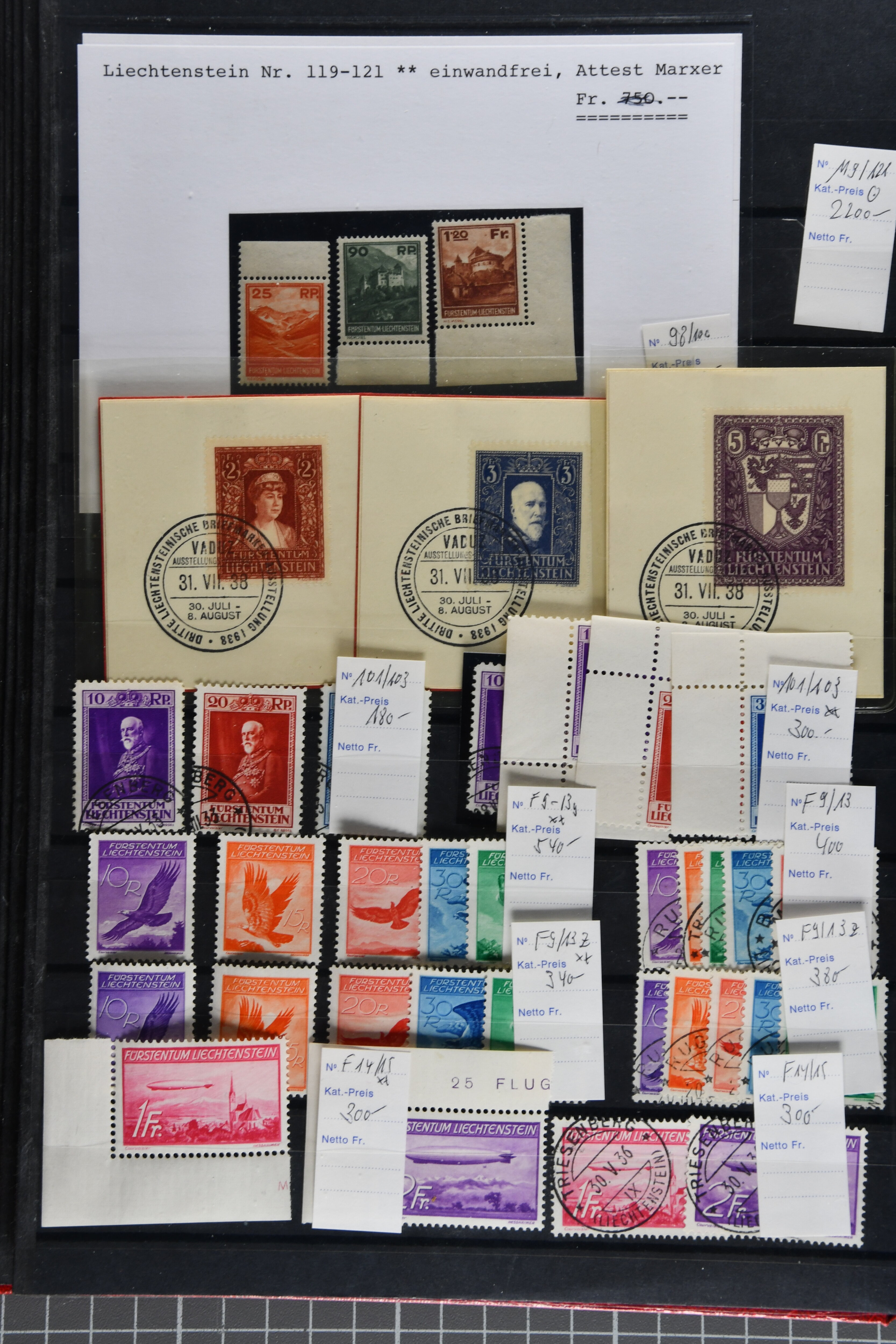 9434 image1908/65 (ca.): Kleines aber reichhaltiges Händlerlager postfr./ungebr., gest. und im Viererblock auf Steckkarten mit zahlreichen mittleren und besseren Marken und Sätzen. Dabei 1912 "Fürst Johann II", 5-25 H. auf Kreidepapier (LBK 1x-3x), zwei kompl. postfr. Sätze, 1928 "Rheinnot" ungezähnt in leicht abweichenden Farben (Mi.-Nr. 78-81U), postfr., 1921 Freimarken 20 Rp. "St. Mammertus-Kappelle" (LBK 53A) und 1 Fr. "Rheintal bei Vaduz" (LBK 53B), beide postfr., 1935 Flugpost "Adler", 10-30 Rp. (LBK F9y-F12y) im Viererblock, sauber und zentr. gest. "TRIESENBERG 4.VI.35", 1941 "Madonna von Dux" (LBK 150) postfr. (3) und im gest. Kleinbogen oder 1948/50 "Flugpioniere" postfr. und im gest. Viererblock. Gute Erhaltung. LBK=CHF 9'500+. (Image 1) (Image 2) (Image 3)