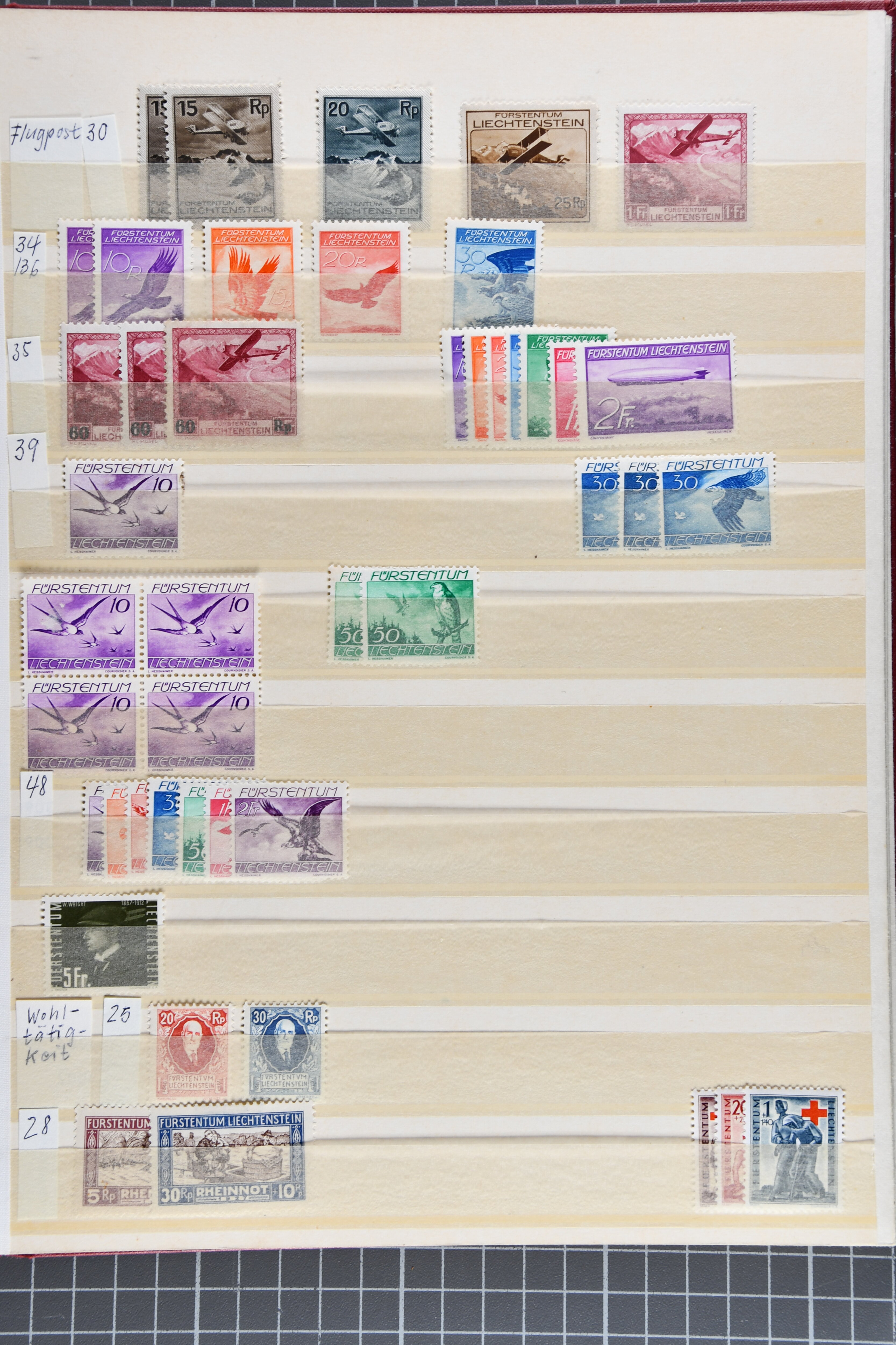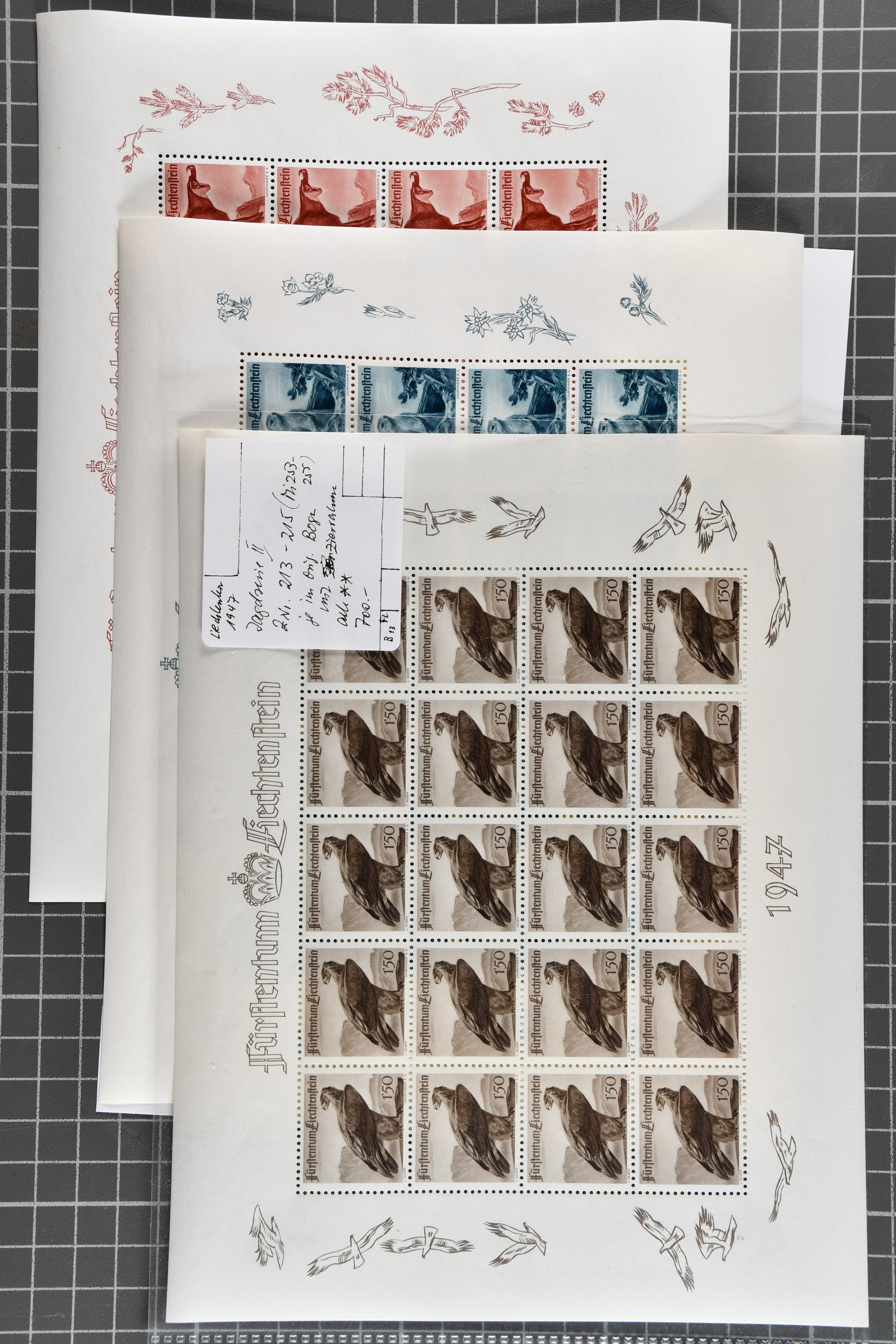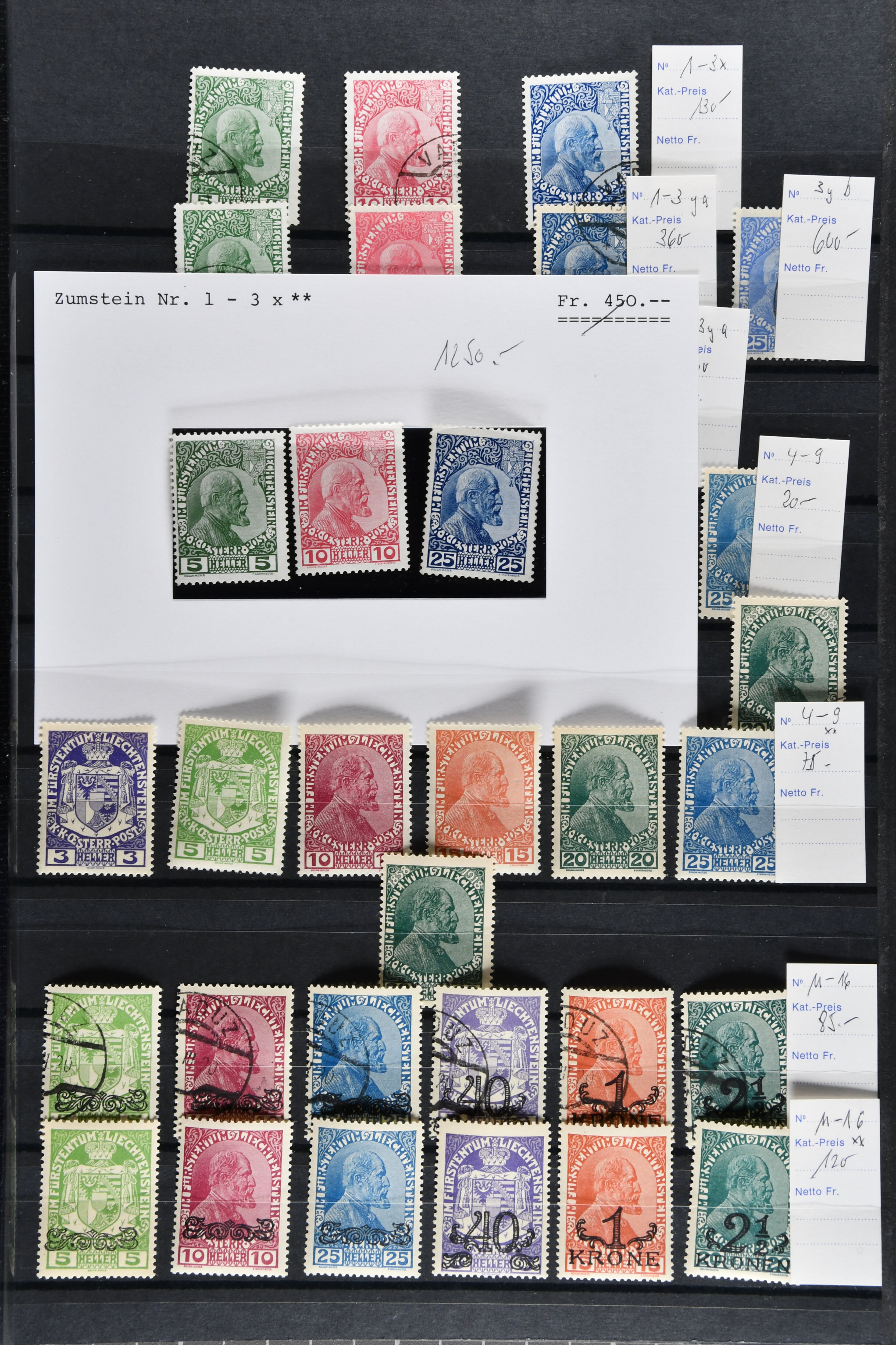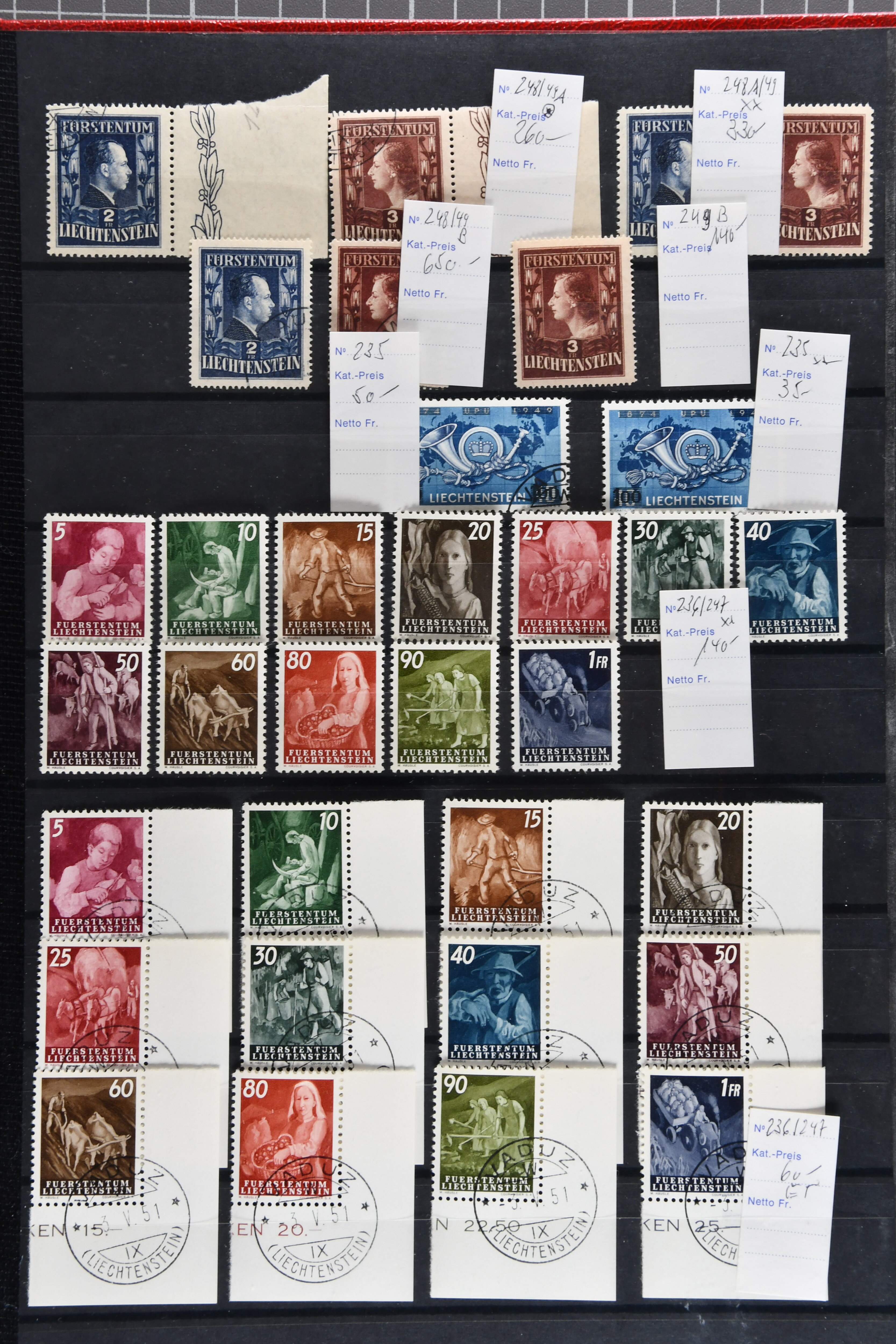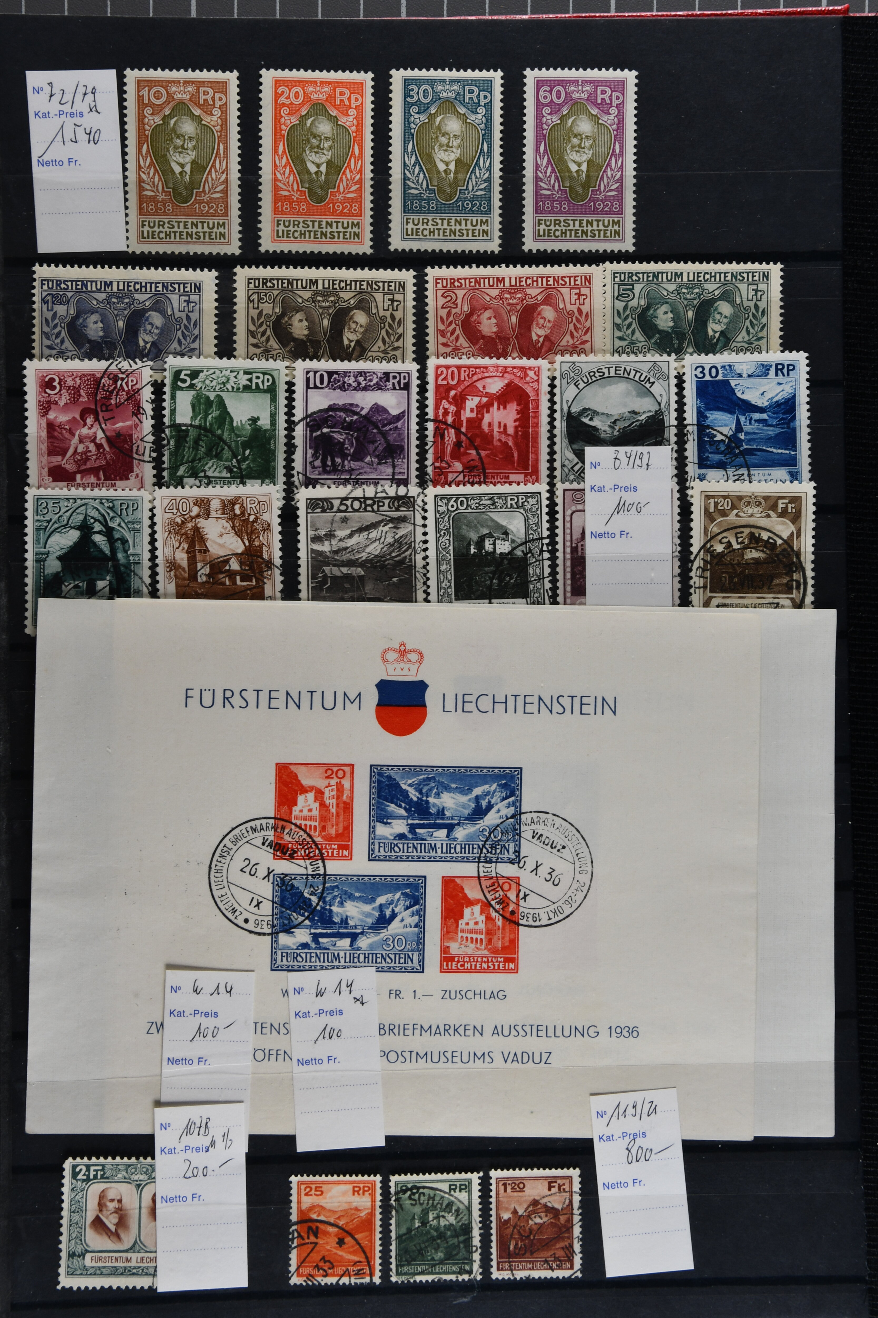 9434 image1908/65 (ca.): Kleines aber reichhaltiges Händlerlager postfr./ungebr., gest. und im Viererblock auf Steckkarten mit zahlreichen mittleren und besseren Marken und Sätzen. Dabei 1912 "Fürst Johann II", 5-25 H. auf Kreidepapier (LBK 1x-3x), zwei kompl. postfr. Sätze, 1928 "Rheinnot" ungezähnt in leicht abweichenden Farben (Mi.-Nr. 78-81U), postfr., 1921 Freimarken 20 Rp. "St. Mammertus-Kappelle" (LBK 53A) und 1 Fr. "Rheintal bei Vaduz" (LBK 53B), beide postfr., 1935 Flugpost "Adler", 10-30 Rp. (LBK F9y-F12y) im Viererblock, sauber und zentr. gest. "TRIESENBERG 4.VI.35", 1941 "Madonna von Dux" (LBK 150) postfr. (3) und im gest. Kleinbogen oder 1948/50 "Flugpioniere" postfr. und im gest. Viererblock. Gute Erhaltung. LBK=CHF 9'500+. (Image 1) (Image 2) (Image 3)