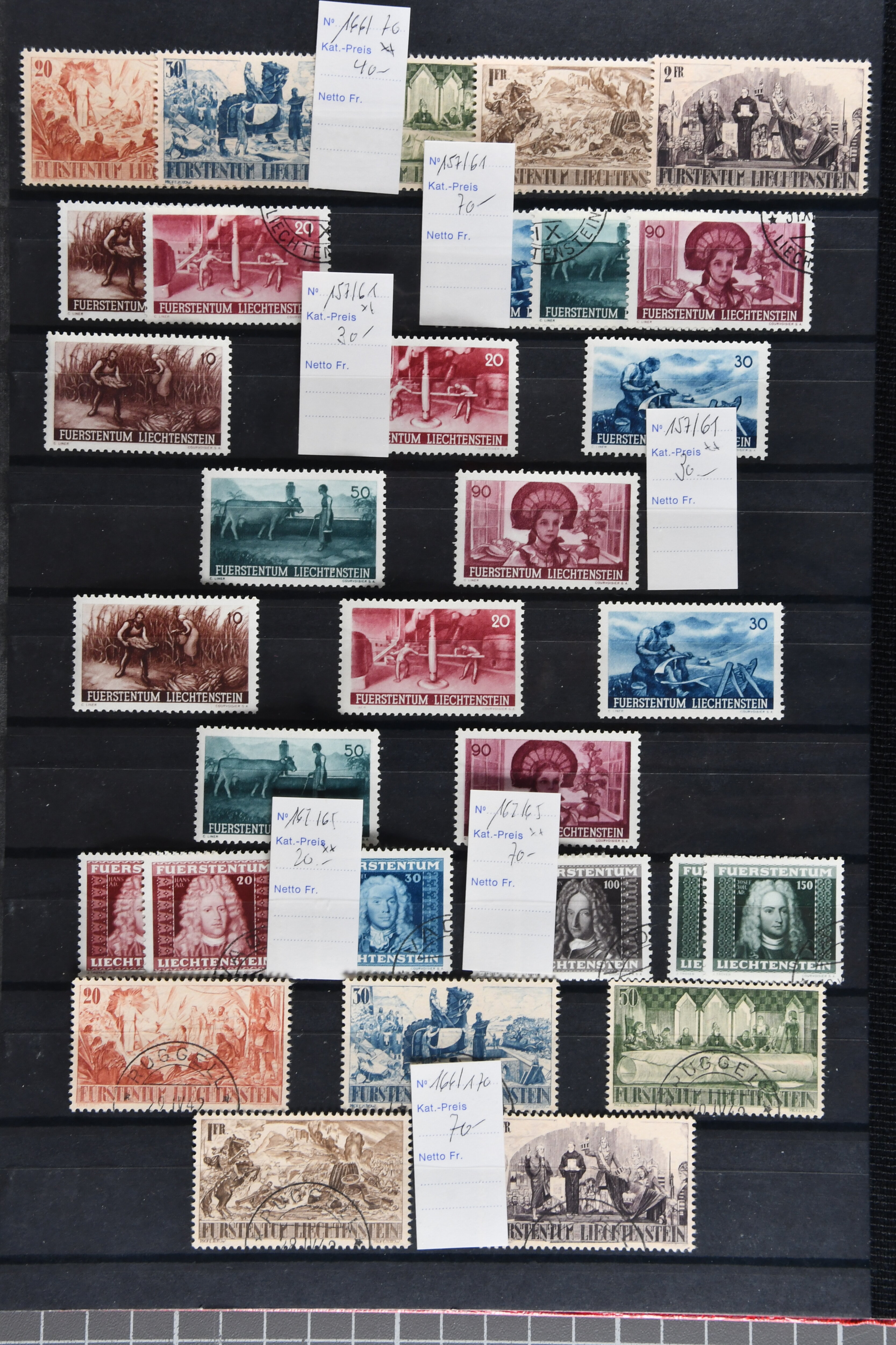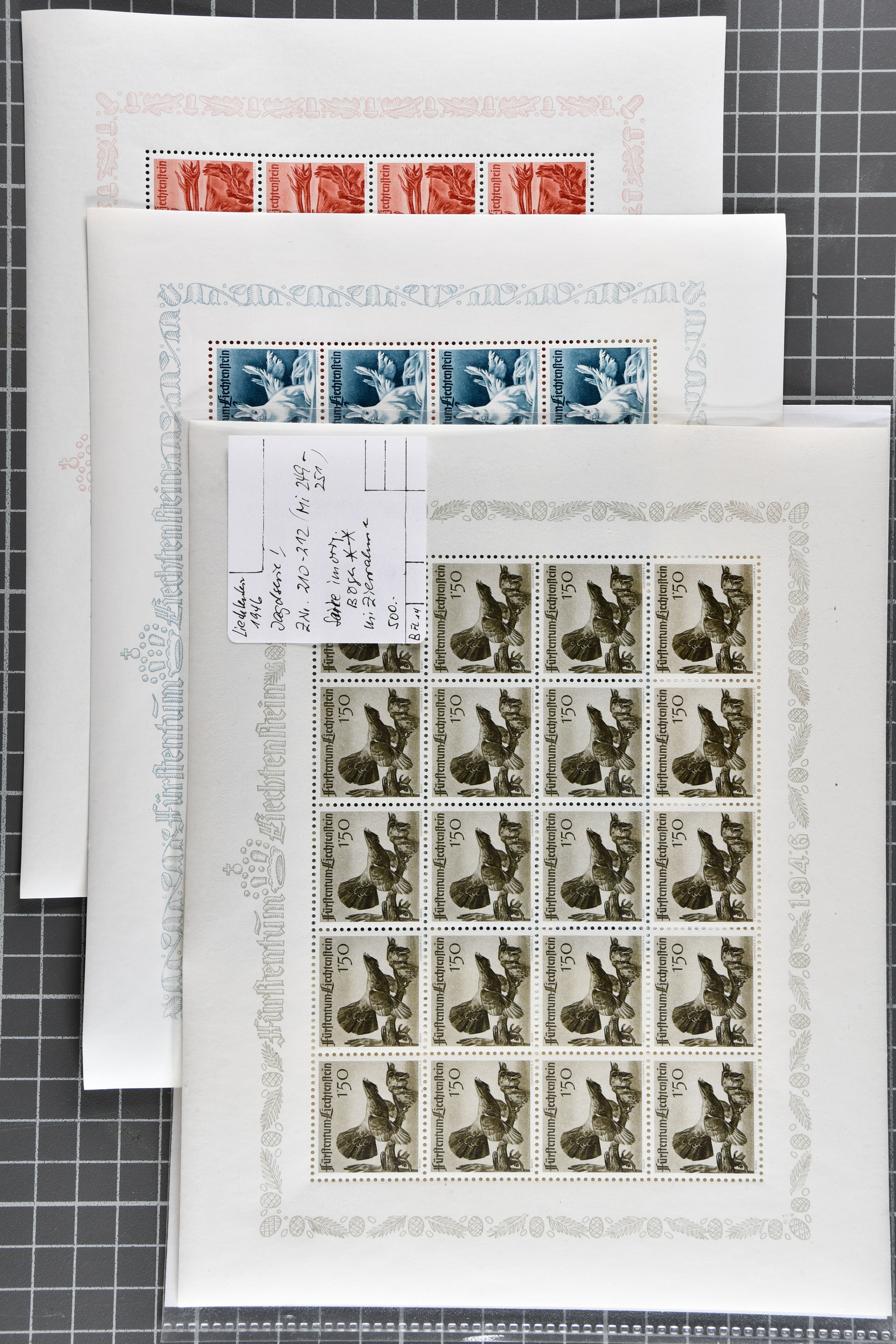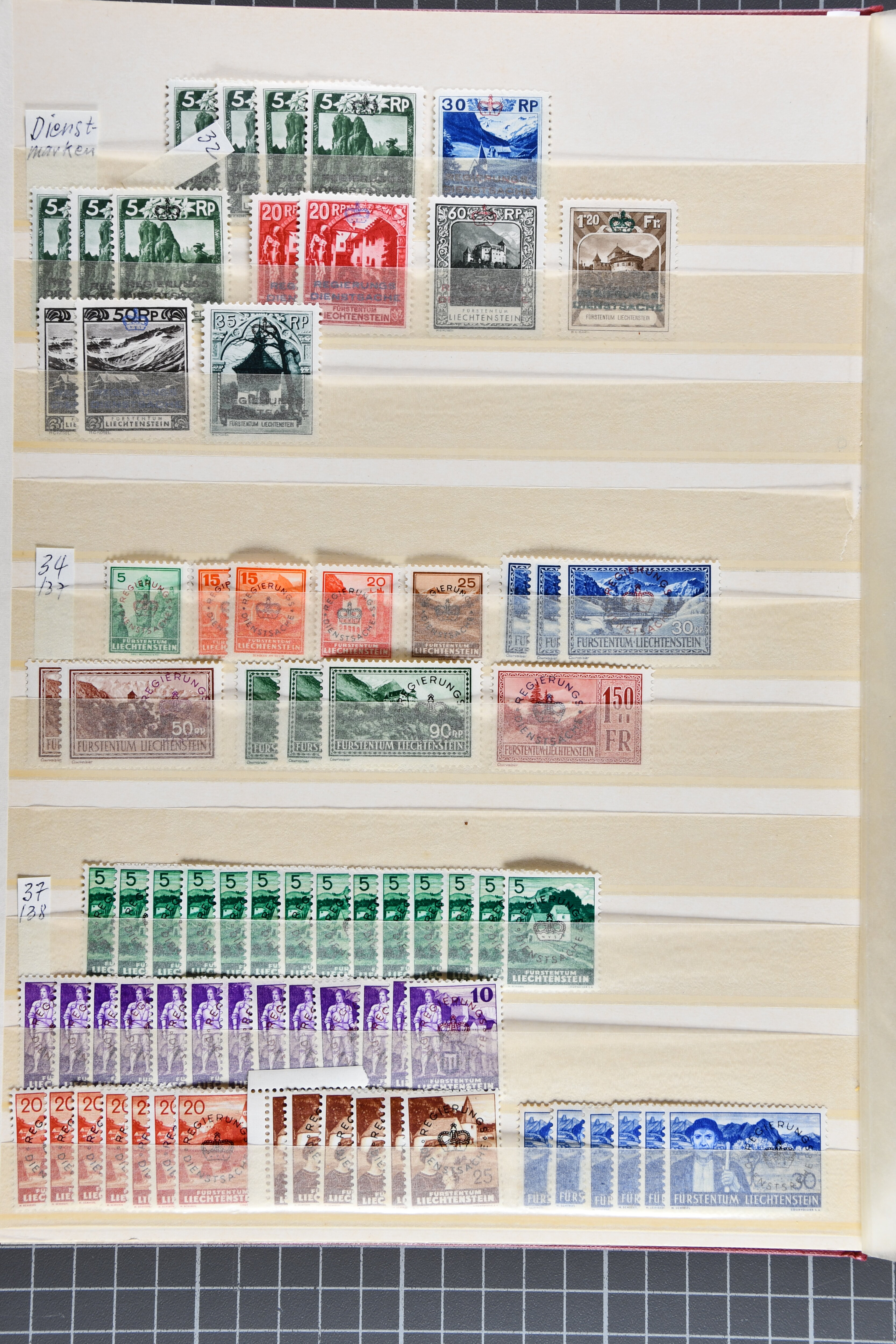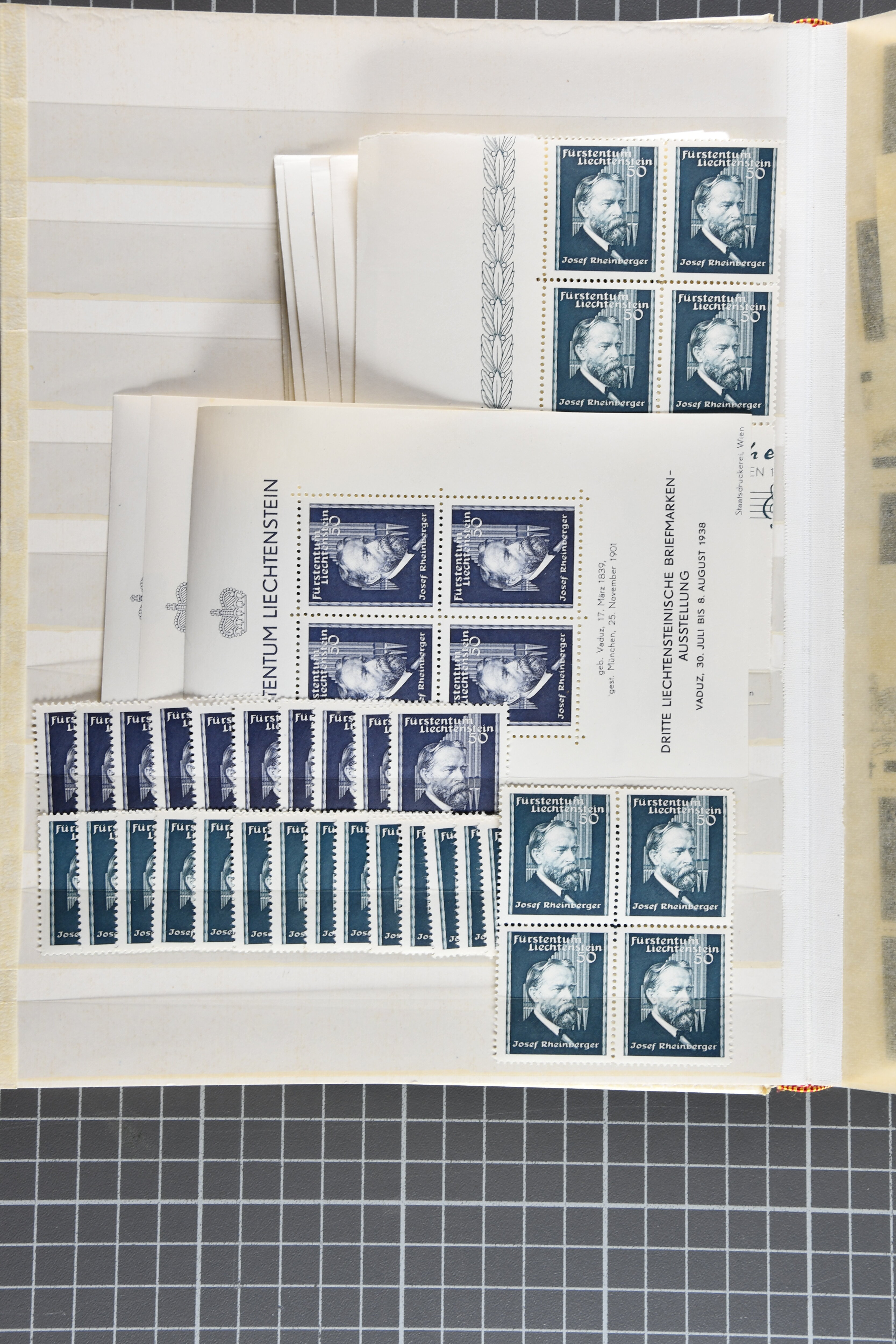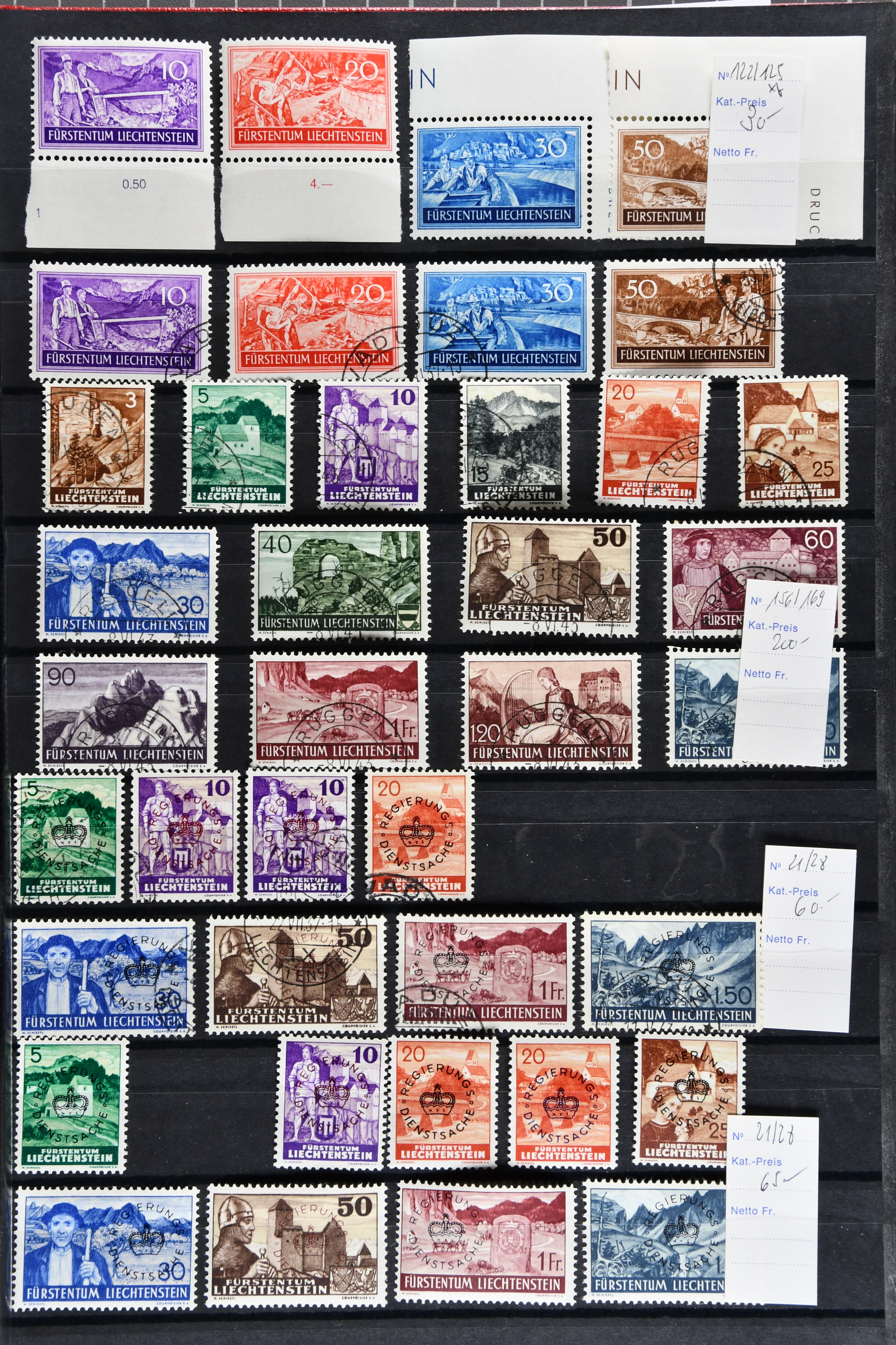 9434 image1908/65 (ca.): Kleines aber reichhaltiges Händlerlager postfr./ungebr., gest. und im Viererblock auf Steckkarten mit zahlreichen mittleren und besseren Marken und Sätzen. Dabei 1912 "Fürst Johann II", 5-25 H. auf Kreidepapier (LBK 1x-3x), zwei kompl. postfr. Sätze, 1928 "Rheinnot" ungezähnt in leicht abweichenden Farben (Mi.-Nr. 78-81U), postfr., 1921 Freimarken 20 Rp. "St. Mammertus-Kappelle" (LBK 53A) und 1 Fr. "Rheintal bei Vaduz" (LBK 53B), beide postfr., 1935 Flugpost "Adler", 10-30 Rp. (LBK F9y-F12y) im Viererblock, sauber und zentr. gest. "TRIESENBERG 4.VI.35", 1941 "Madonna von Dux" (LBK 150) postfr. (3) und im gest. Kleinbogen oder 1948/50 "Flugpioniere" postfr. und im gest. Viererblock. Gute Erhaltung. LBK=CHF 9'500+. (Image 1) (Image 2) (Image 3)
