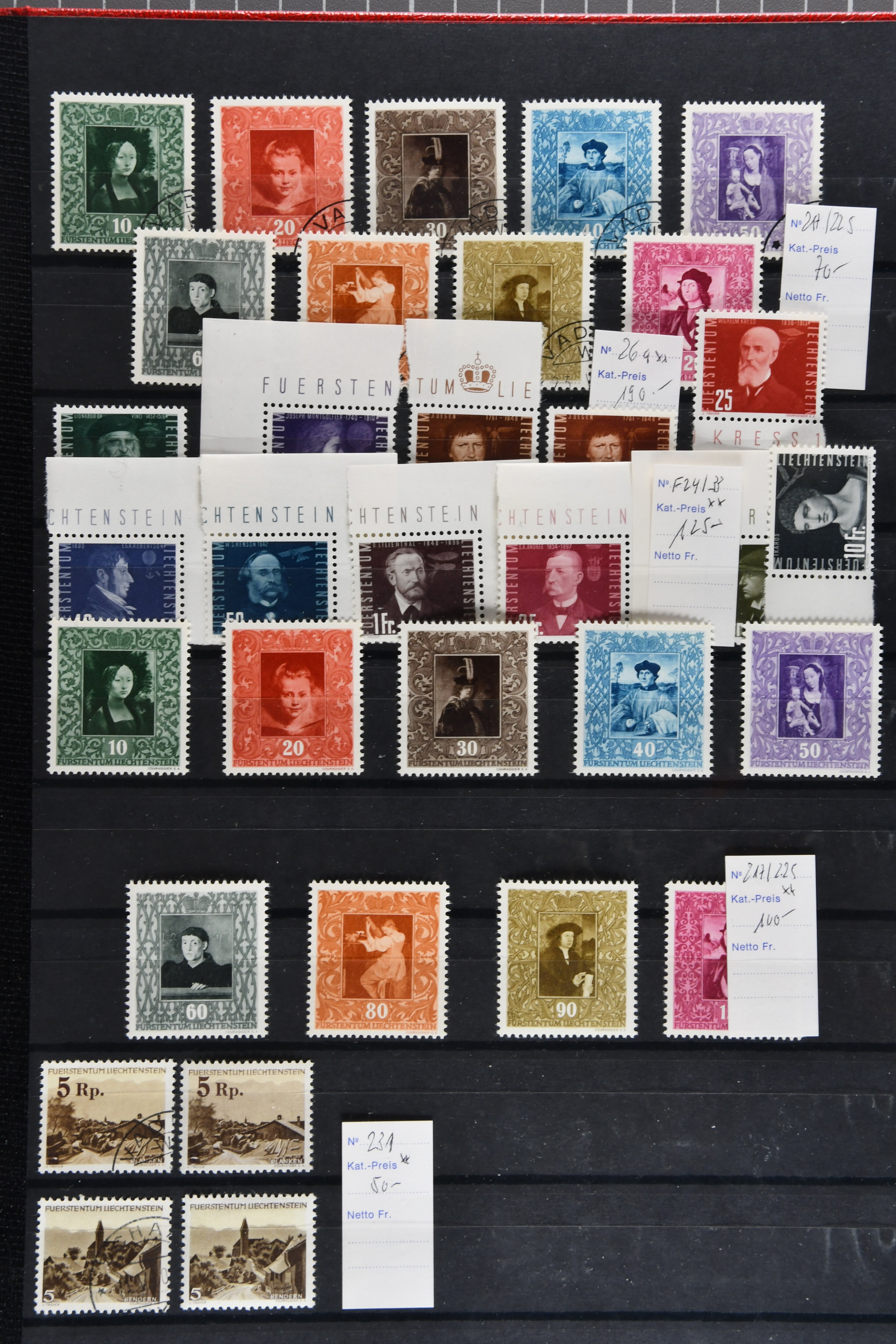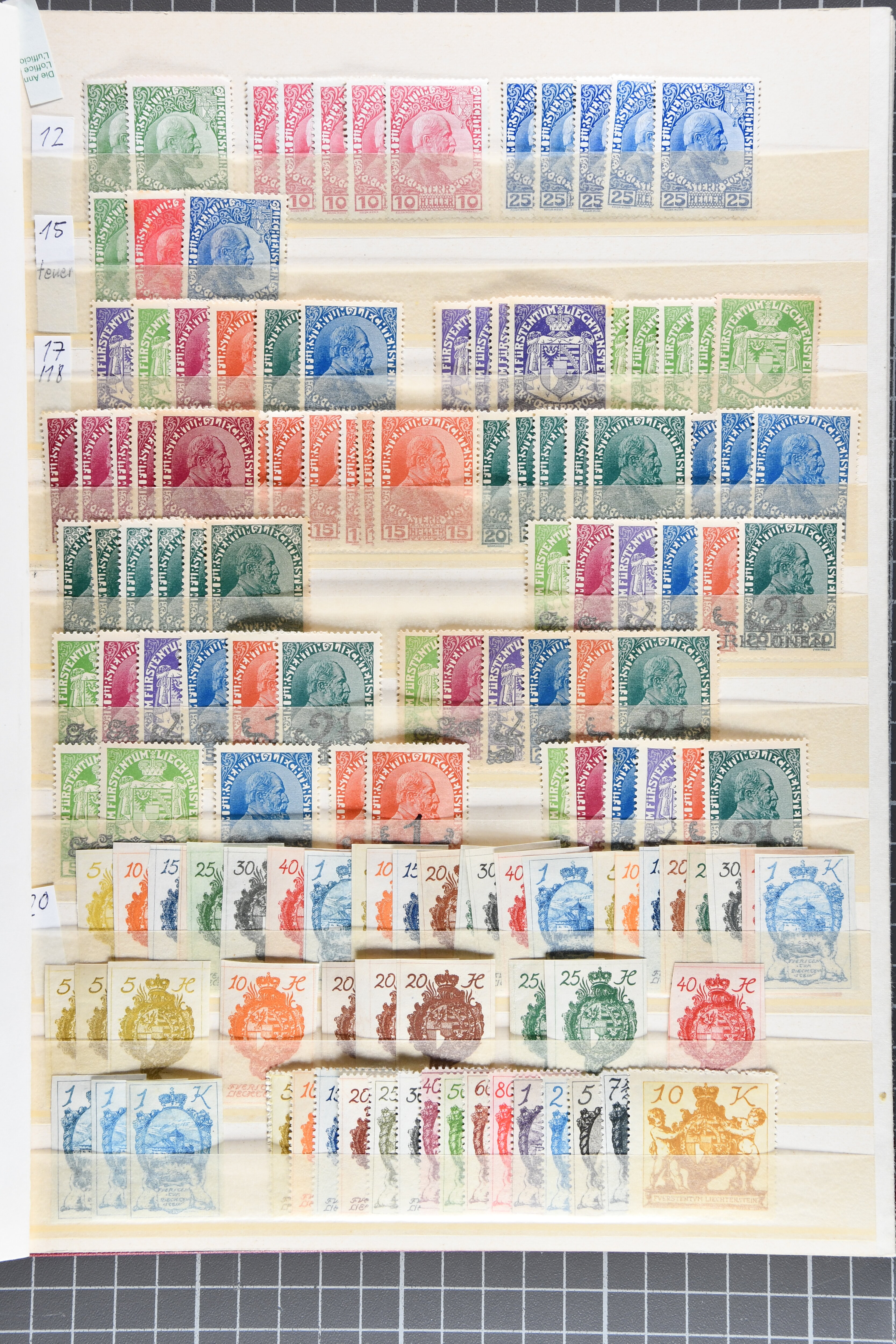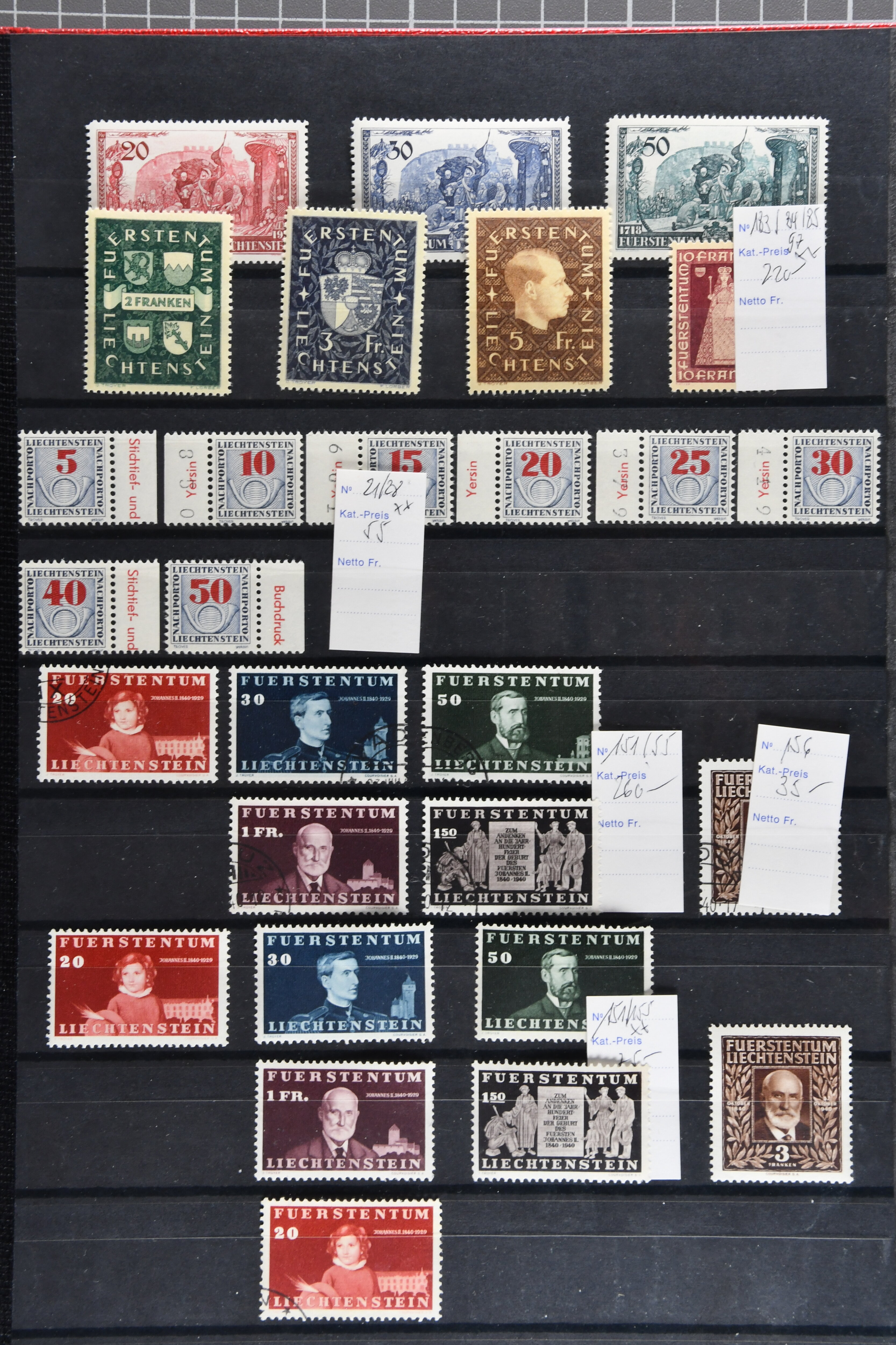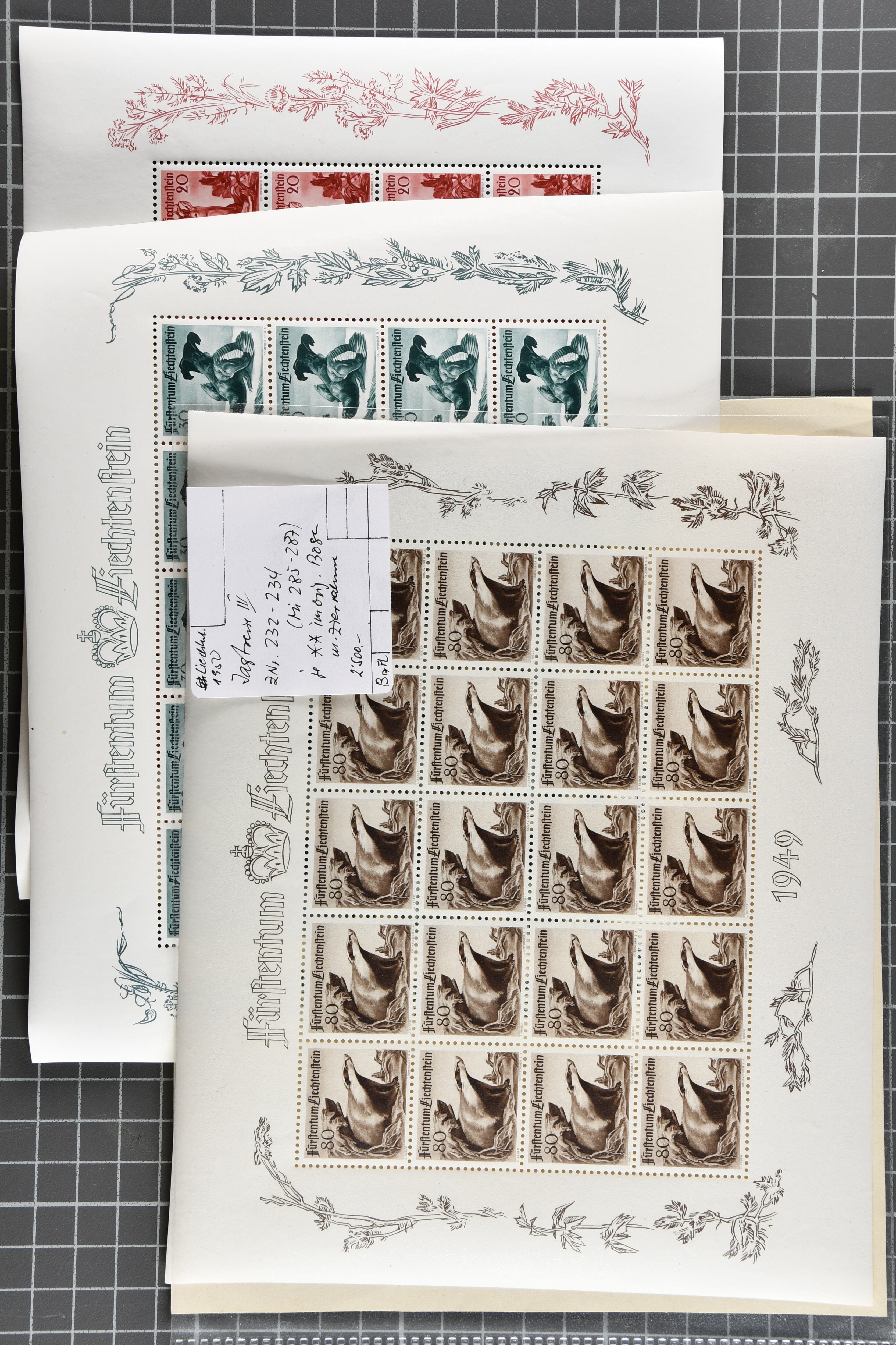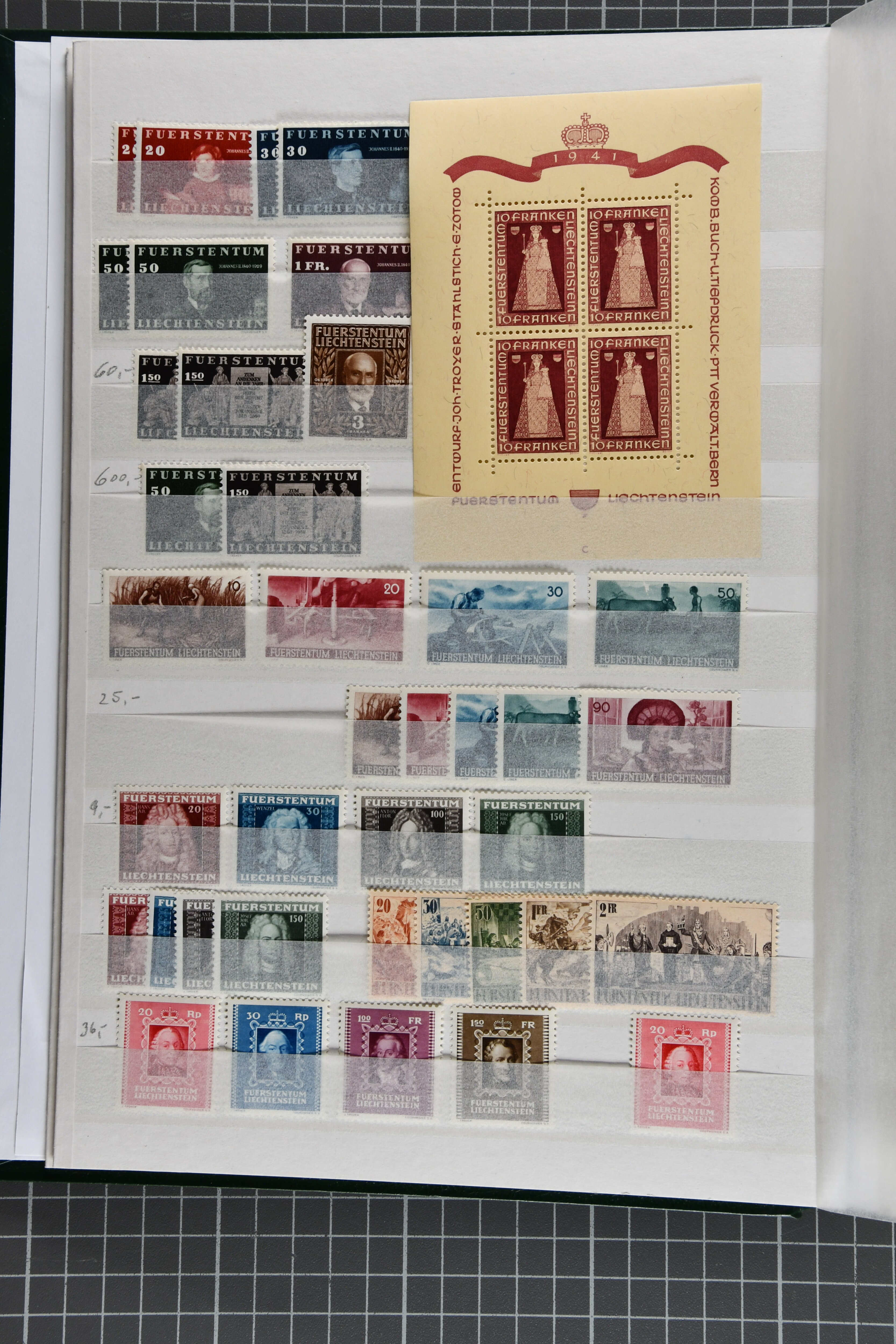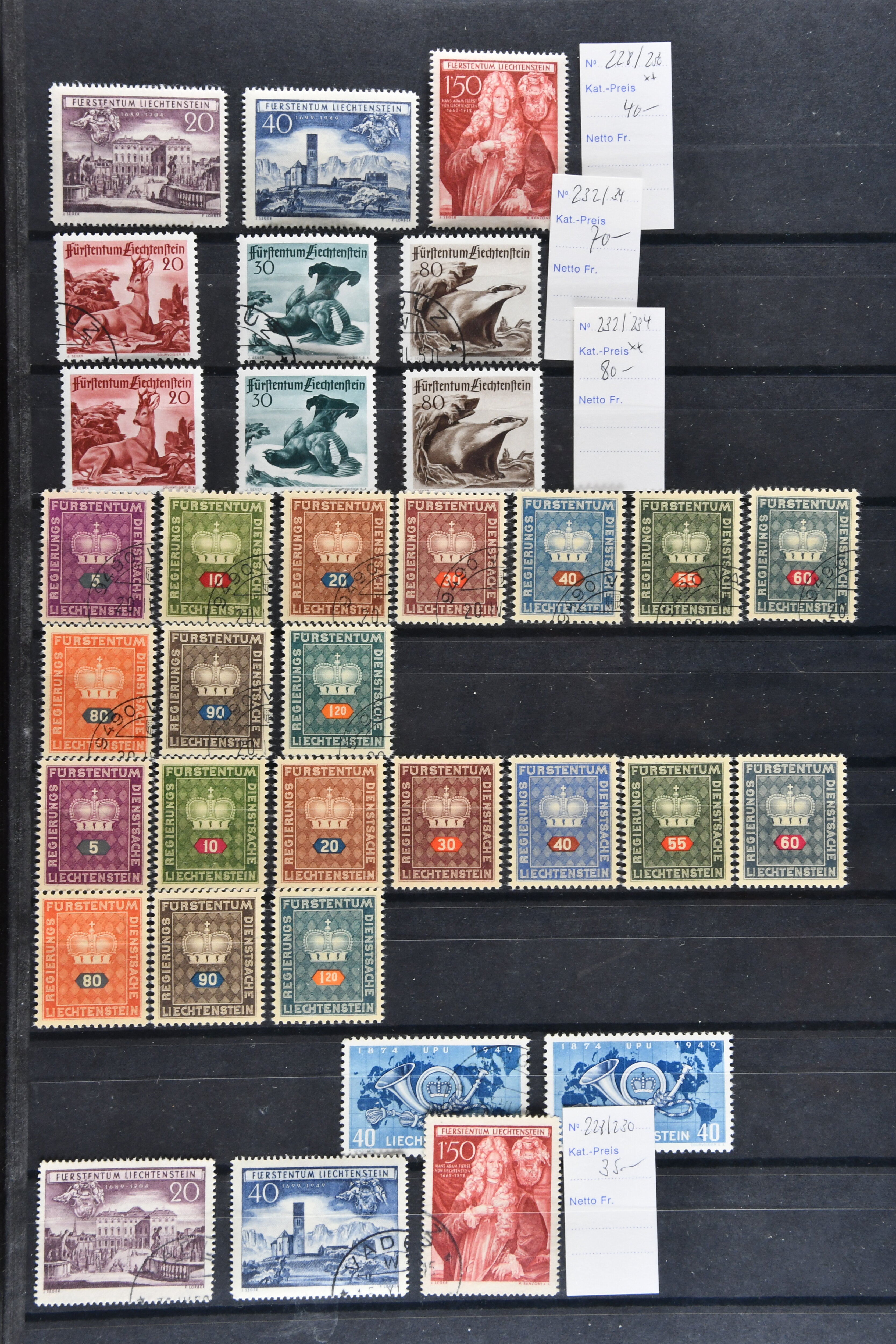 9434 image1908/65 (ca.): Kleines aber reichhaltiges Händlerlager postfr./ungebr., gest. und im Viererblock auf Steckkarten mit zahlreichen mittleren und besseren Marken und Sätzen. Dabei 1912 "Fürst Johann II", 5-25 H. auf Kreidepapier (LBK 1x-3x), zwei kompl. postfr. Sätze, 1928 "Rheinnot" ungezähnt in leicht abweichenden Farben (Mi.-Nr. 78-81U), postfr., 1921 Freimarken 20 Rp. "St. Mammertus-Kappelle" (LBK 53A) und 1 Fr. "Rheintal bei Vaduz" (LBK 53B), beide postfr., 1935 Flugpost "Adler", 10-30 Rp. (LBK F9y-F12y) im Viererblock, sauber und zentr. gest. "TRIESENBERG 4.VI.35", 1941 "Madonna von Dux" (LBK 150) postfr. (3) und im gest. Kleinbogen oder 1948/50 "Flugpioniere" postfr. und im gest. Viererblock. Gute Erhaltung. LBK=CHF 9'500+. (Image 1) (Image 2) (Image 3)