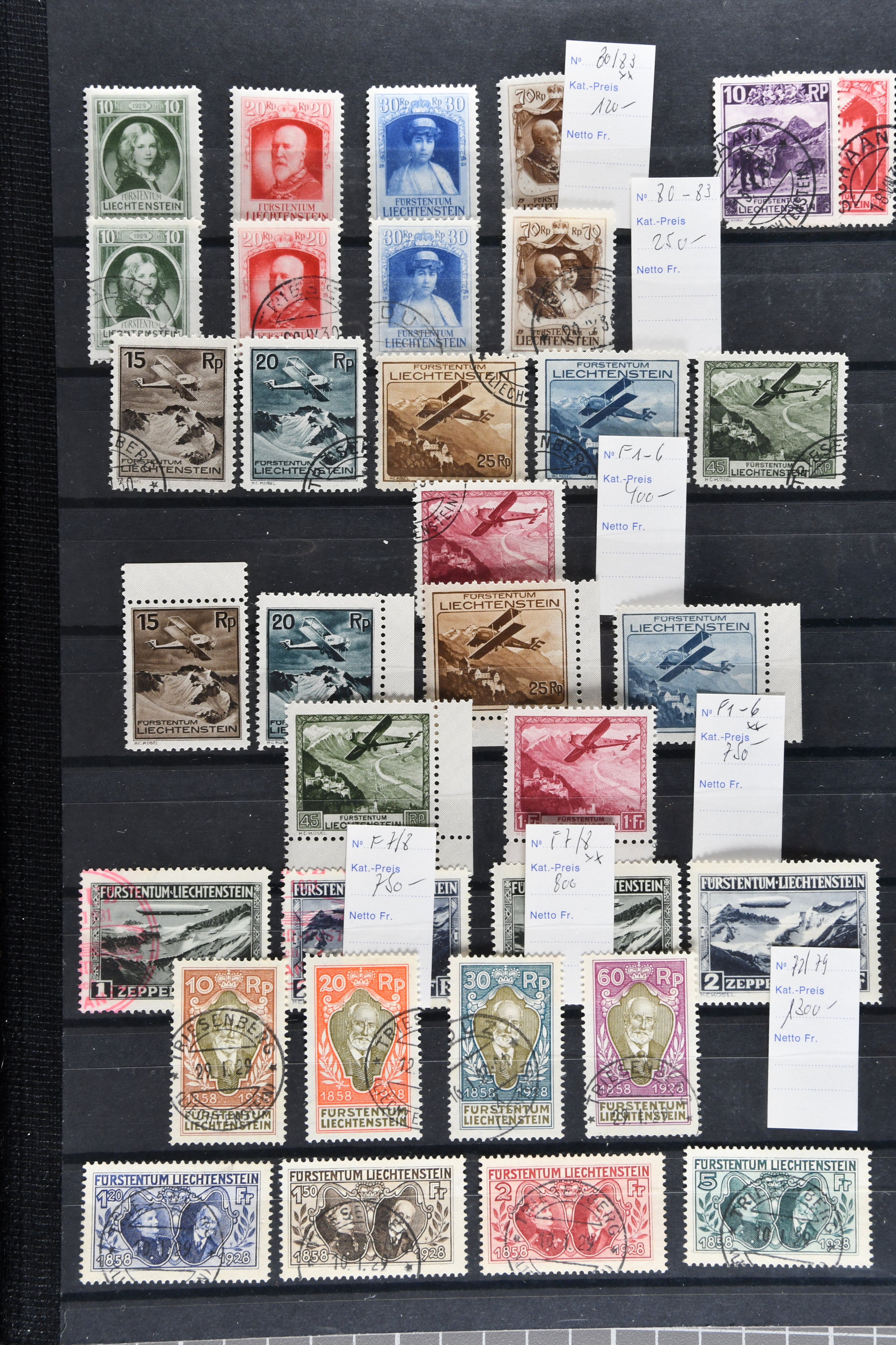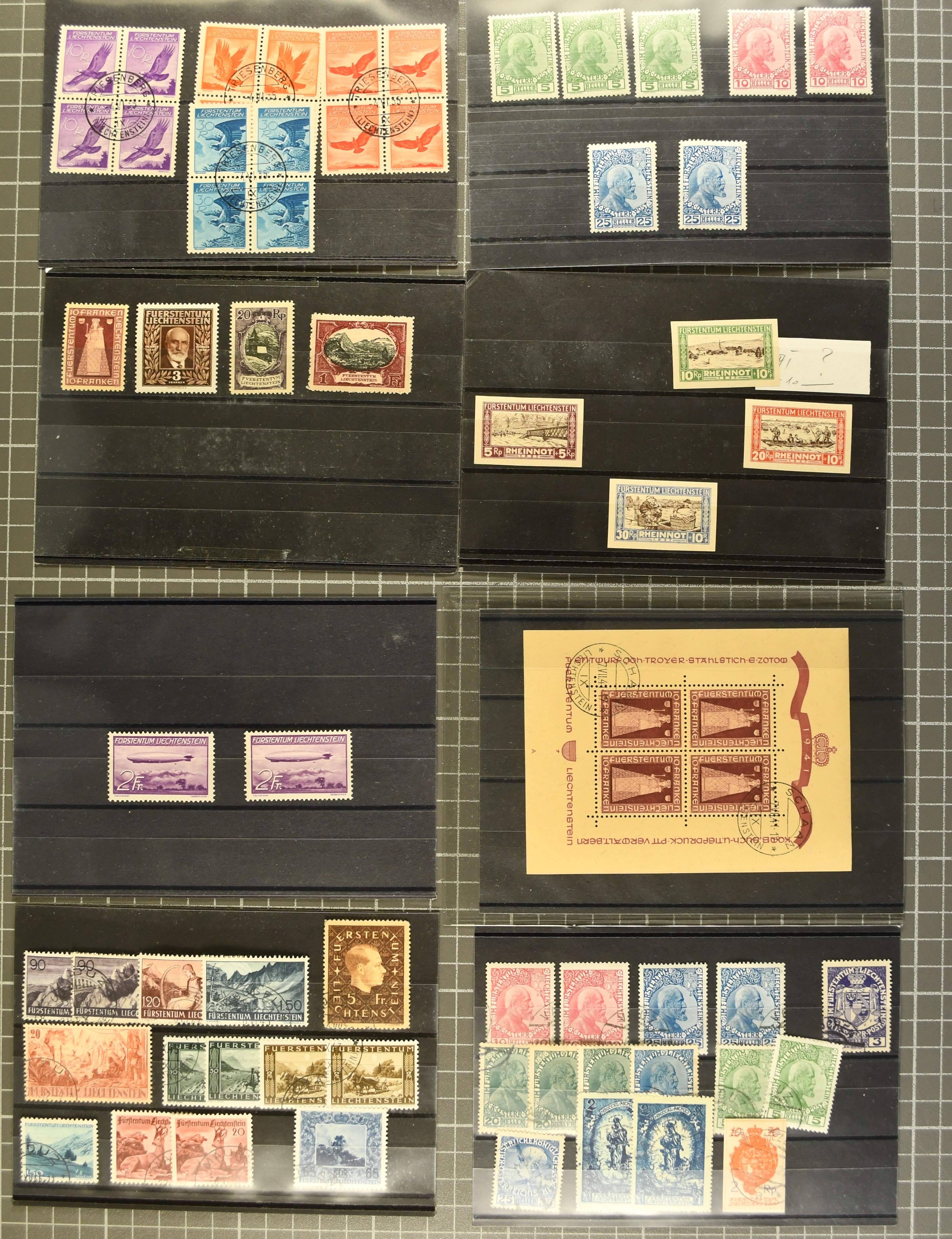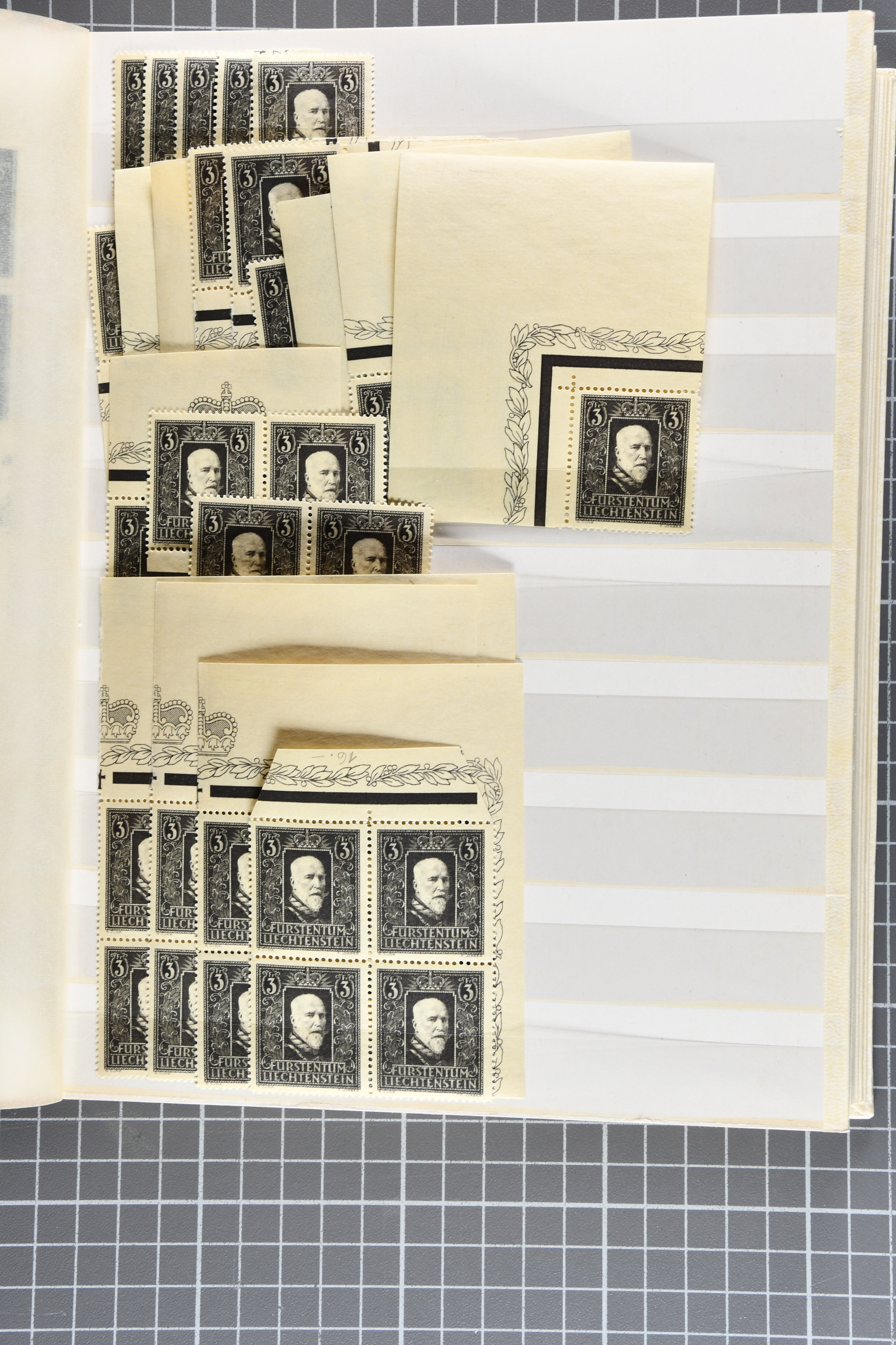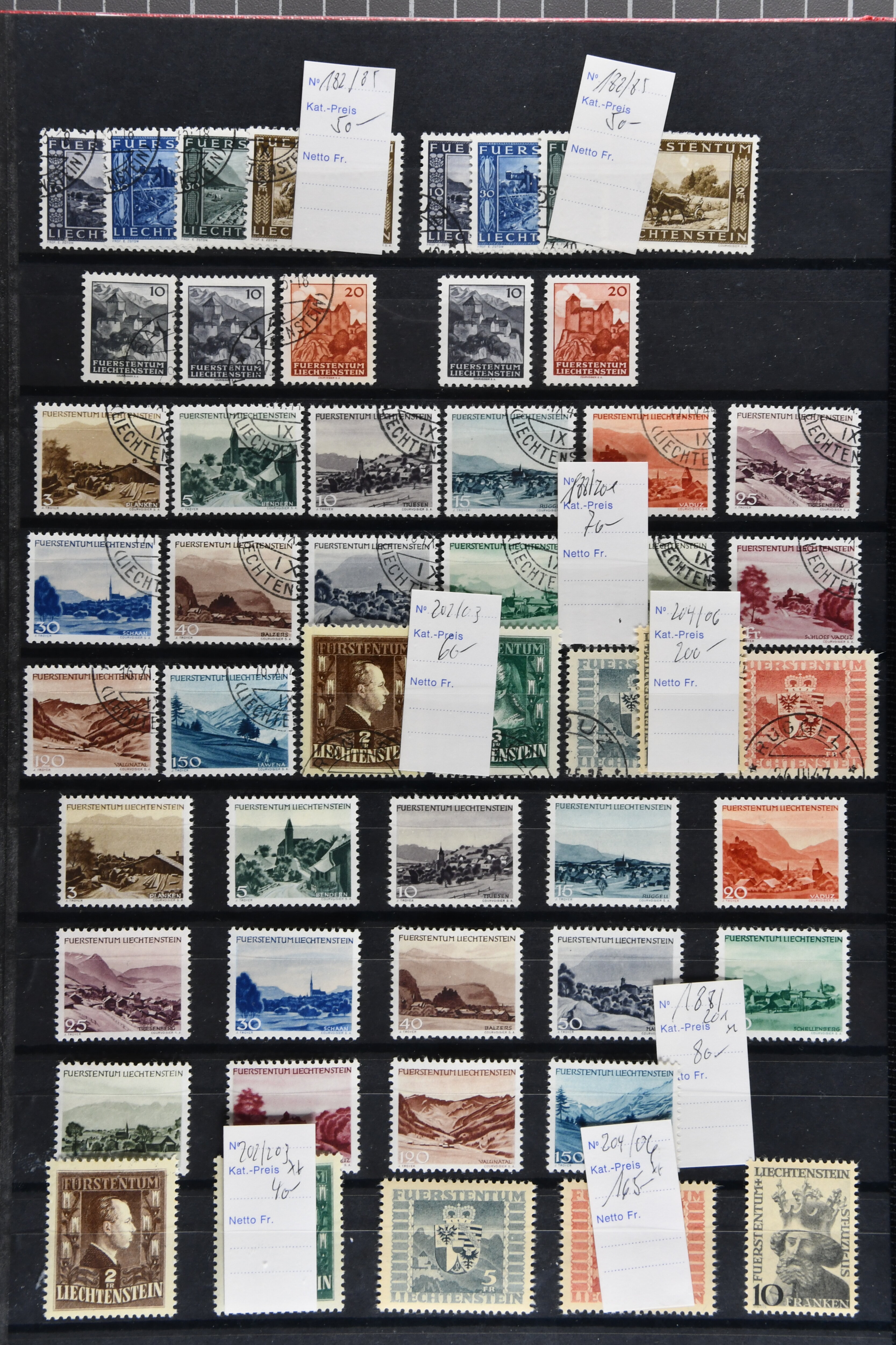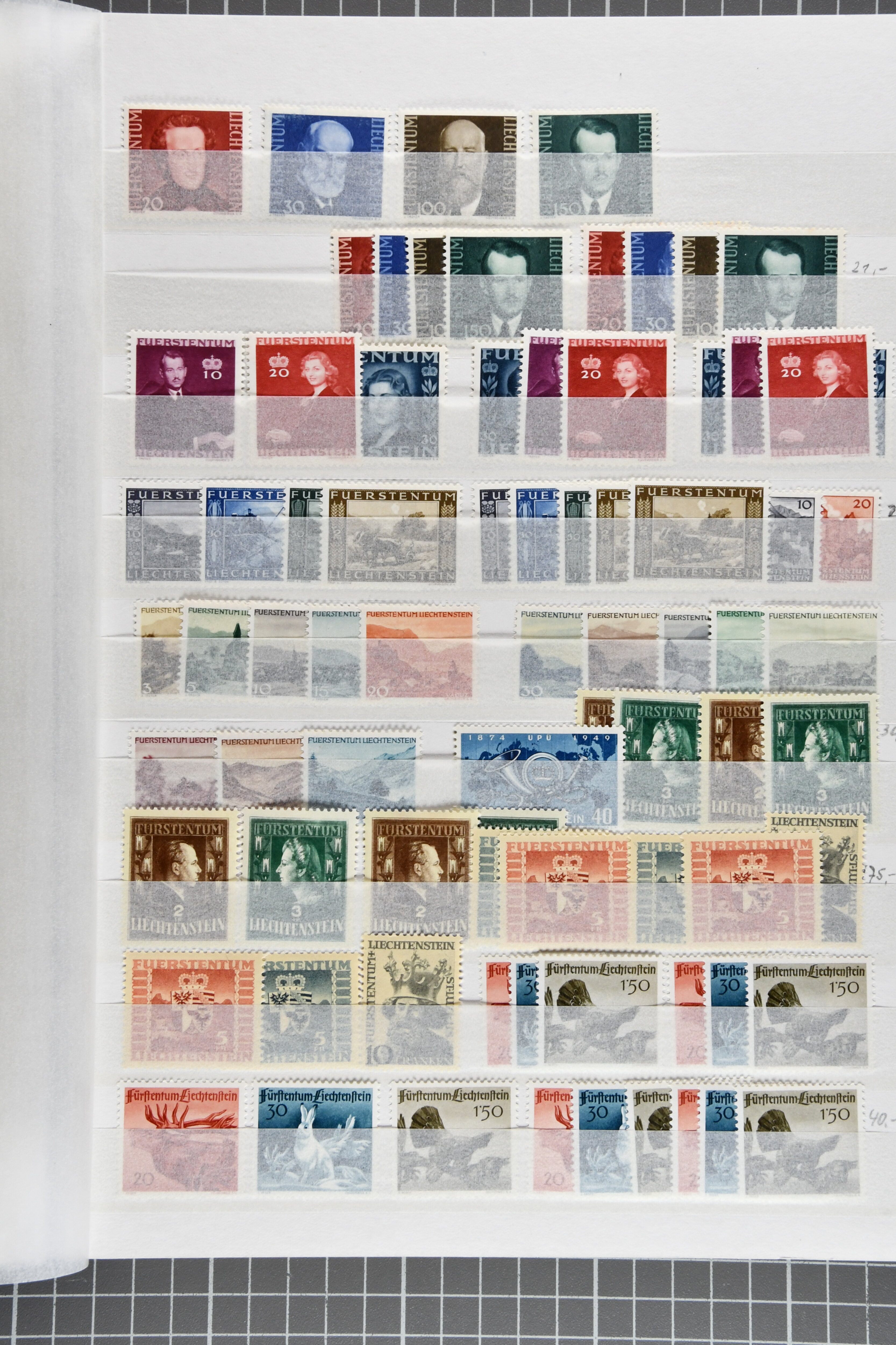 9434 image1908/65 (ca.): Kleines aber reichhaltiges Händlerlager postfr./ungebr., gest. und im Viererblock auf Steckkarten mit zahlreichen mittleren und besseren Marken und Sätzen. Dabei 1912 "Fürst Johann II", 5-25 H. auf Kreidepapier (LBK 1x-3x), zwei kompl. postfr. Sätze, 1928 "Rheinnot" ungezähnt in leicht abweichenden Farben (Mi.-Nr. 78-81U), postfr., 1921 Freimarken 20 Rp. "St. Mammertus-Kappelle" (LBK 53A) und 1 Fr. "Rheintal bei Vaduz" (LBK 53B), beide postfr., 1935 Flugpost "Adler", 10-30 Rp. (LBK F9y-F12y) im Viererblock, sauber und zentr. gest. "TRIESENBERG 4.VI.35", 1941 "Madonna von Dux" (LBK 150) postfr. (3) und im gest. Kleinbogen oder 1948/50 "Flugpioniere" postfr. und im gest. Viererblock. Gute Erhaltung. LBK=CHF 9'500+. (Image 1) (Image 2) (Image 3)
