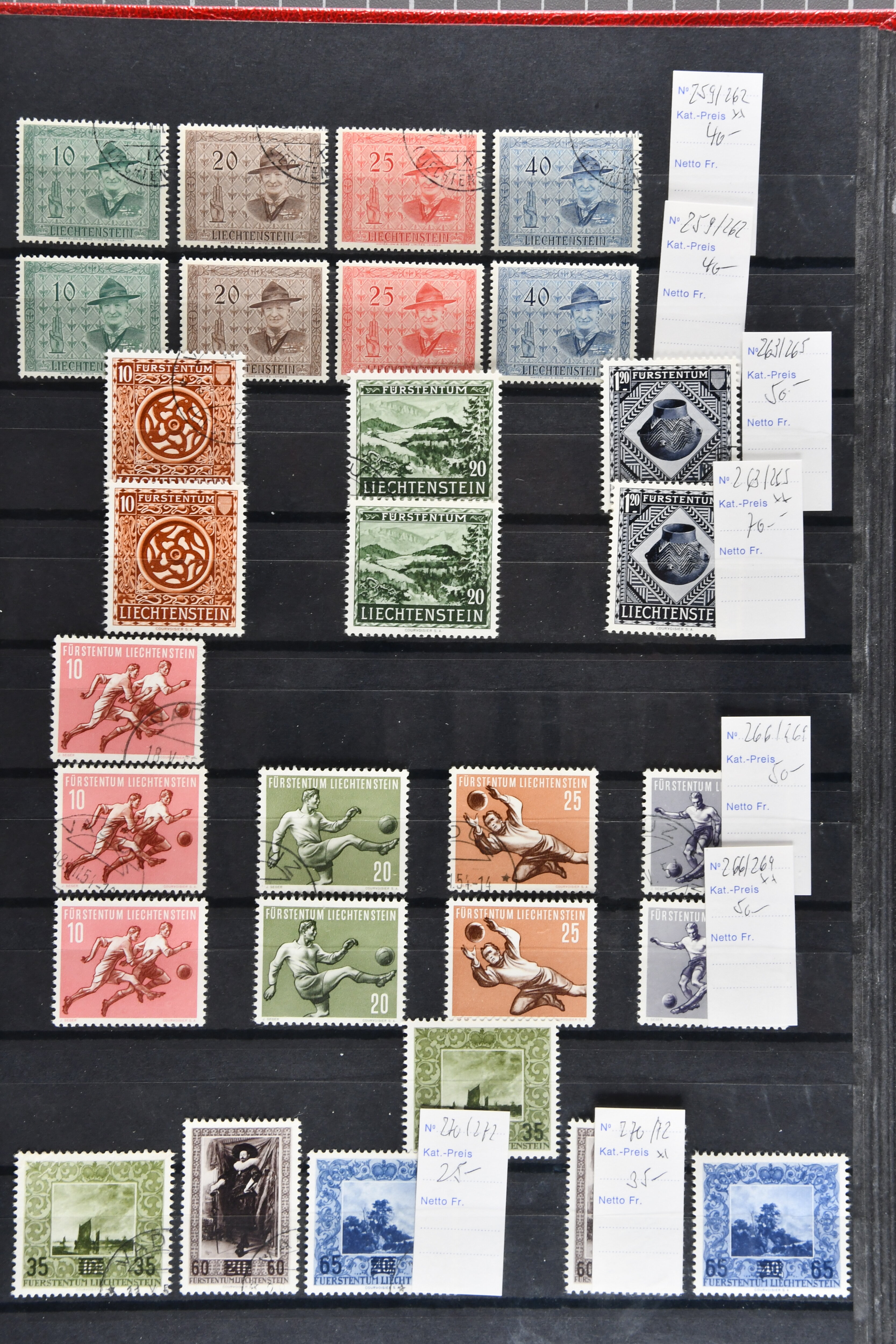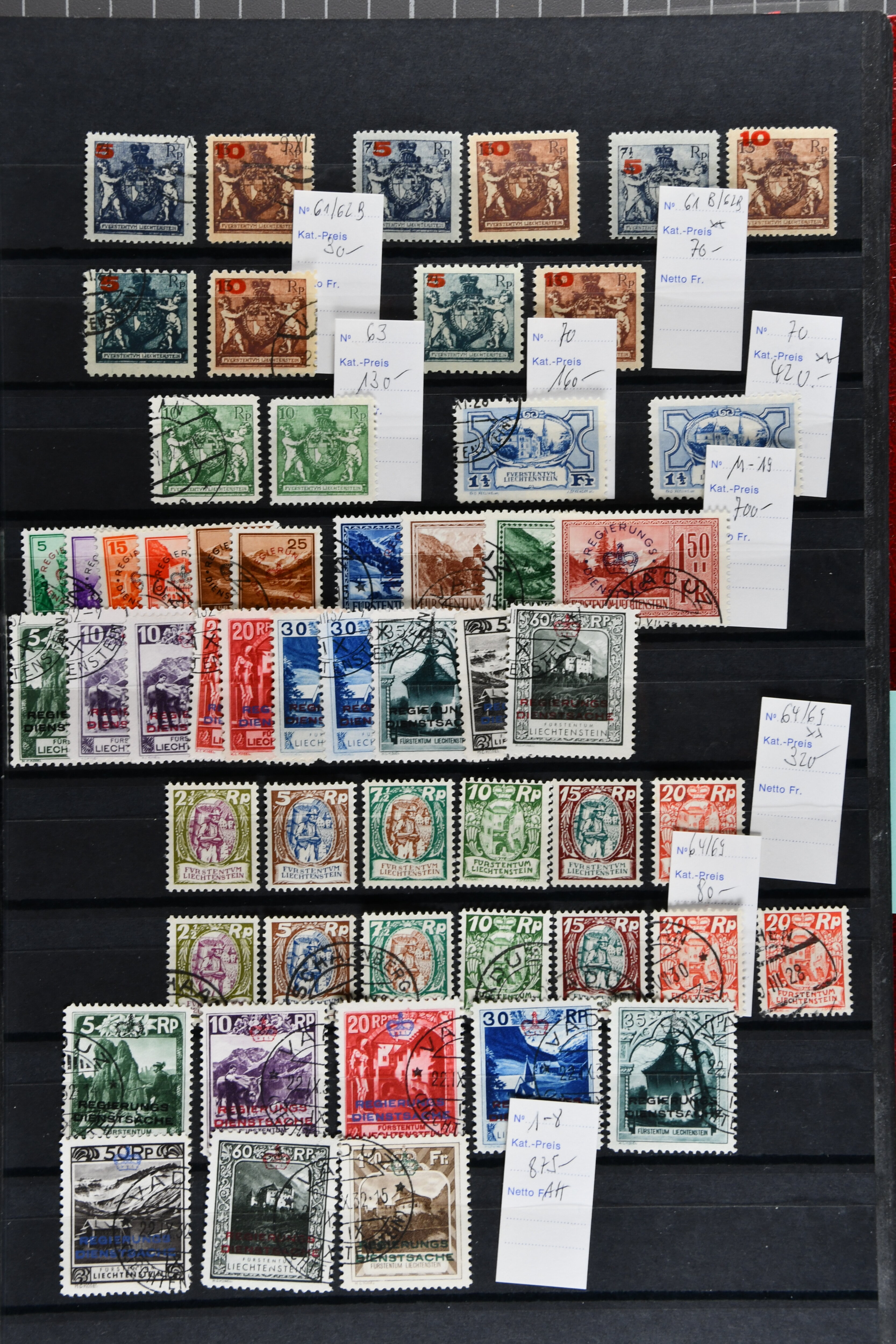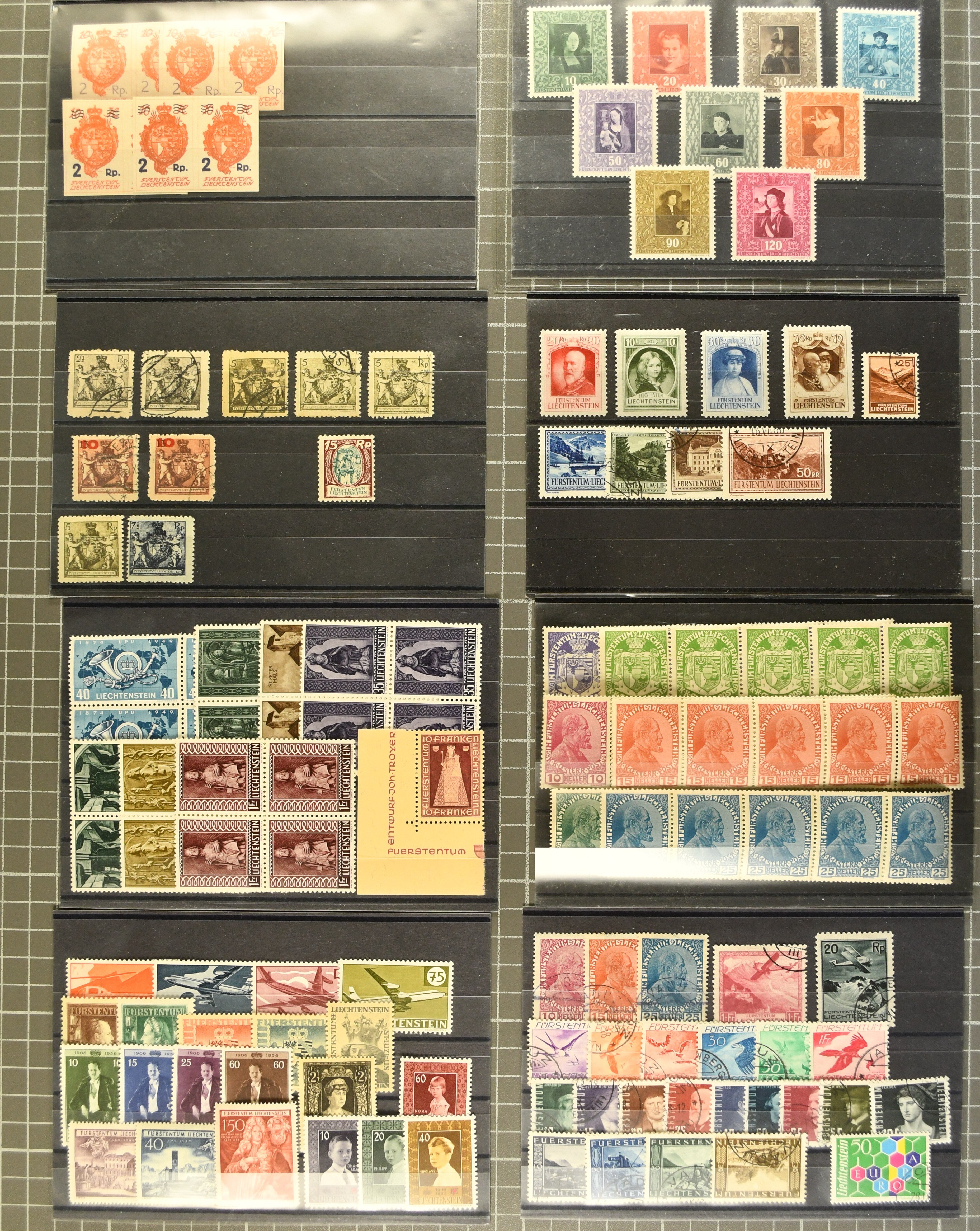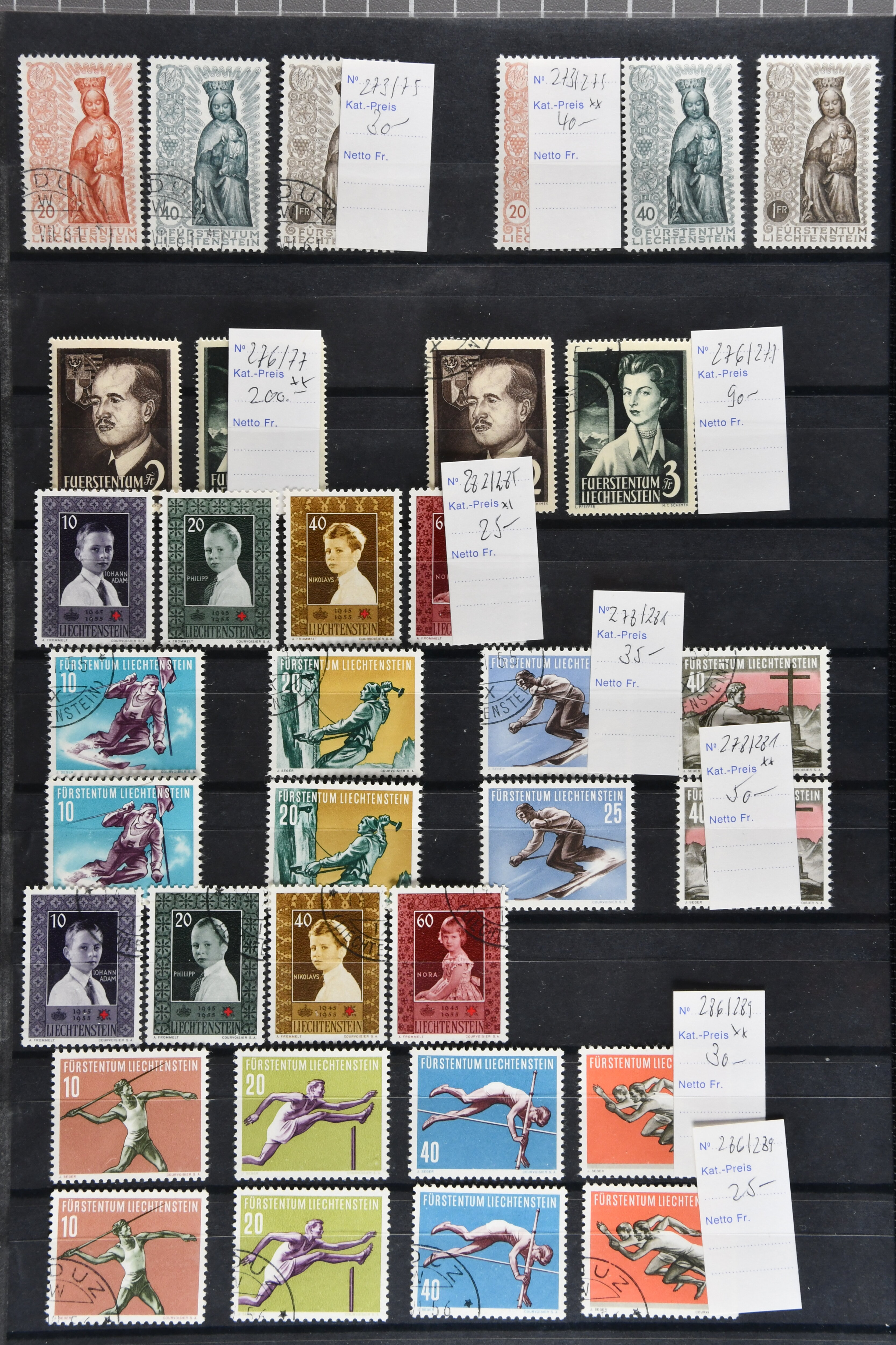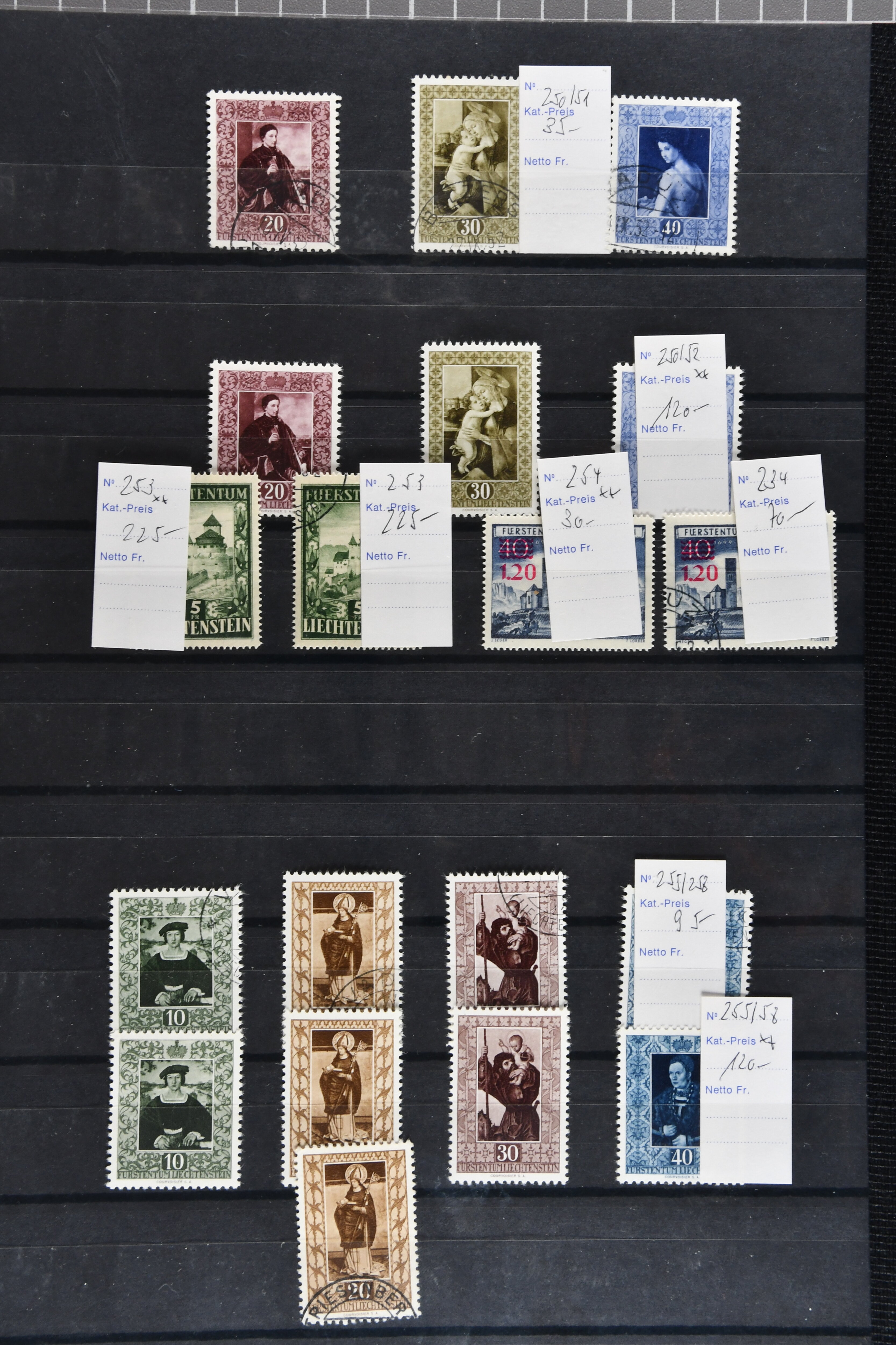 9434 image1908/65 (ca.): Kleines aber reichhaltiges Händlerlager postfr./ungebr., gest. und im Viererblock auf Steckkarten mit zahlreichen mittleren und besseren Marken und Sätzen. Dabei 1912 "Fürst Johann II", 5-25 H. auf Kreidepapier (LBK 1x-3x), zwei kompl. postfr. Sätze, 1928 "Rheinnot" ungezähnt in leicht abweichenden Farben (Mi.-Nr. 78-81U), postfr., 1921 Freimarken 20 Rp. "St. Mammertus-Kappelle" (LBK 53A) und 1 Fr. "Rheintal bei Vaduz" (LBK 53B), beide postfr., 1935 Flugpost "Adler", 10-30 Rp. (LBK F9y-F12y) im Viererblock, sauber und zentr. gest. "TRIESENBERG 4.VI.35", 1941 "Madonna von Dux" (LBK 150) postfr. (3) und im gest. Kleinbogen oder 1948/50 "Flugpioniere" postfr. und im gest. Viererblock. Gute Erhaltung. LBK=CHF 9'500+. (Image 1) (Image 2) (Image 3)