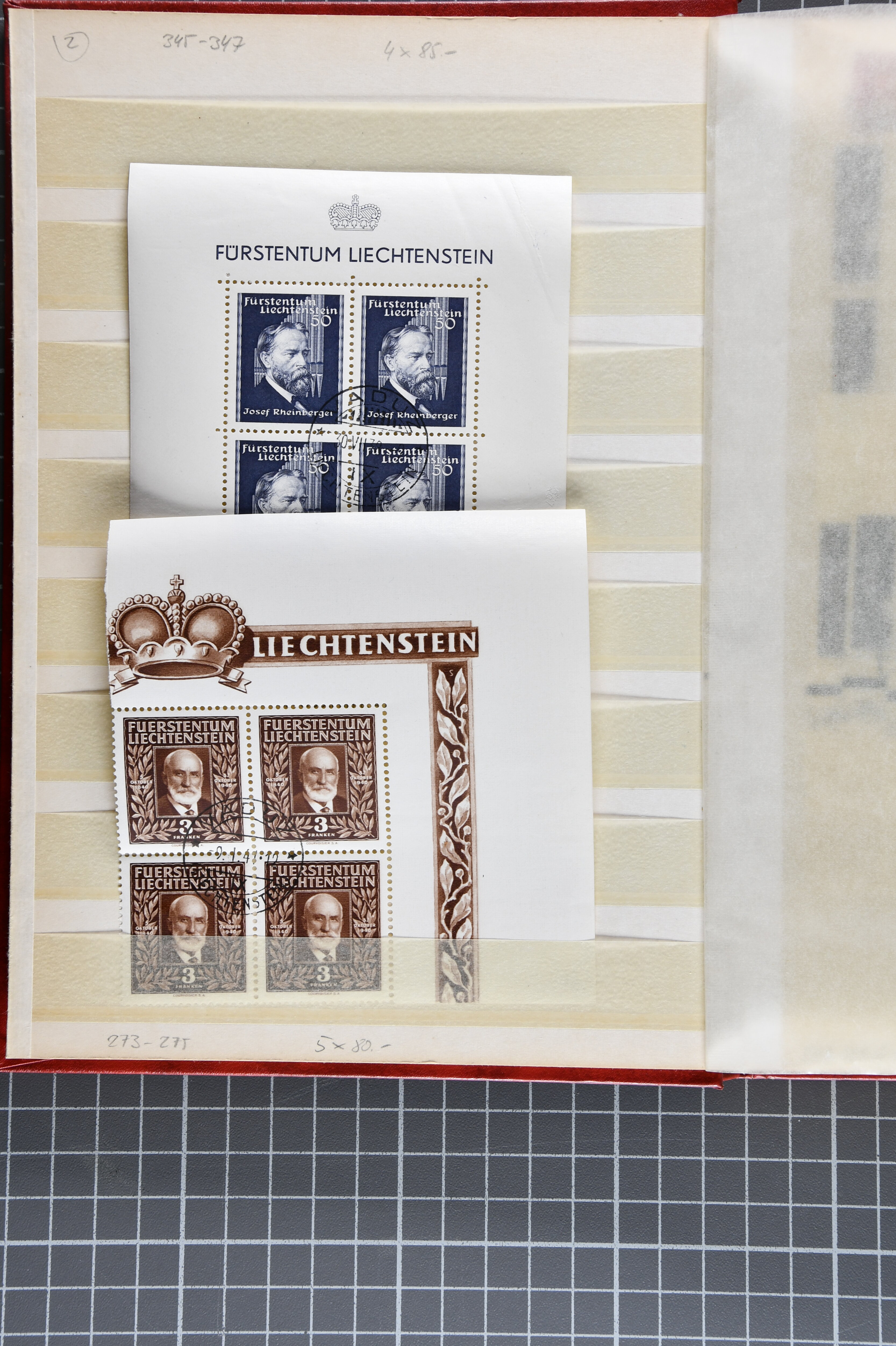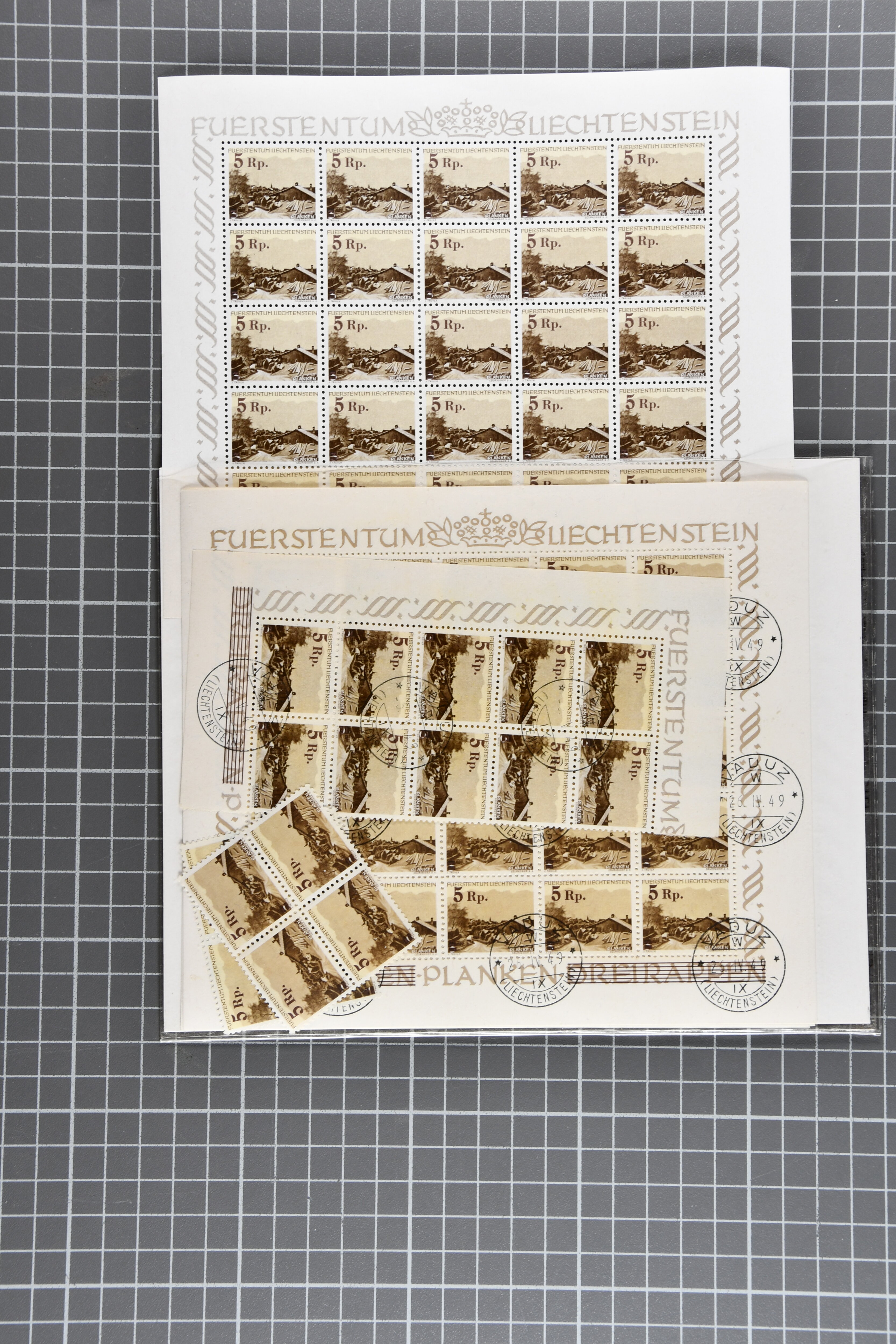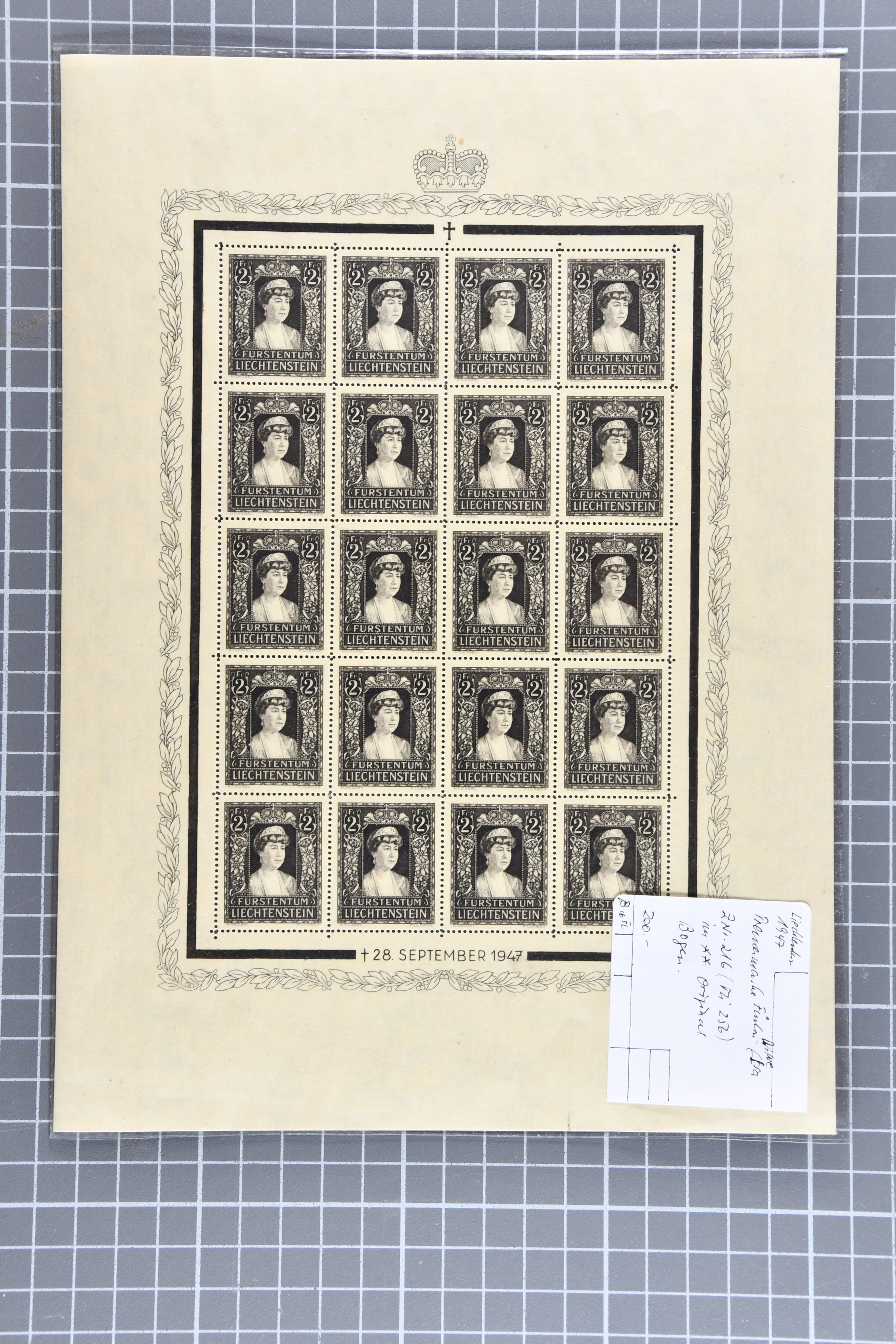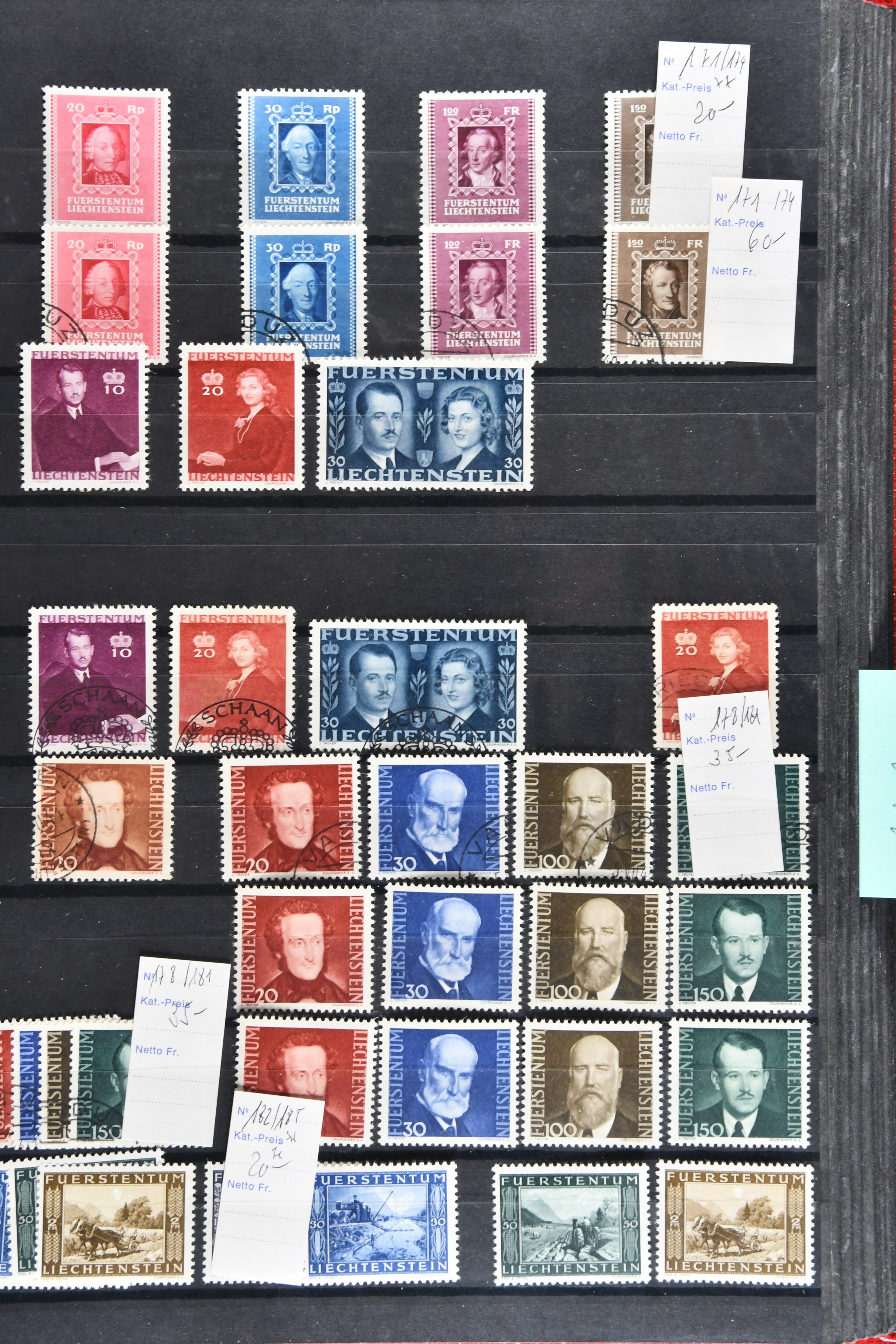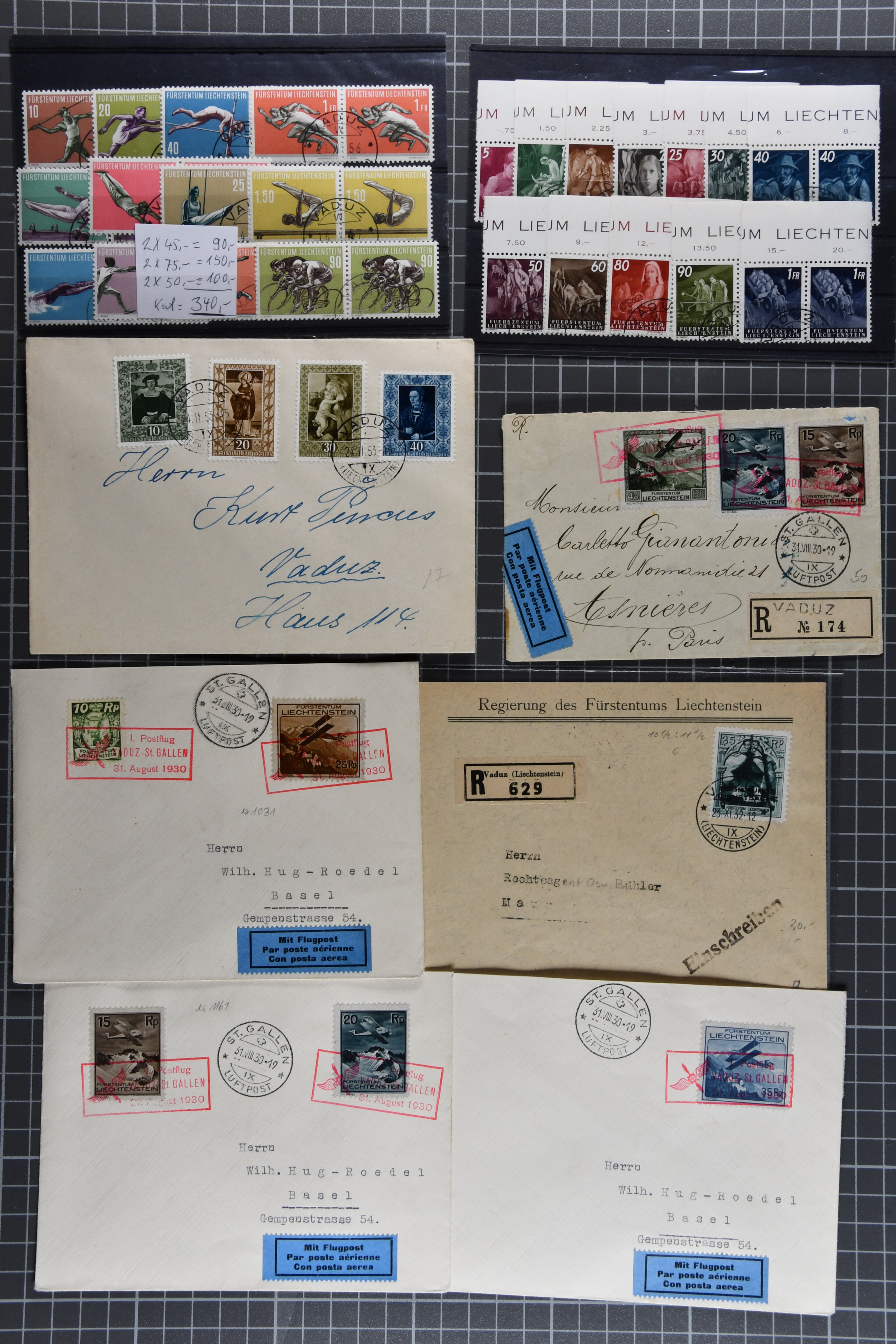 9434 image1908/65 (ca.): Kleines aber reichhaltiges Händlerlager postfr./ungebr., gest. und im Viererblock auf Steckkarten mit zahlreichen mittleren und besseren Marken und Sätzen. Dabei 1912 "Fürst Johann II", 5-25 H. auf Kreidepapier (LBK 1x-3x), zwei kompl. postfr. Sätze, 1928 "Rheinnot" ungezähnt in leicht abweichenden Farben (Mi.-Nr. 78-81U), postfr., 1921 Freimarken 20 Rp. "St. Mammertus-Kappelle" (LBK 53A) und 1 Fr. "Rheintal bei Vaduz" (LBK 53B), beide postfr., 1935 Flugpost "Adler", 10-30 Rp. (LBK F9y-F12y) im Viererblock, sauber und zentr. gest. "TRIESENBERG 4.VI.35", 1941 "Madonna von Dux" (LBK 150) postfr. (3) und im gest. Kleinbogen oder 1948/50 "Flugpioniere" postfr. und im gest. Viererblock. Gute Erhaltung. LBK=CHF 9'500+. (Image 1) (Image 2) (Image 3)