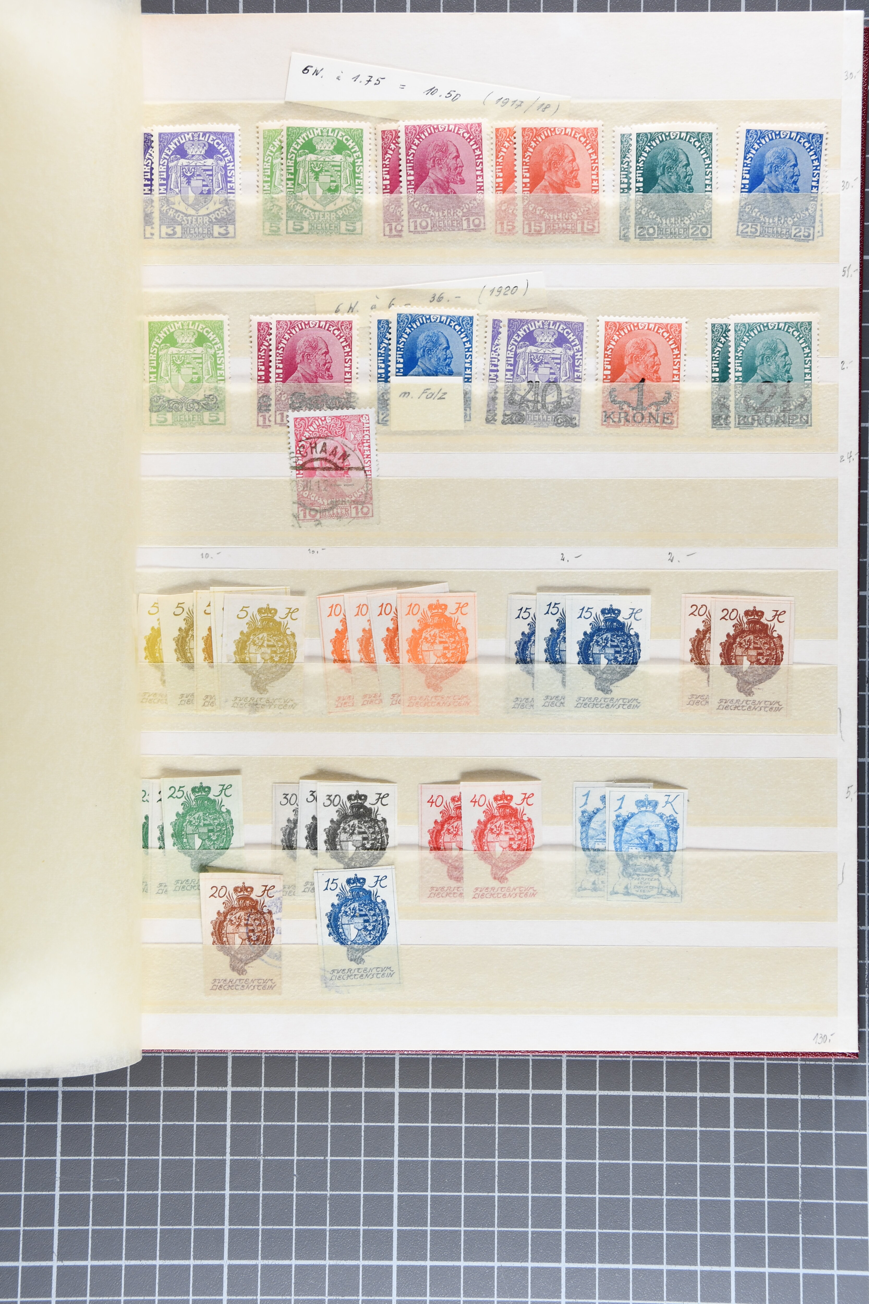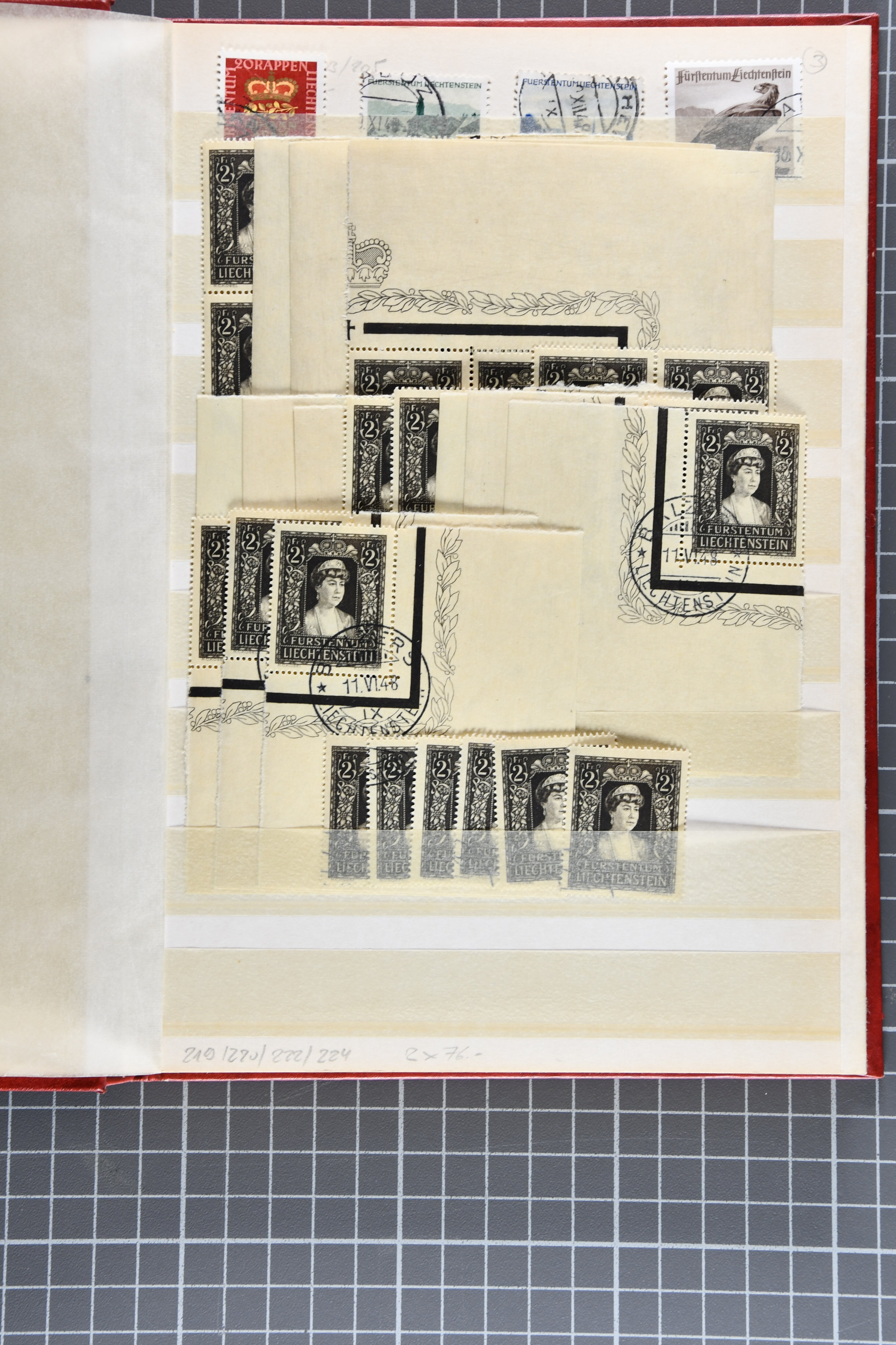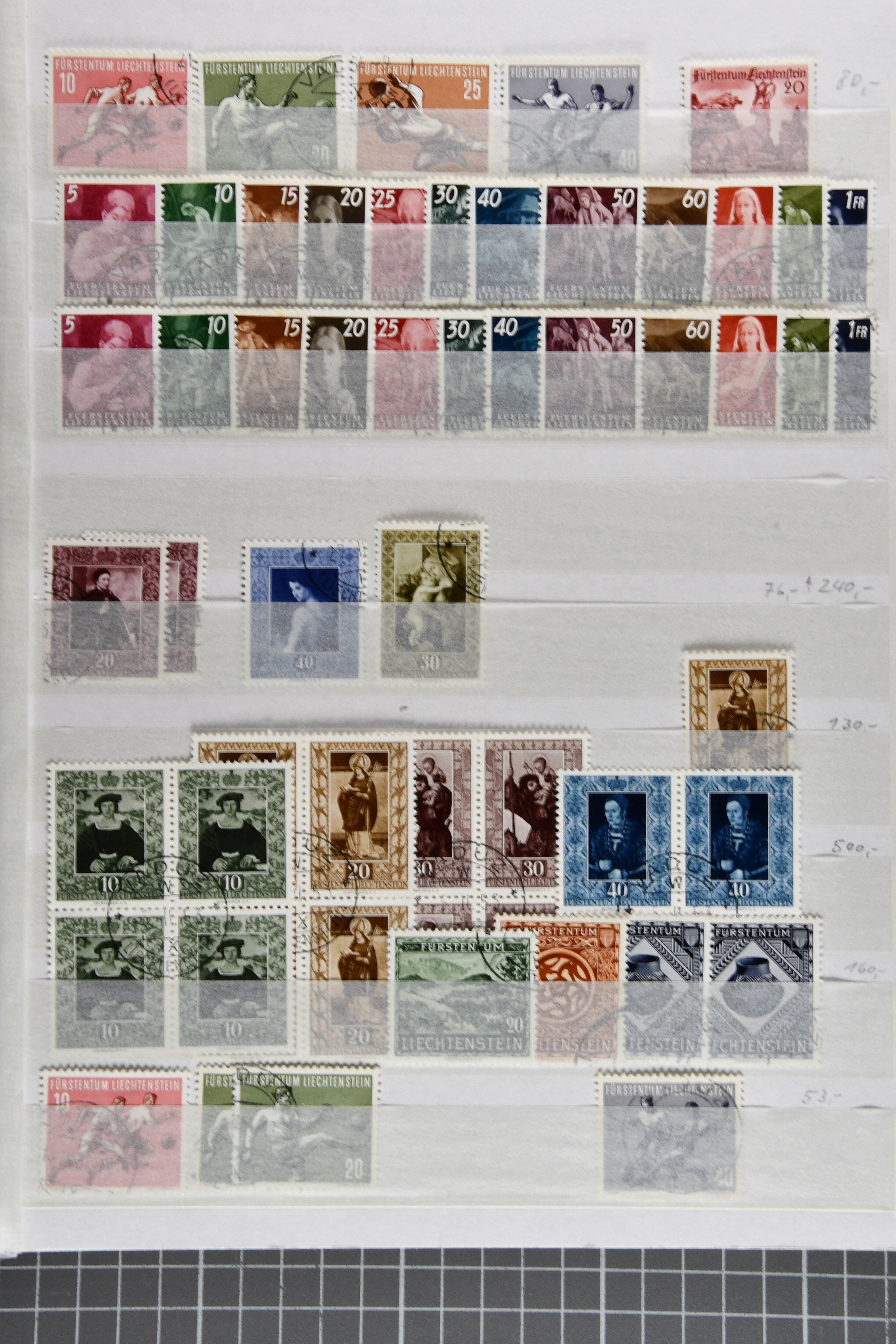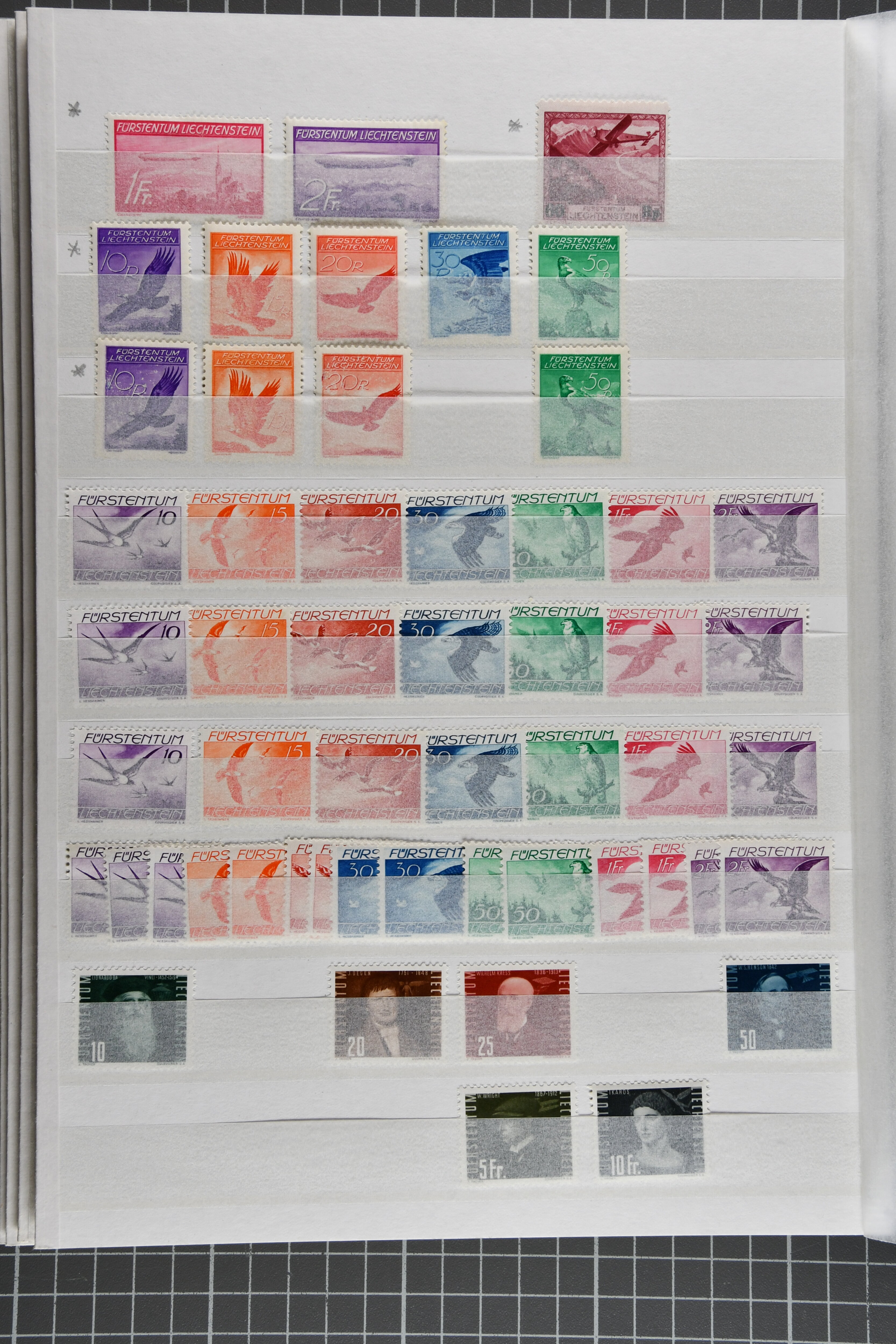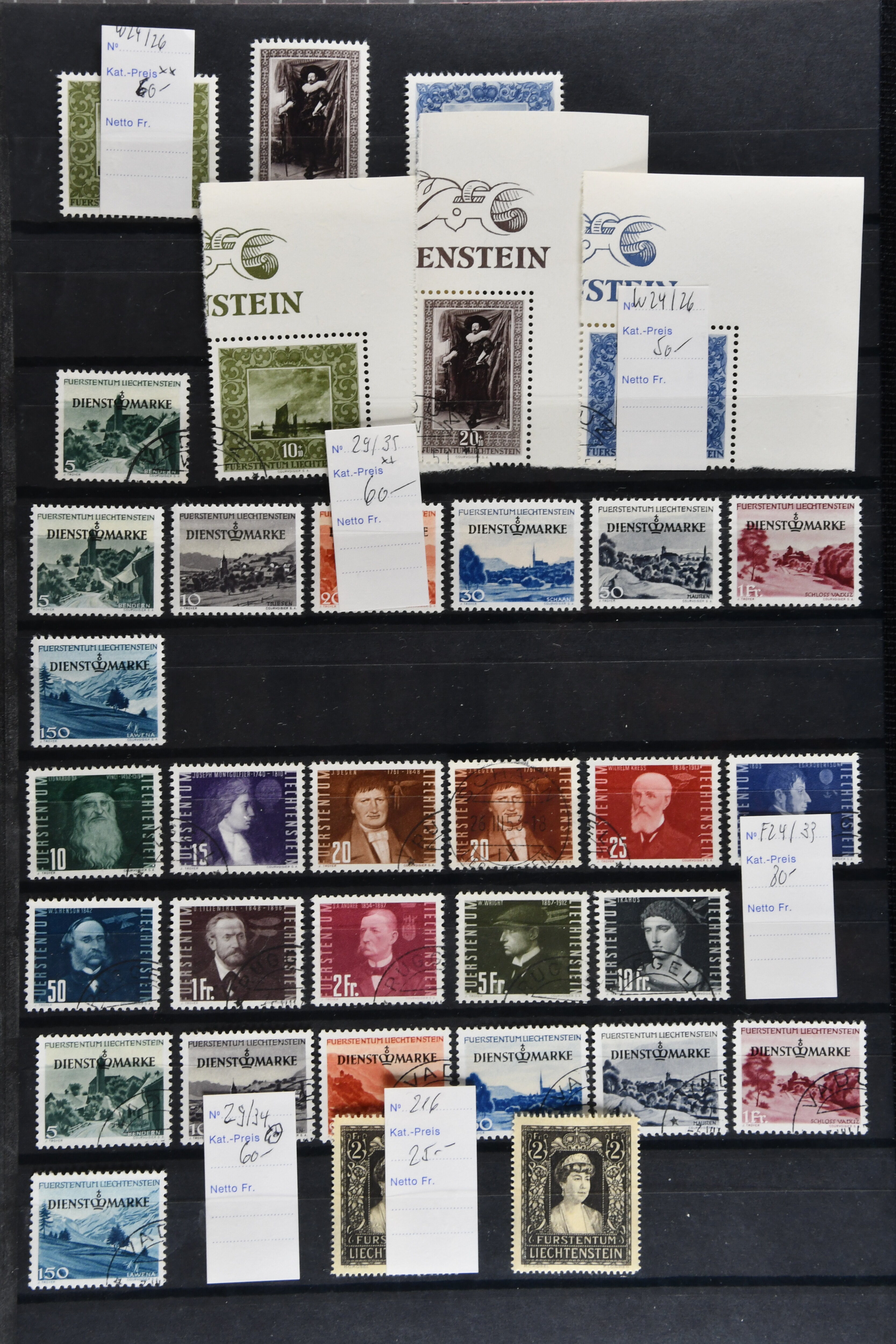 9434 image1908/65 (ca.): Kleines aber reichhaltiges Händlerlager postfr./ungebr., gest. und im Viererblock auf Steckkarten mit zahlreichen mittleren und besseren Marken und Sätzen. Dabei 1912 "Fürst Johann II", 5-25 H. auf Kreidepapier (LBK 1x-3x), zwei kompl. postfr. Sätze, 1928 "Rheinnot" ungezähnt in leicht abweichenden Farben (Mi.-Nr. 78-81U), postfr., 1921 Freimarken 20 Rp. "St. Mammertus-Kappelle" (LBK 53A) und 1 Fr. "Rheintal bei Vaduz" (LBK 53B), beide postfr., 1935 Flugpost "Adler", 10-30 Rp. (LBK F9y-F12y) im Viererblock, sauber und zentr. gest. "TRIESENBERG 4.VI.35", 1941 "Madonna von Dux" (LBK 150) postfr. (3) und im gest. Kleinbogen oder 1948/50 "Flugpioniere" postfr. und im gest. Viererblock. Gute Erhaltung. LBK=CHF 9'500+. (Image 1) (Image 2) (Image 3)