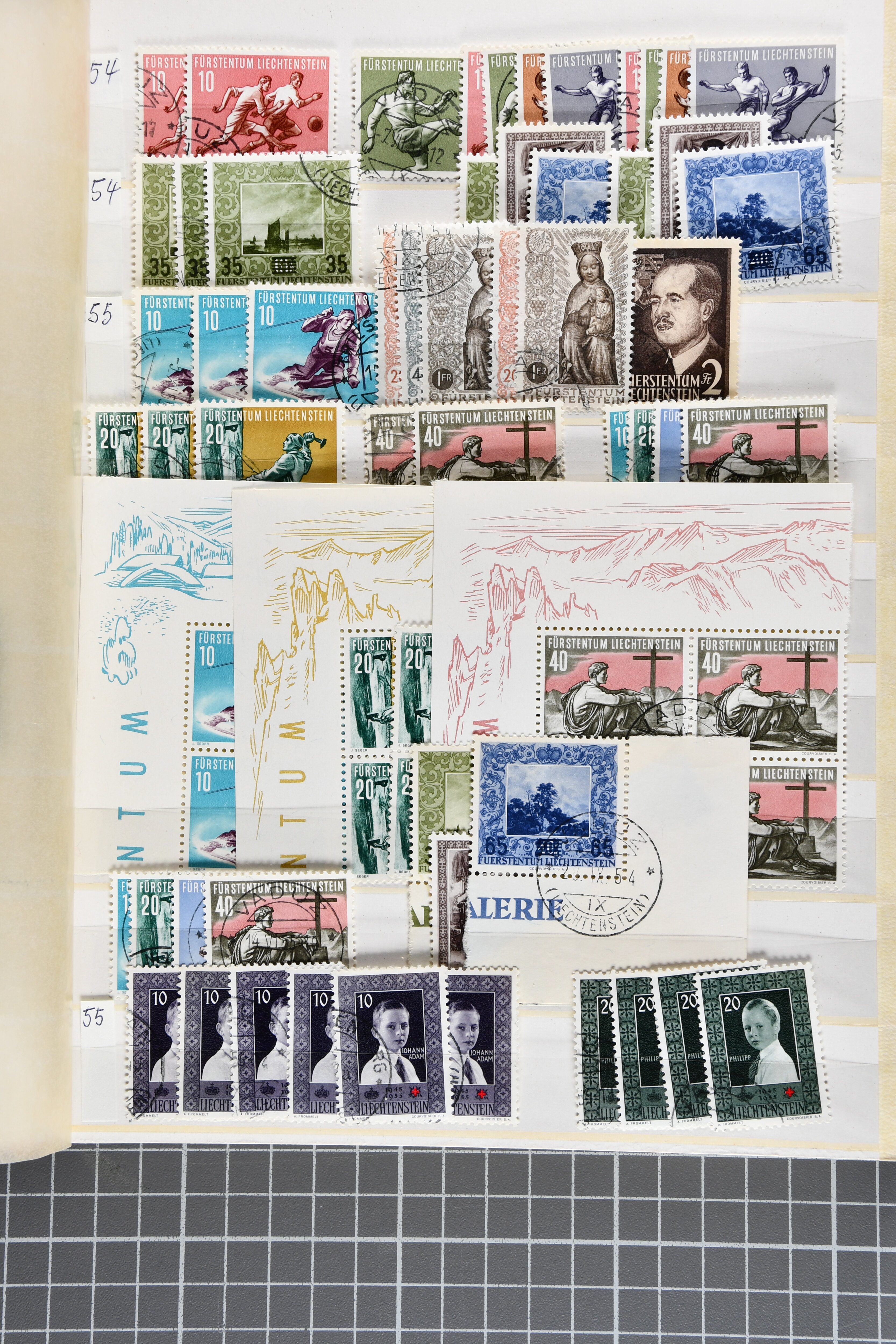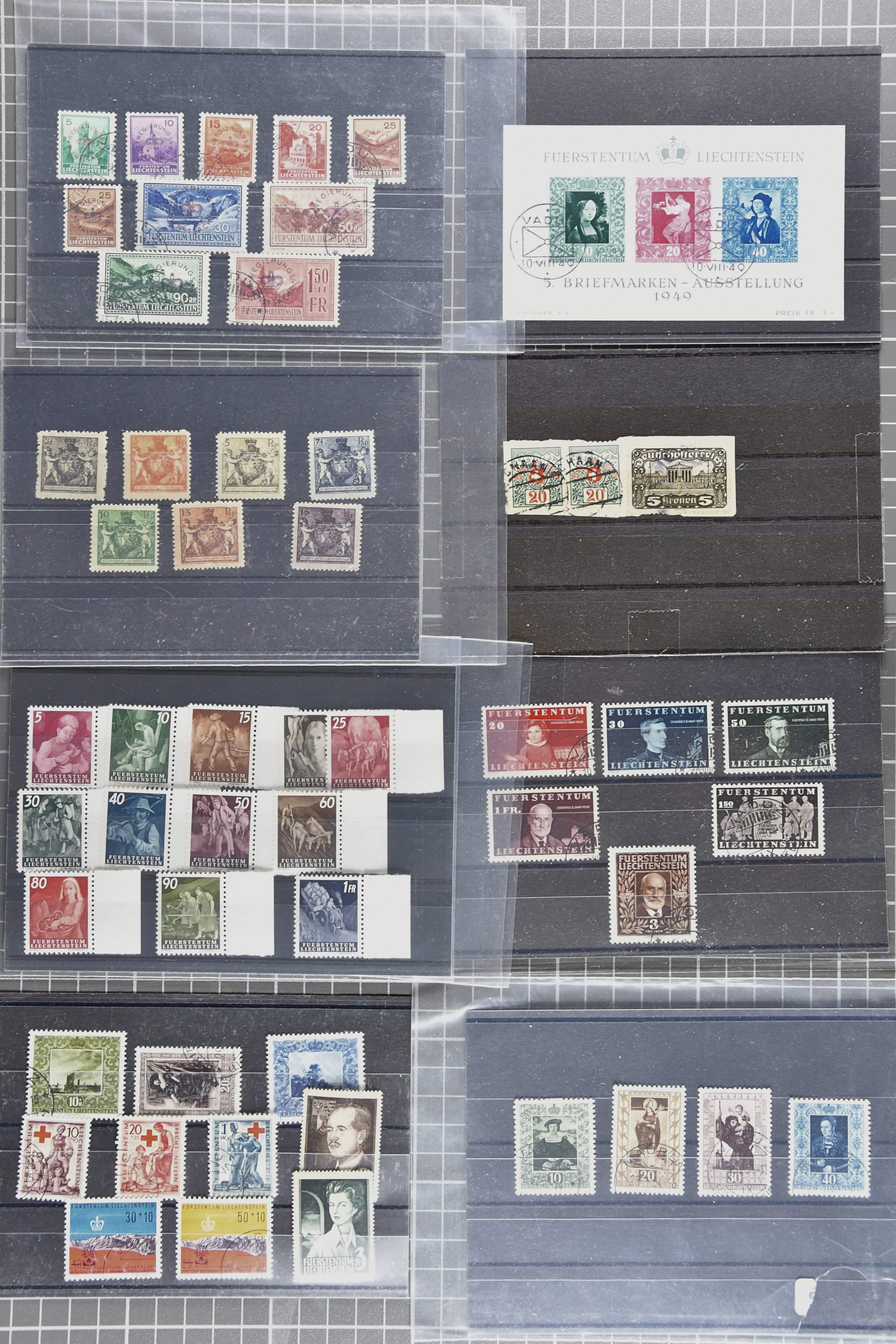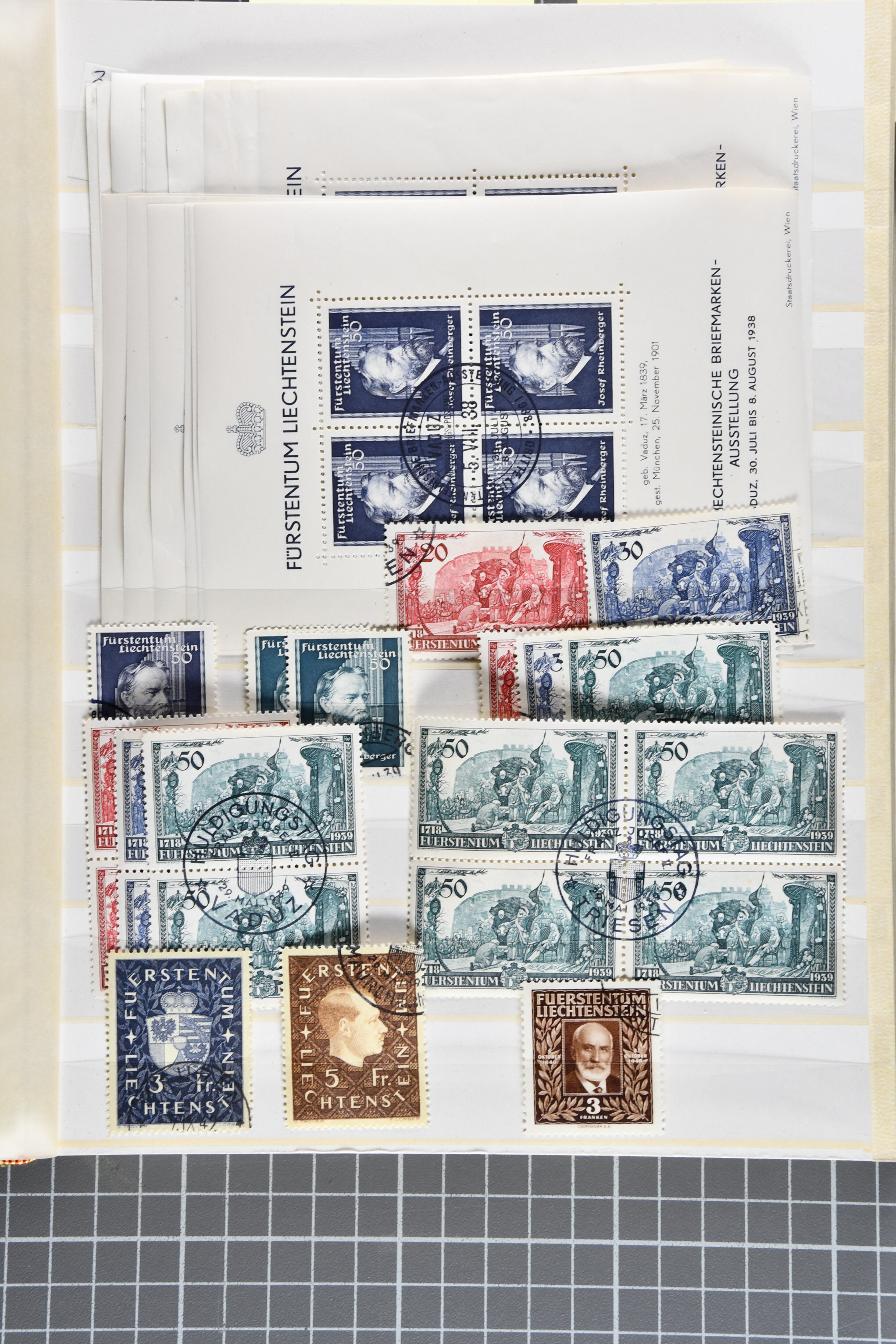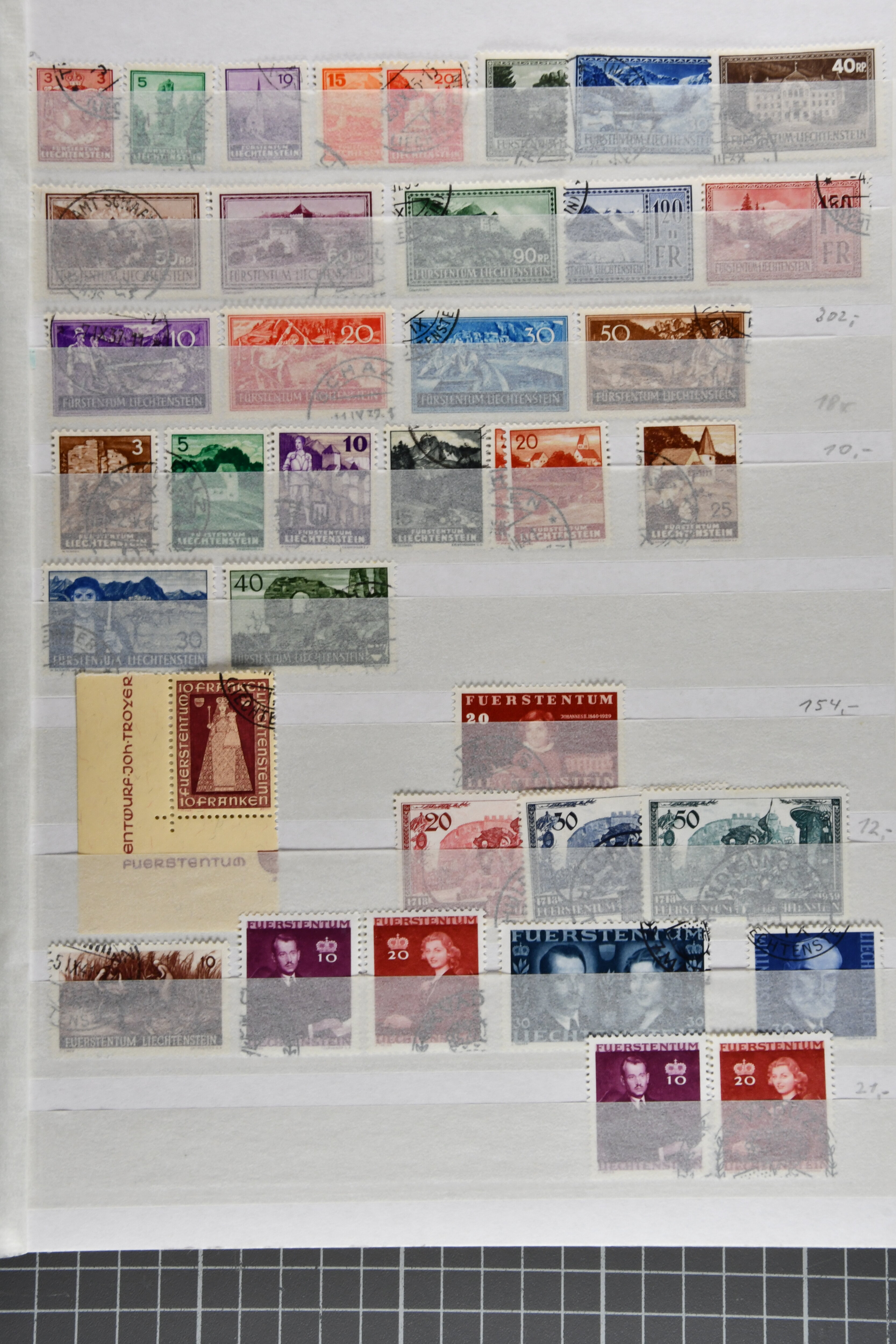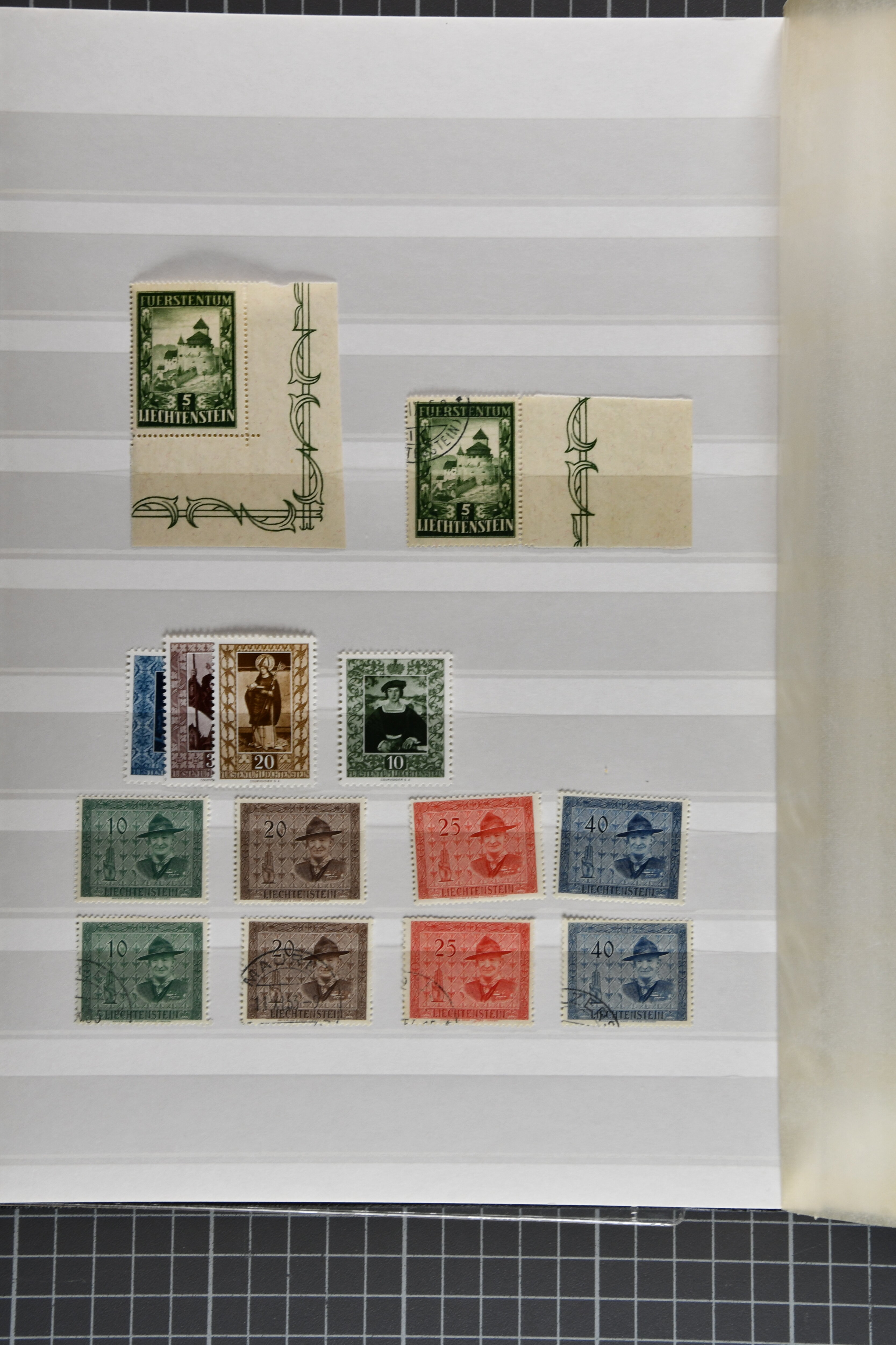 9434 image1908/65 (ca.): Kleines aber reichhaltiges Händlerlager postfr./ungebr., gest. und im Viererblock auf Steckkarten mit zahlreichen mittleren und besseren Marken und Sätzen. Dabei 1912 "Fürst Johann II", 5-25 H. auf Kreidepapier (LBK 1x-3x), zwei kompl. postfr. Sätze, 1928 "Rheinnot" ungezähnt in leicht abweichenden Farben (Mi.-Nr. 78-81U), postfr., 1921 Freimarken 20 Rp. "St. Mammertus-Kappelle" (LBK 53A) und 1 Fr. "Rheintal bei Vaduz" (LBK 53B), beide postfr., 1935 Flugpost "Adler", 10-30 Rp. (LBK F9y-F12y) im Viererblock, sauber und zentr. gest. "TRIESENBERG 4.VI.35", 1941 "Madonna von Dux" (LBK 150) postfr. (3) und im gest. Kleinbogen oder 1948/50 "Flugpioniere" postfr. und im gest. Viererblock. Gute Erhaltung. LBK=CHF 9'500+. (Image 1) (Image 2) (Image 3)