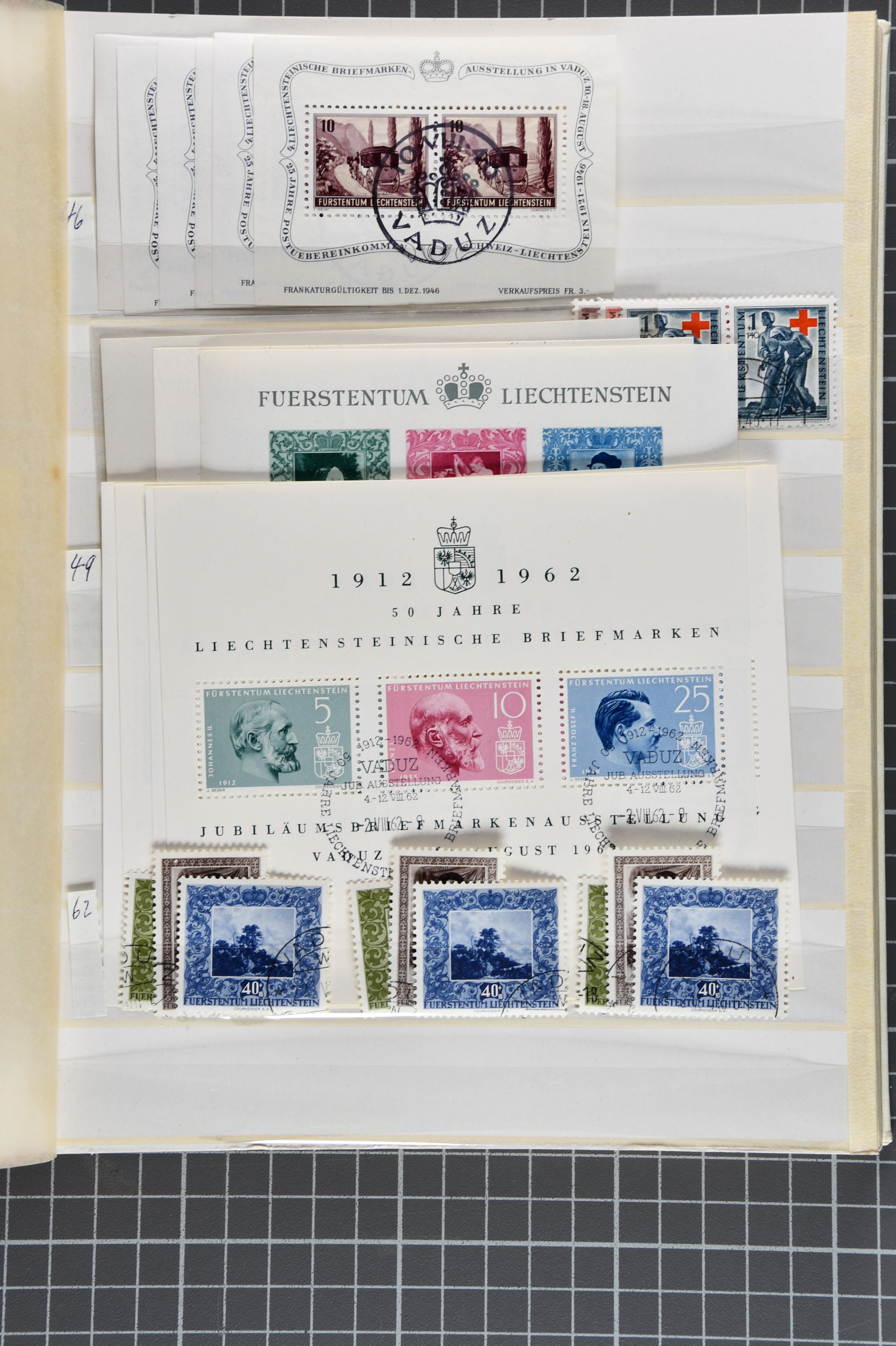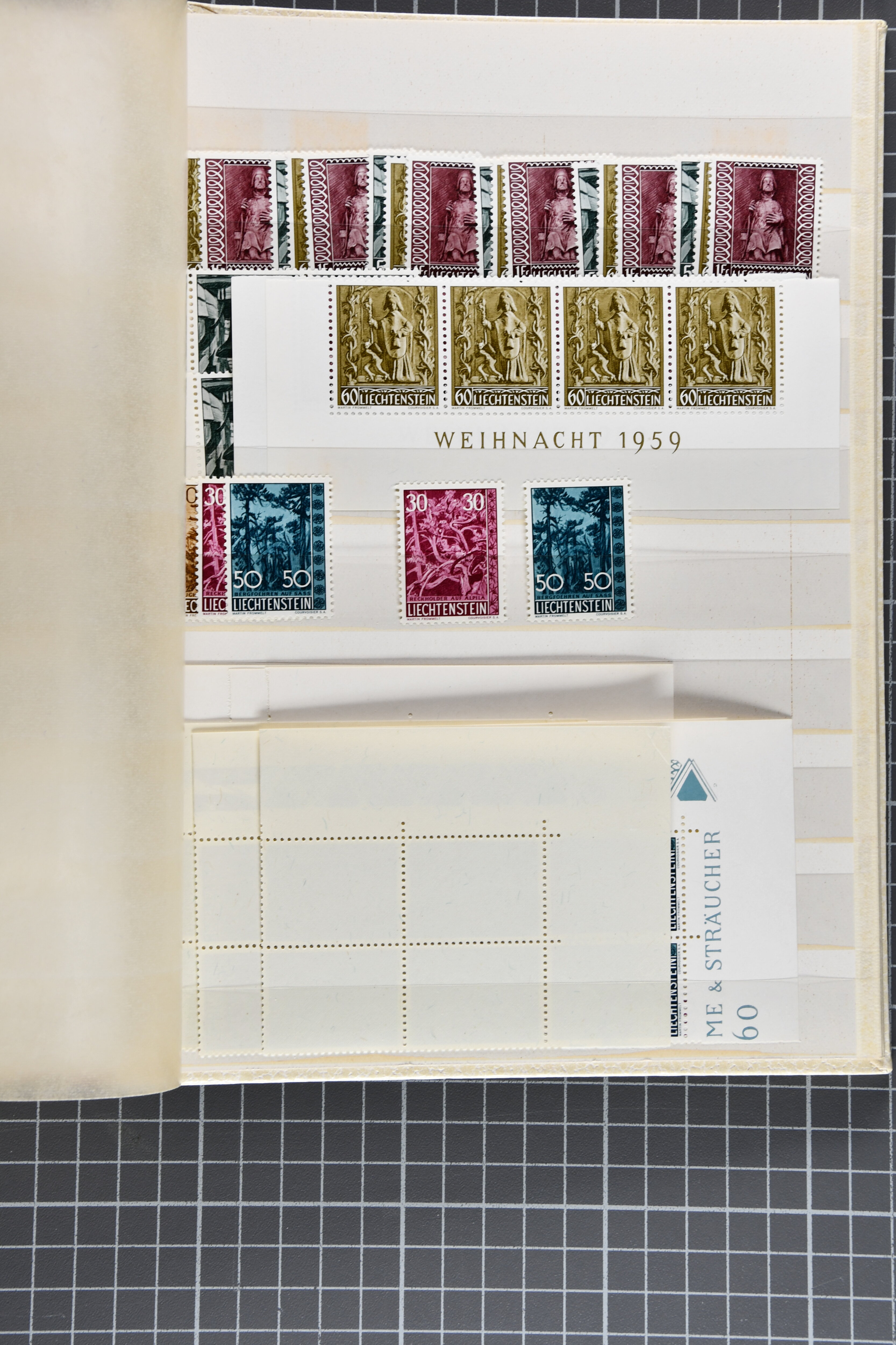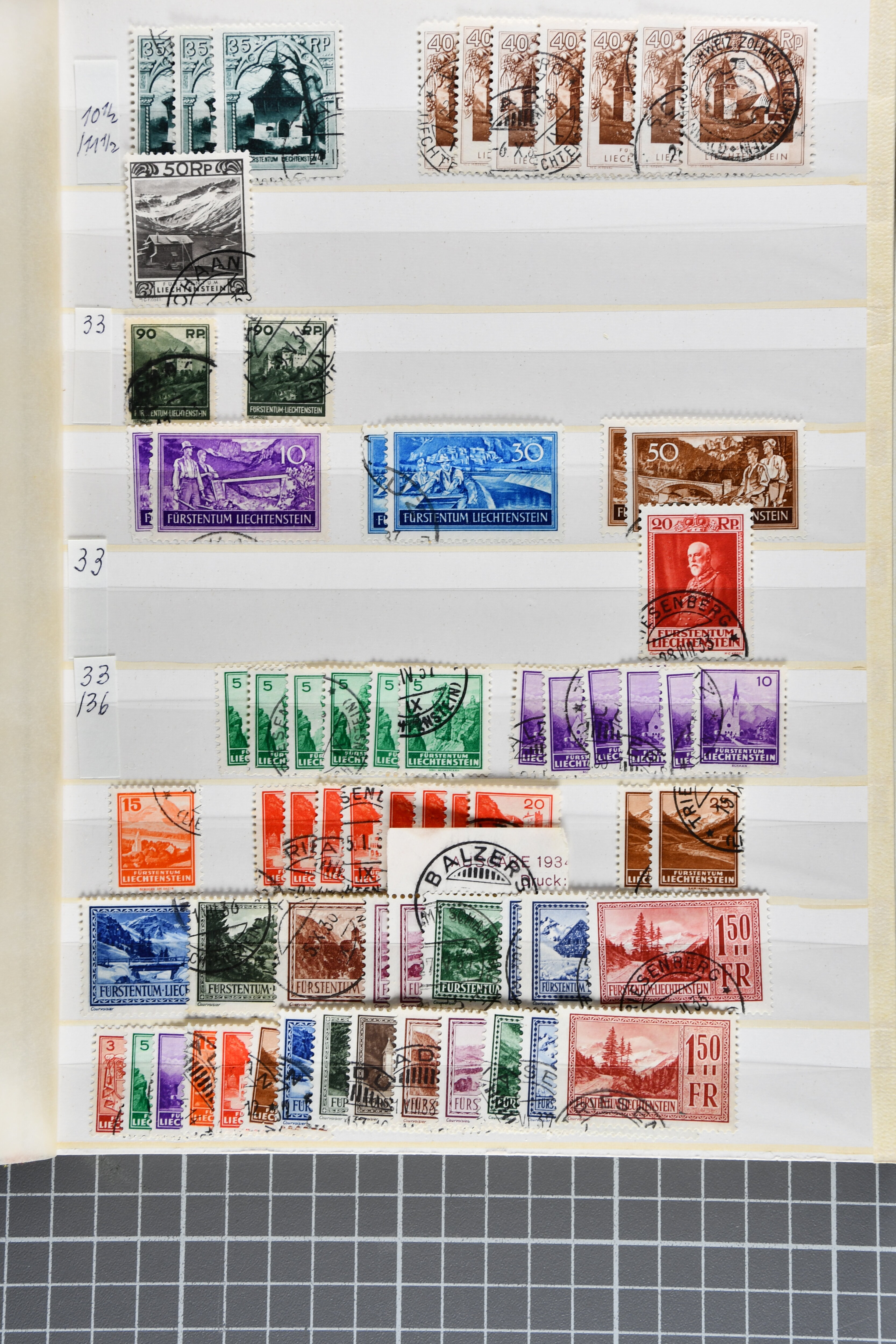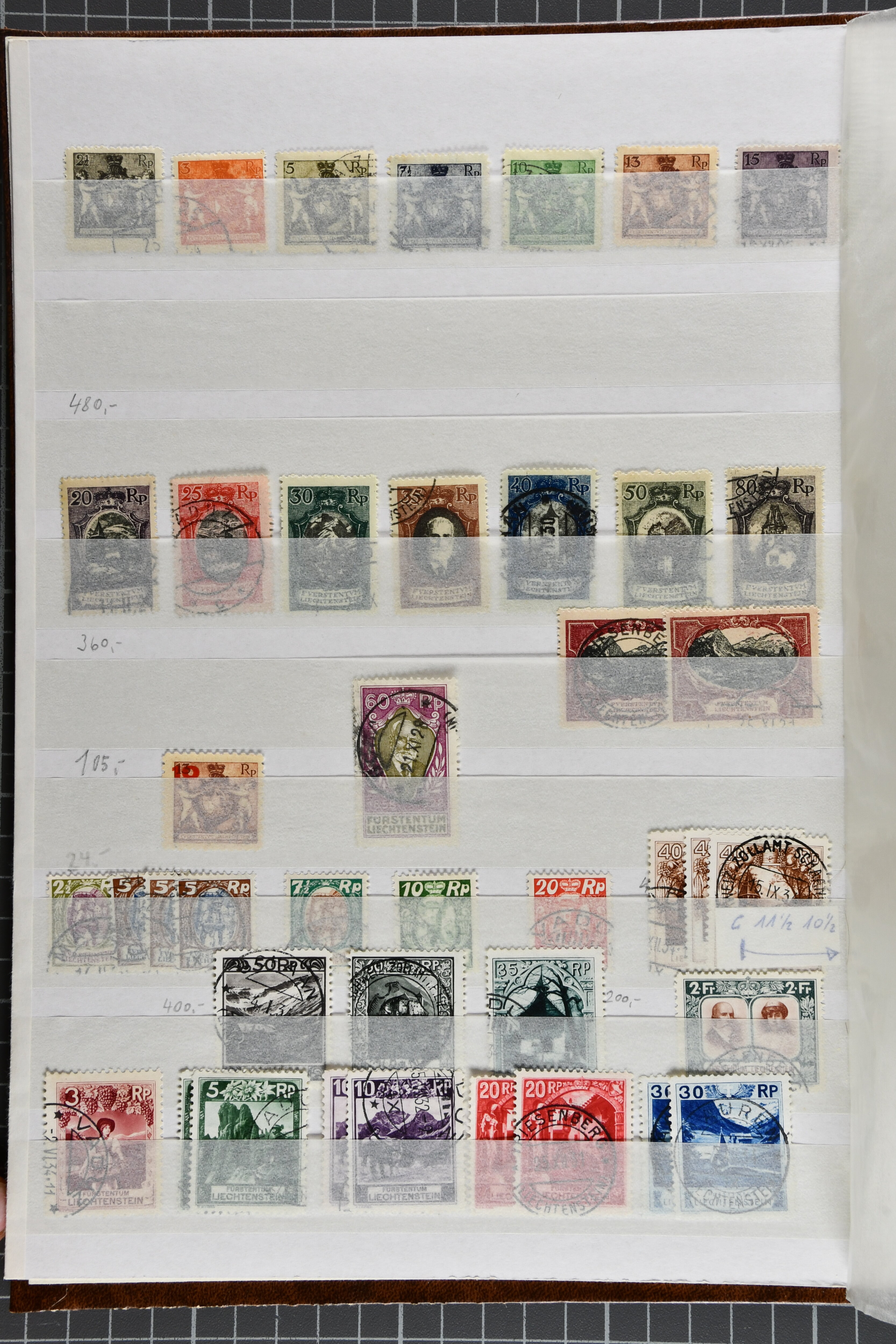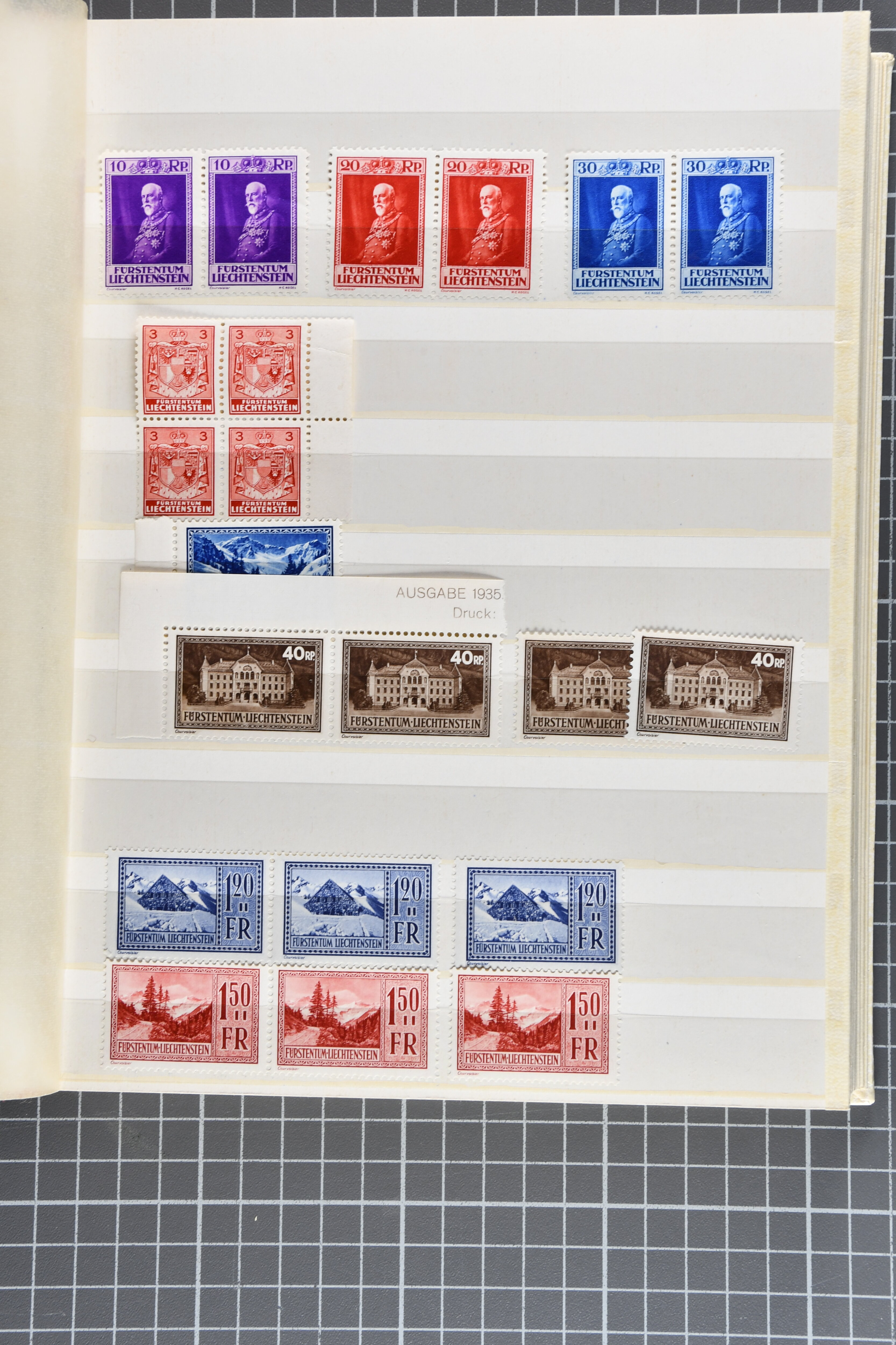 9434 image1908/65 (ca.): Kleines aber reichhaltiges Händlerlager postfr./ungebr., gest. und im Viererblock auf Steckkarten mit zahlreichen mittleren und besseren Marken und Sätzen. Dabei 1912 "Fürst Johann II", 5-25 H. auf Kreidepapier (LBK 1x-3x), zwei kompl. postfr. Sätze, 1928 "Rheinnot" ungezähnt in leicht abweichenden Farben (Mi.-Nr. 78-81U), postfr., 1921 Freimarken 20 Rp. "St. Mammertus-Kappelle" (LBK 53A) und 1 Fr. "Rheintal bei Vaduz" (LBK 53B), beide postfr., 1935 Flugpost "Adler", 10-30 Rp. (LBK F9y-F12y) im Viererblock, sauber und zentr. gest. "TRIESENBERG 4.VI.35", 1941 "Madonna von Dux" (LBK 150) postfr. (3) und im gest. Kleinbogen oder 1948/50 "Flugpioniere" postfr. und im gest. Viererblock. Gute Erhaltung. LBK=CHF 9'500+. (Image 1) (Image 2) (Image 3)