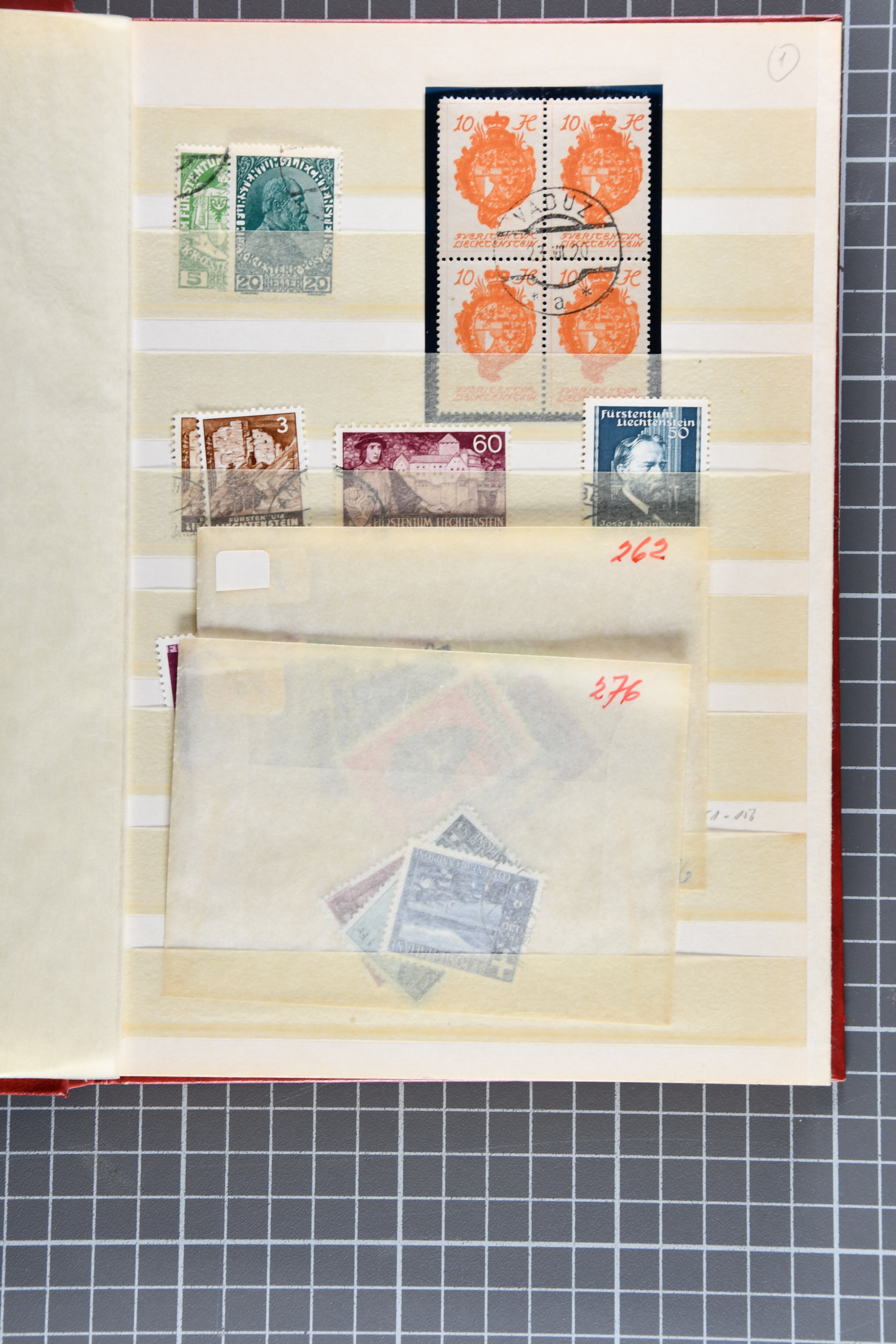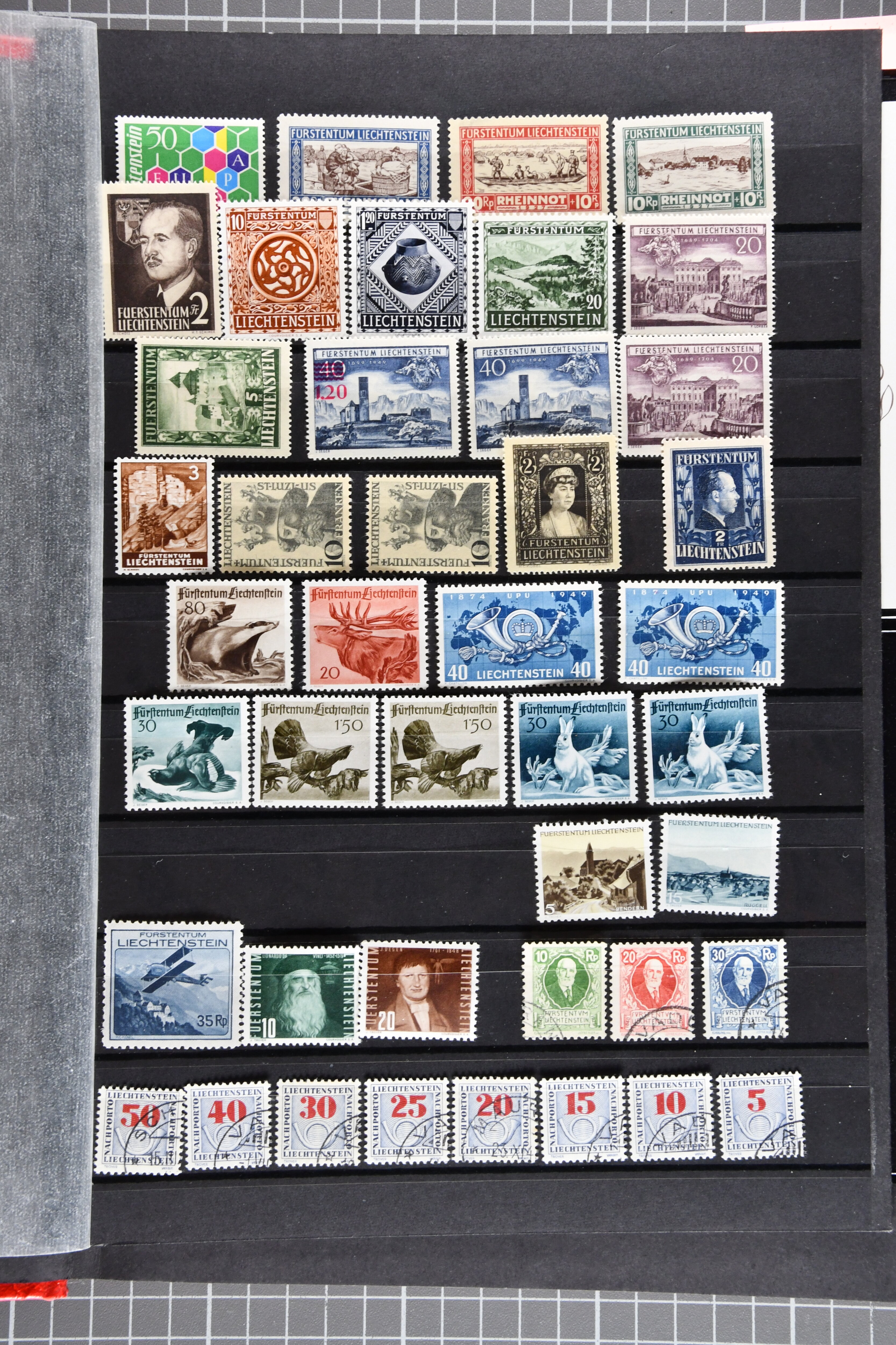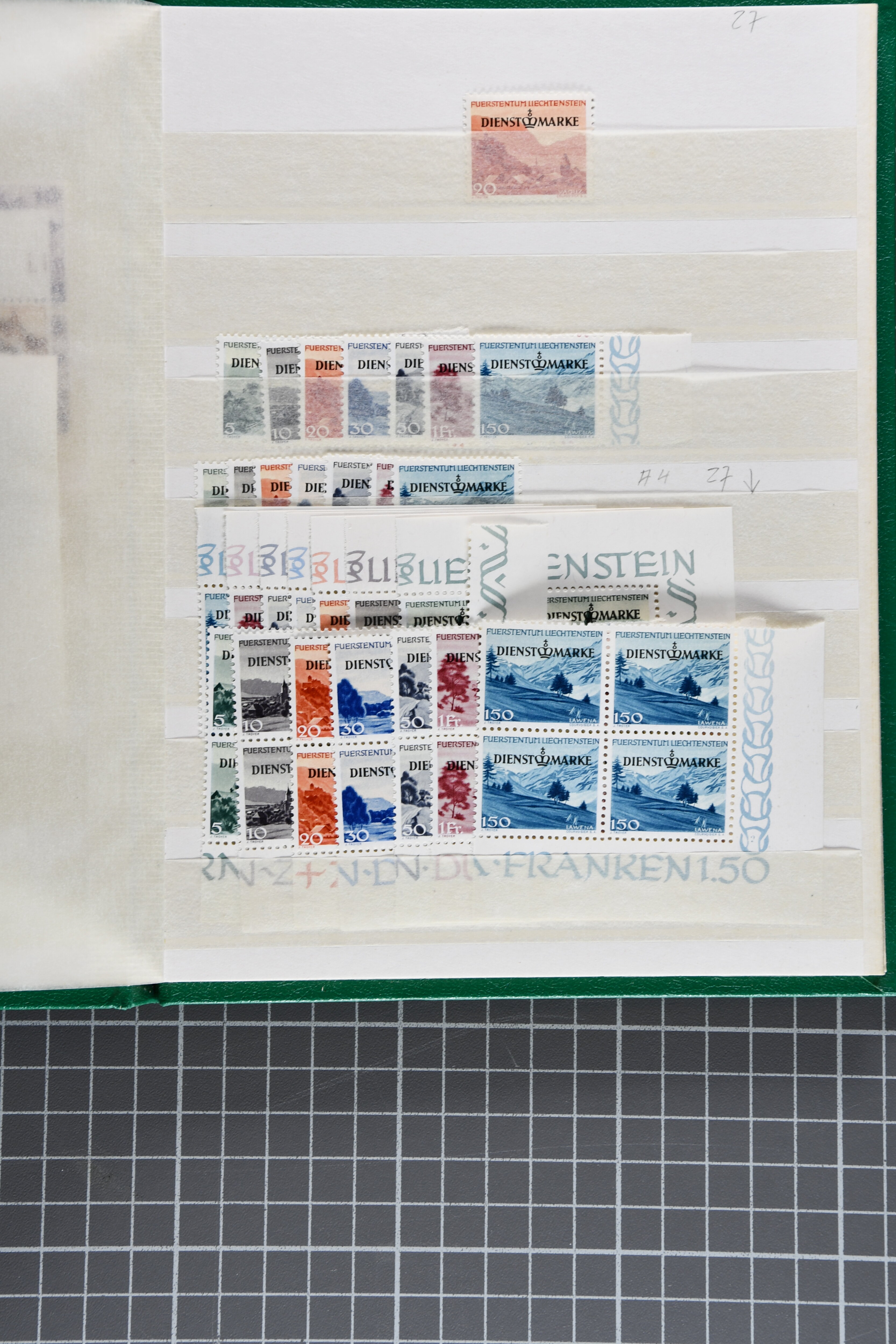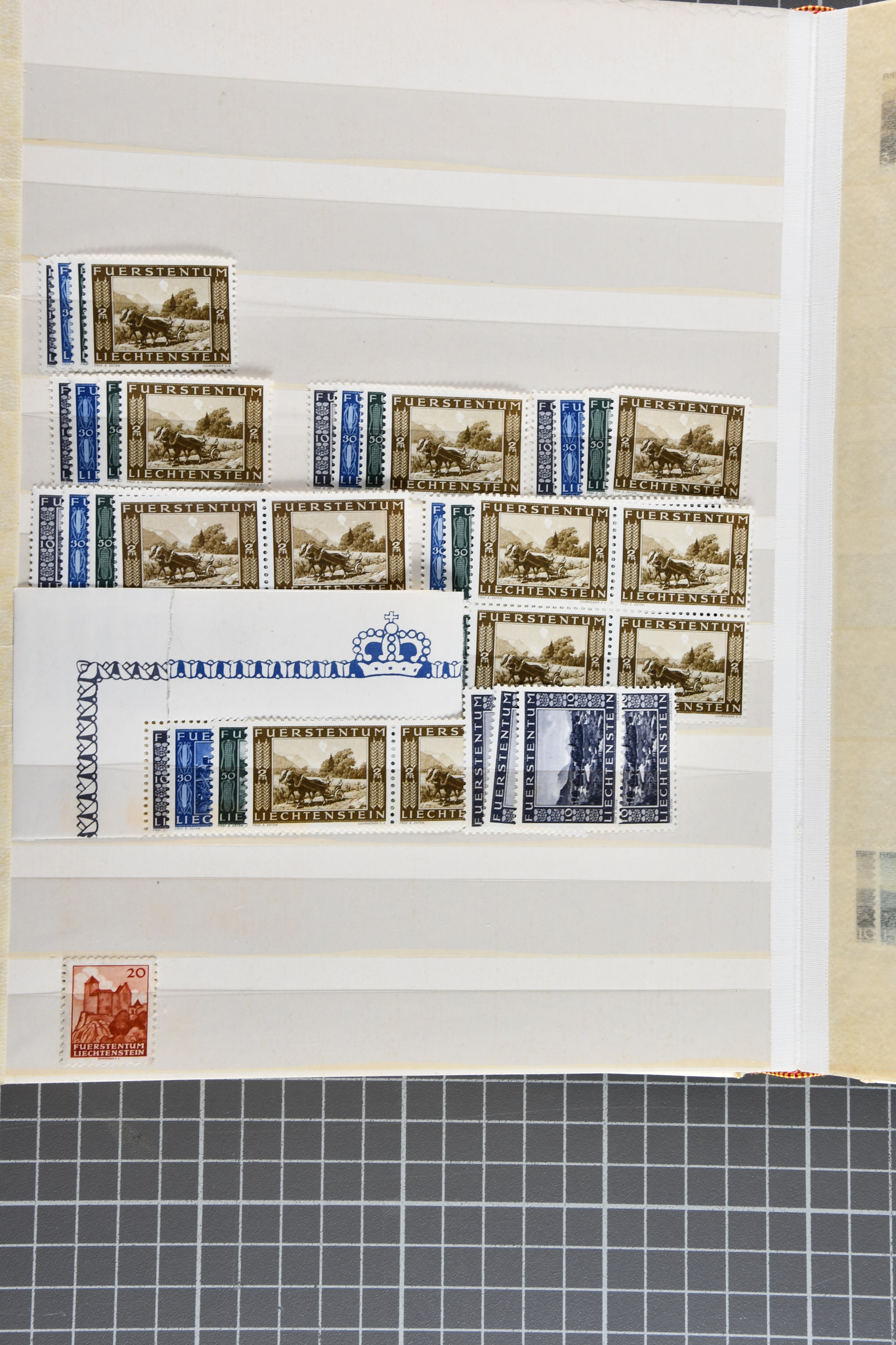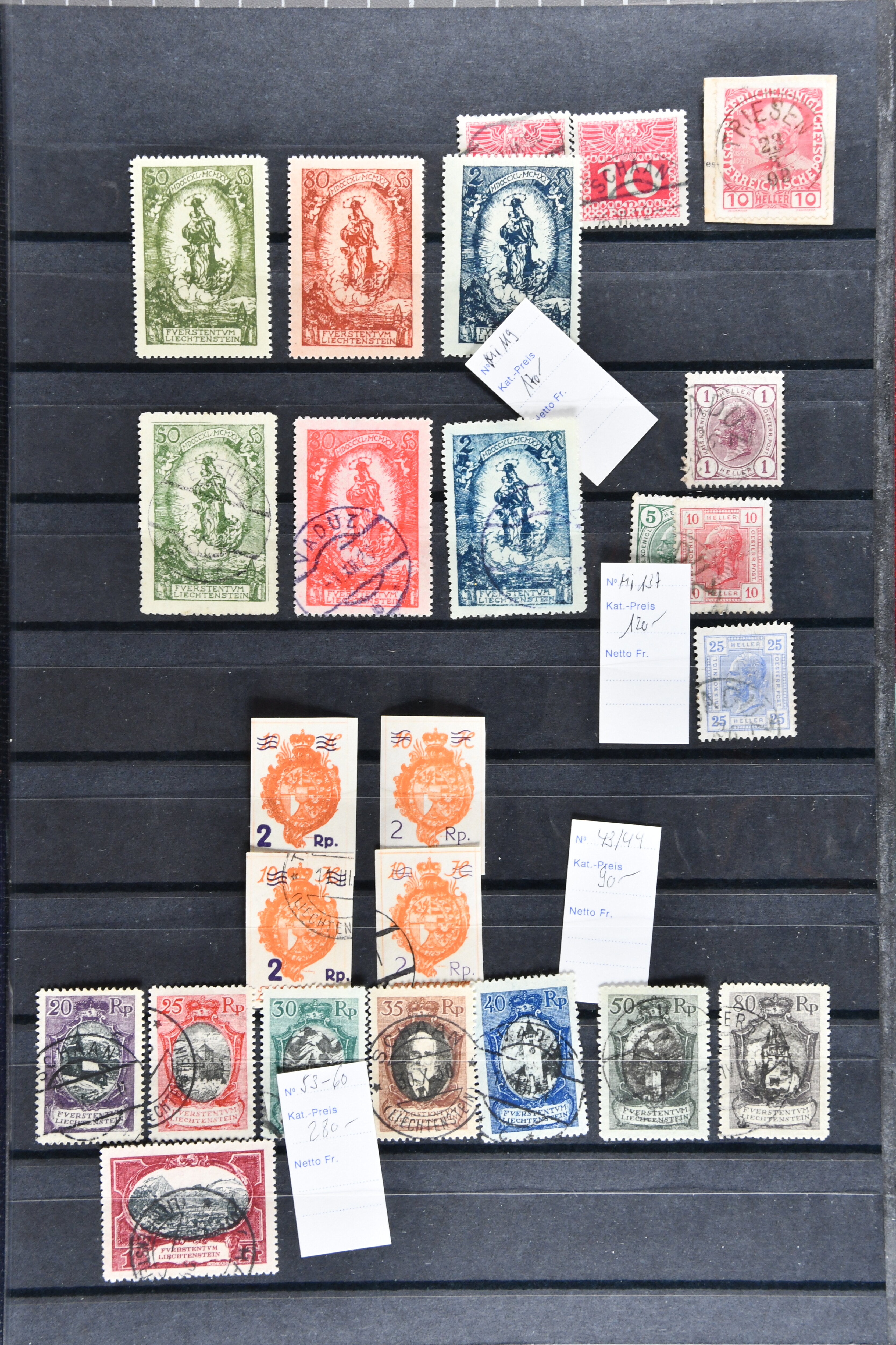 9434 image1908/65 (ca.): Kleines aber reichhaltiges Händlerlager postfr./ungebr., gest. und im Viererblock auf Steckkarten mit zahlreichen mittleren und besseren Marken und Sätzen. Dabei 1912 "Fürst Johann II", 5-25 H. auf Kreidepapier (LBK 1x-3x), zwei kompl. postfr. Sätze, 1928 "Rheinnot" ungezähnt in leicht abweichenden Farben (Mi.-Nr. 78-81U), postfr., 1921 Freimarken 20 Rp. "St. Mammertus-Kappelle" (LBK 53A) und 1 Fr. "Rheintal bei Vaduz" (LBK 53B), beide postfr., 1935 Flugpost "Adler", 10-30 Rp. (LBK F9y-F12y) im Viererblock, sauber und zentr. gest. "TRIESENBERG 4.VI.35", 1941 "Madonna von Dux" (LBK 150) postfr. (3) und im gest. Kleinbogen oder 1948/50 "Flugpioniere" postfr. und im gest. Viererblock. Gute Erhaltung. LBK=CHF 9'500+. (Image 1) (Image 2) (Image 3)