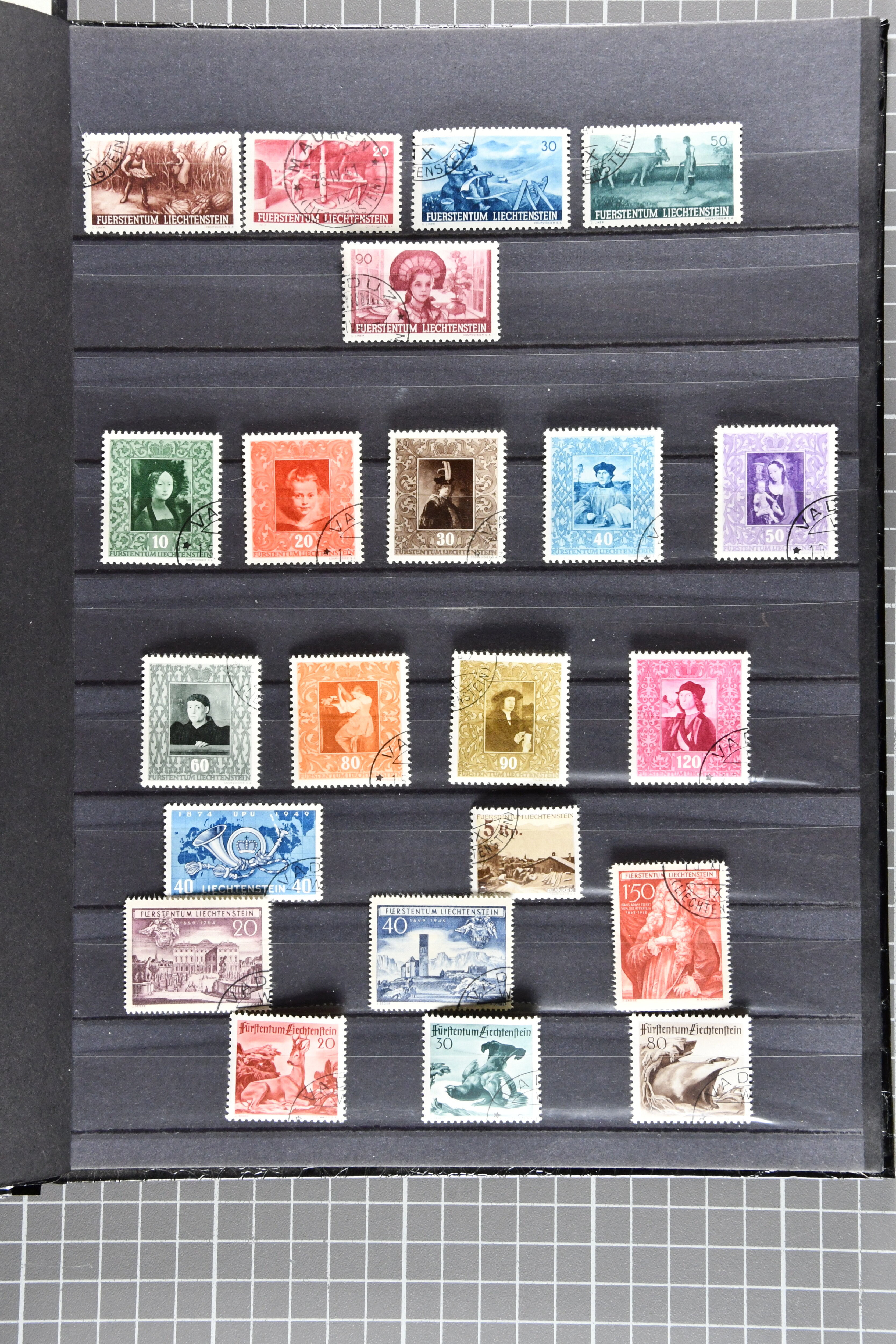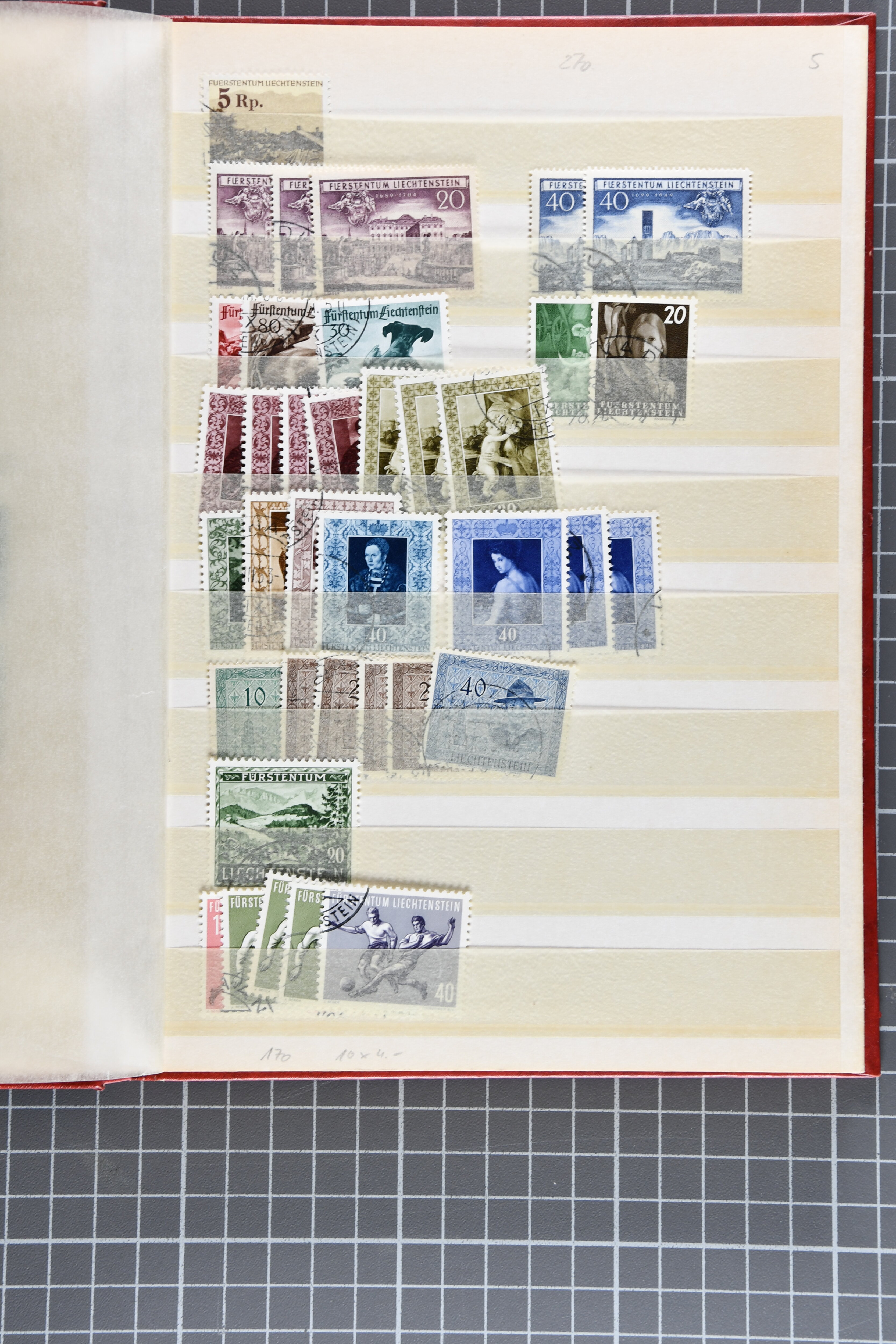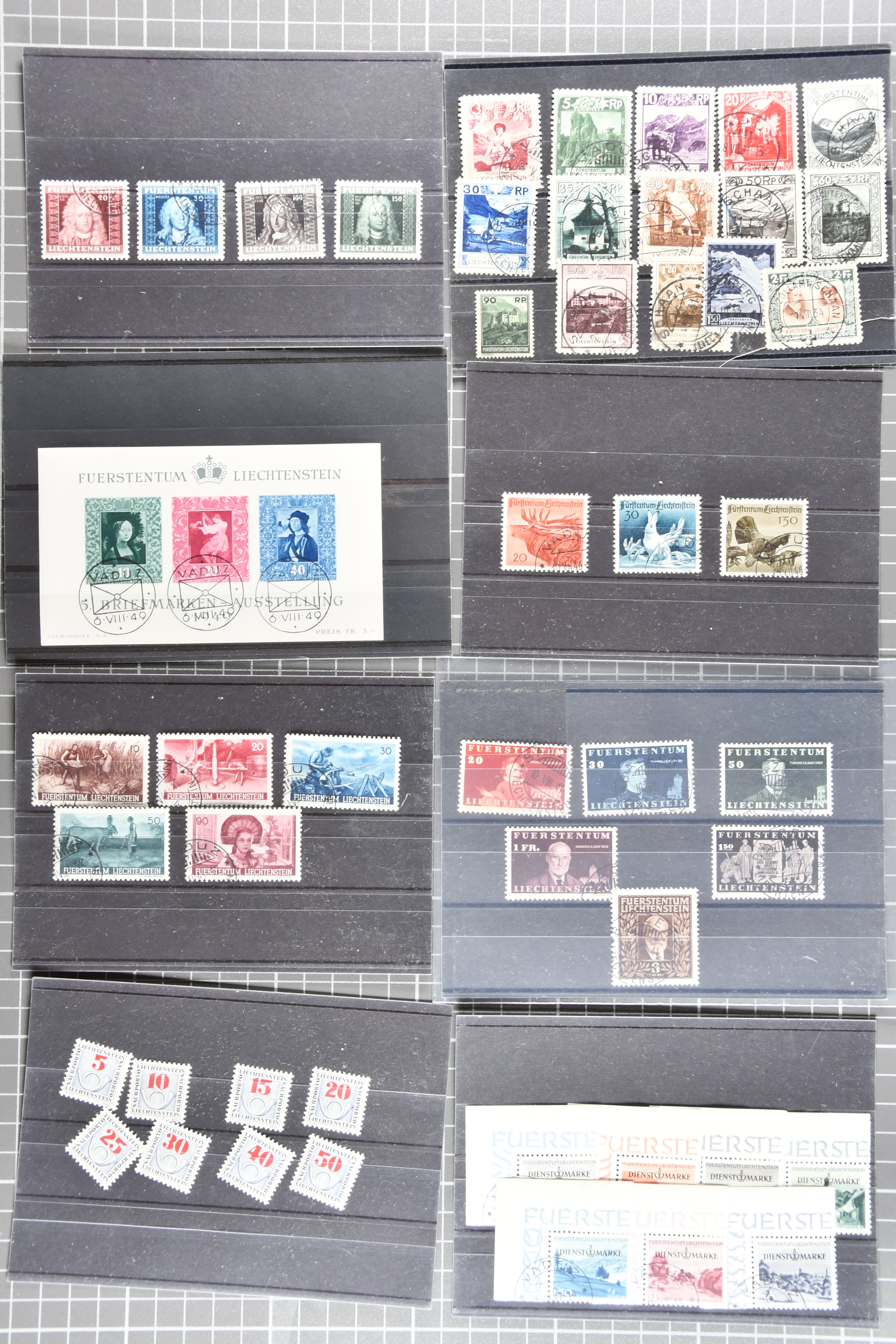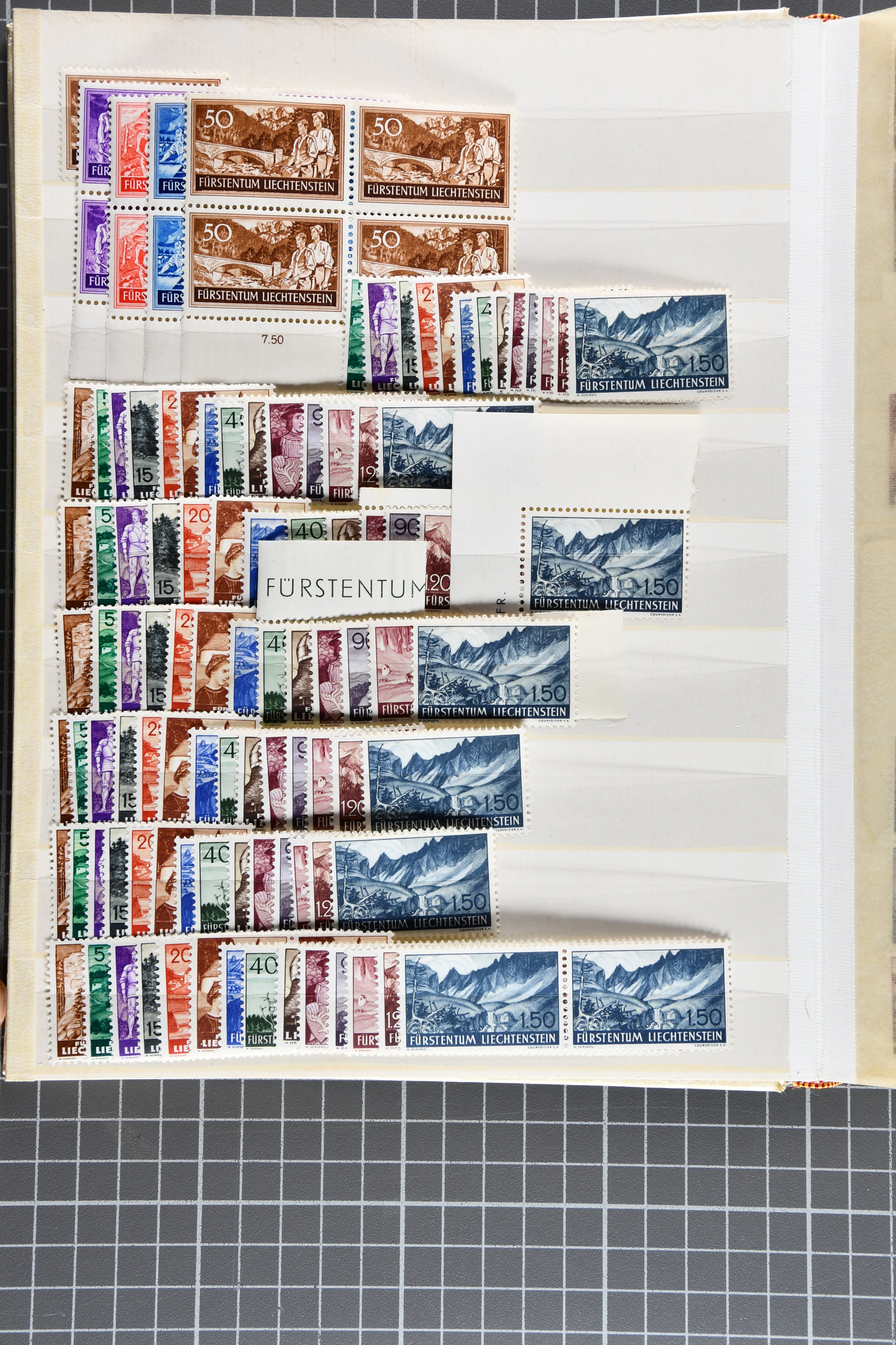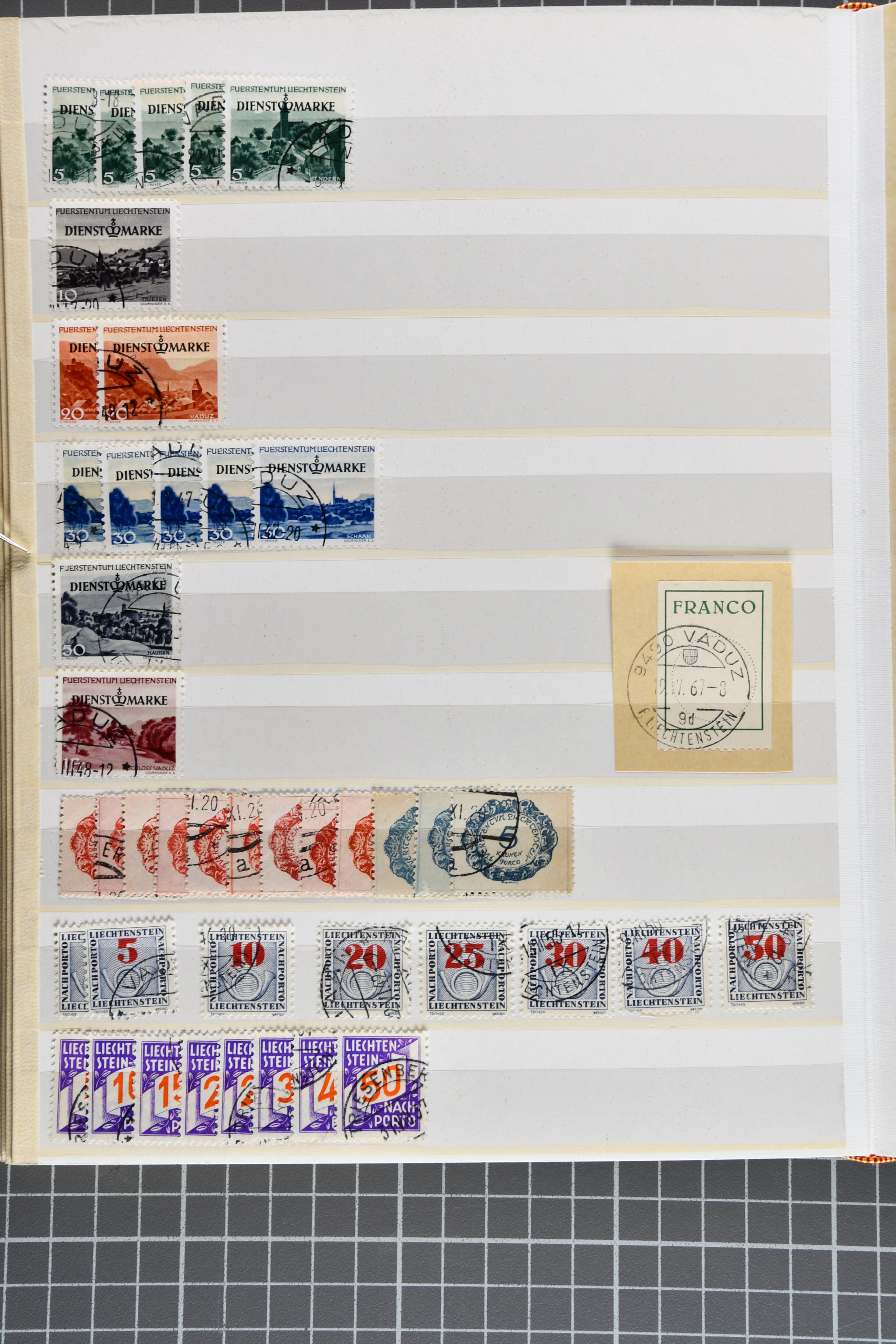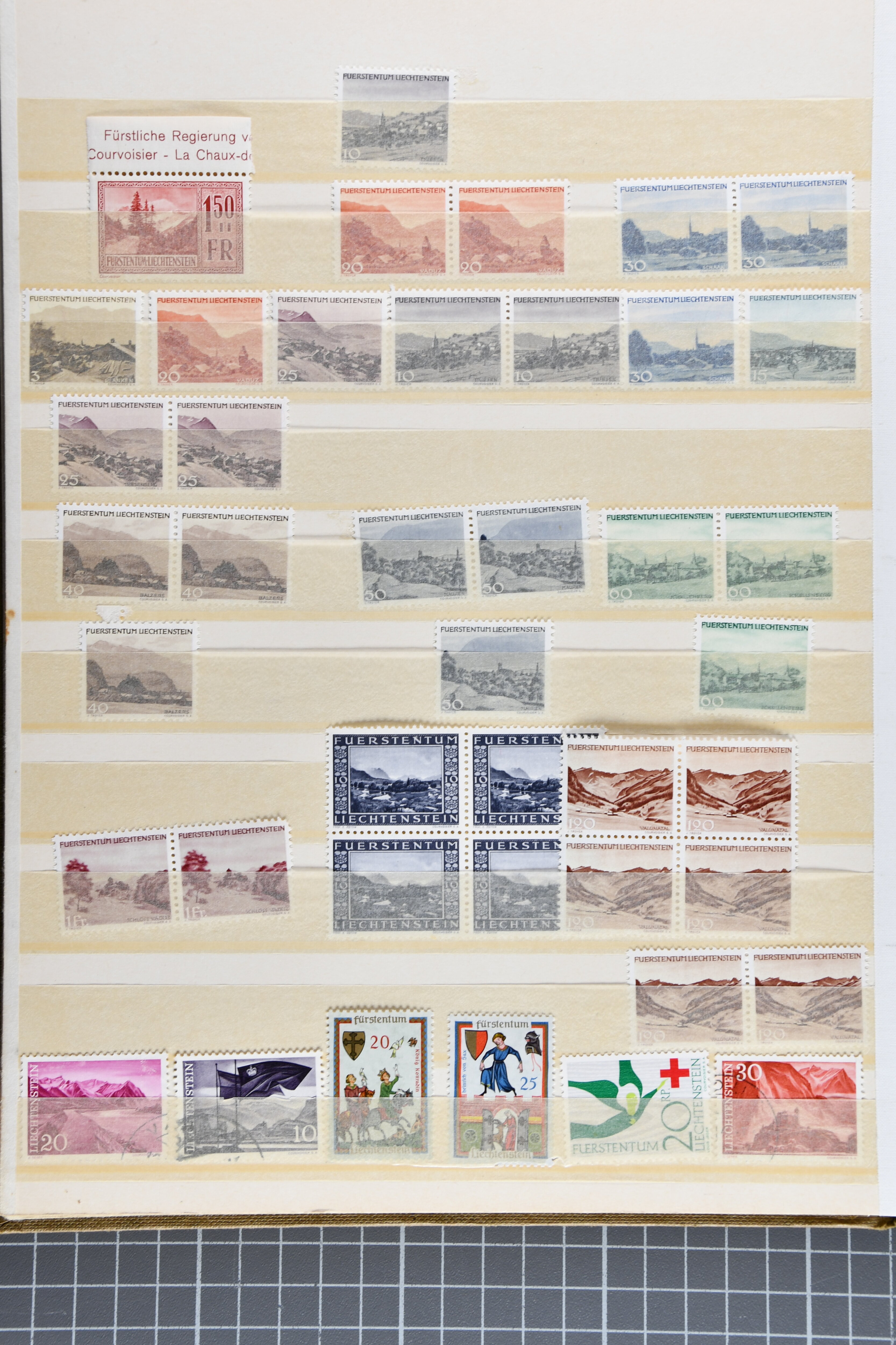 9434 image1908/65 (ca.): Kleines aber reichhaltiges Händlerlager postfr./ungebr., gest. und im Viererblock auf Steckkarten mit zahlreichen mittleren und besseren Marken und Sätzen. Dabei 1912 "Fürst Johann II", 5-25 H. auf Kreidepapier (LBK 1x-3x), zwei kompl. postfr. Sätze, 1928 "Rheinnot" ungezähnt in leicht abweichenden Farben (Mi.-Nr. 78-81U), postfr., 1921 Freimarken 20 Rp. "St. Mammertus-Kappelle" (LBK 53A) und 1 Fr. "Rheintal bei Vaduz" (LBK 53B), beide postfr., 1935 Flugpost "Adler", 10-30 Rp. (LBK F9y-F12y) im Viererblock, sauber und zentr. gest. "TRIESENBERG 4.VI.35", 1941 "Madonna von Dux" (LBK 150) postfr. (3) und im gest. Kleinbogen oder 1948/50 "Flugpioniere" postfr. und im gest. Viererblock. Gute Erhaltung. LBK=CHF 9'500+. (Image 1) (Image 2) (Image 3)