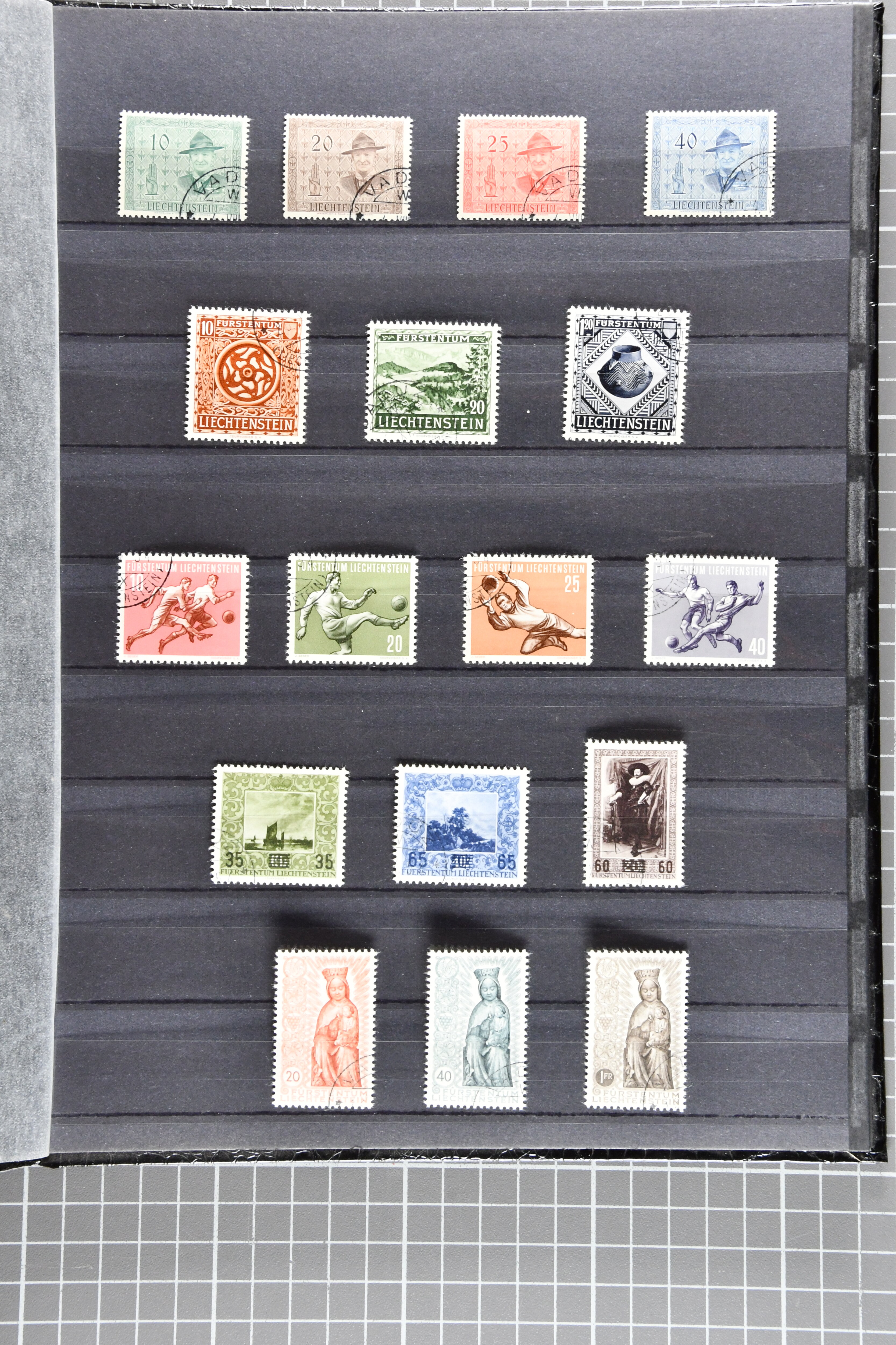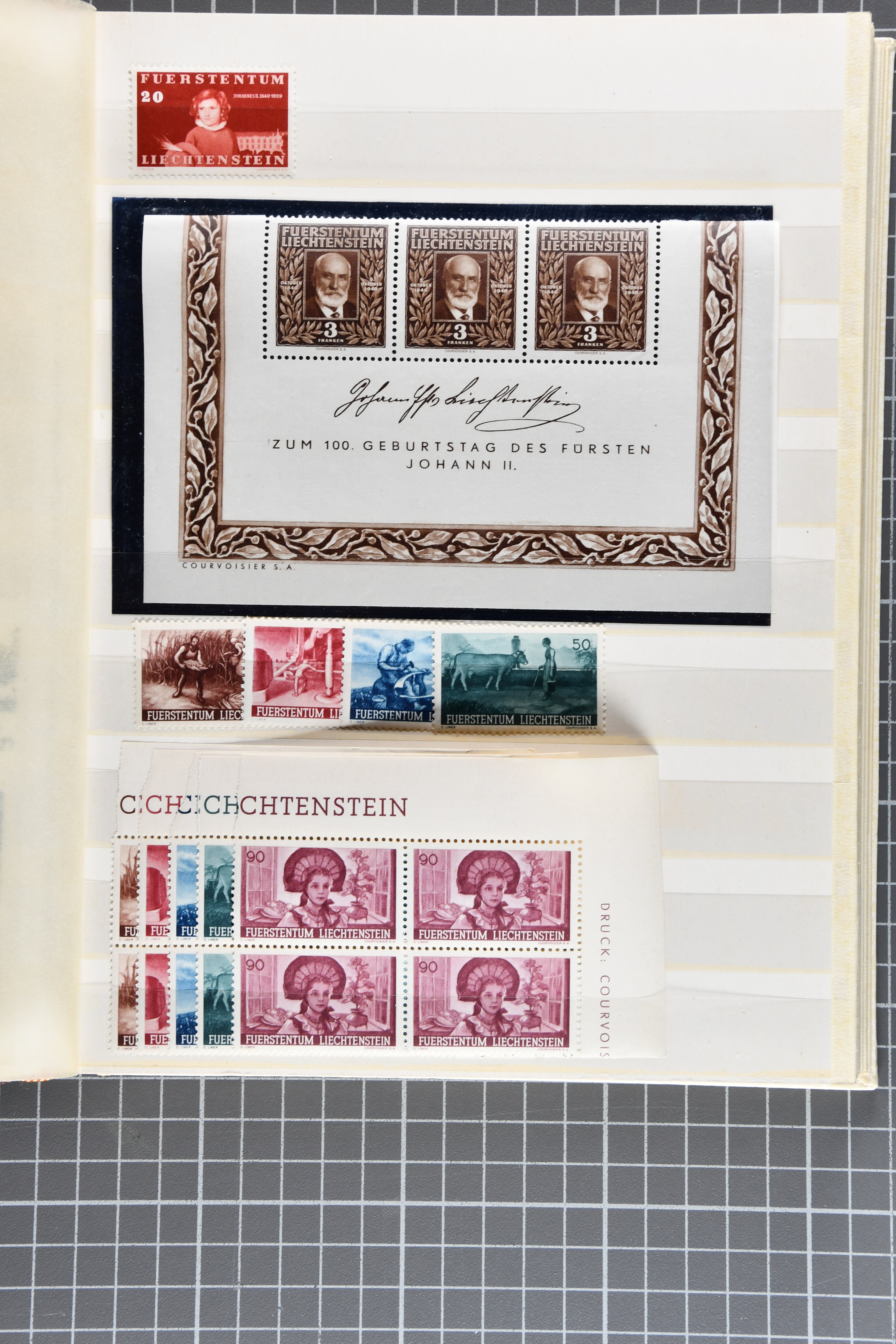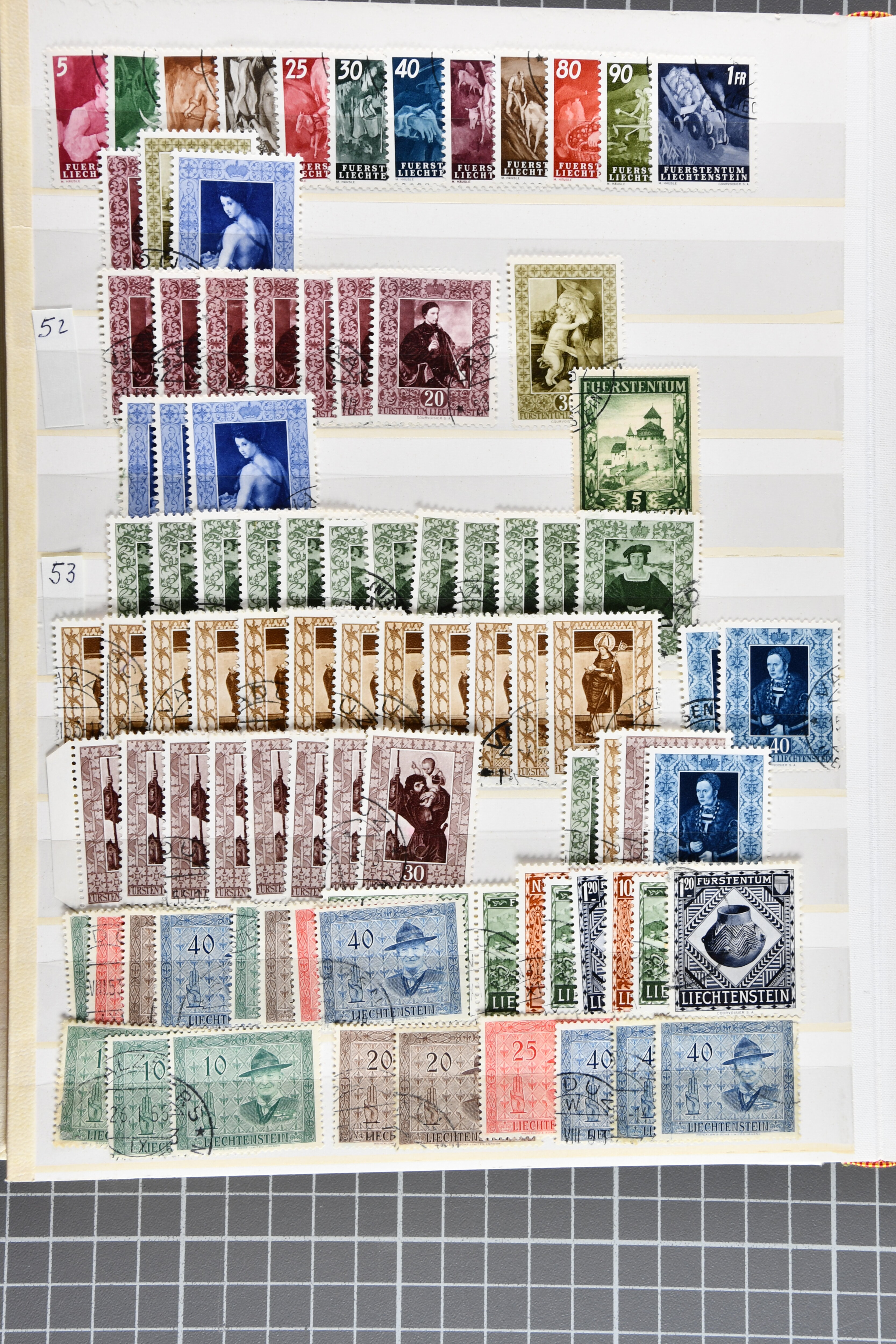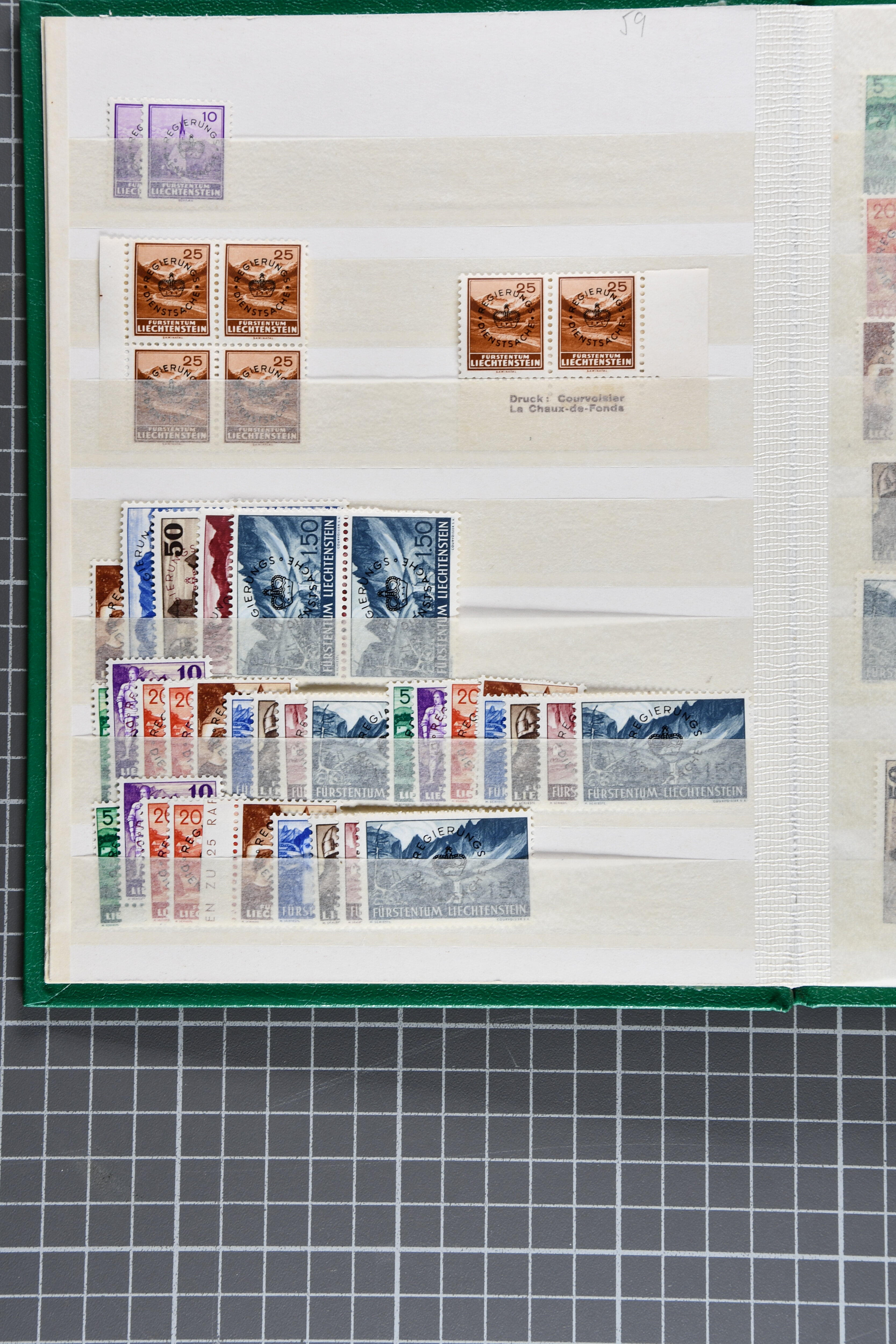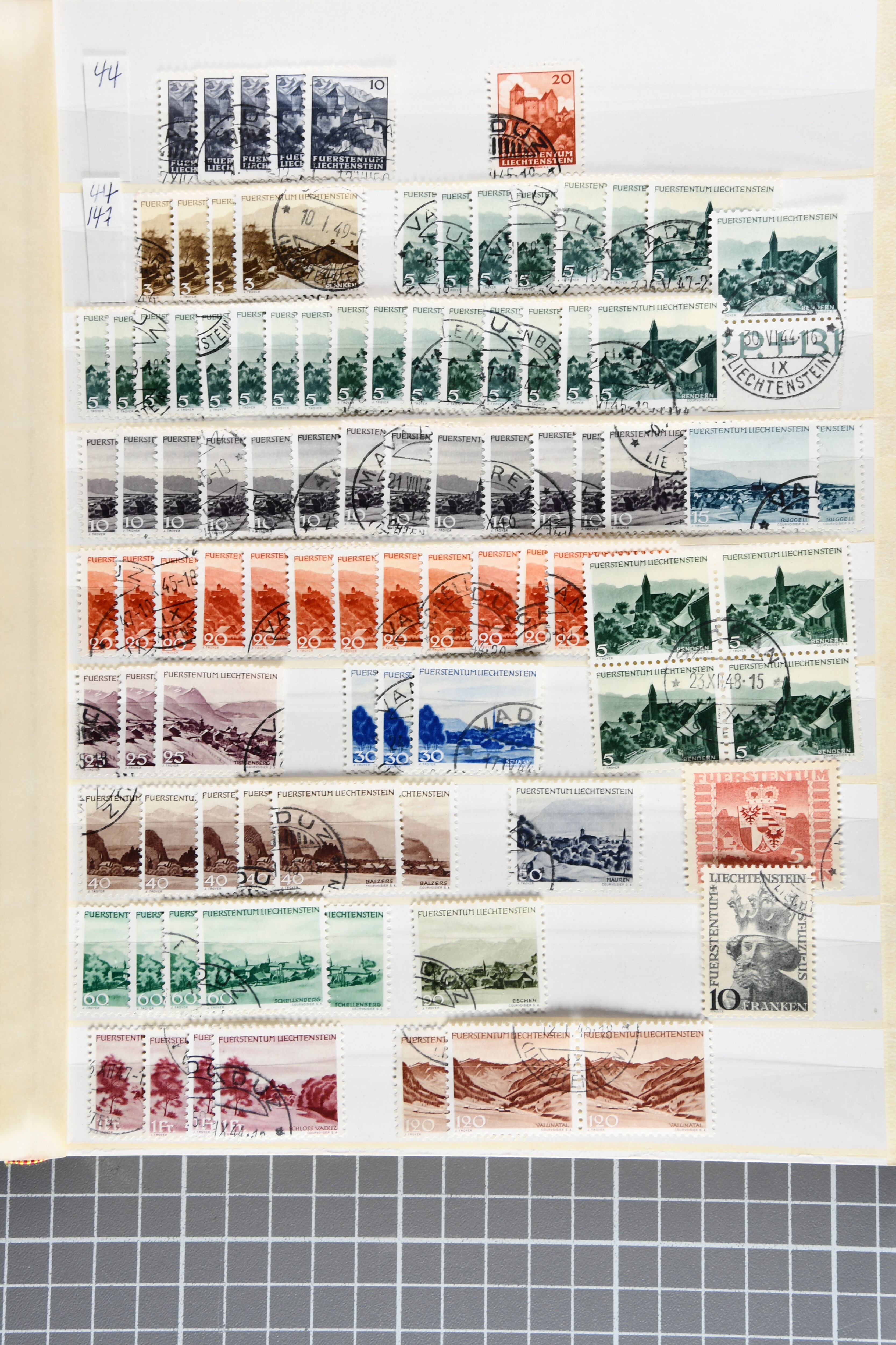 9434 image1908/65 (ca.): Kleines aber reichhaltiges Händlerlager postfr./ungebr., gest. und im Viererblock auf Steckkarten mit zahlreichen mittleren und besseren Marken und Sätzen. Dabei 1912 "Fürst Johann II", 5-25 H. auf Kreidepapier (LBK 1x-3x), zwei kompl. postfr. Sätze, 1928 "Rheinnot" ungezähnt in leicht abweichenden Farben (Mi.-Nr. 78-81U), postfr., 1921 Freimarken 20 Rp. "St. Mammertus-Kappelle" (LBK 53A) und 1 Fr. "Rheintal bei Vaduz" (LBK 53B), beide postfr., 1935 Flugpost "Adler", 10-30 Rp. (LBK F9y-F12y) im Viererblock, sauber und zentr. gest. "TRIESENBERG 4.VI.35", 1941 "Madonna von Dux" (LBK 150) postfr. (3) und im gest. Kleinbogen oder 1948/50 "Flugpioniere" postfr. und im gest. Viererblock. Gute Erhaltung. LBK=CHF 9'500+. (Image 1) (Image 2) (Image 3)