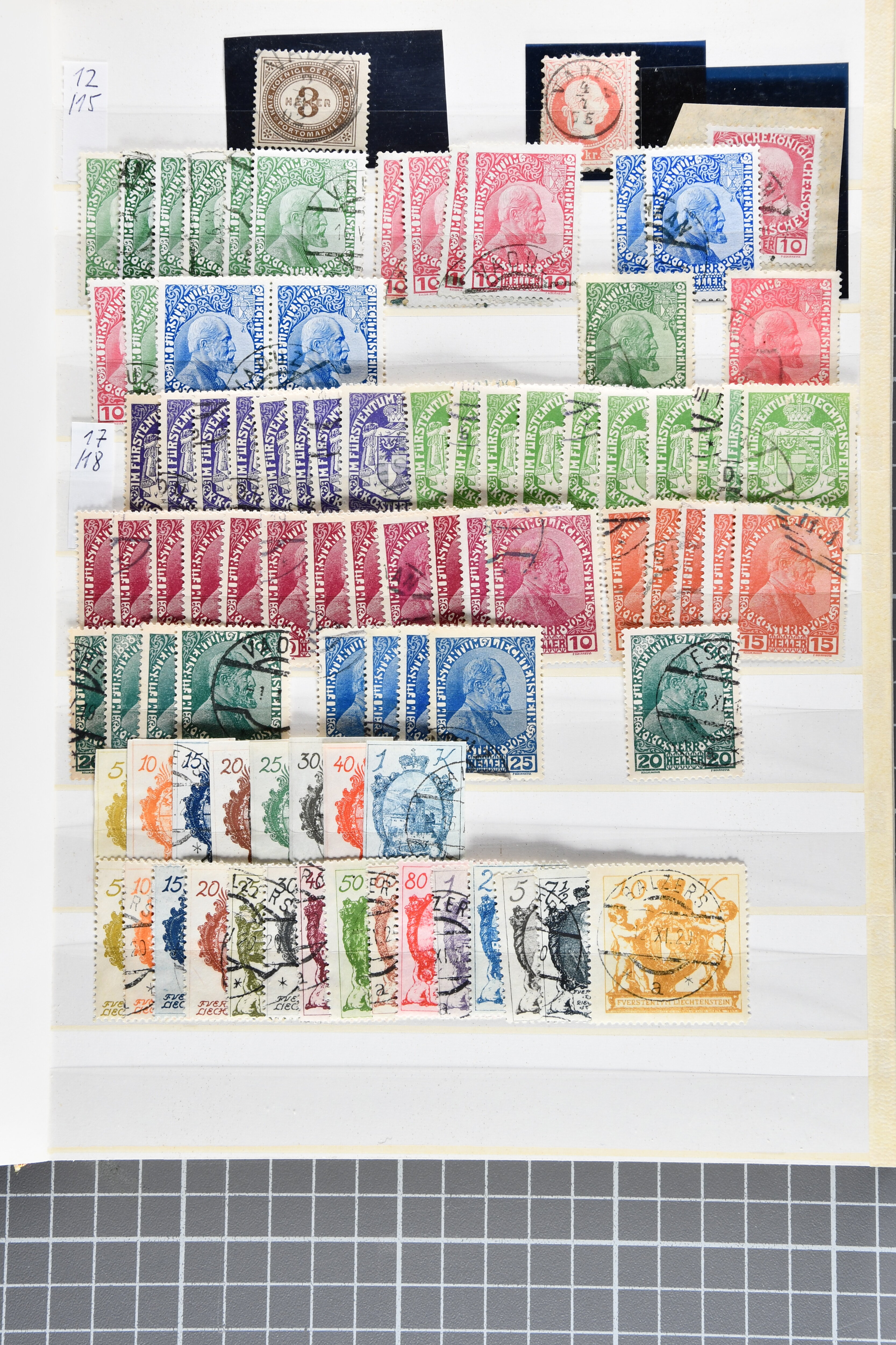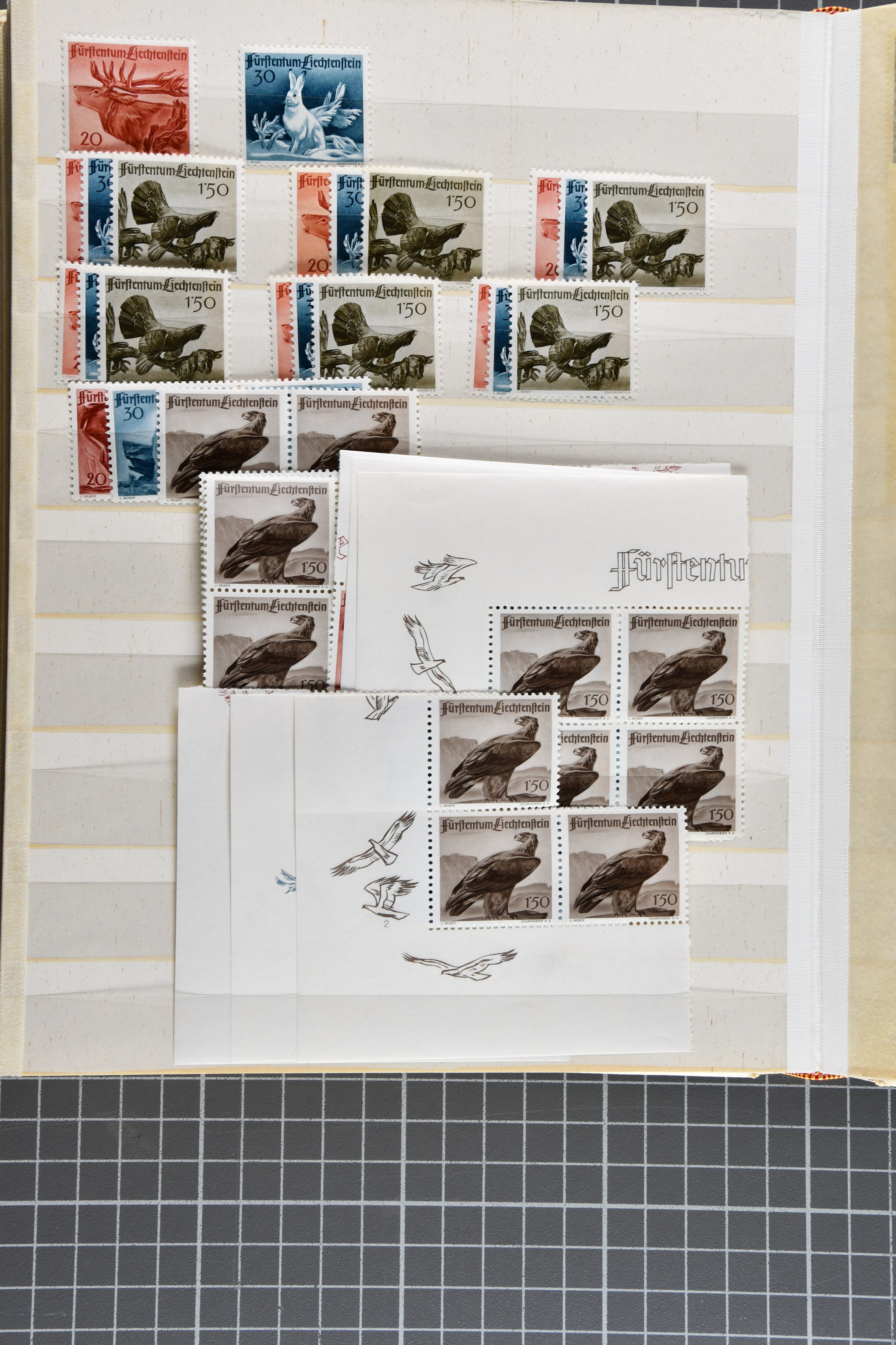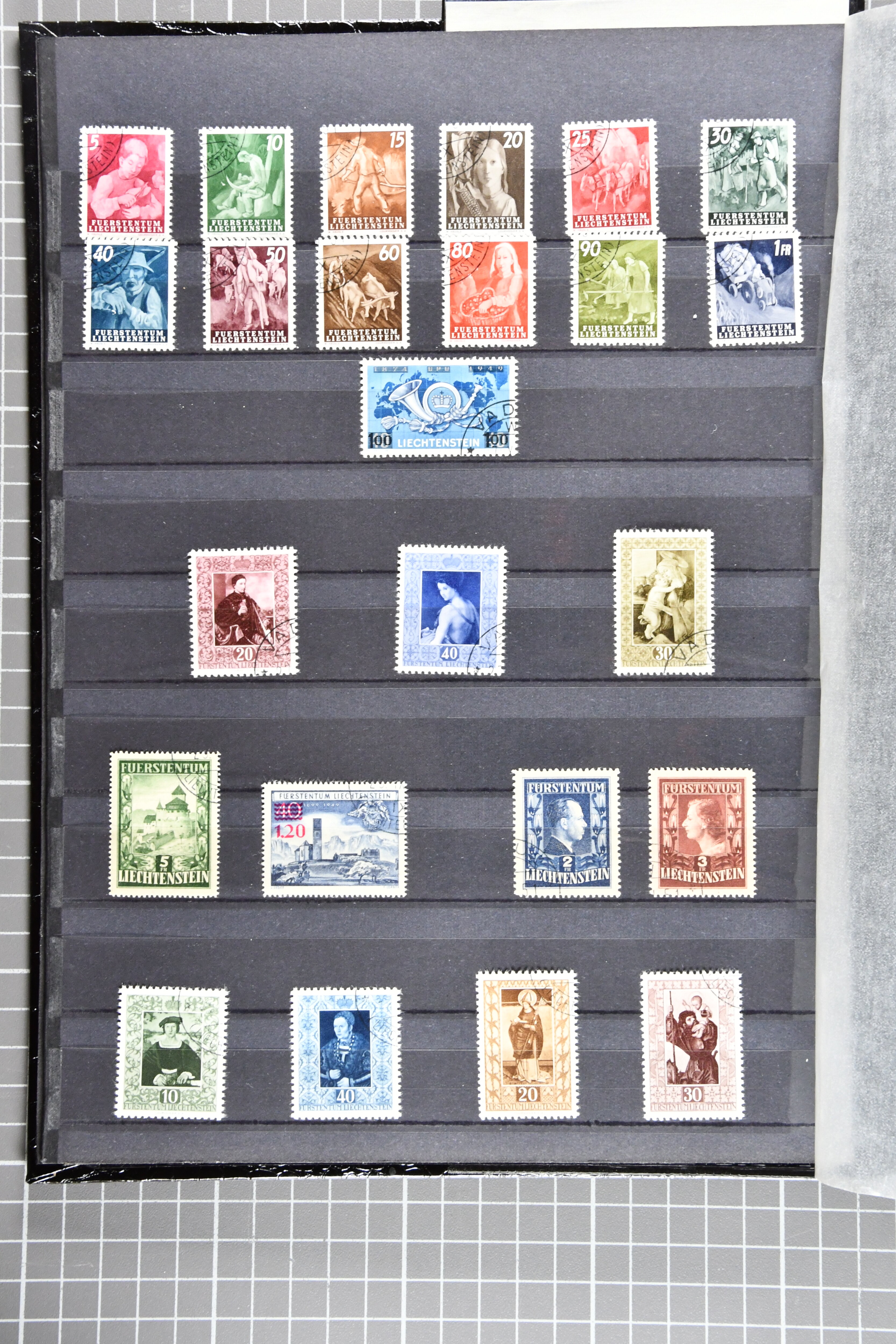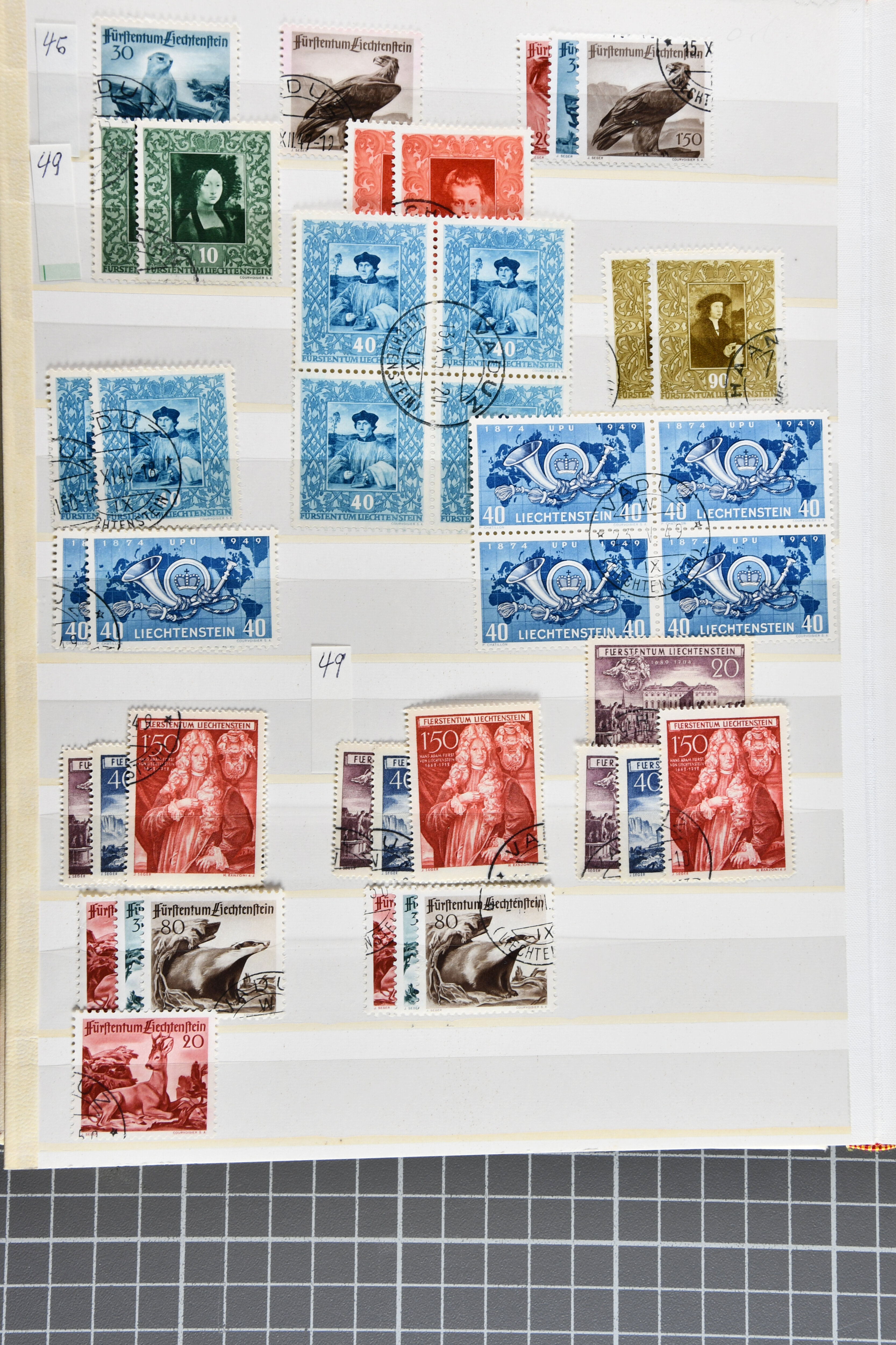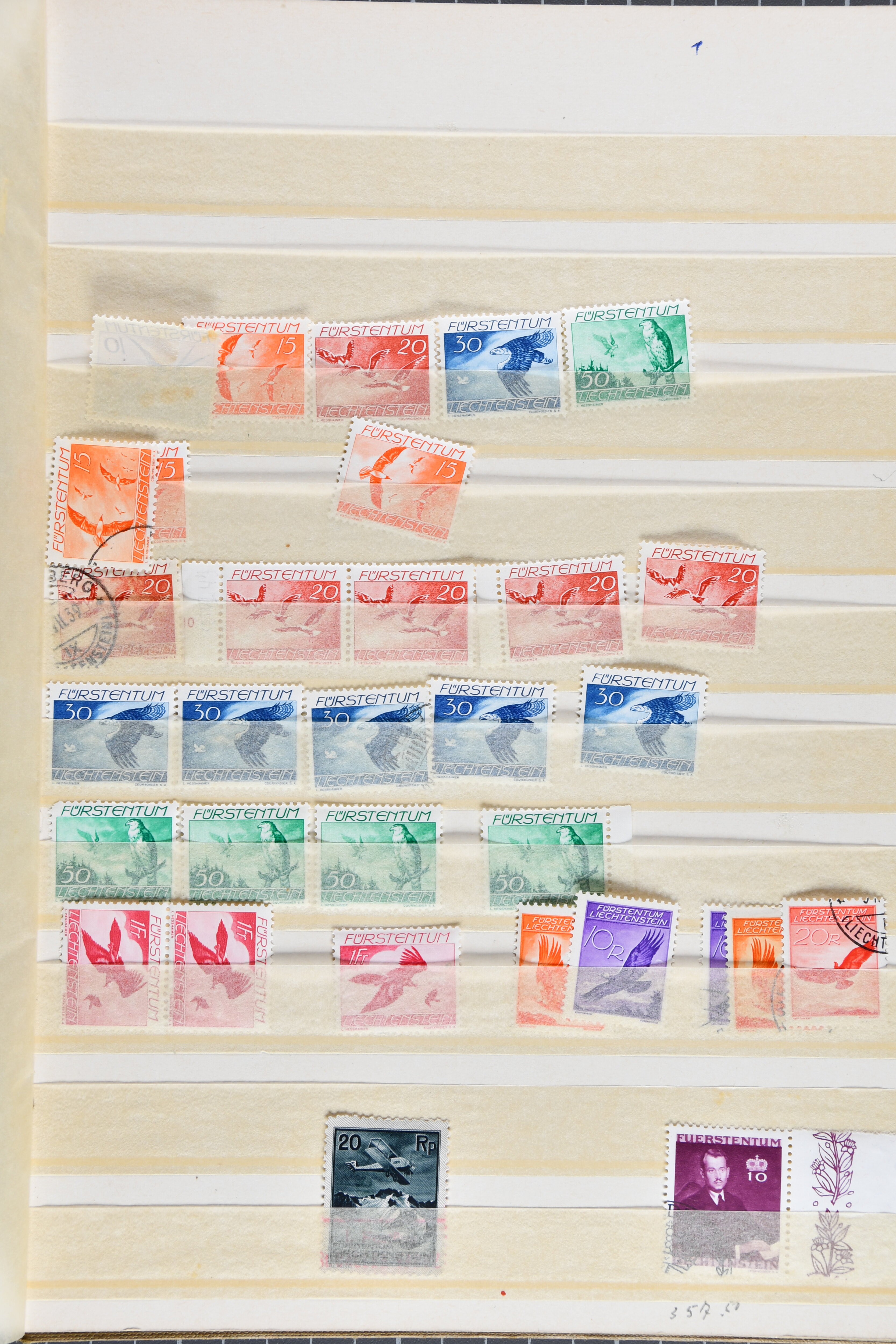 9434 image1908/65 (ca.): Kleines aber reichhaltiges Händlerlager postfr./ungebr., gest. und im Viererblock auf Steckkarten mit zahlreichen mittleren und besseren Marken und Sätzen. Dabei 1912 "Fürst Johann II", 5-25 H. auf Kreidepapier (LBK 1x-3x), zwei kompl. postfr. Sätze, 1928 "Rheinnot" ungezähnt in leicht abweichenden Farben (Mi.-Nr. 78-81U), postfr., 1921 Freimarken 20 Rp. "St. Mammertus-Kappelle" (LBK 53A) und 1 Fr. "Rheintal bei Vaduz" (LBK 53B), beide postfr., 1935 Flugpost "Adler", 10-30 Rp. (LBK F9y-F12y) im Viererblock, sauber und zentr. gest. "TRIESENBERG 4.VI.35", 1941 "Madonna von Dux" (LBK 150) postfr. (3) und im gest. Kleinbogen oder 1948/50 "Flugpioniere" postfr. und im gest. Viererblock. Gute Erhaltung. LBK=CHF 9'500+. (Image 1) (Image 2) (Image 3)