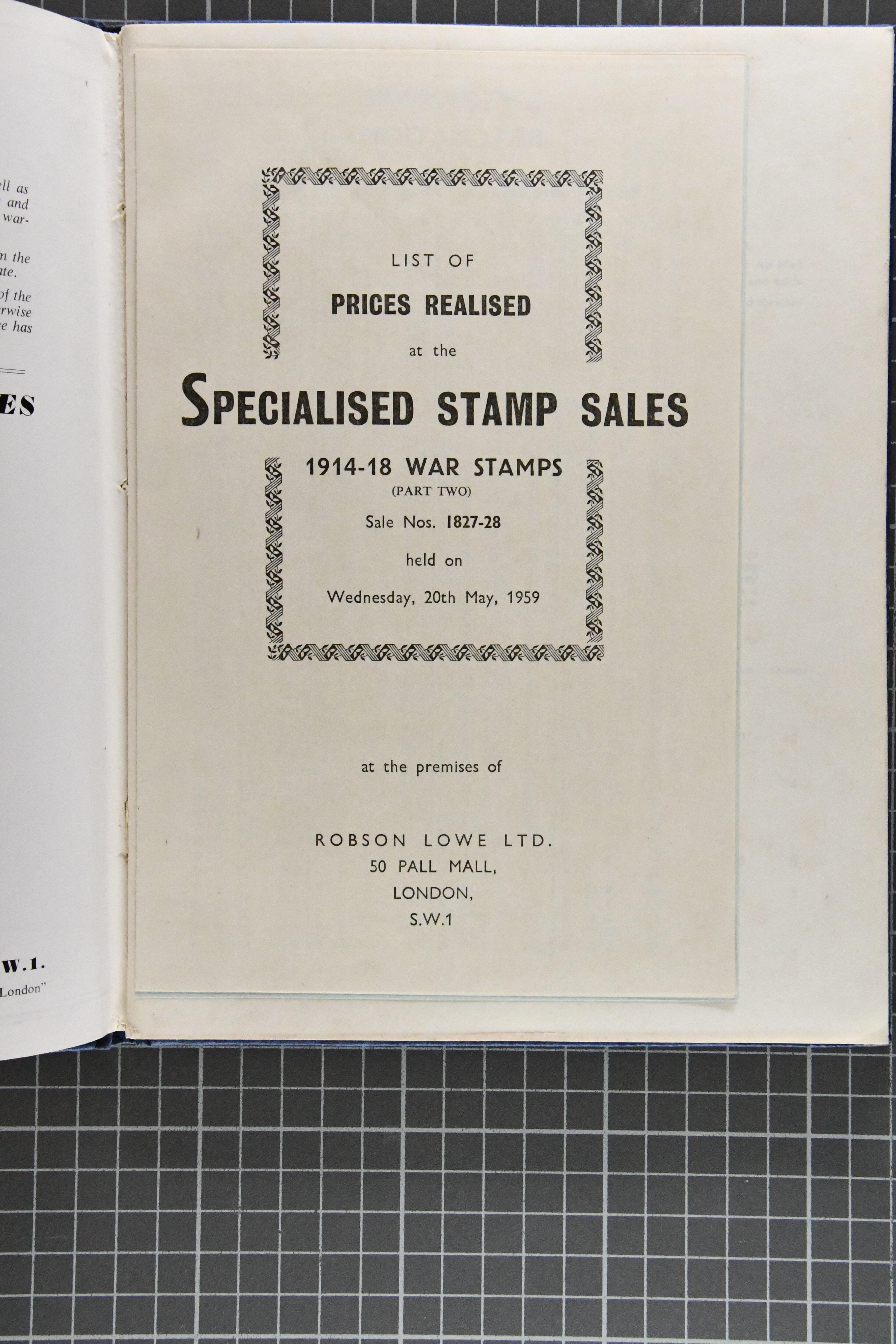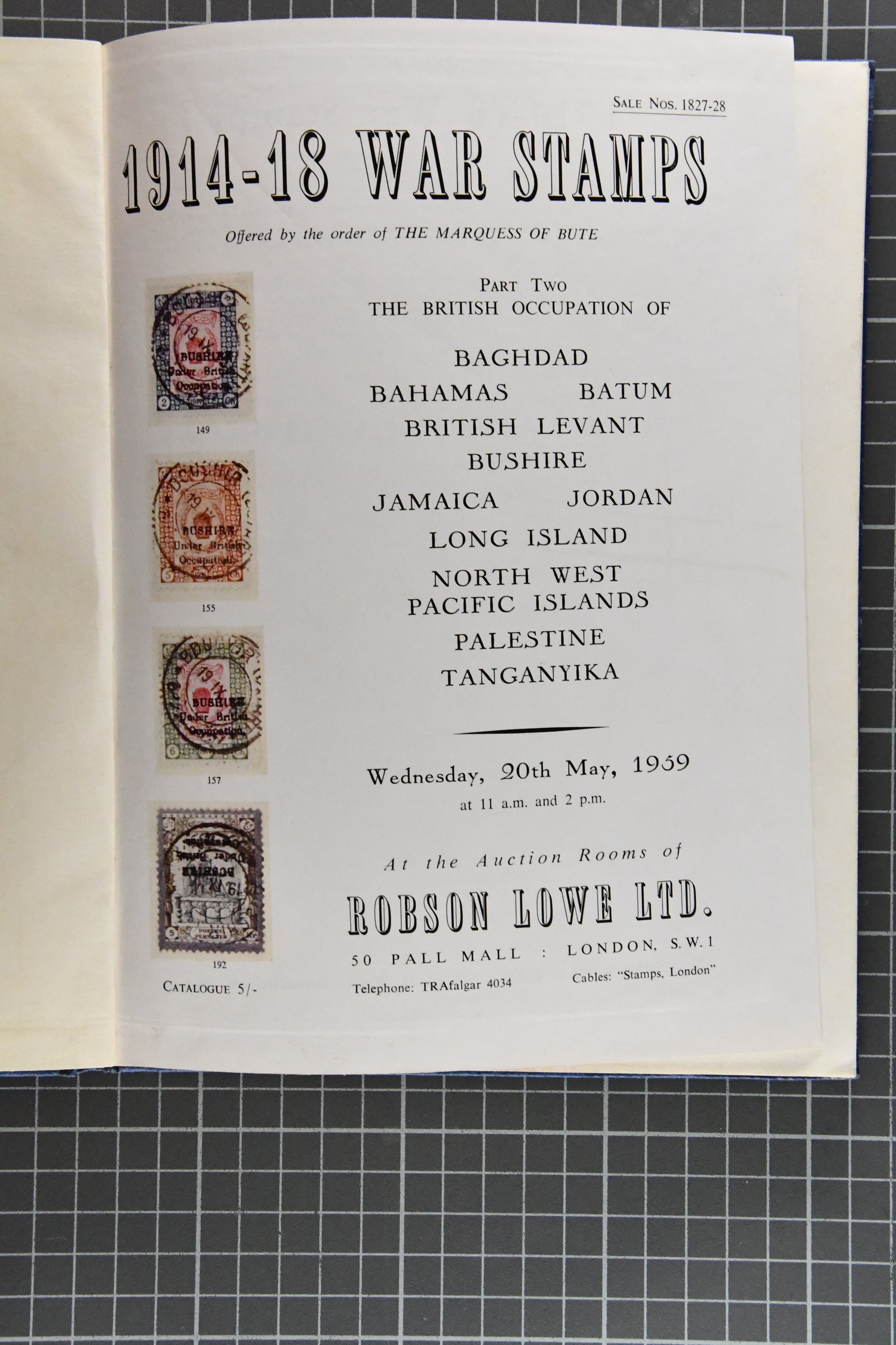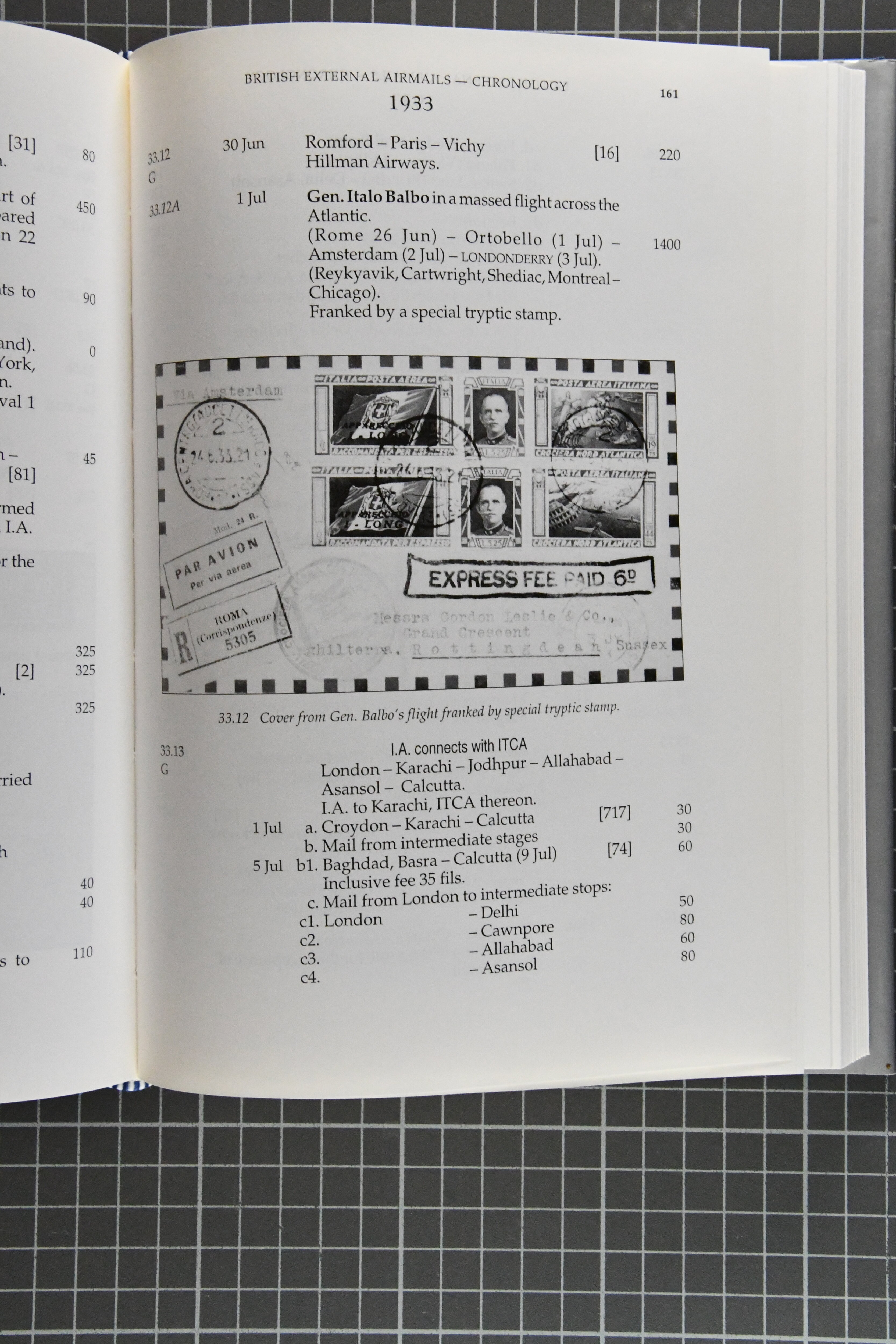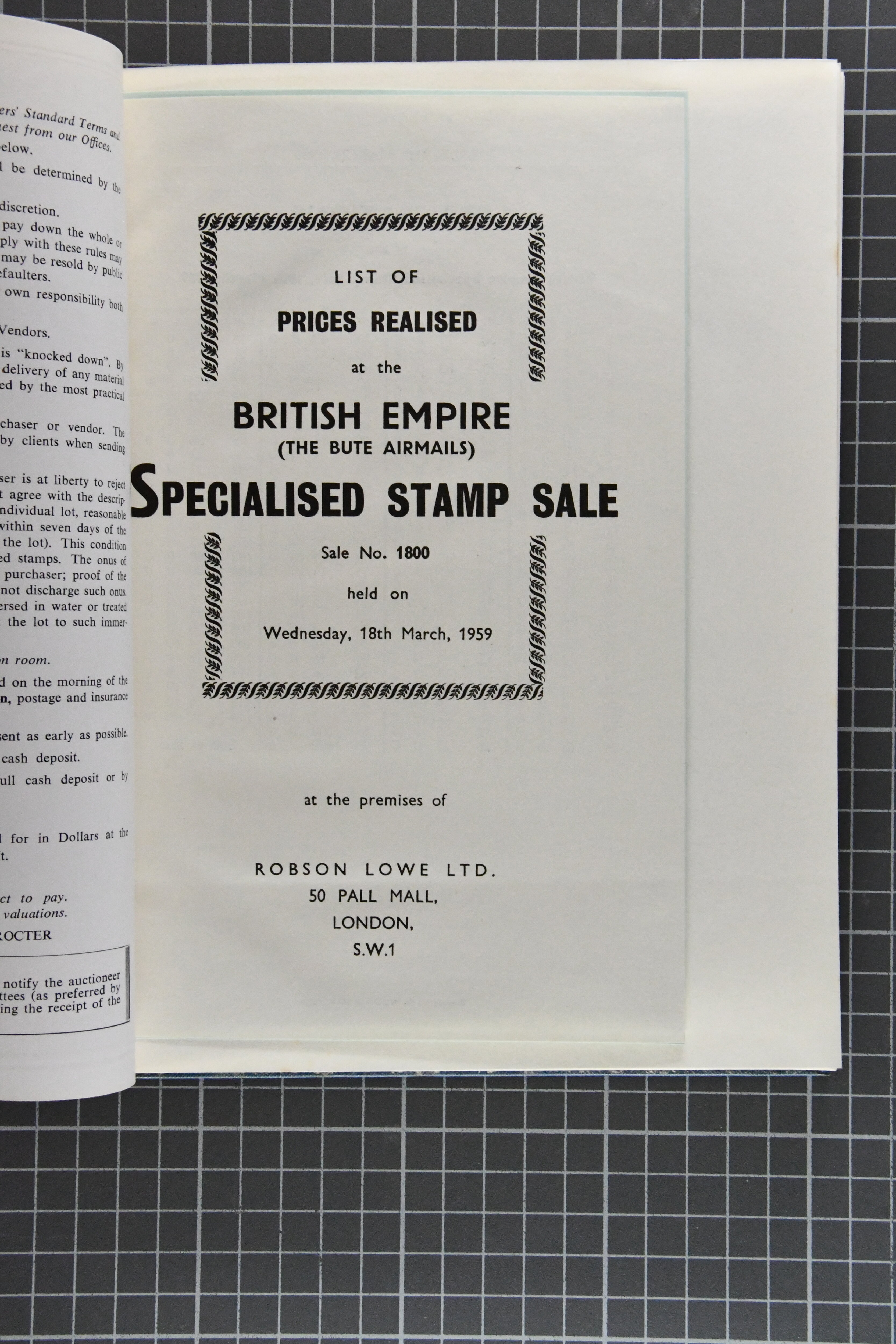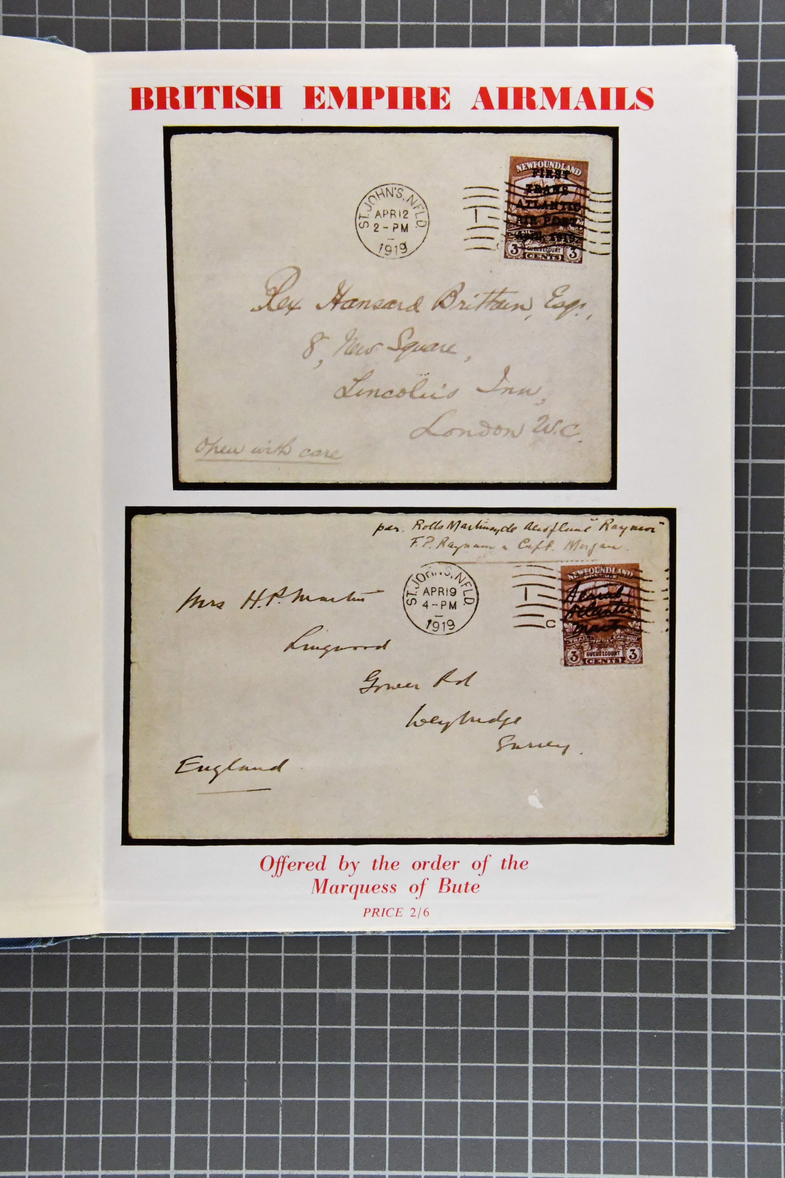 1582 image1959/2015: Assembly of works regarding airmail - 'Intercontinental Airmails Volume One Transatlantic And Pacific' by Edward Proud. The 2nd edition softbound as issued (2015). #18 of 50 copies. In as new condition. A very scarce publication, published because of major errors in the 1st edition. Missing from most airmail collectors libraries. Comes with the 'Marquess of Bute British Empire Airmails and Airmail Stamps & Covers' (1959) bound together in Robson Lowe interleaved housebound catalogue with realisations. Also his '1914-18 War Stamps' (1959) housebound with interleaving (boards damp affected) ex Sefton Fiddian. Plus five additional books 'British External Airmails until 1934', second Edition by Alexander S. Newall FRPSL edited by Robson Lowe 1996; 'Airmails Across The Middle East 1918-30' by Laurence Kimpton 2015, 'Overprinted British Airletters' by Dr. John Gledhill for the Great Britain Overprint Society 2015; 'Royal Air Force Cairo-Baghdad Air Mail Service' 1921-27 by William C. Andrews 2000; 'IMPERIAL AIRWAYS' EMPIRE FLYING BOAT SERVICES 'reasearched and compiled by Peter Wingent 1997. (Image 1) (Image 2) (Image 3) (Image 4) (Image 5) (Image 6) (Image 7) (Image 8) (Image 9) (Image 10) (Image 11) (Image 12)